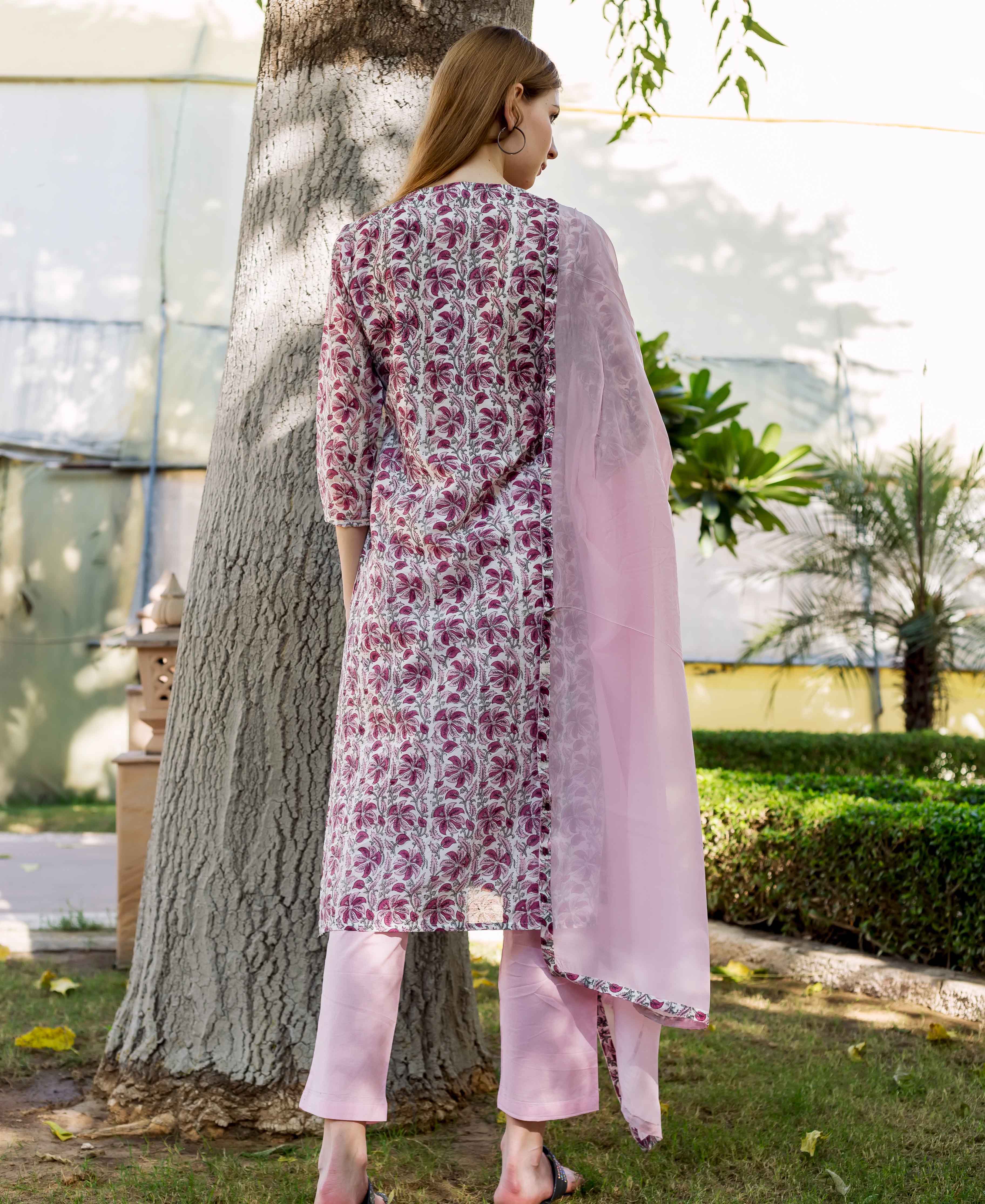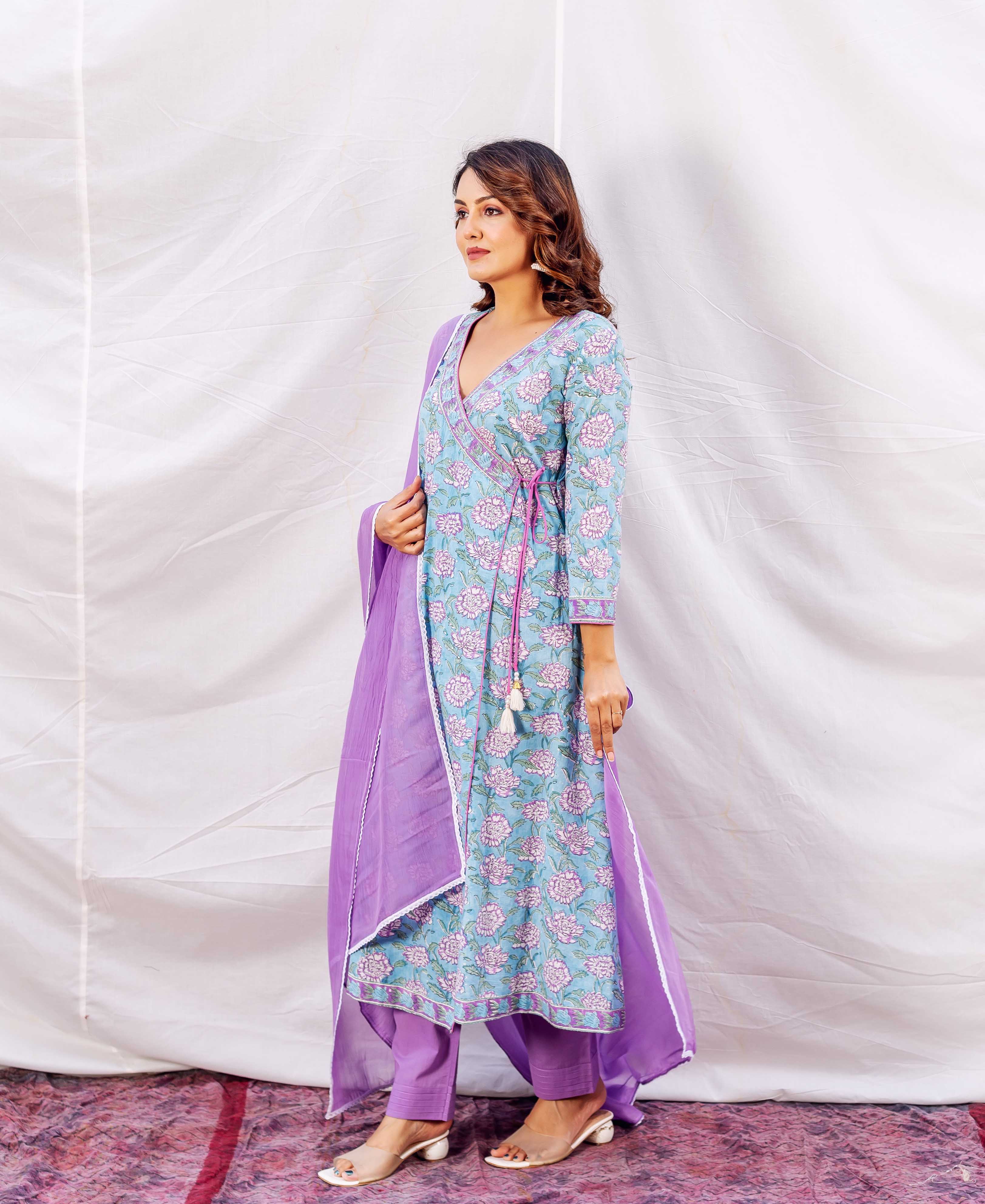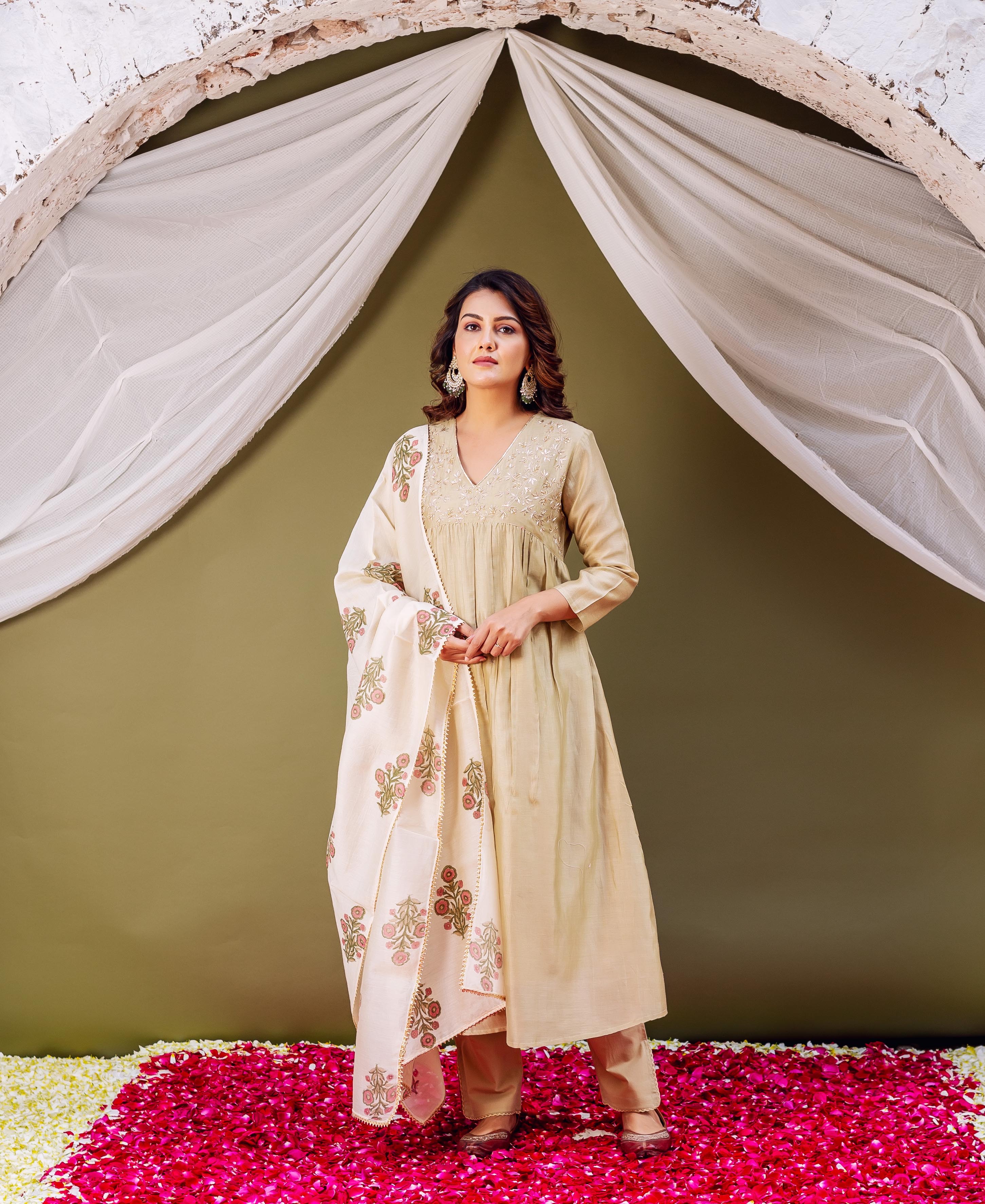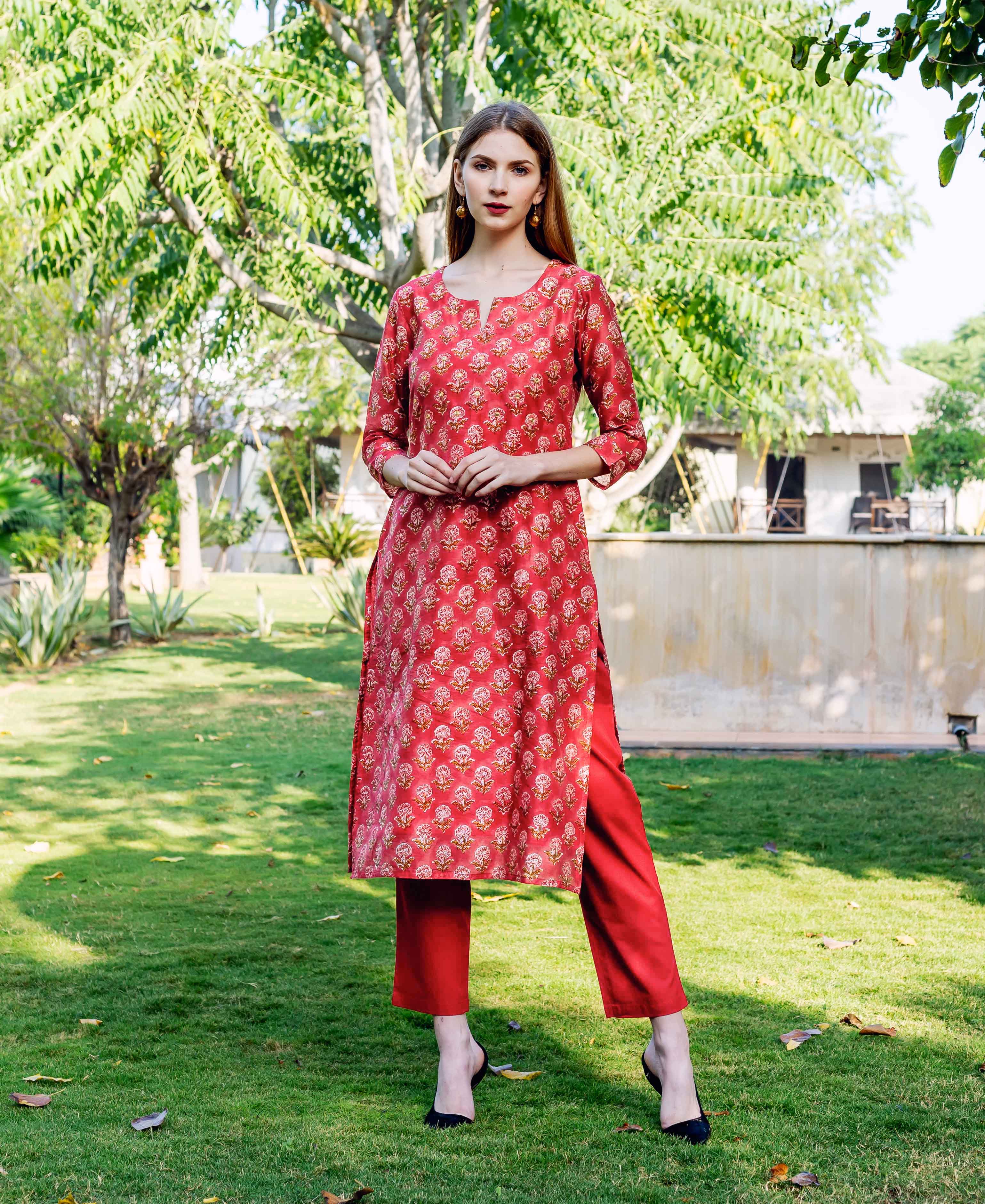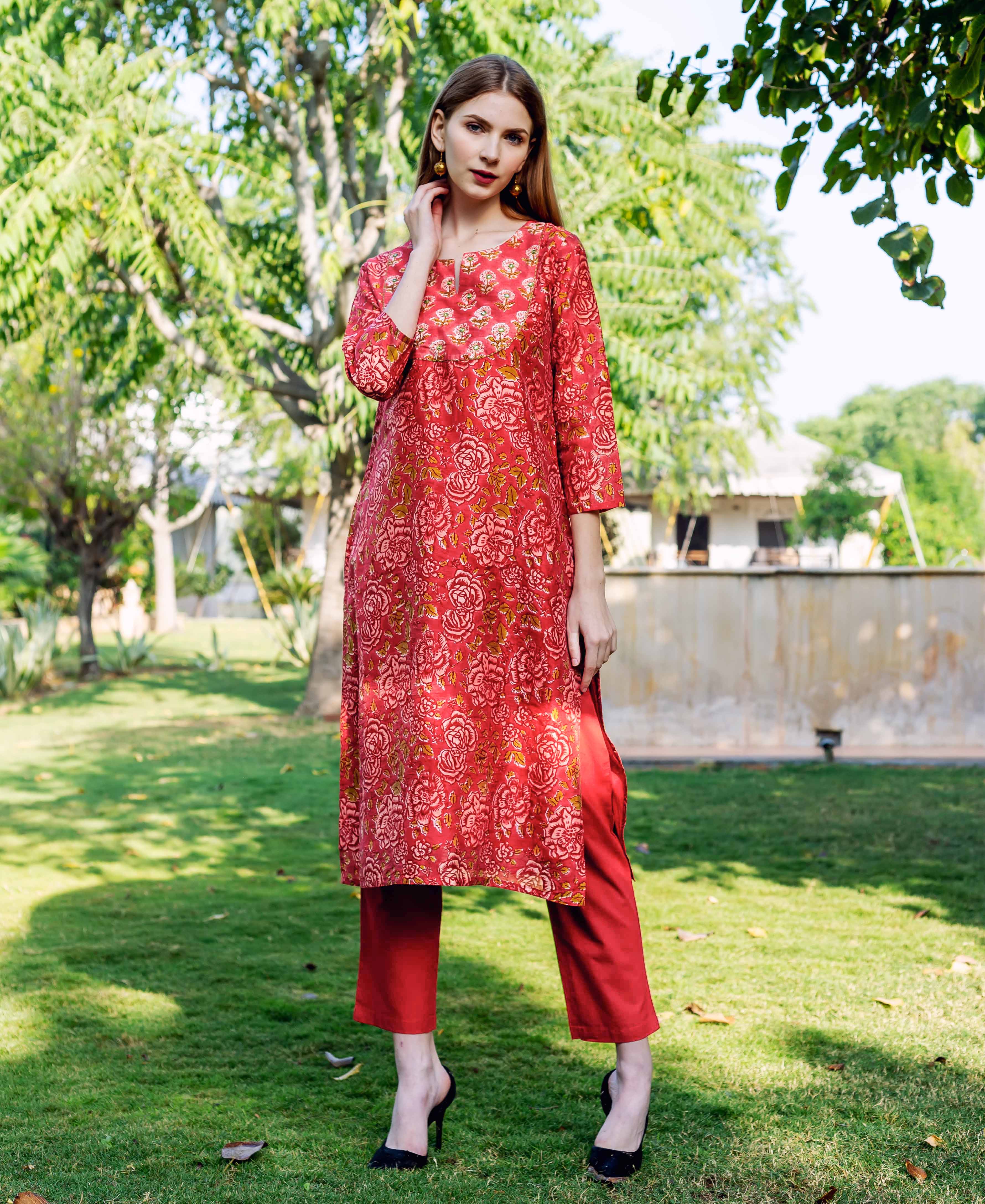 Indigo Hand Block Printed & Embroidered Straight Kurta