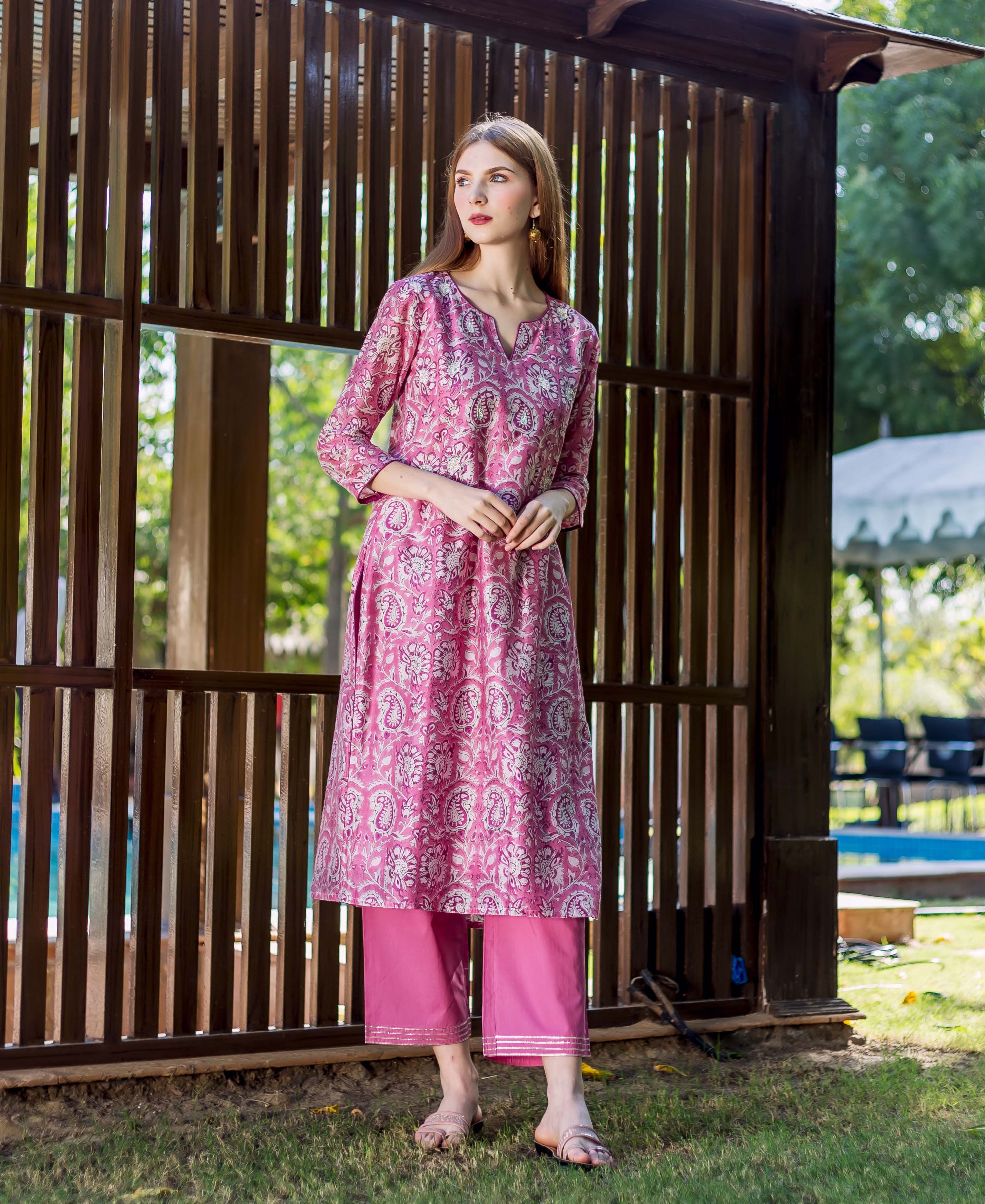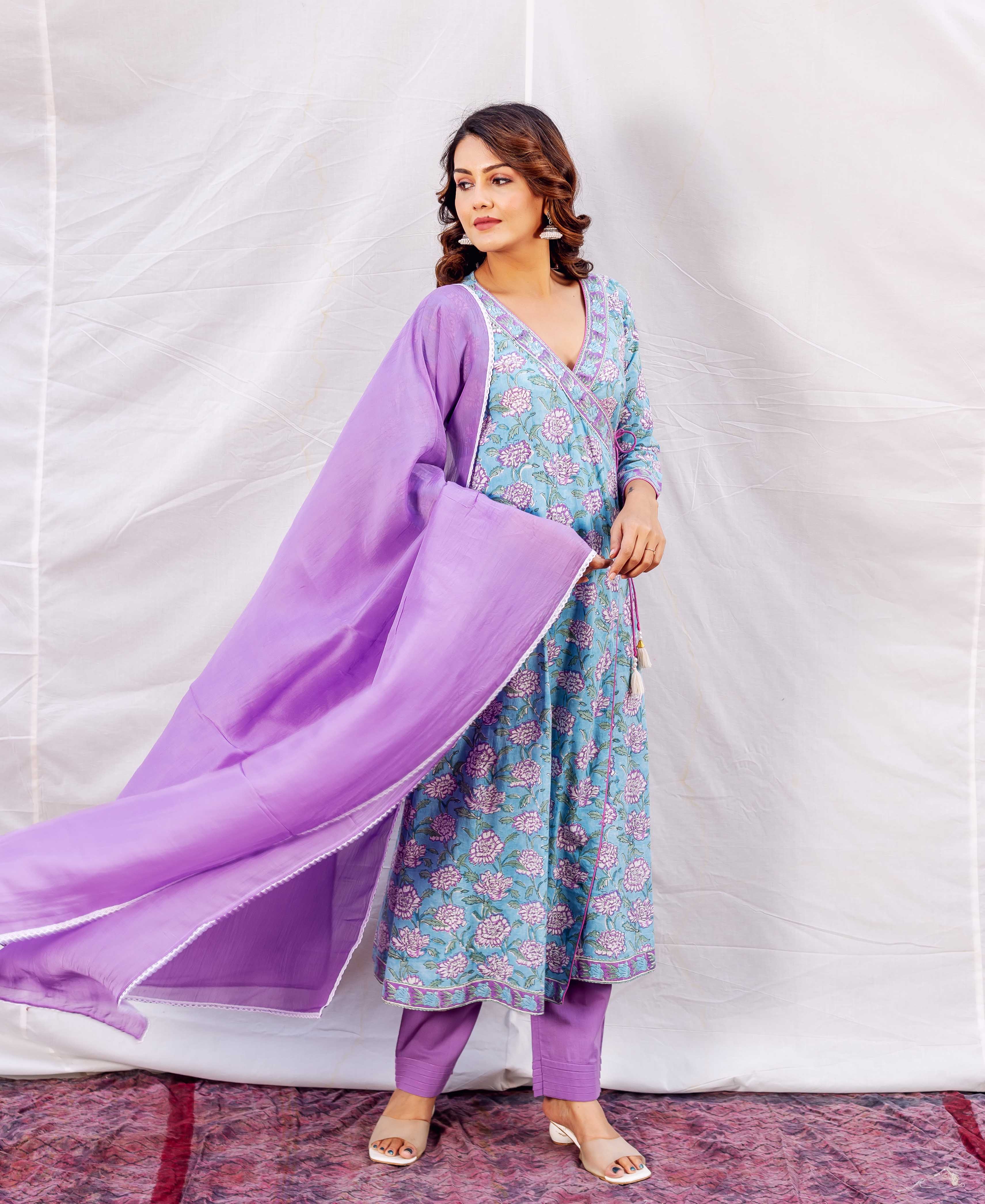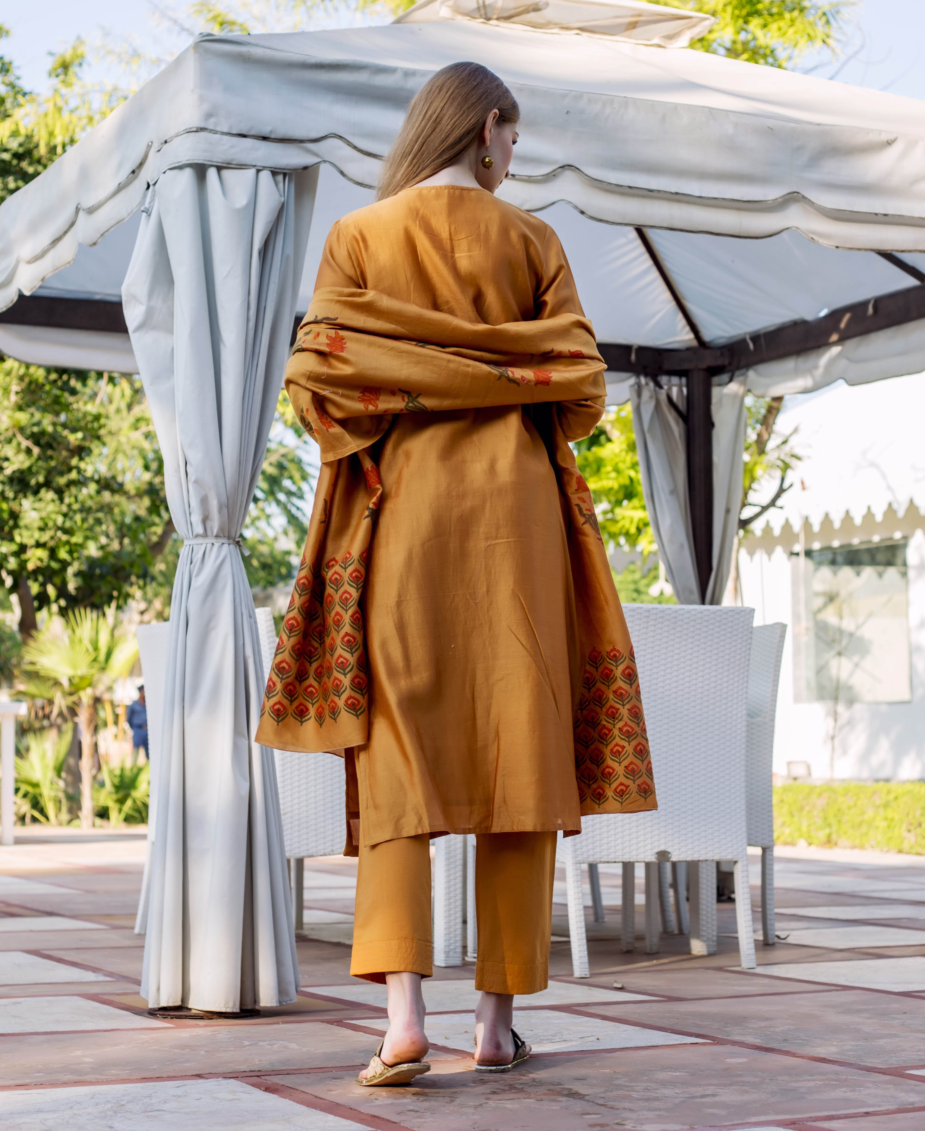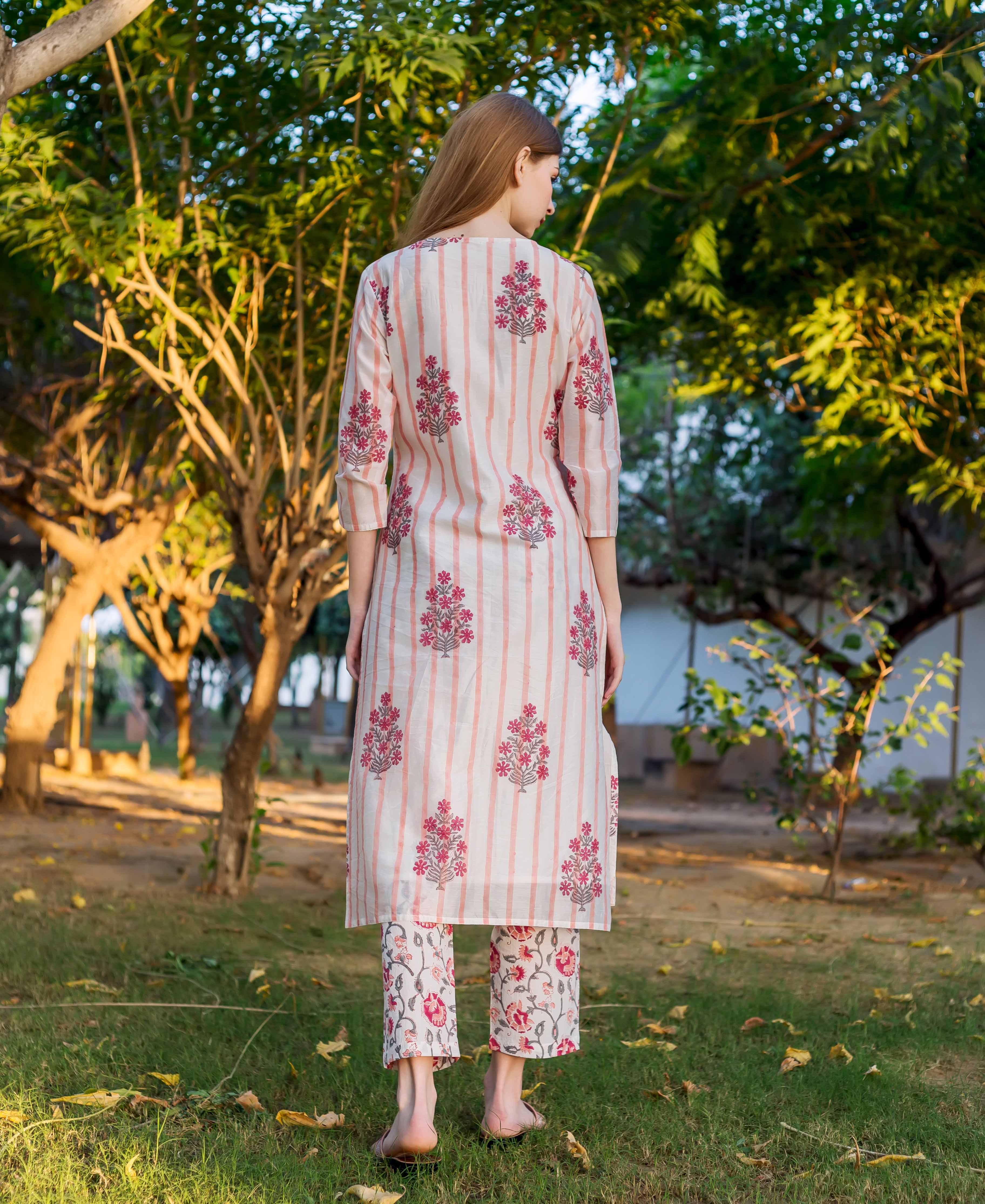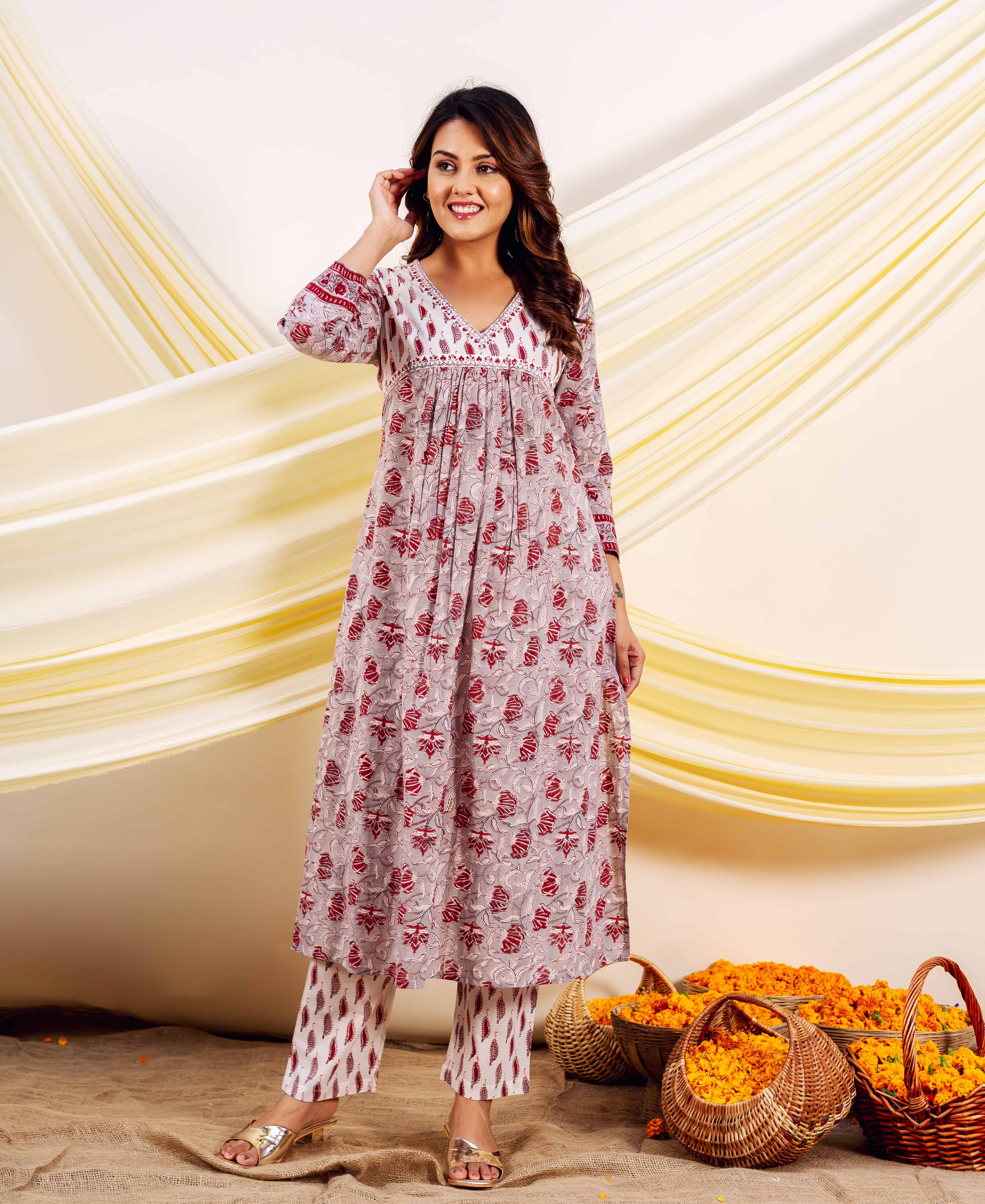 Indigo Hand Block Printed & Embroidered Straight Kurta