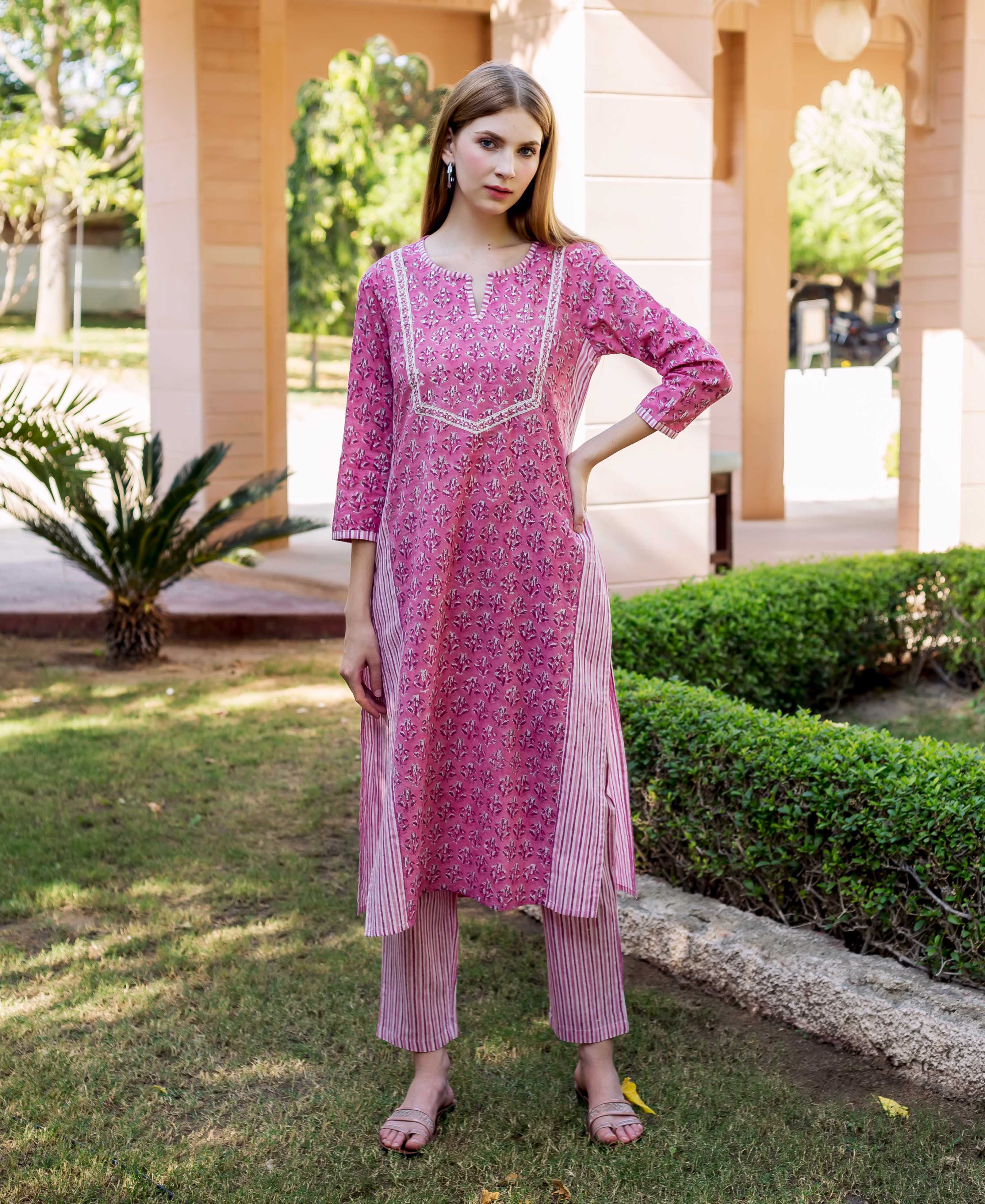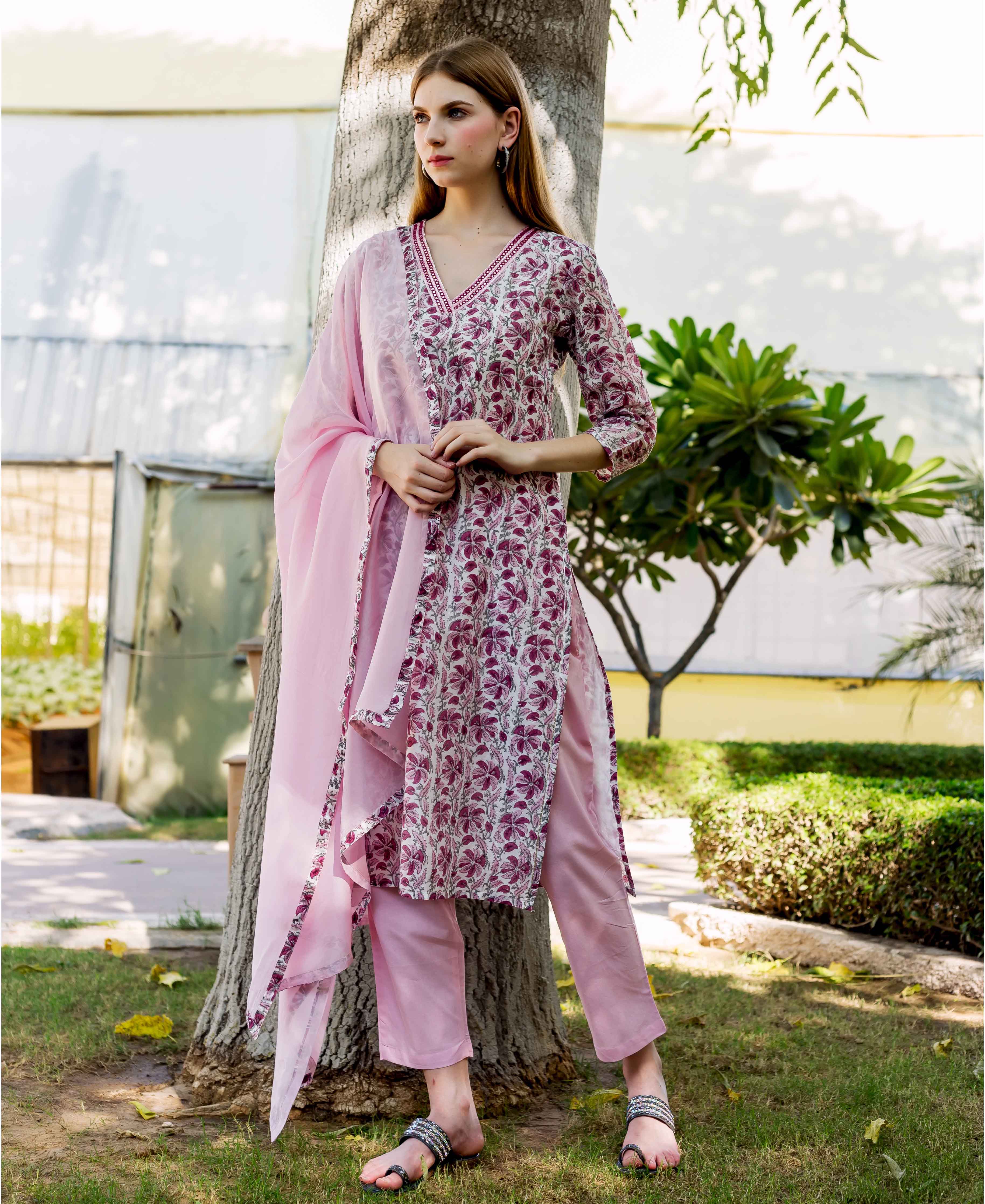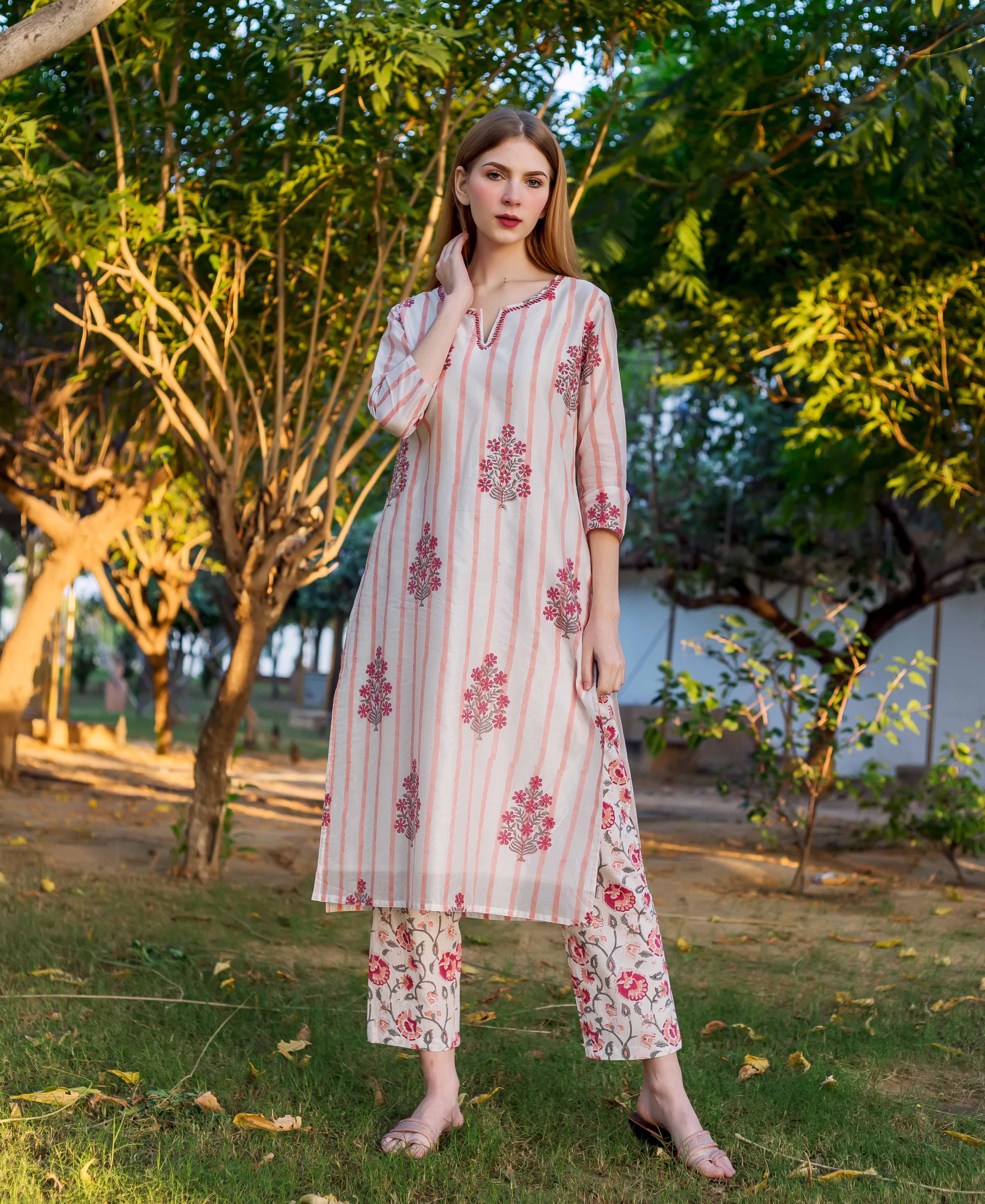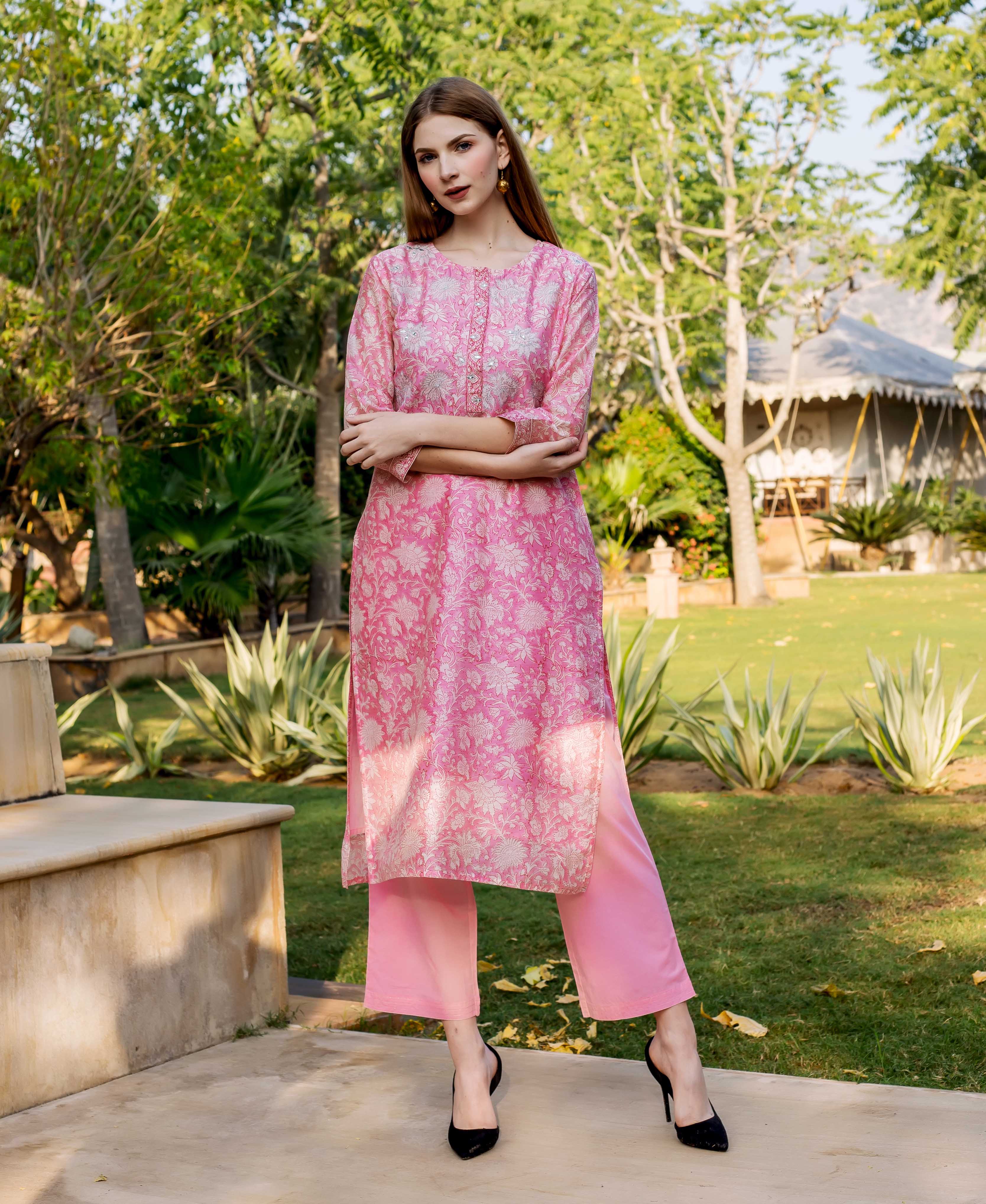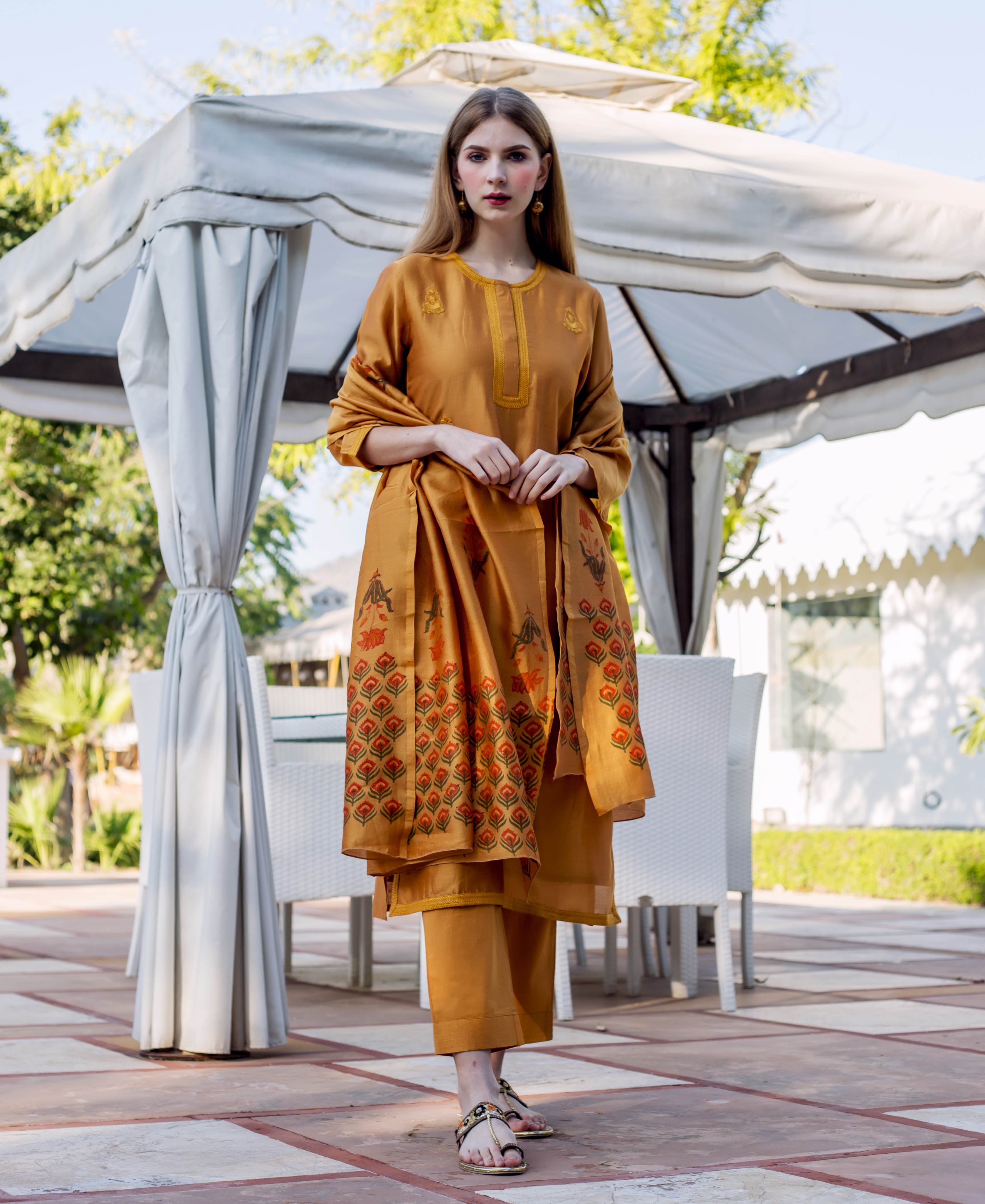 Indigo Hand Block Printed & Embroidered Straight Kurta