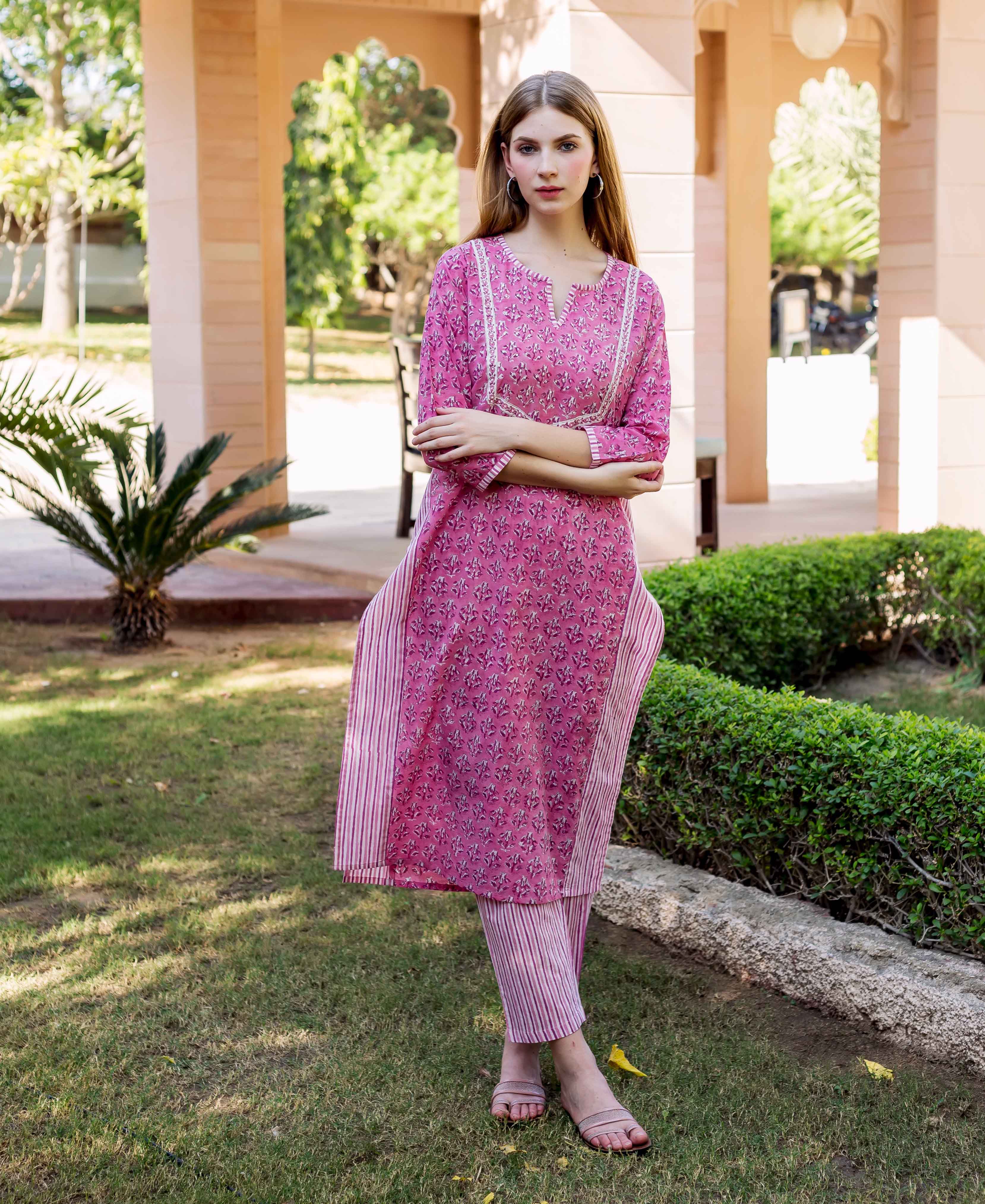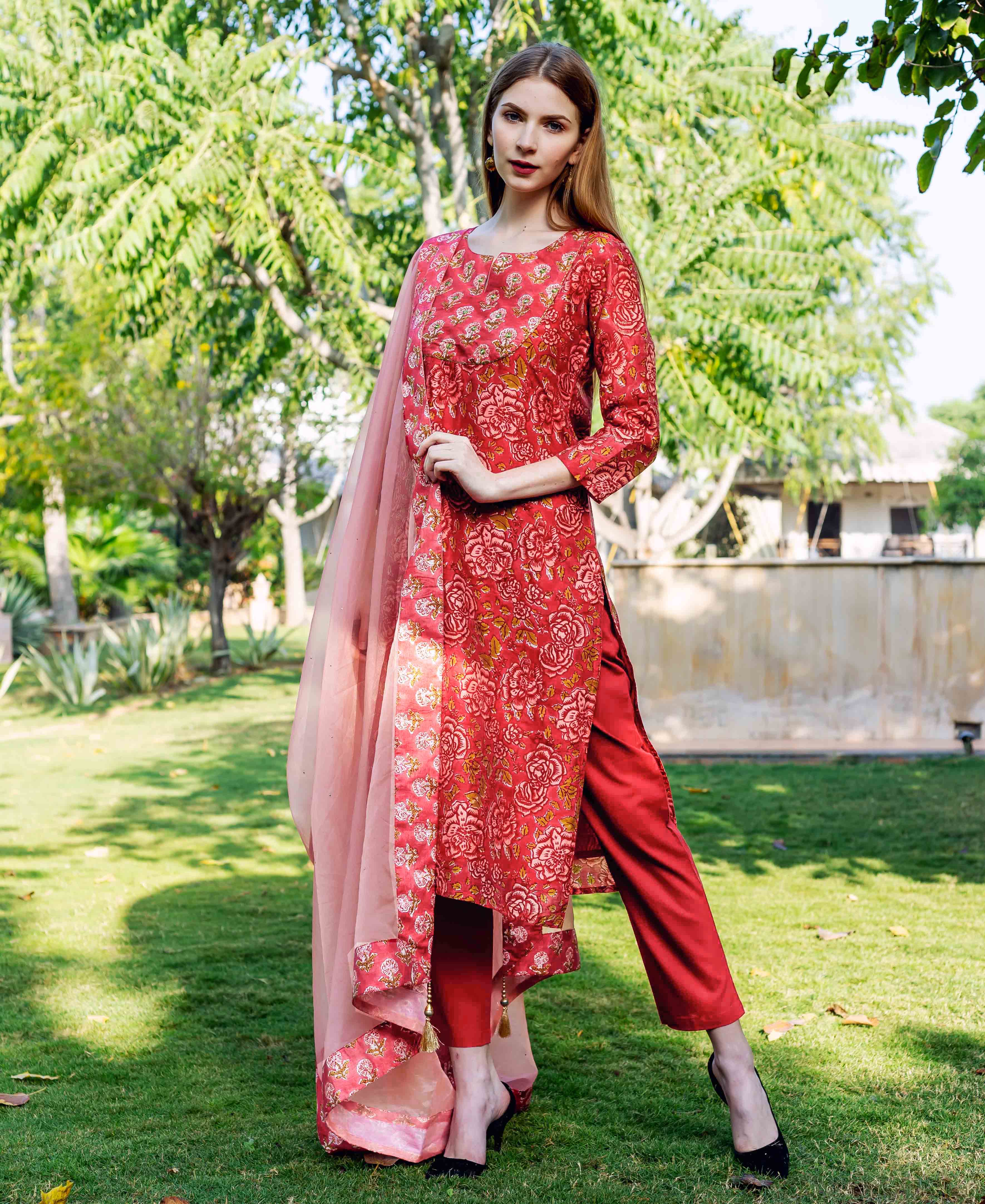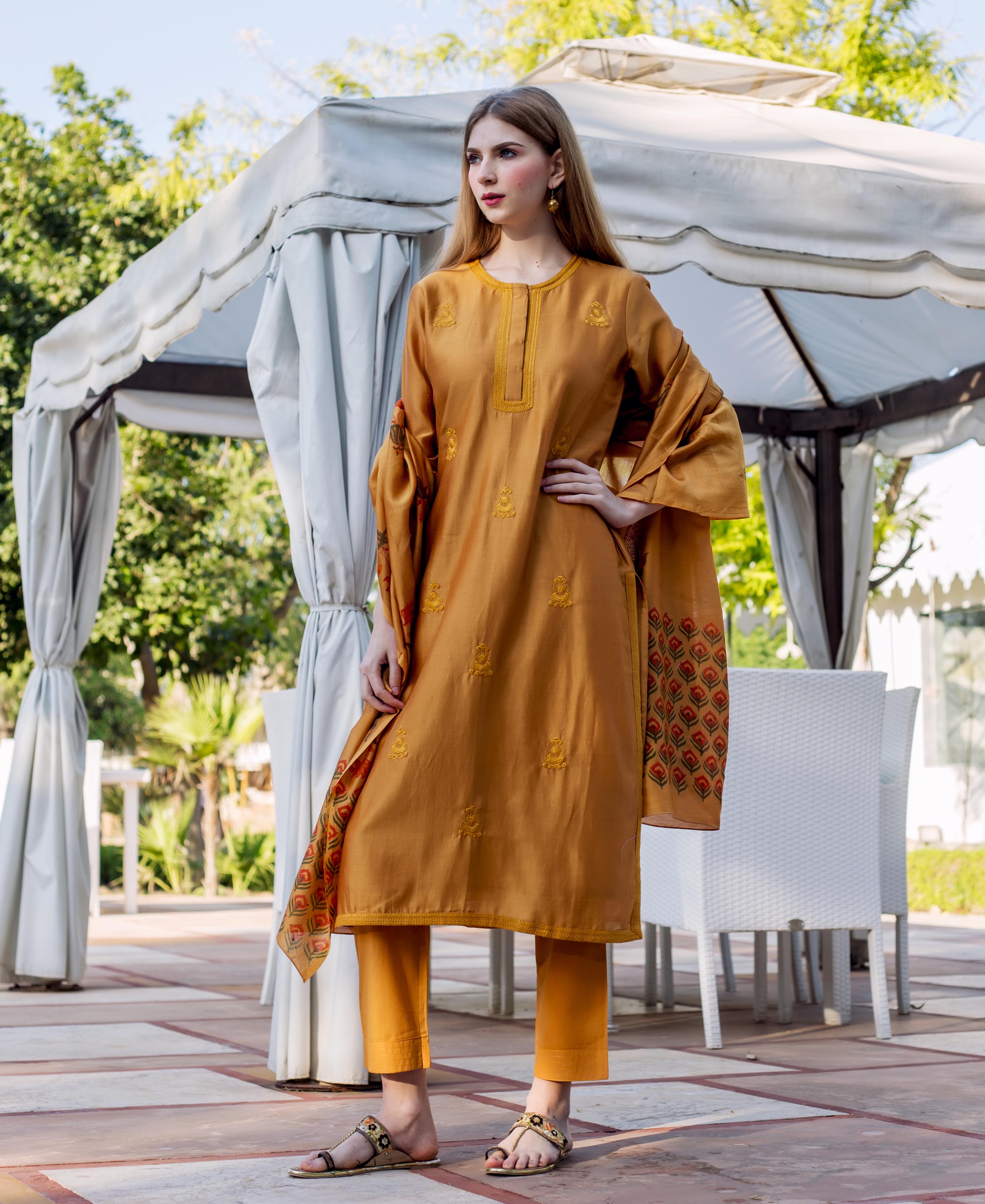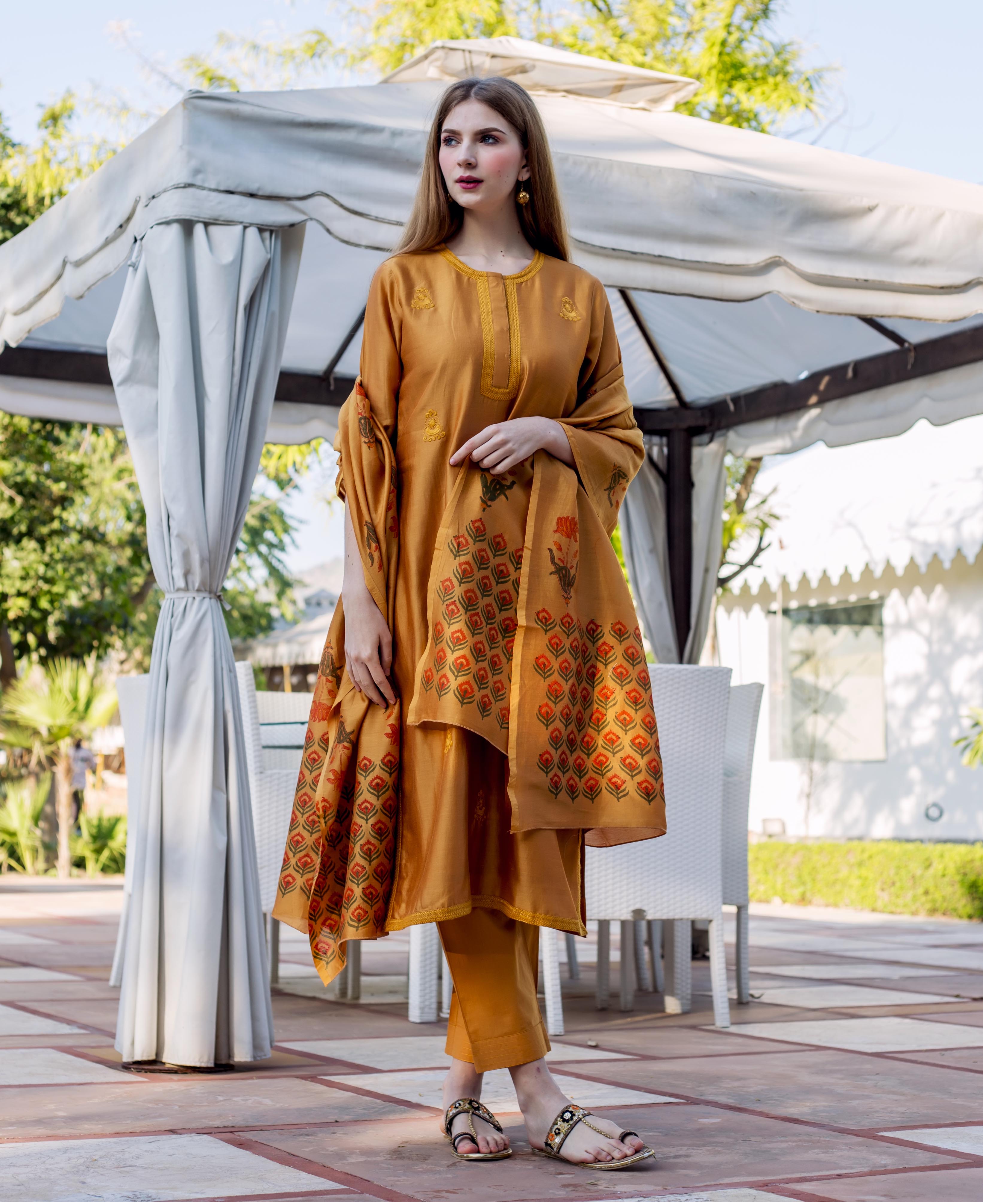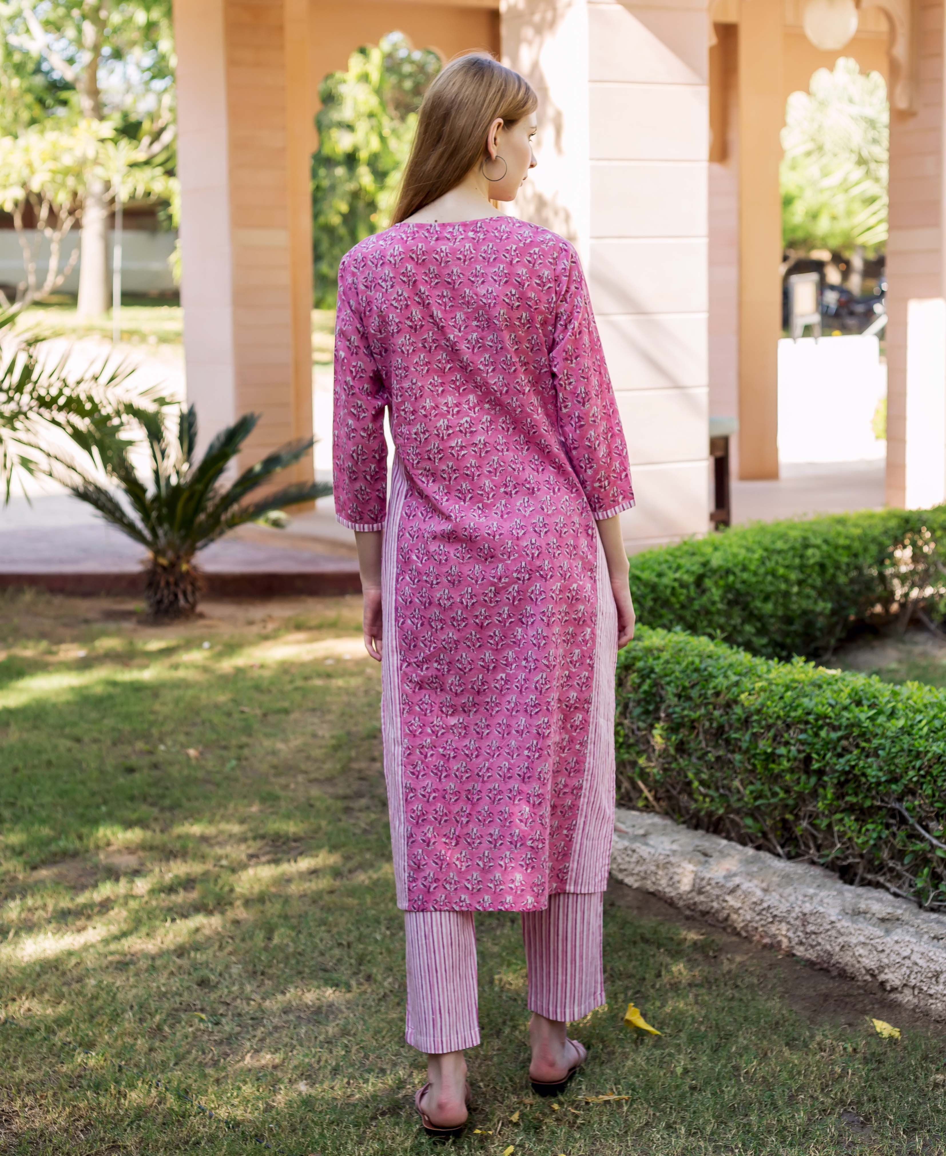 Indigo Hand Block Printed & Embroidered Straight Kurta