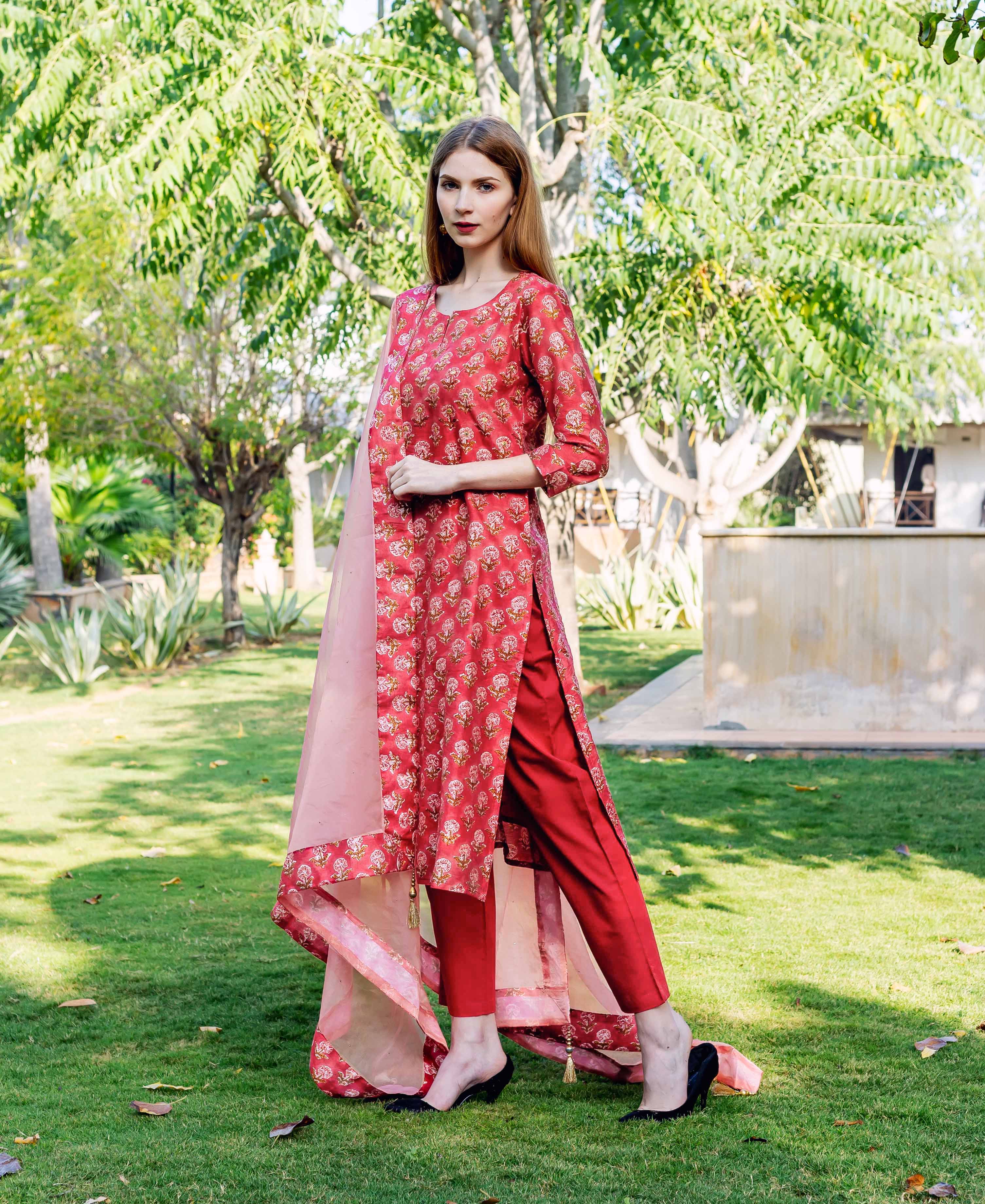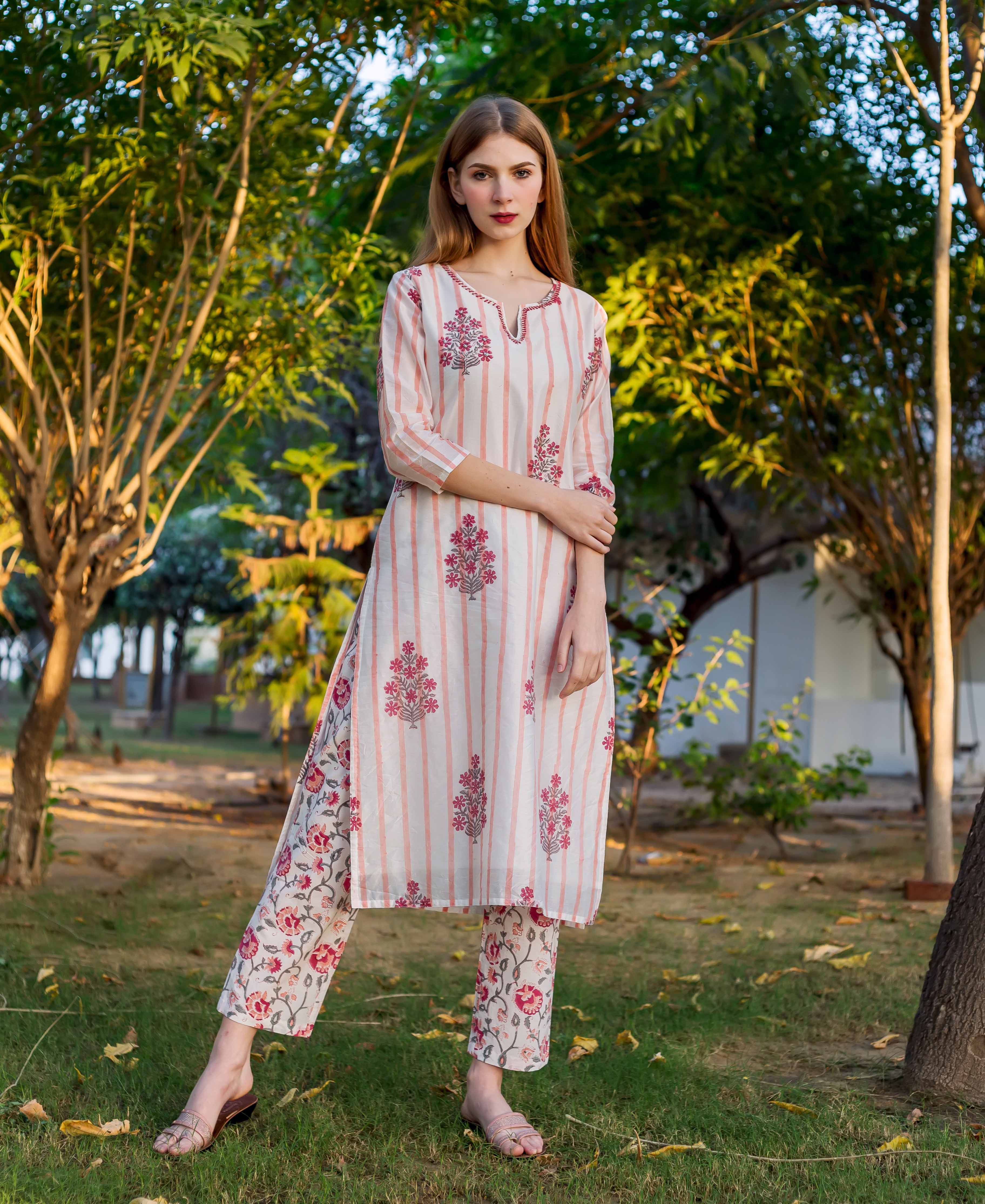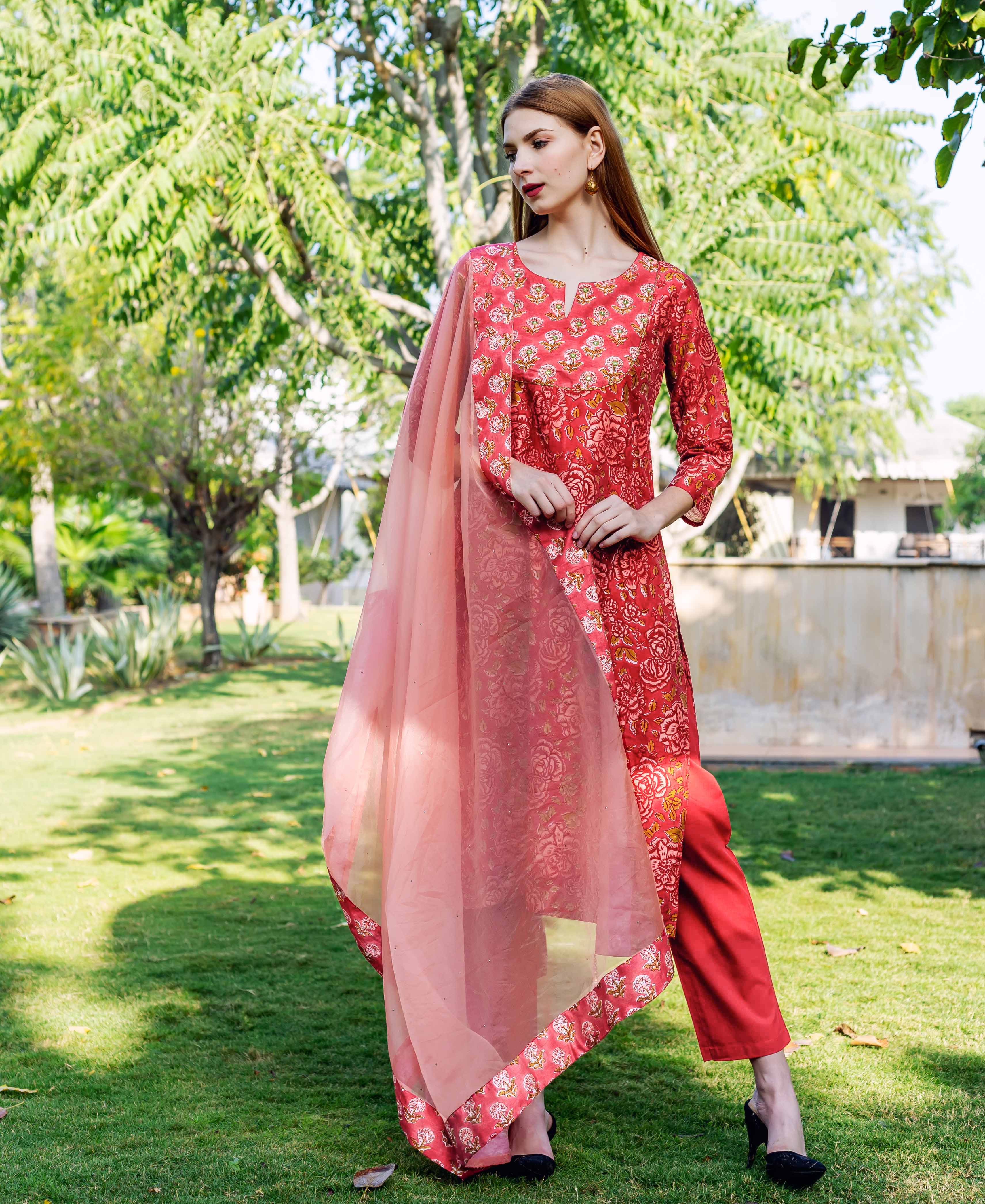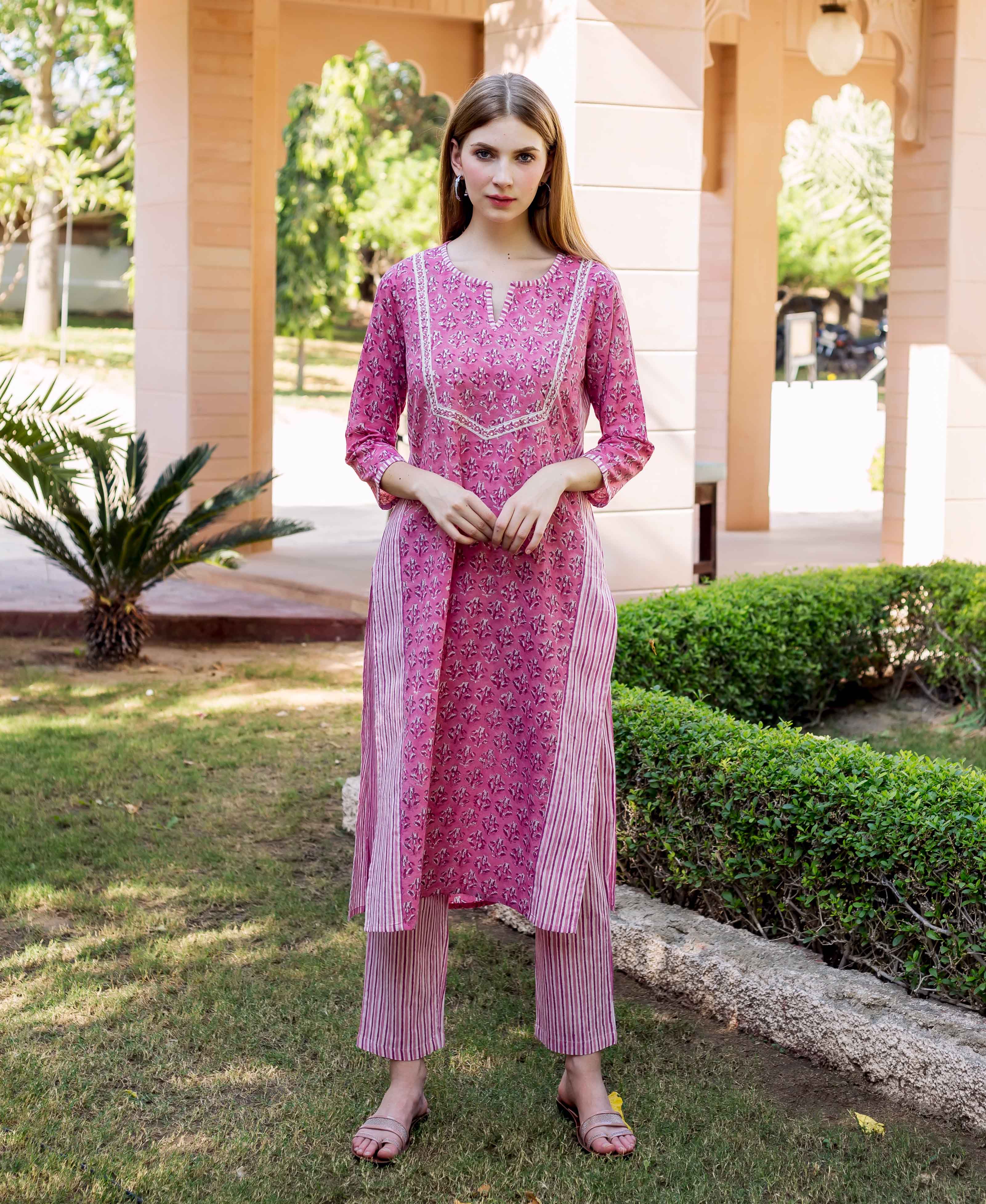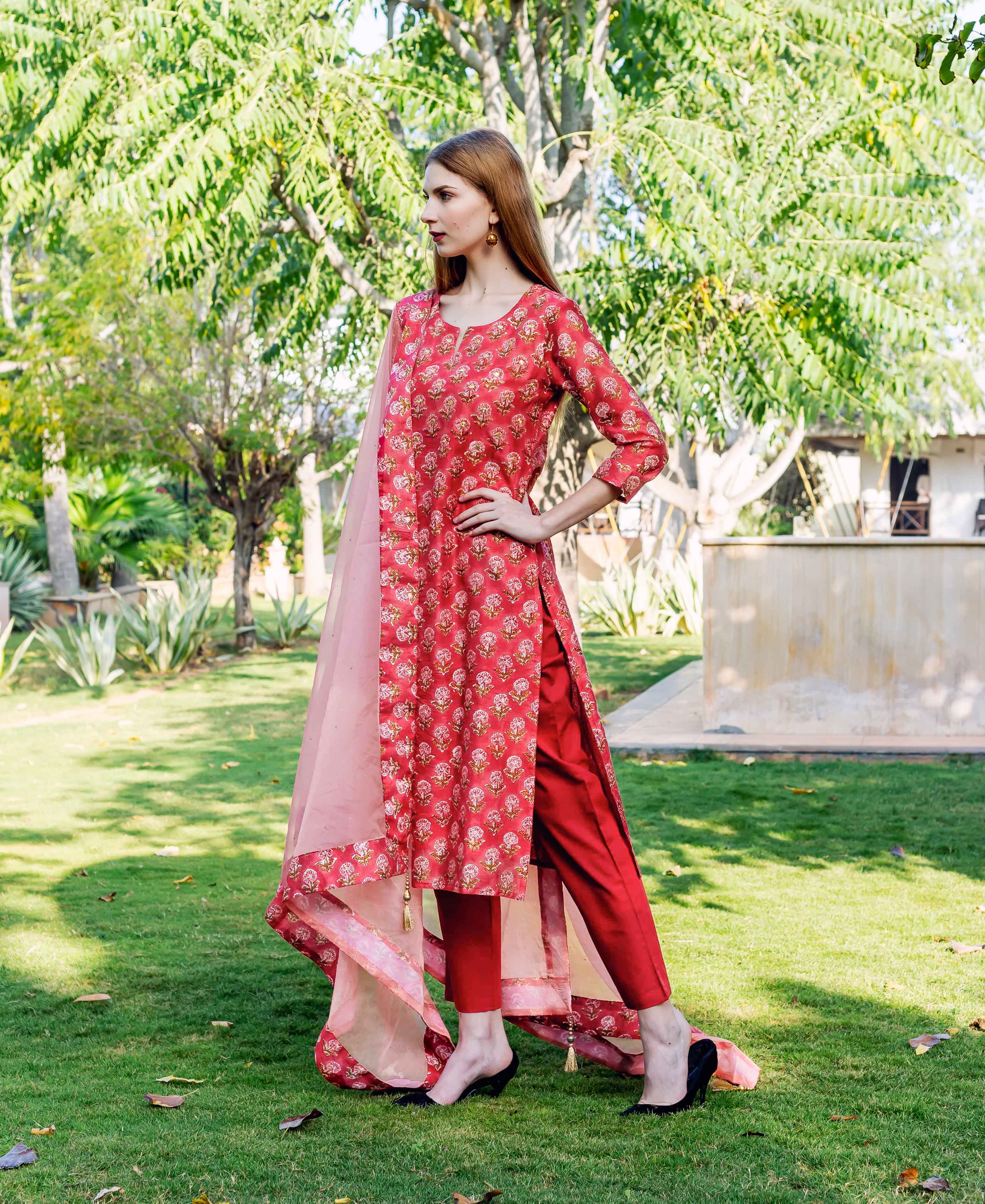 Indigo Hand Block Printed & Embroidered Straight Kurta