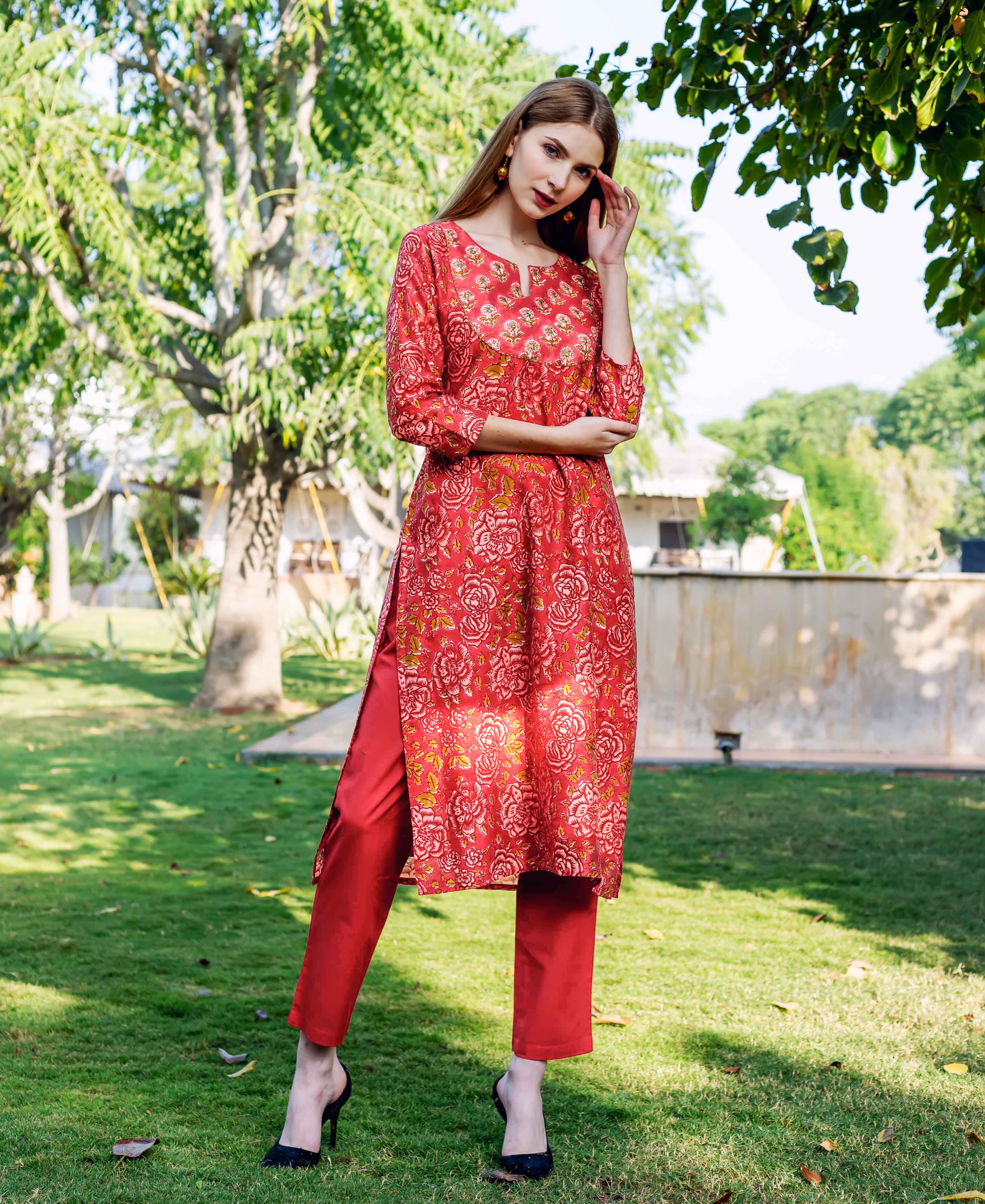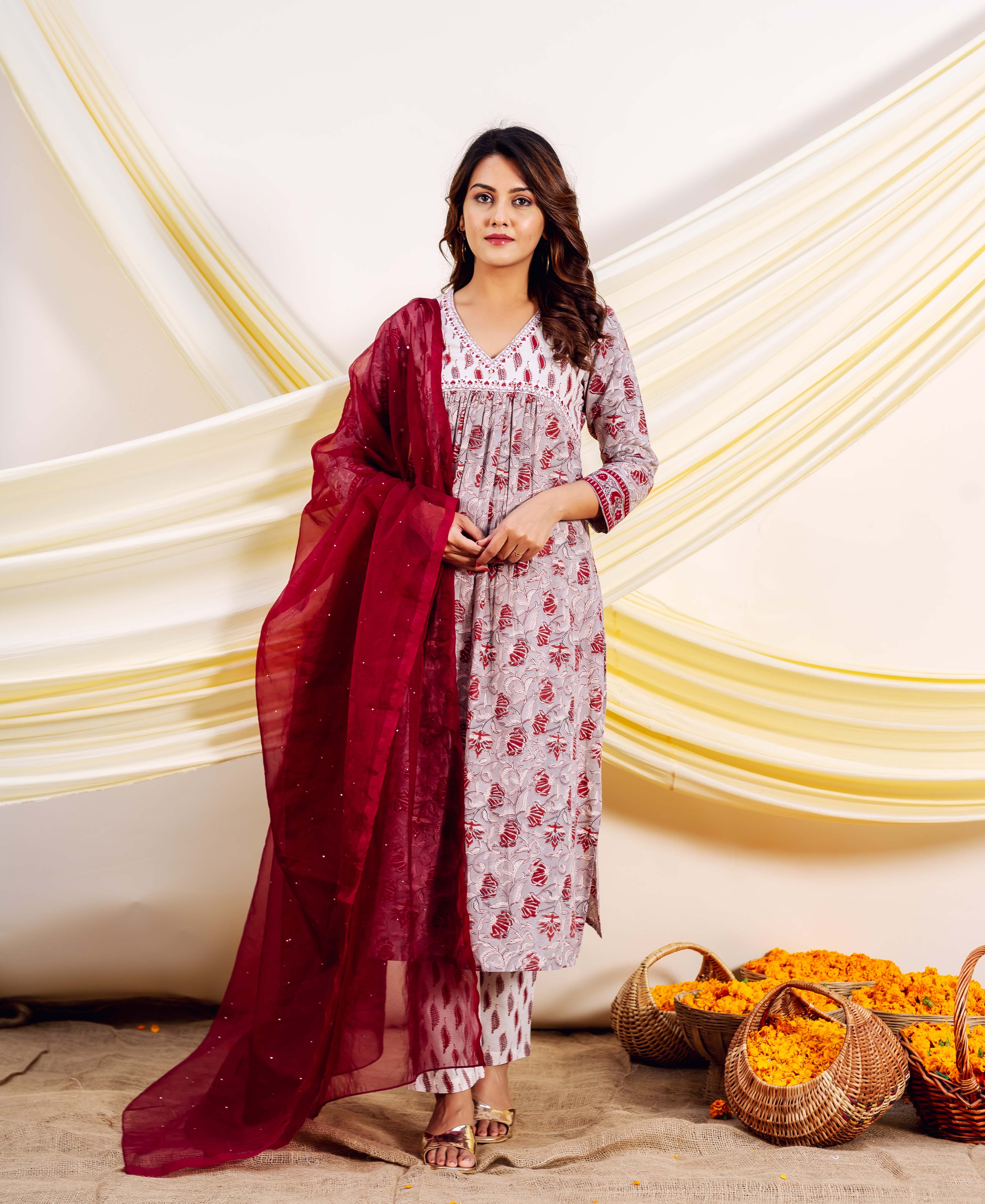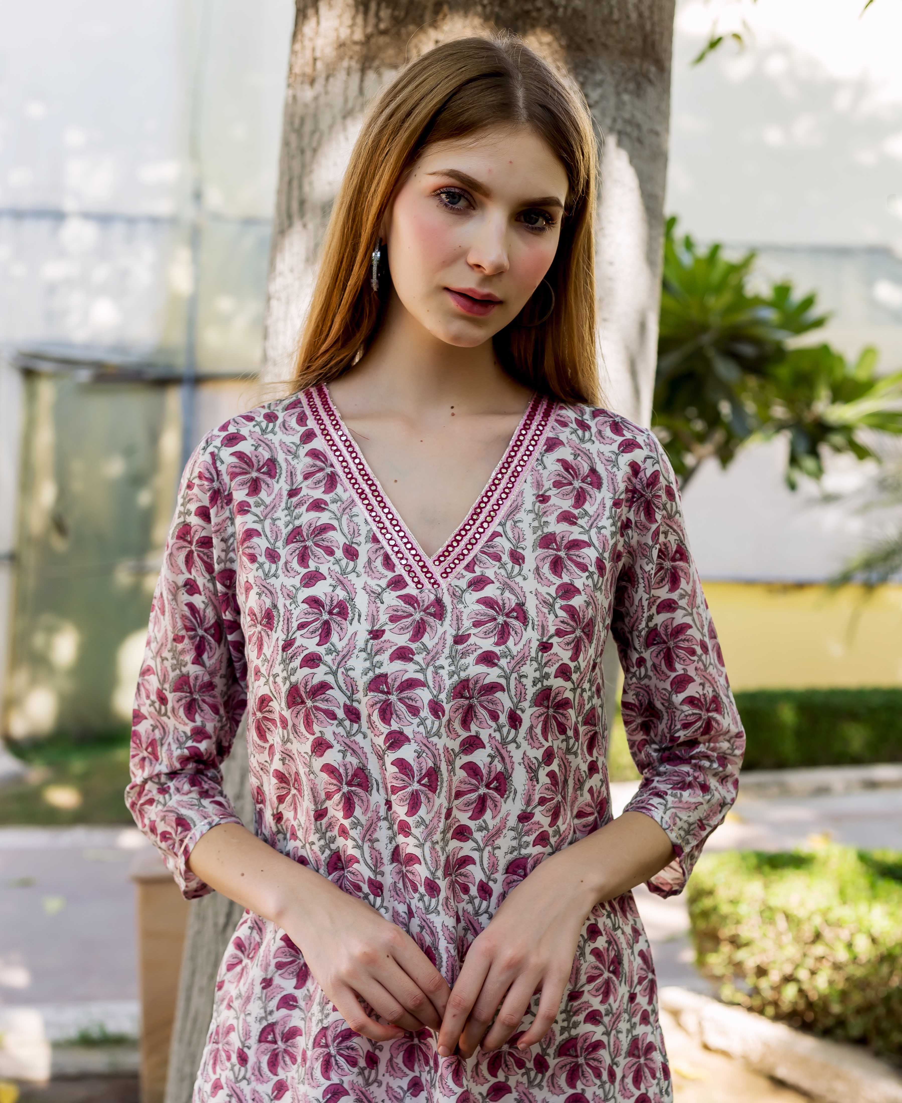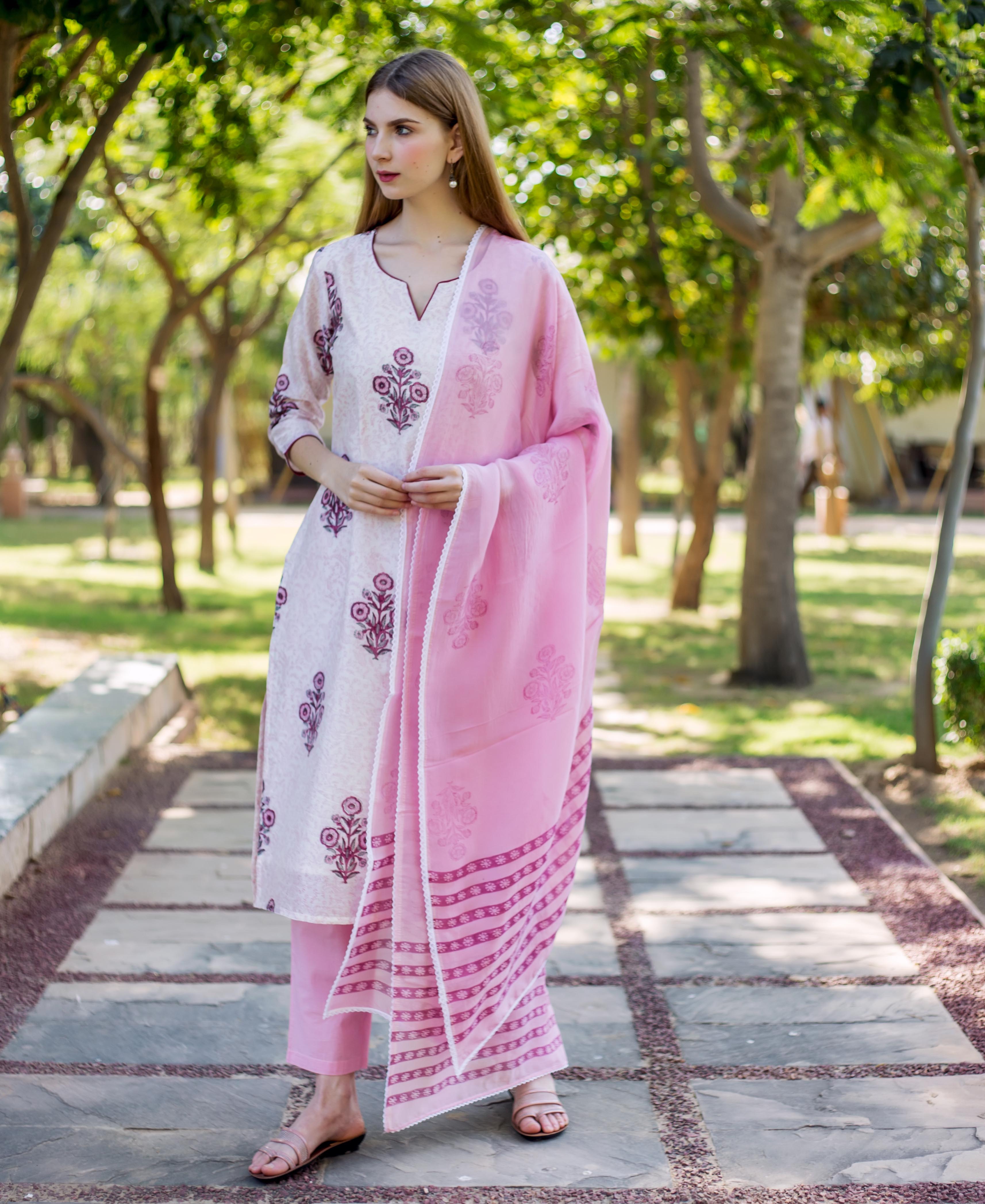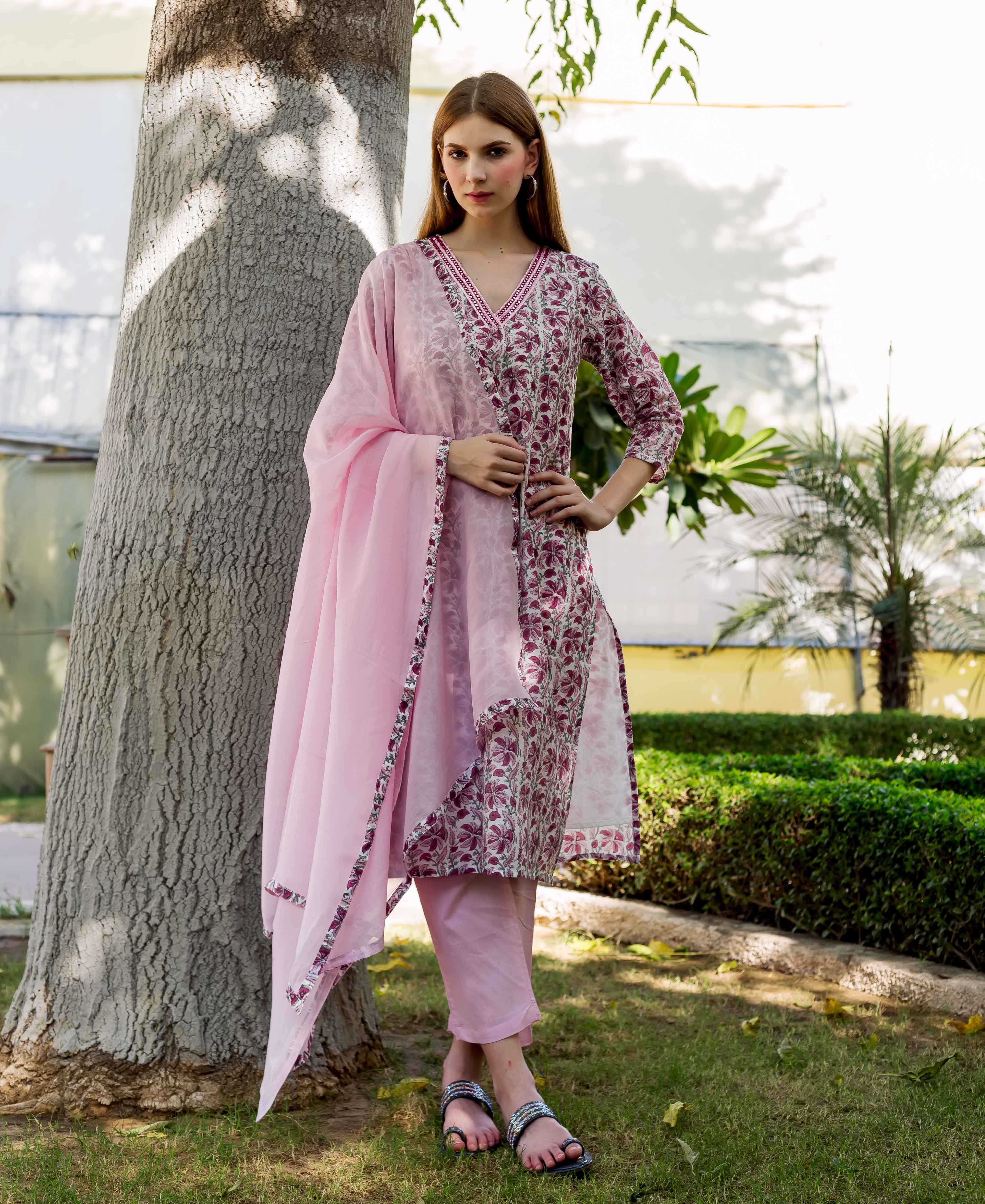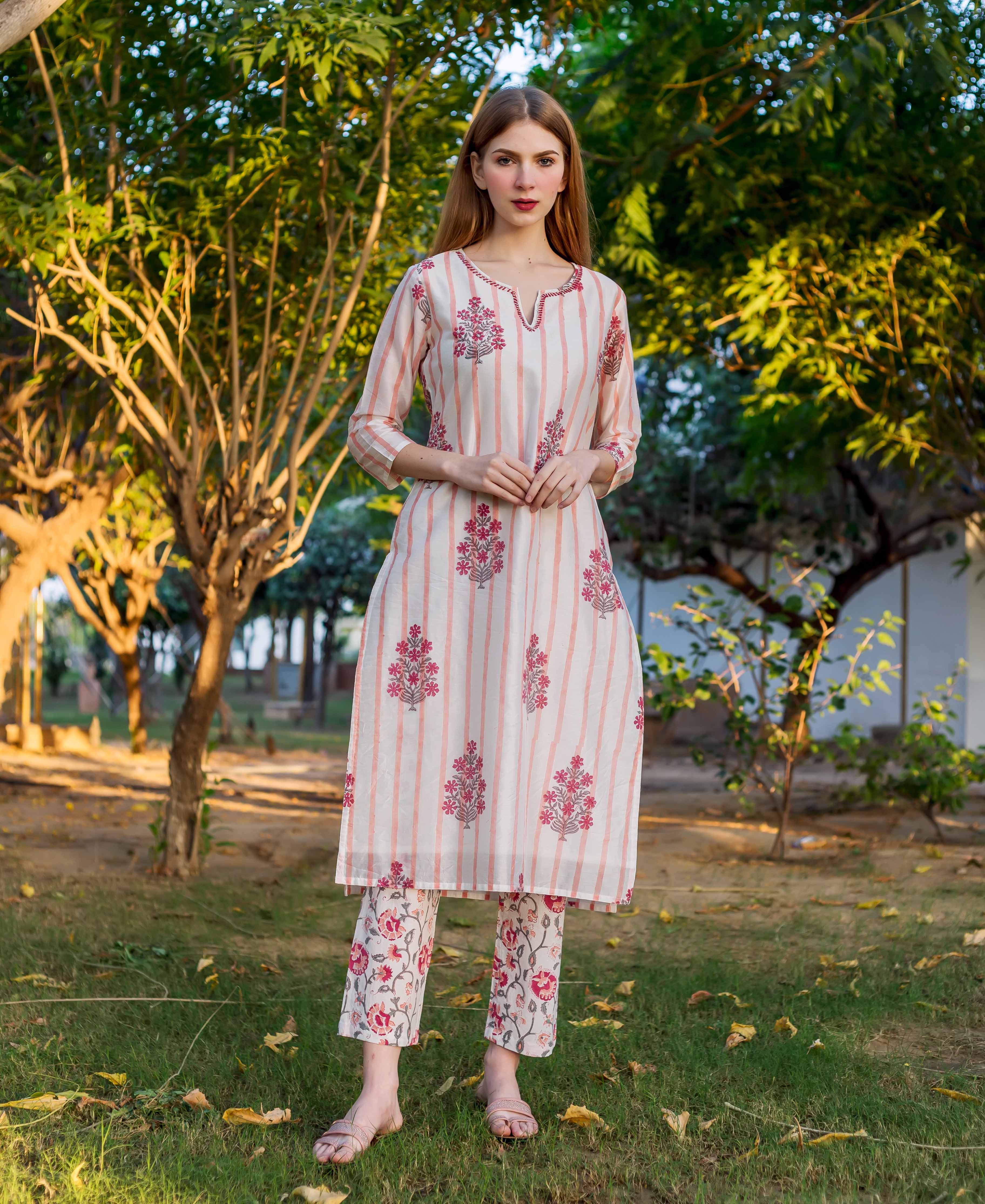 Indigo Hand Block Printed & Embroidered Straight Kurta