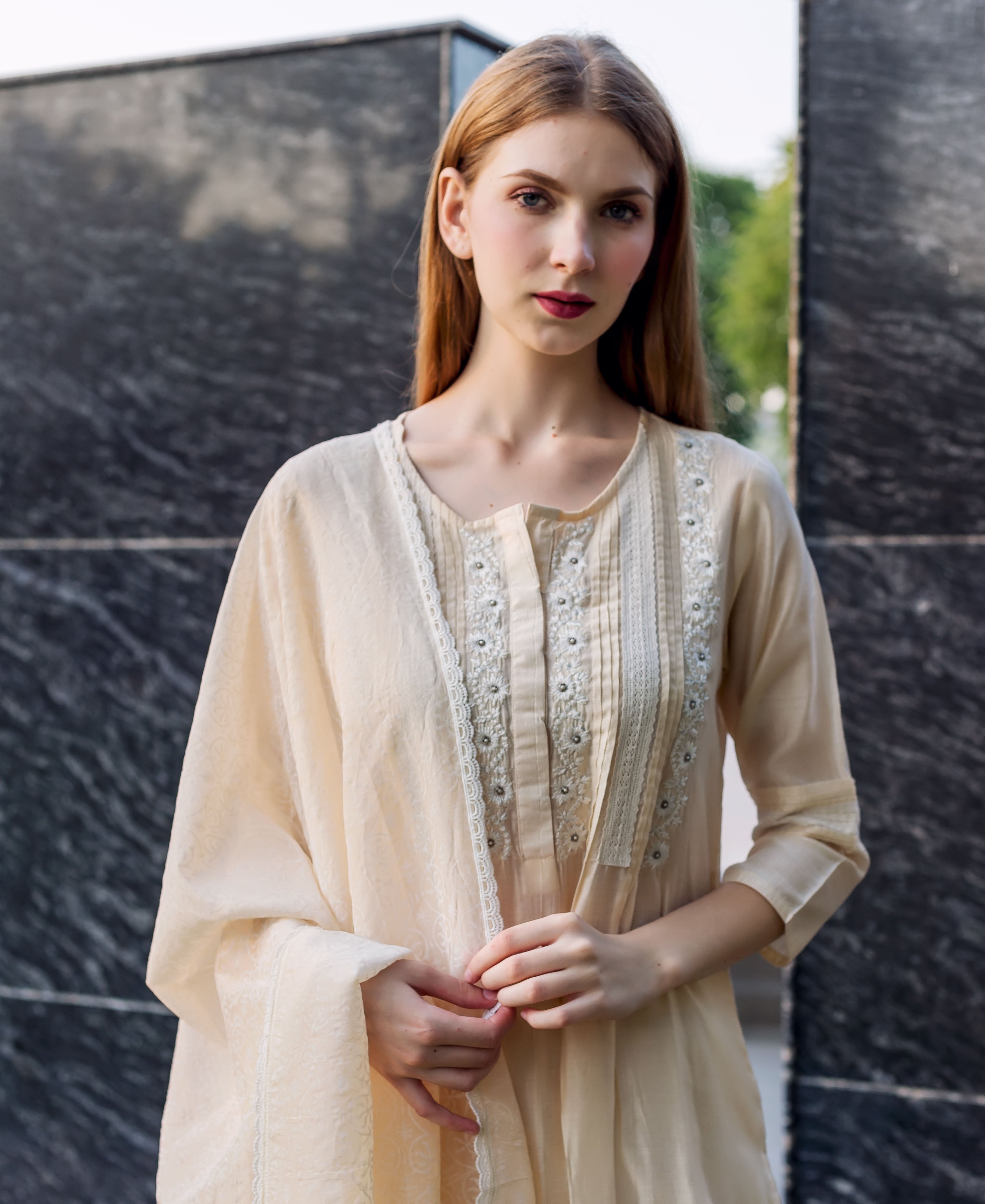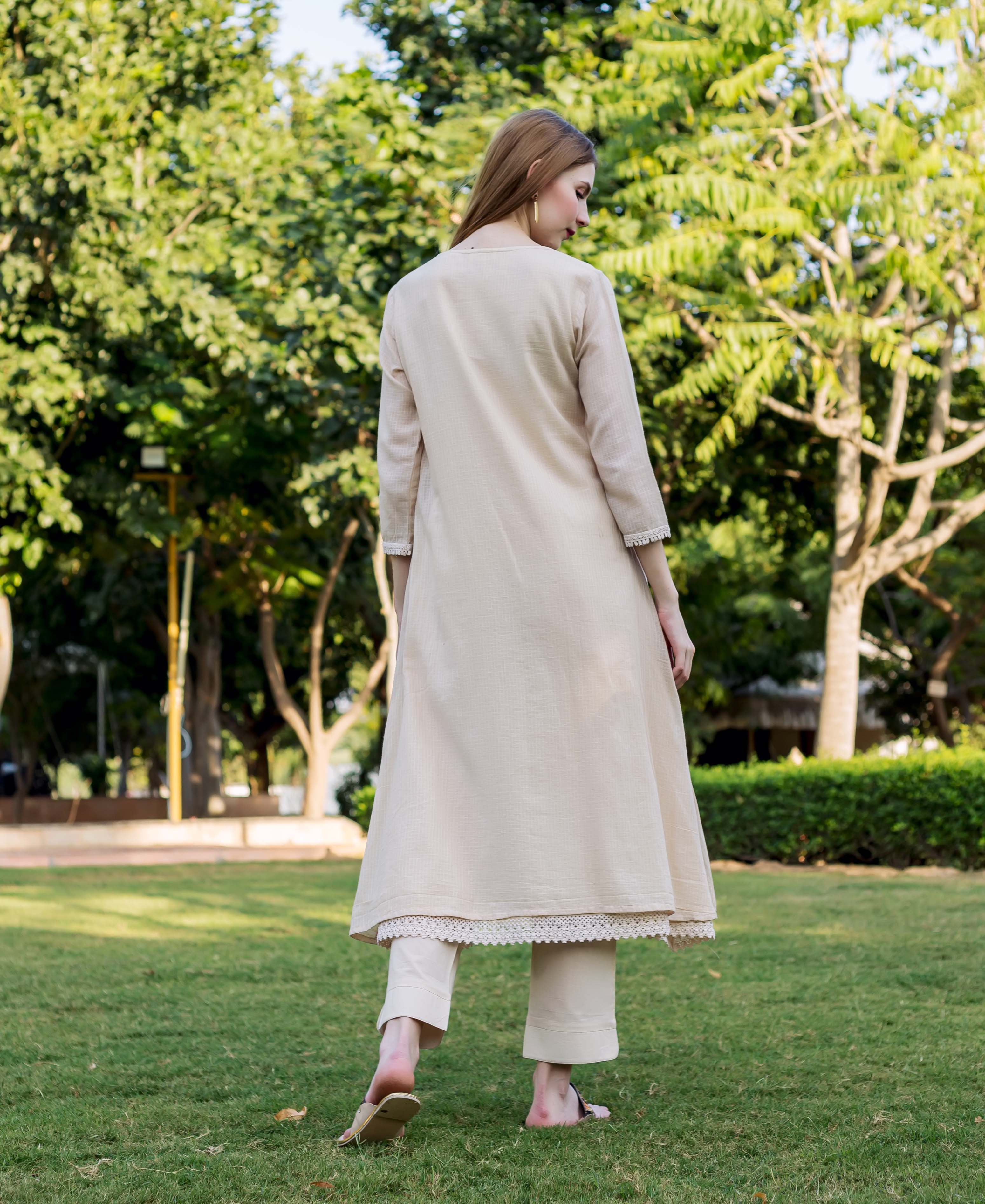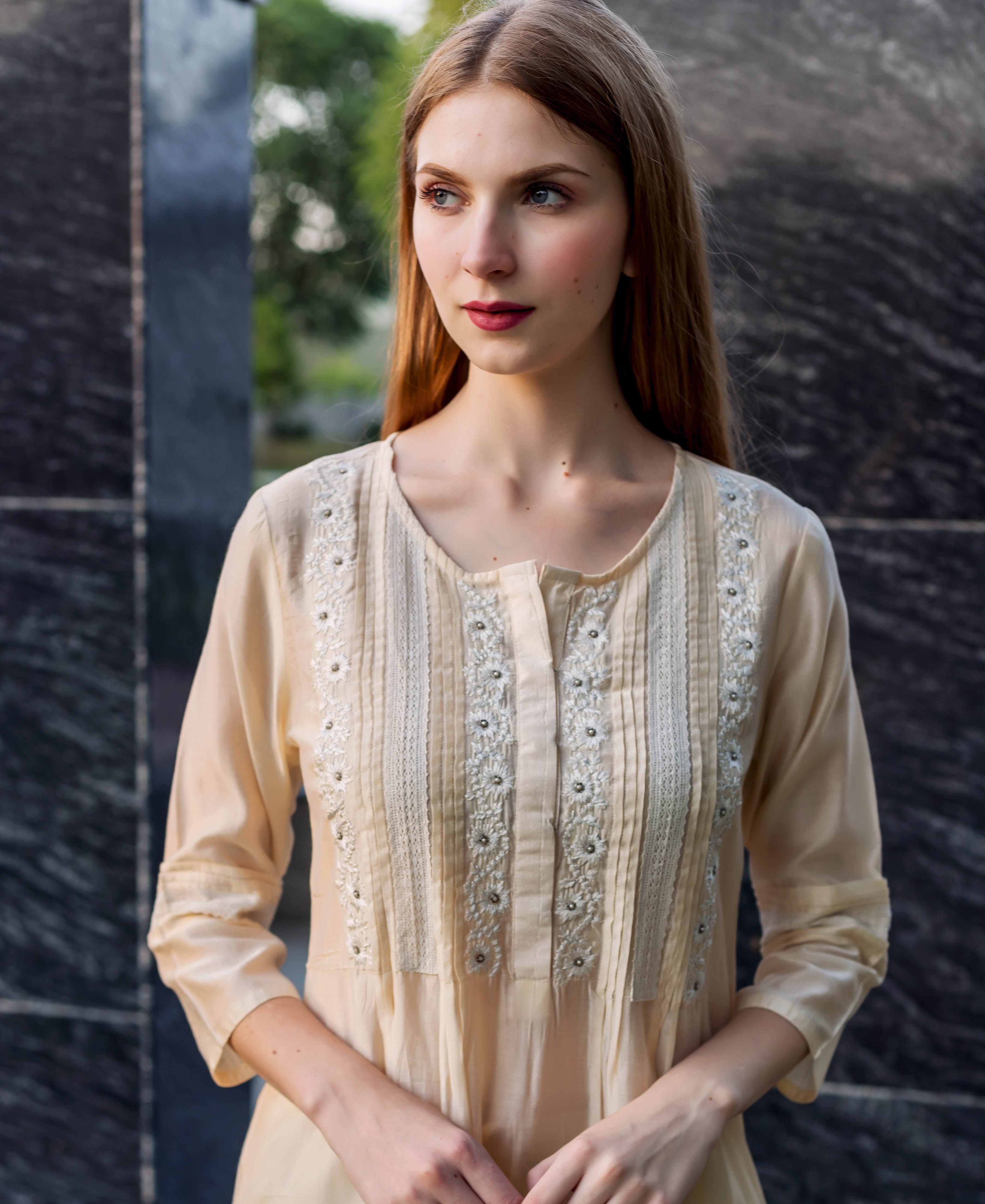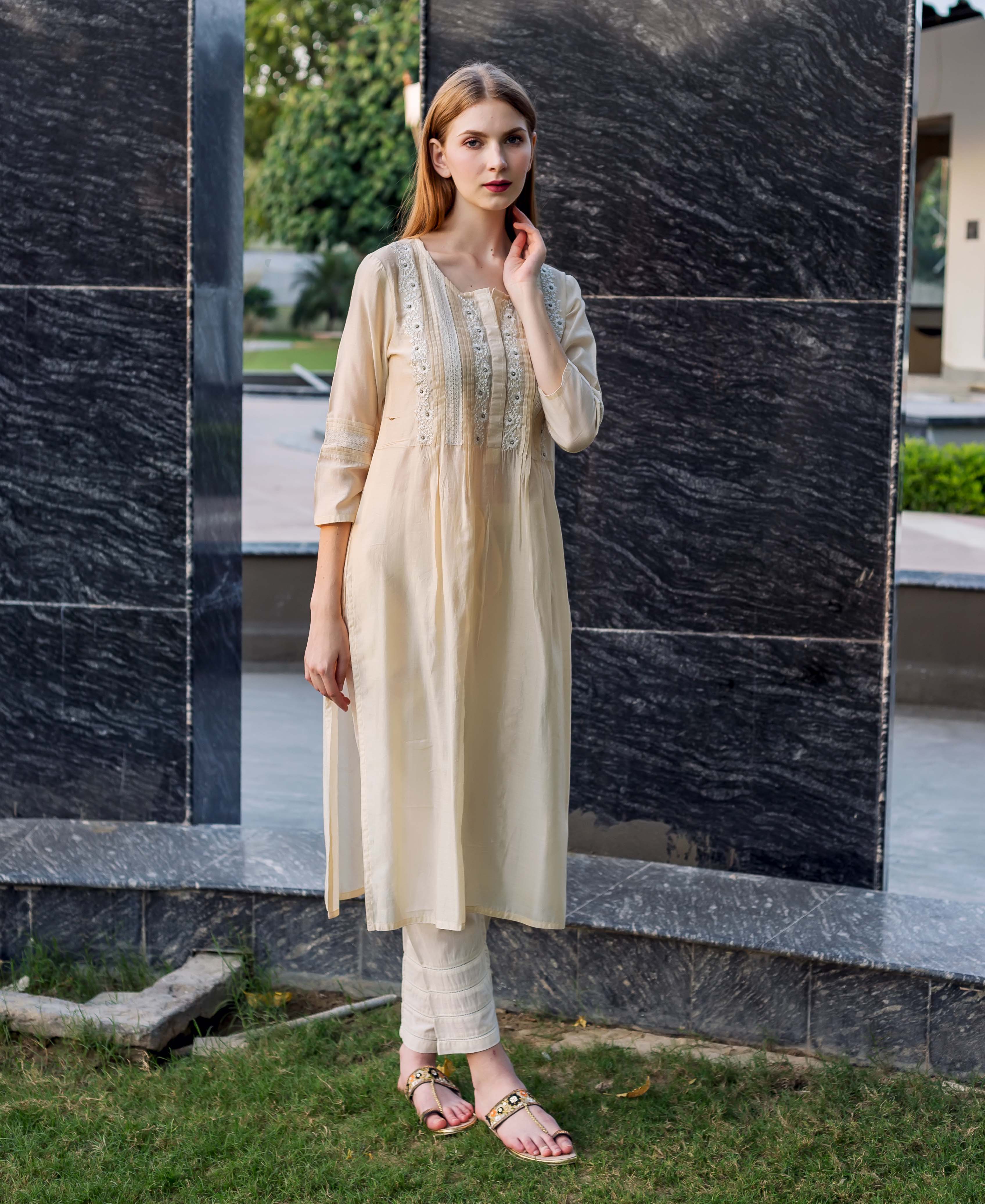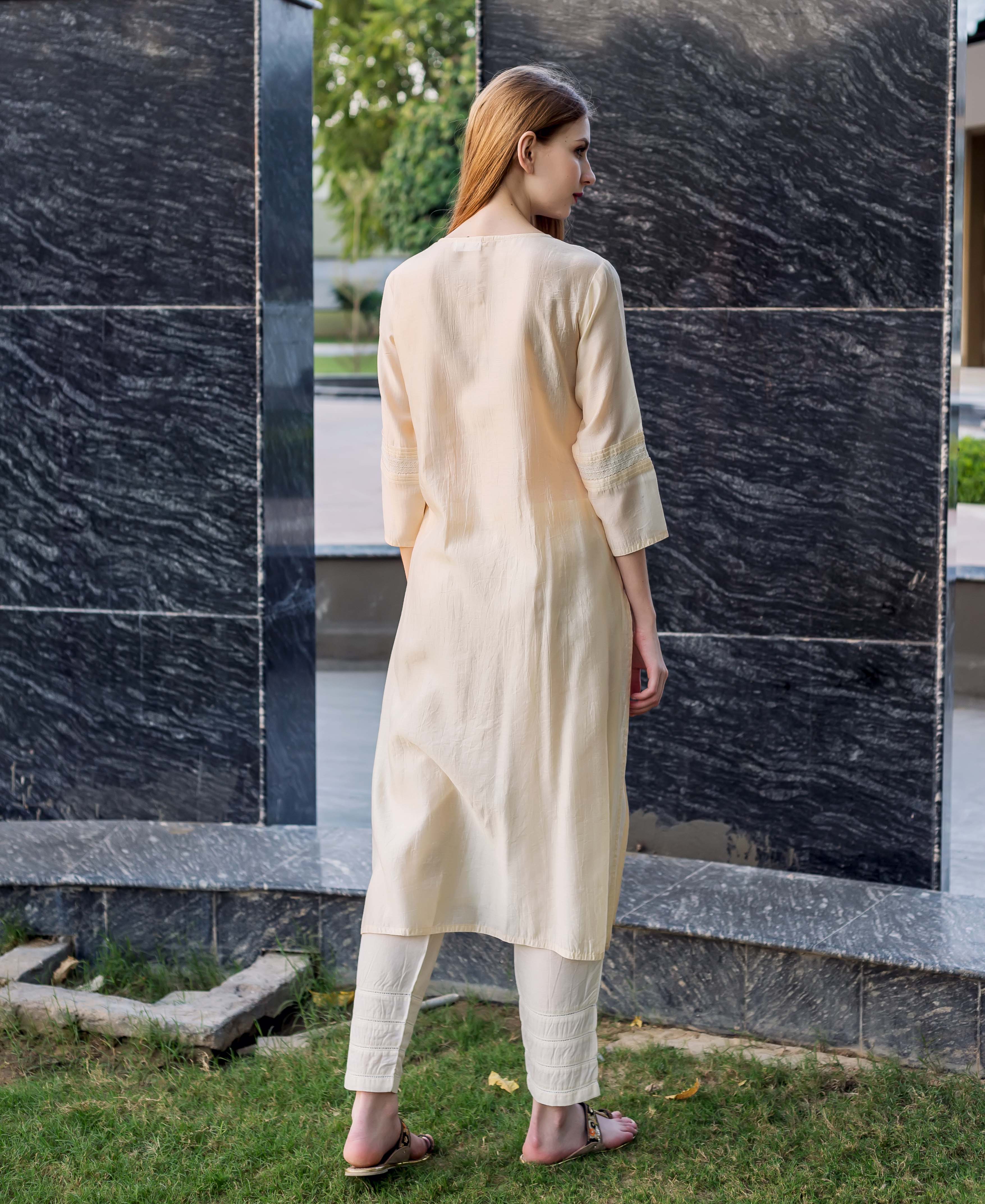 Off White Straight Embroidered Kurta with Pintuck and Lace Details