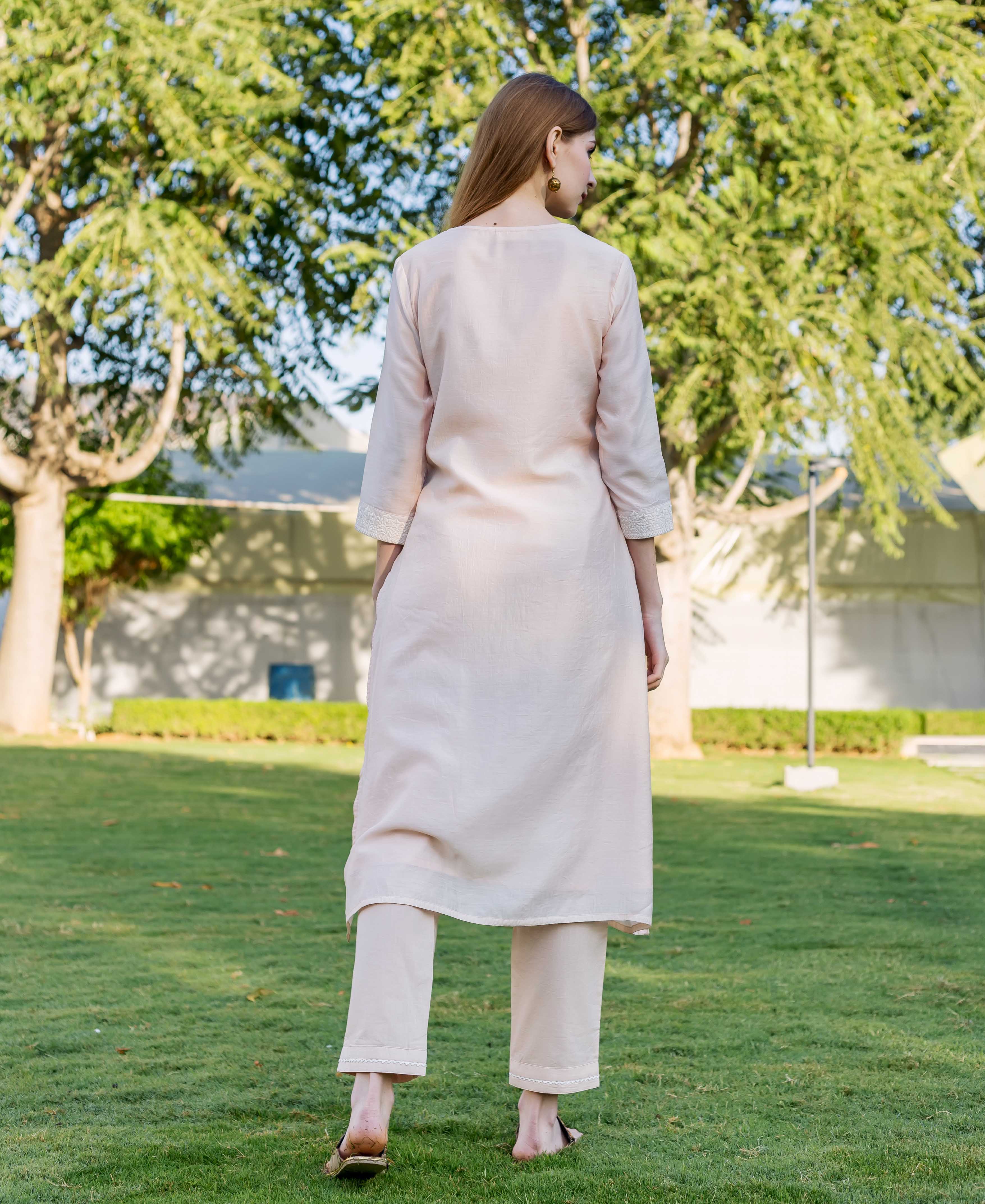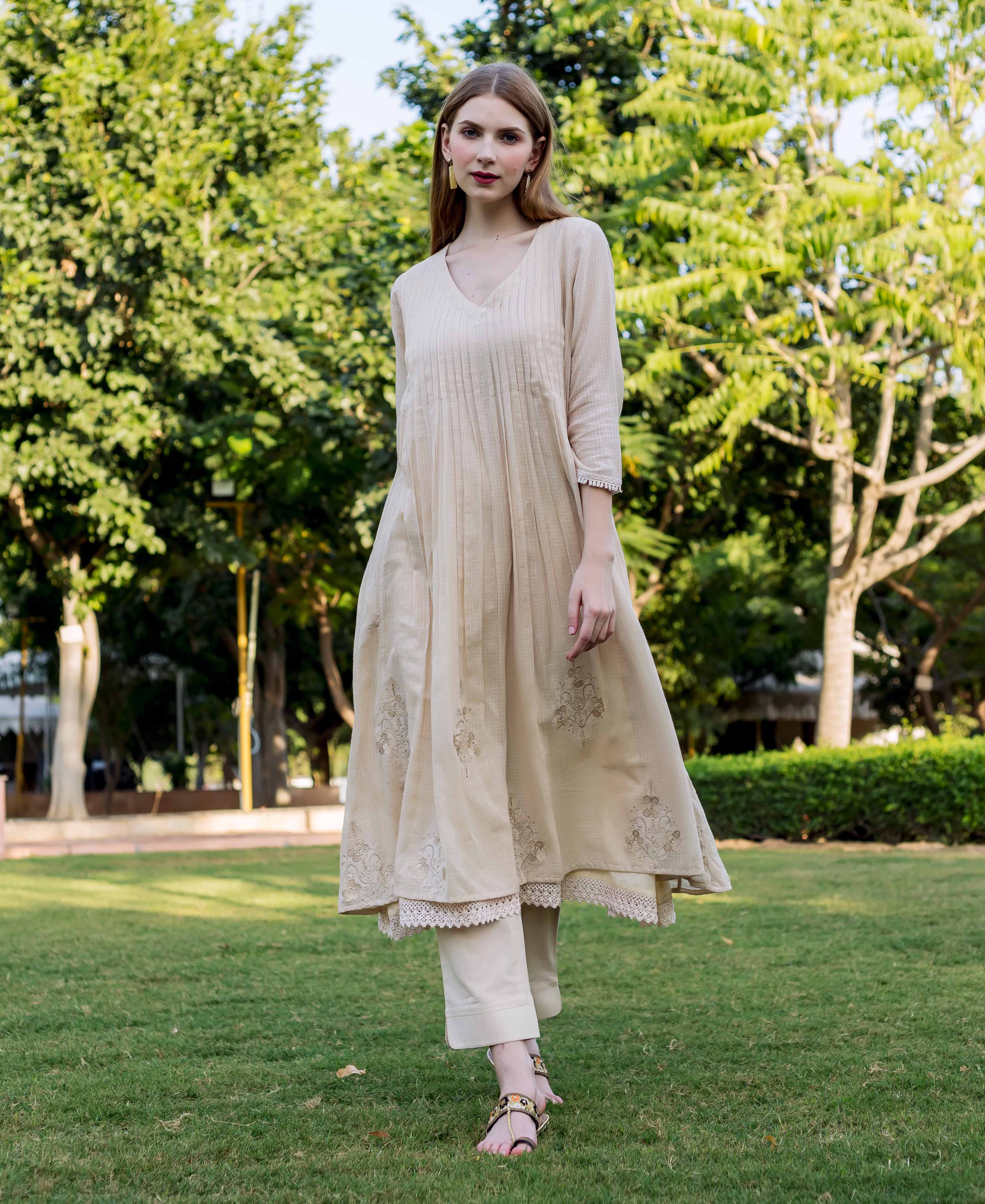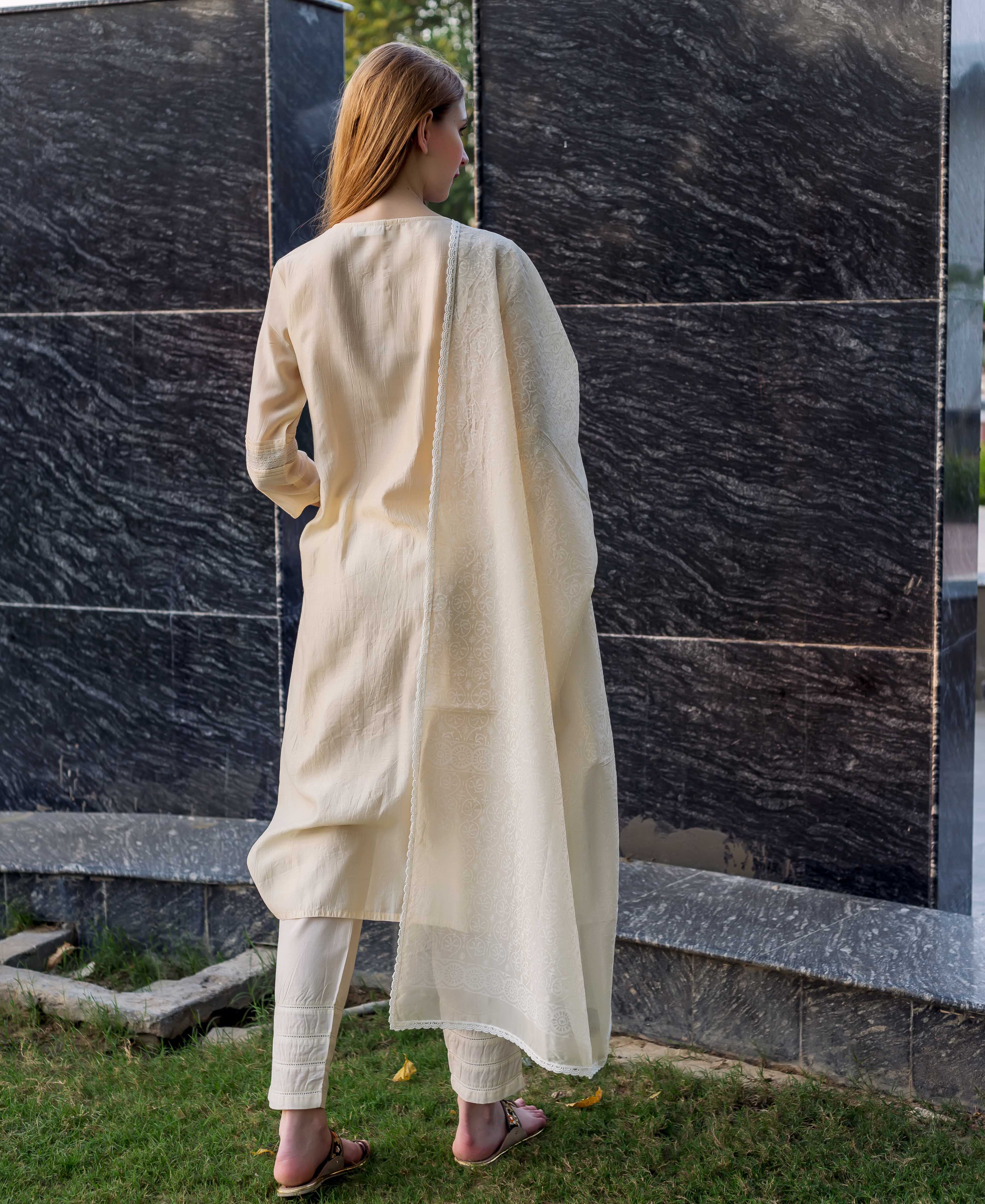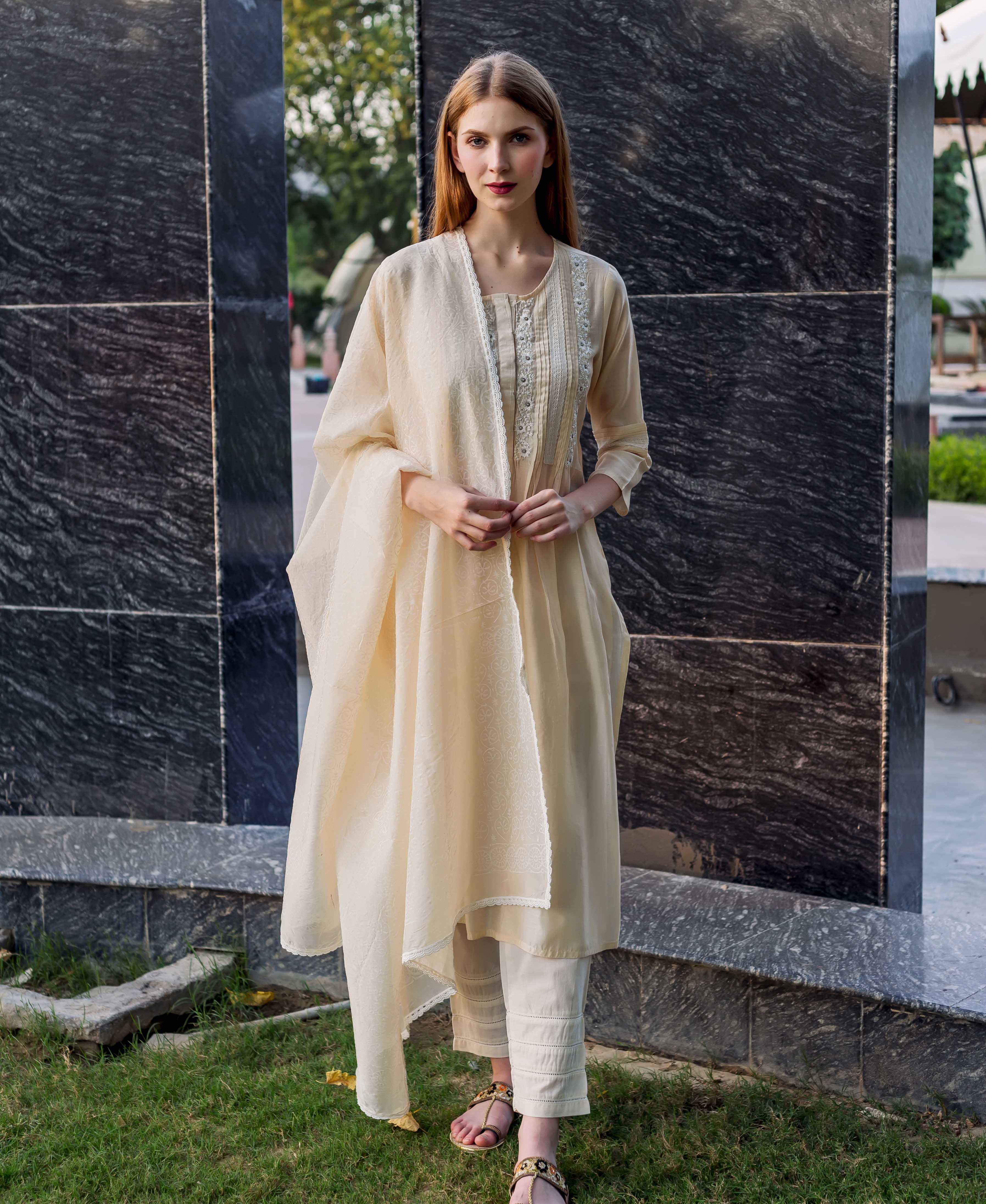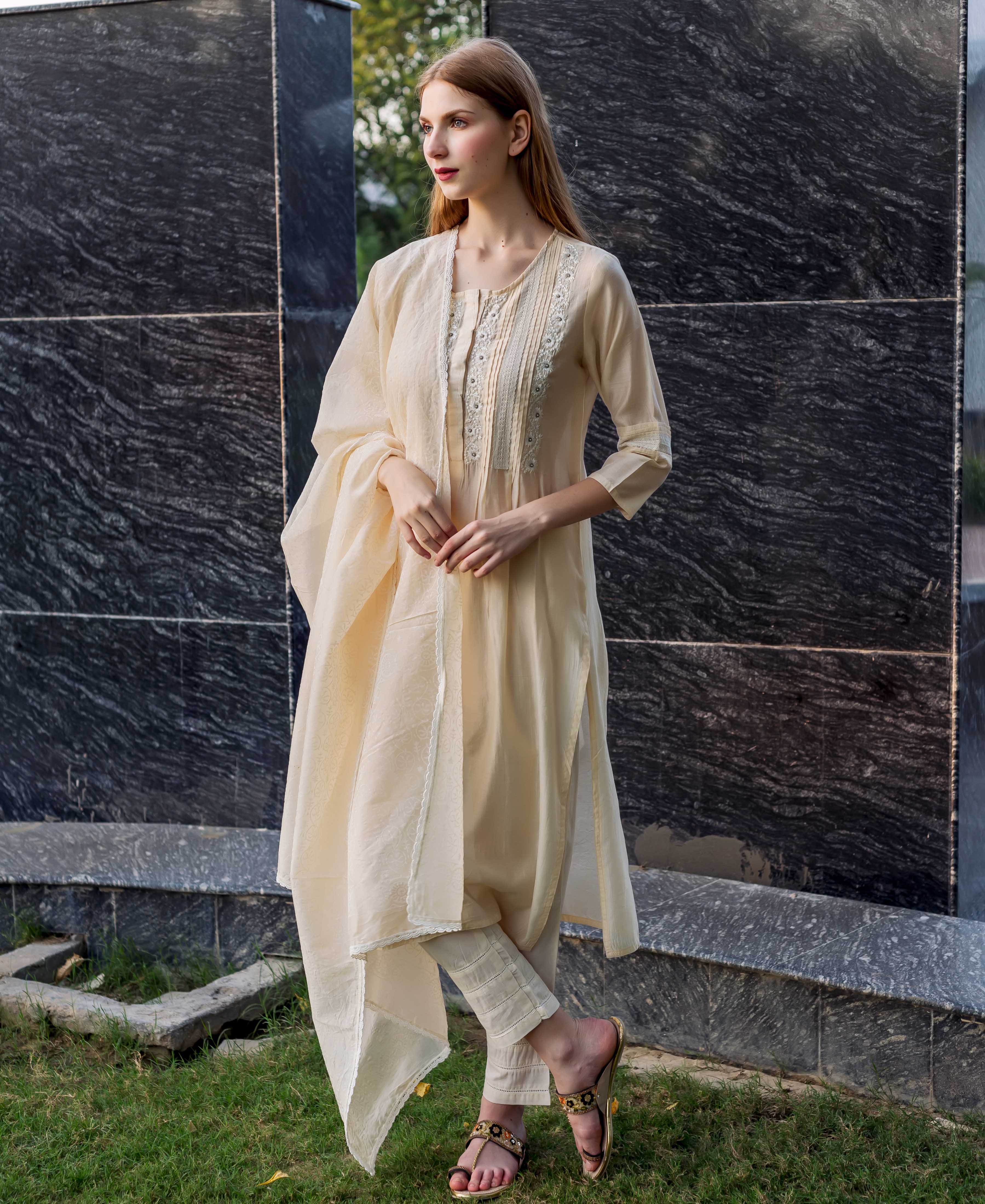 Off White Straight Embroidered Kurta with Pintuck and Lace Details