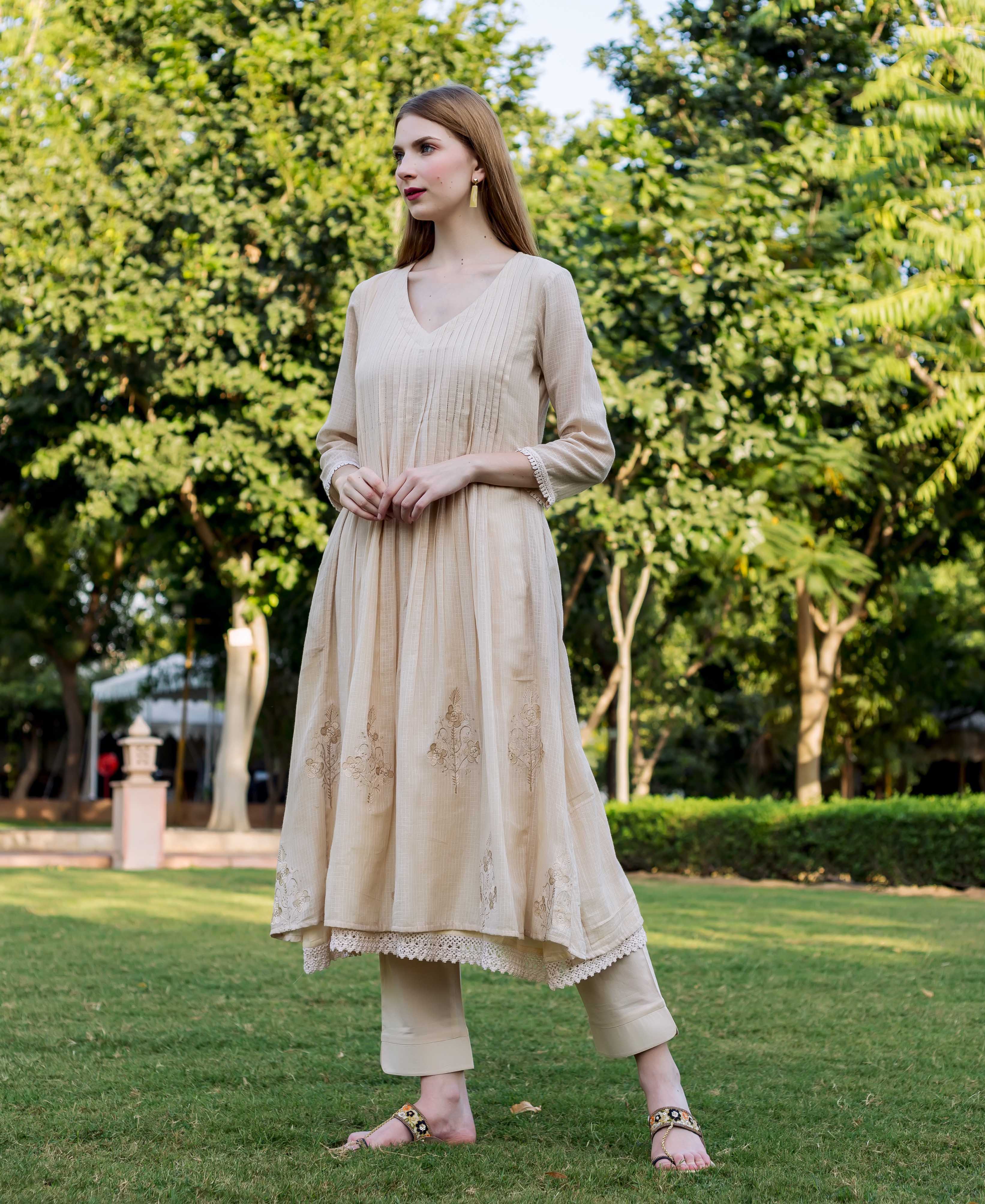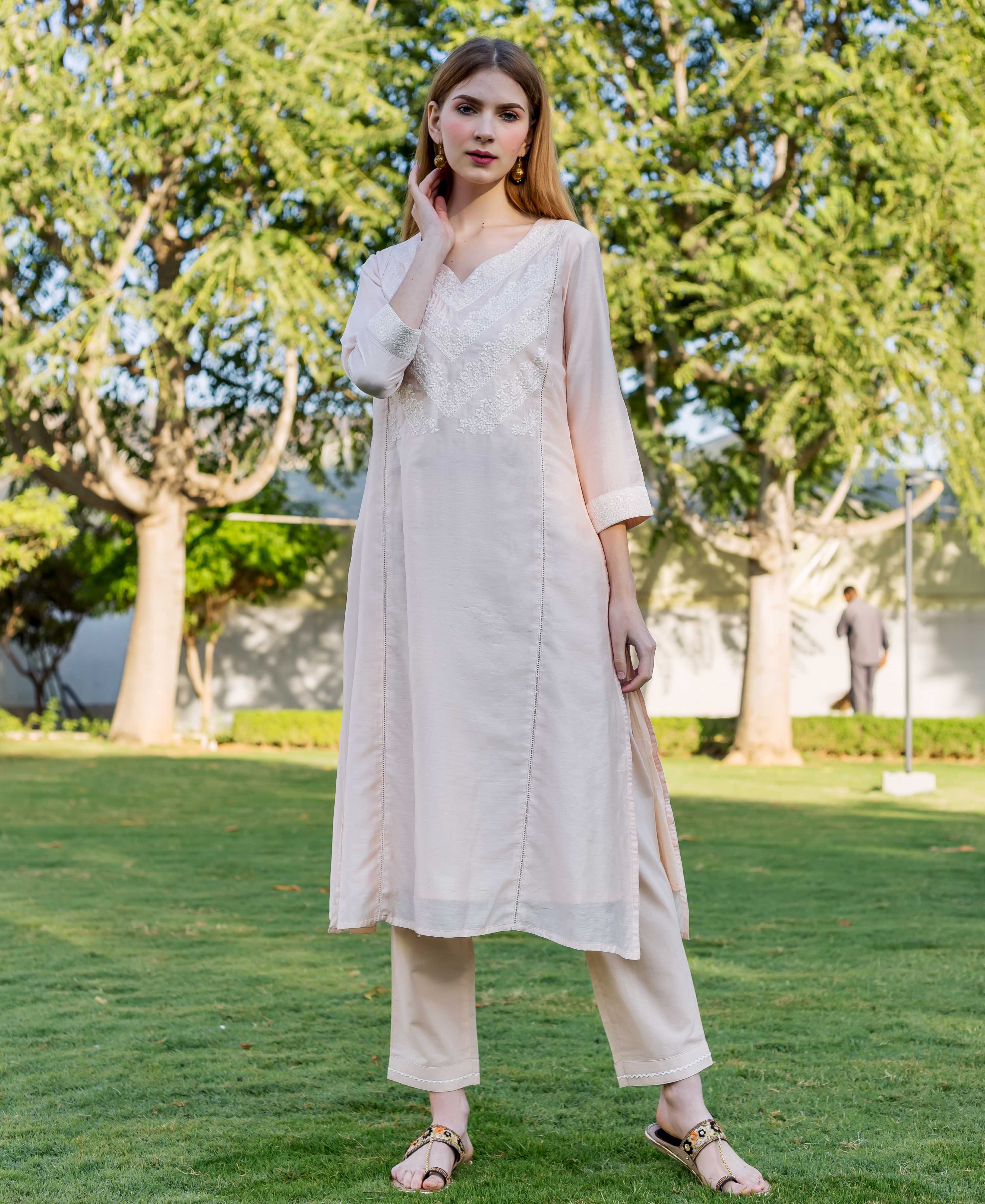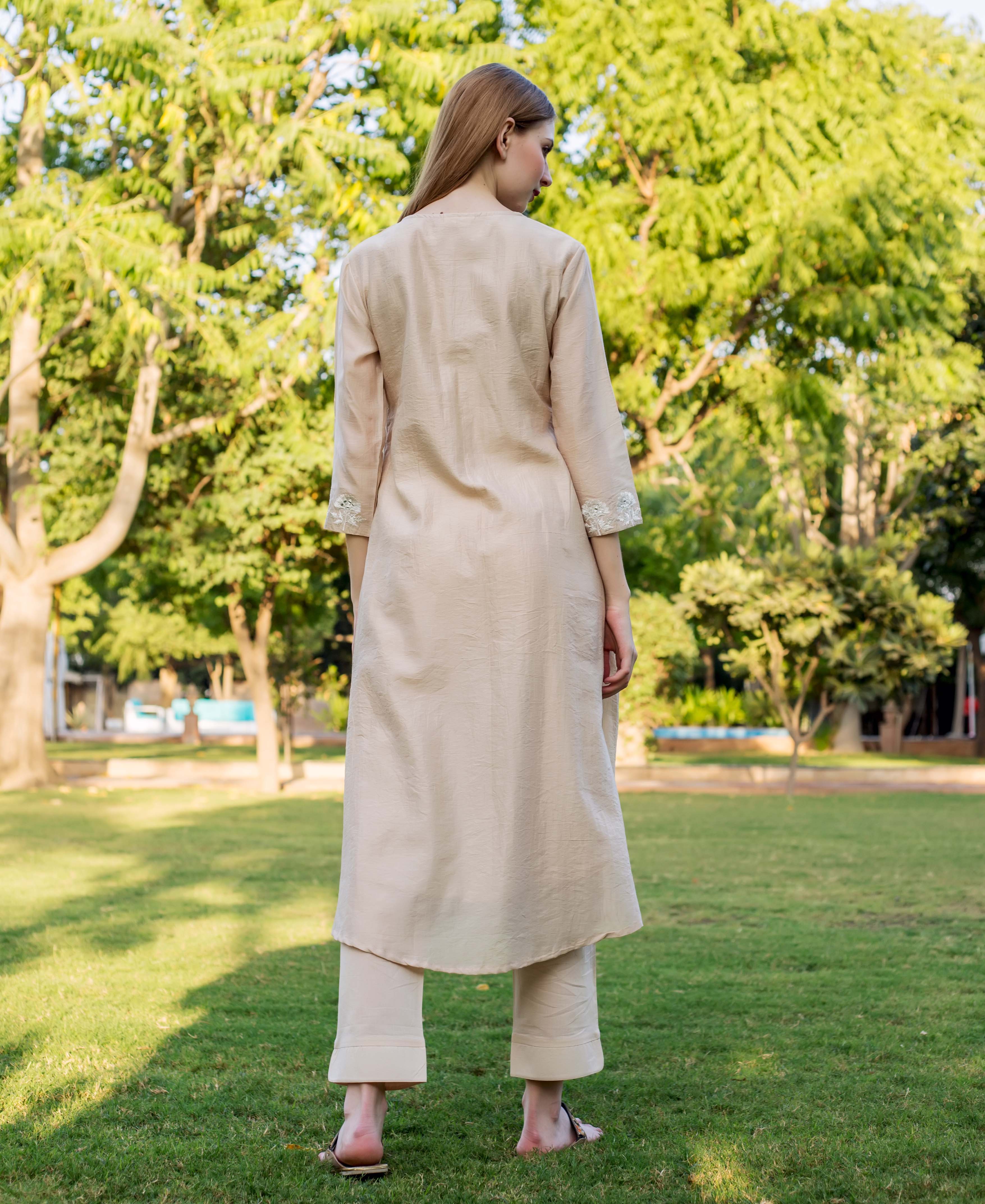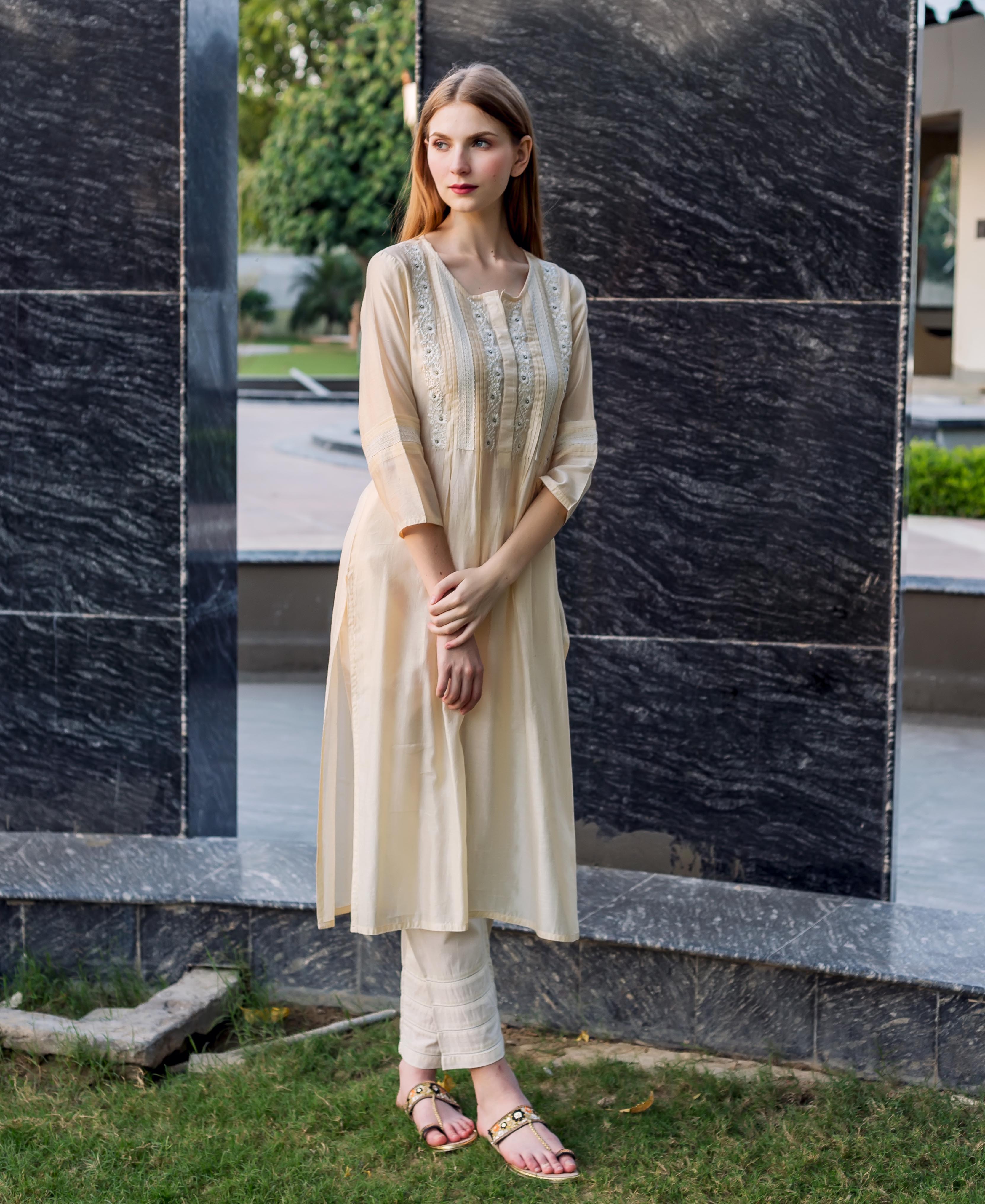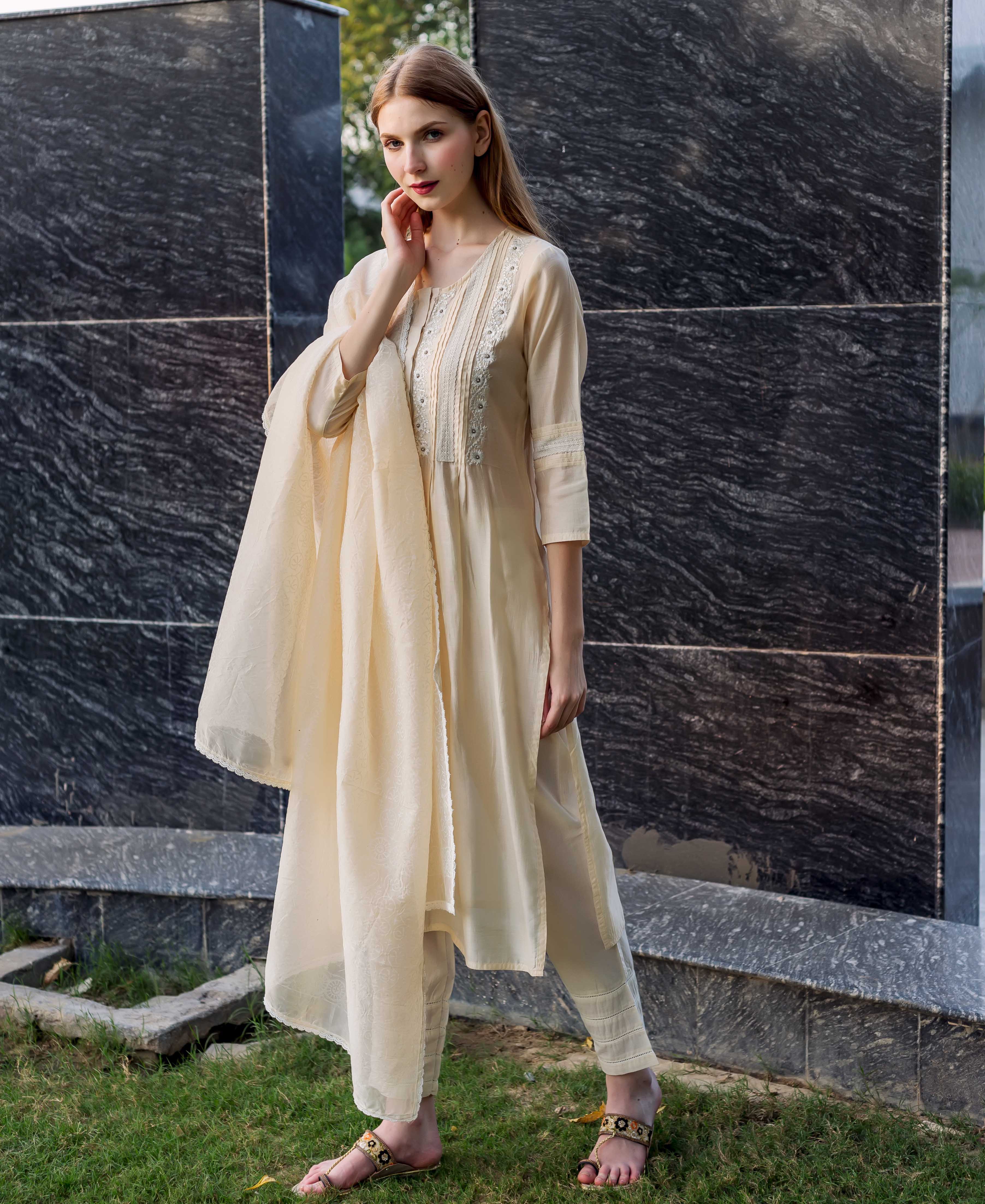 Off White Straight Embroidered Kurta with Pintuck and Lace Details