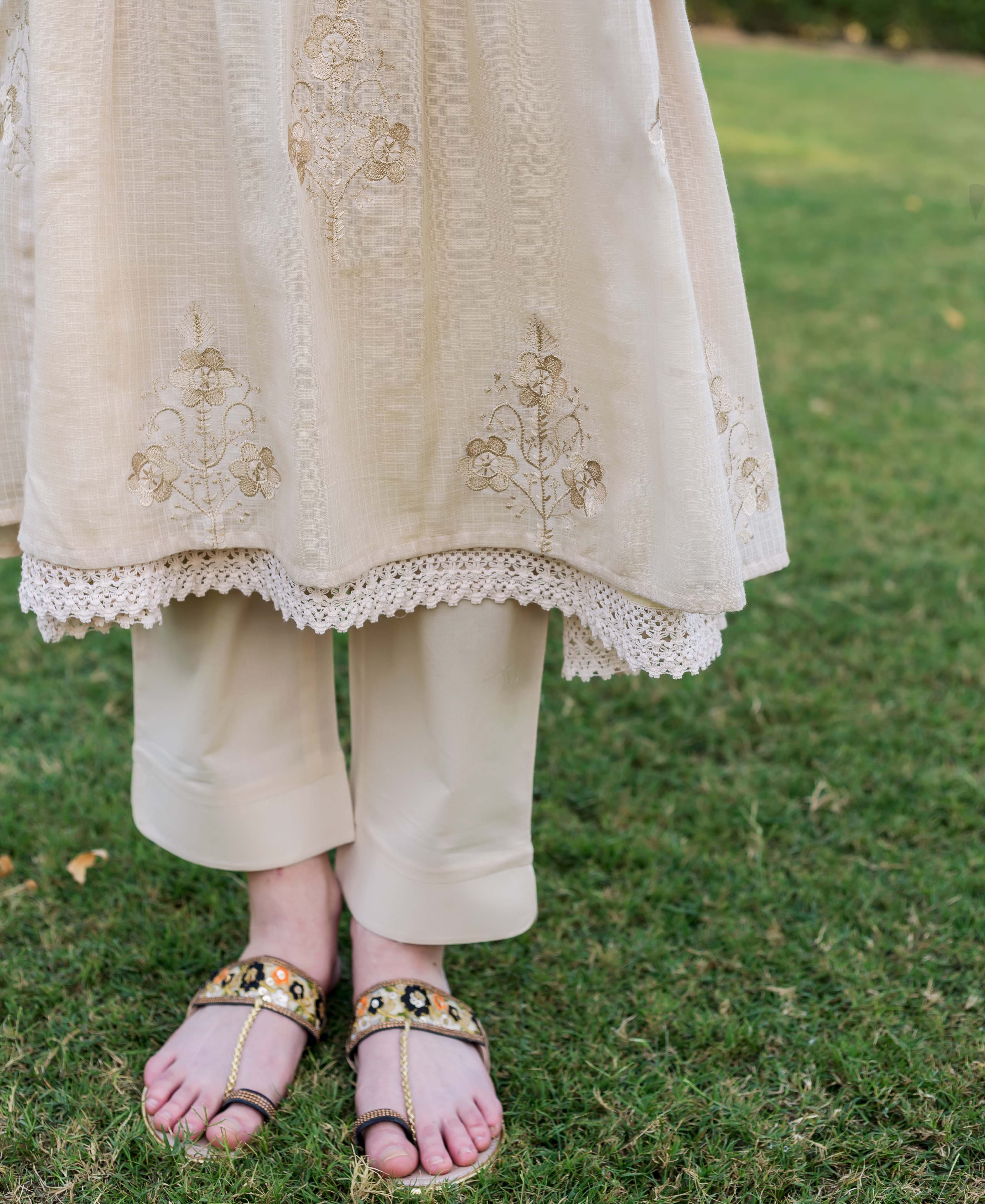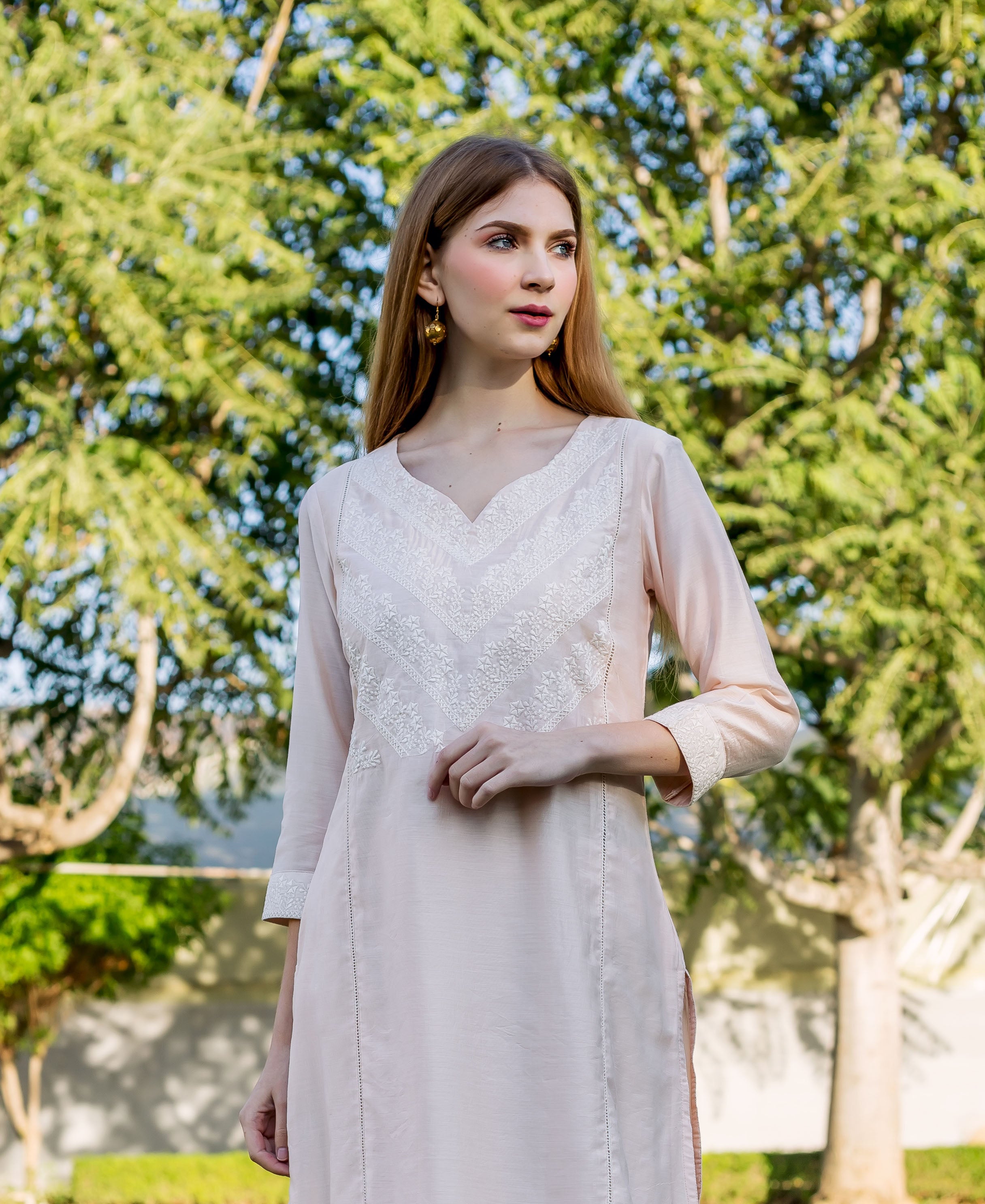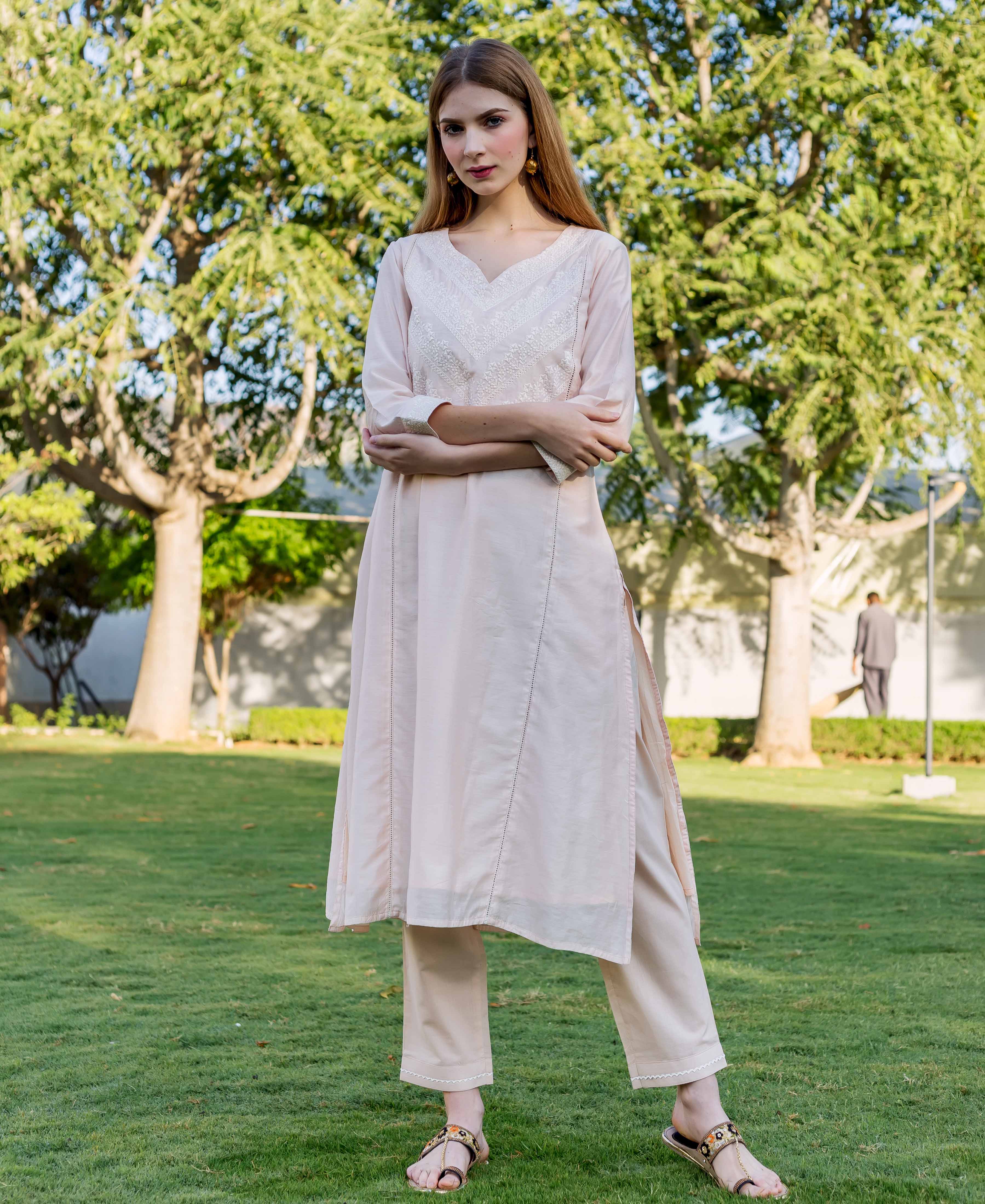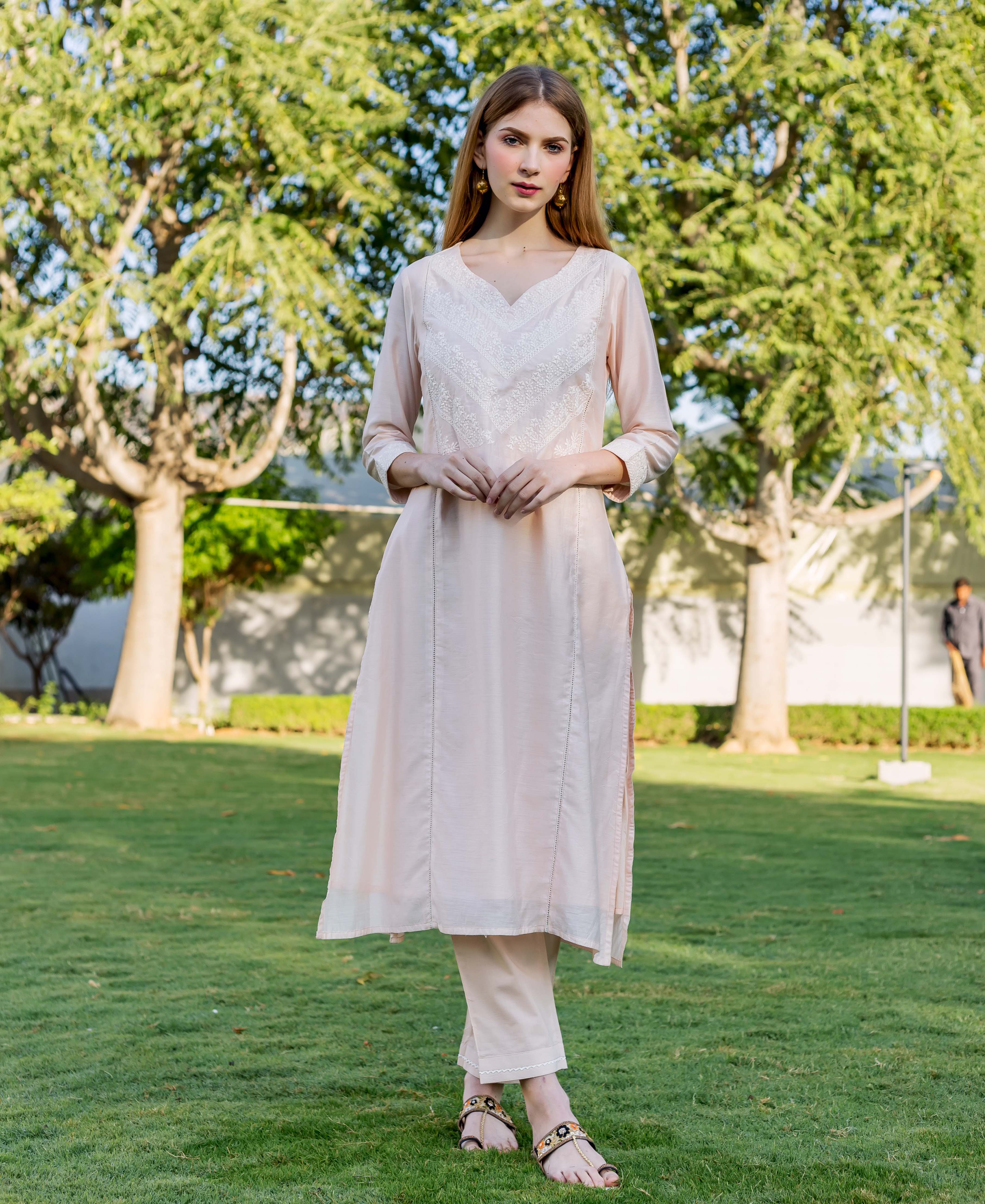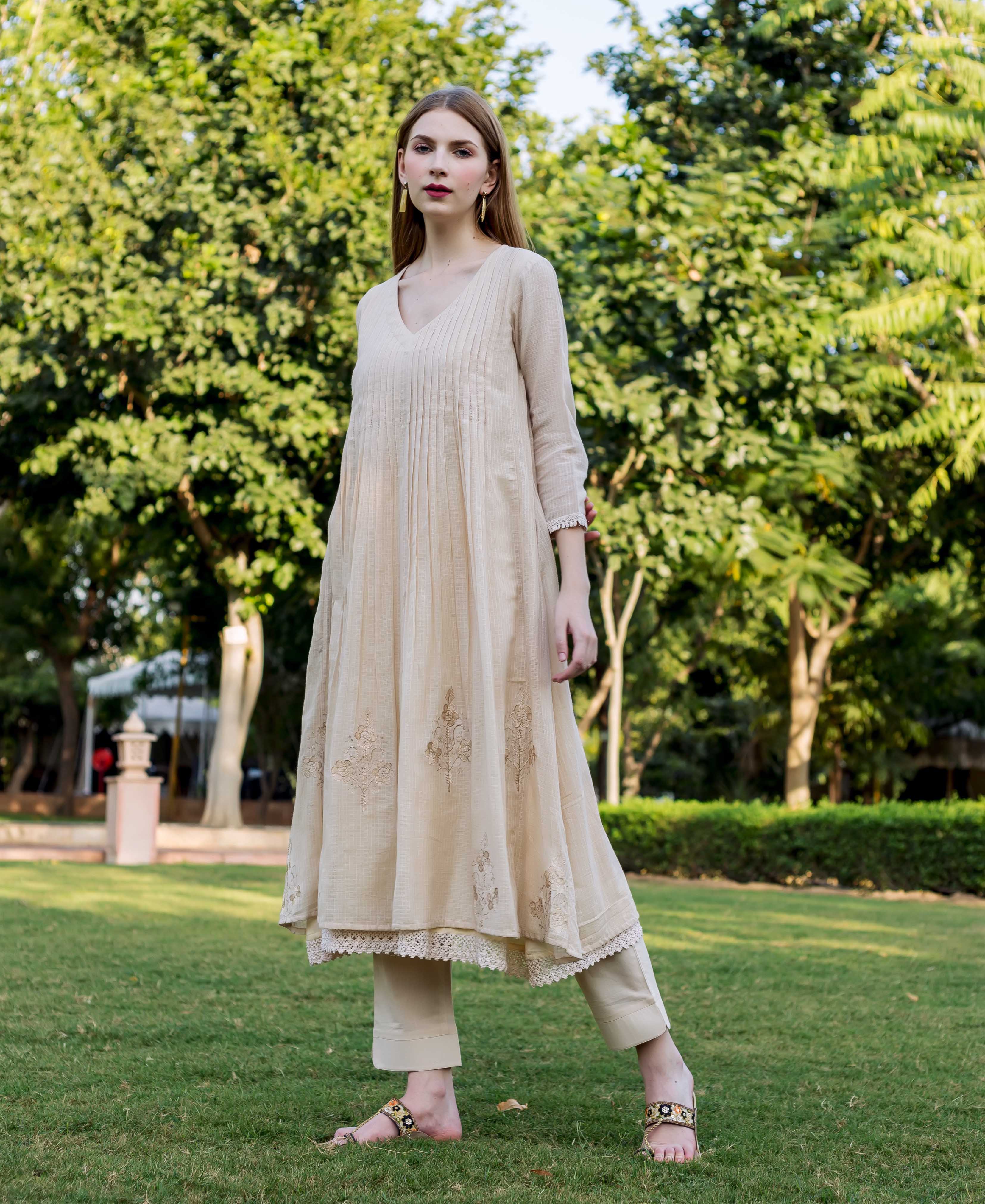 Off White Straight Embroidered Kurta with Pintuck and Lace Details