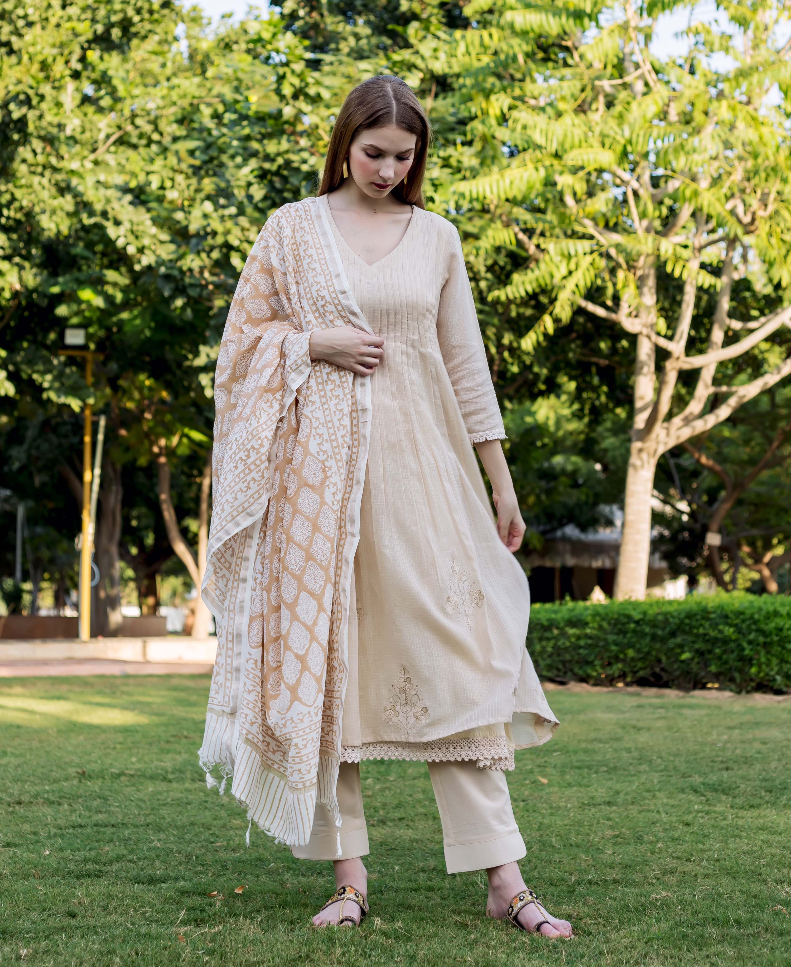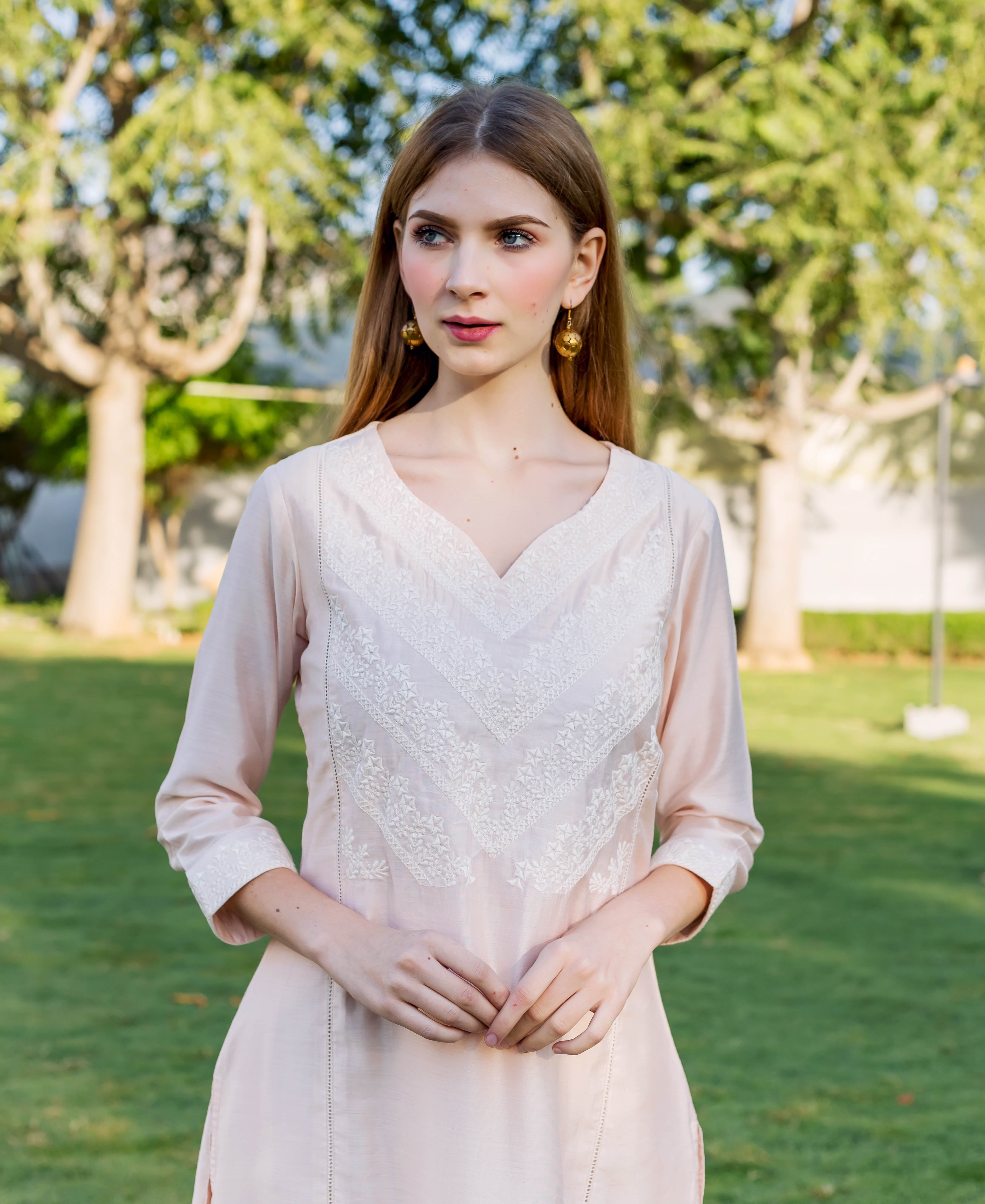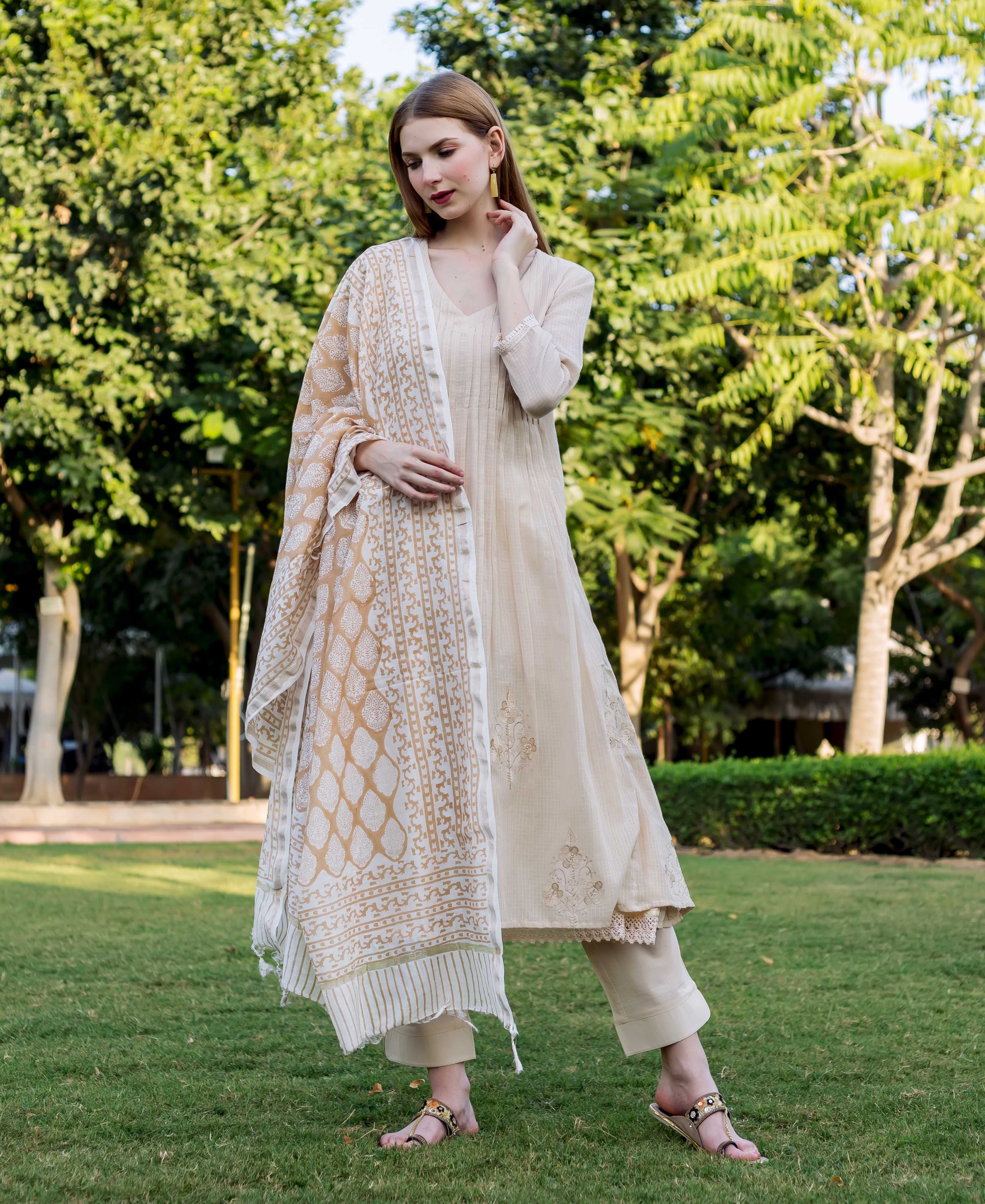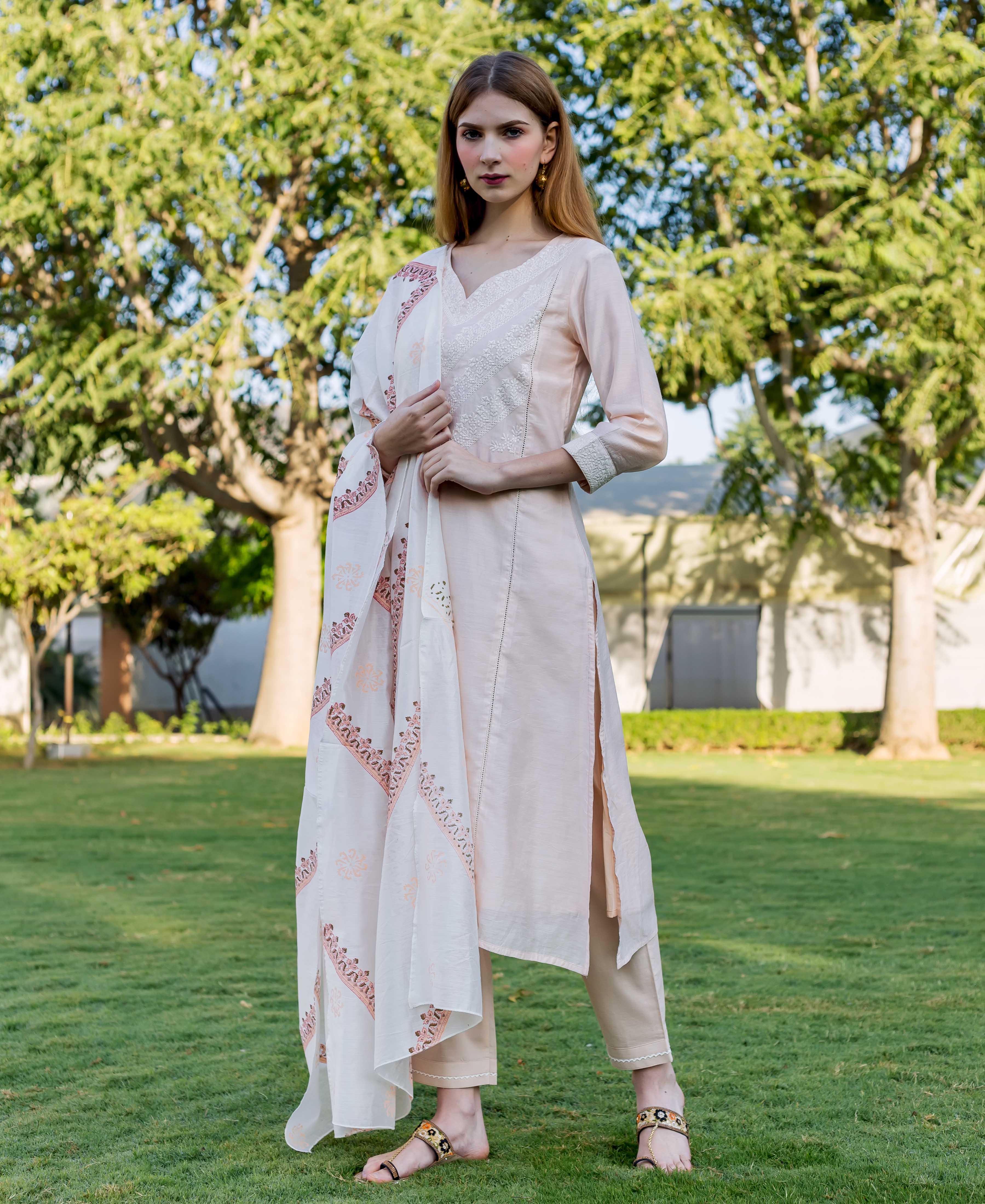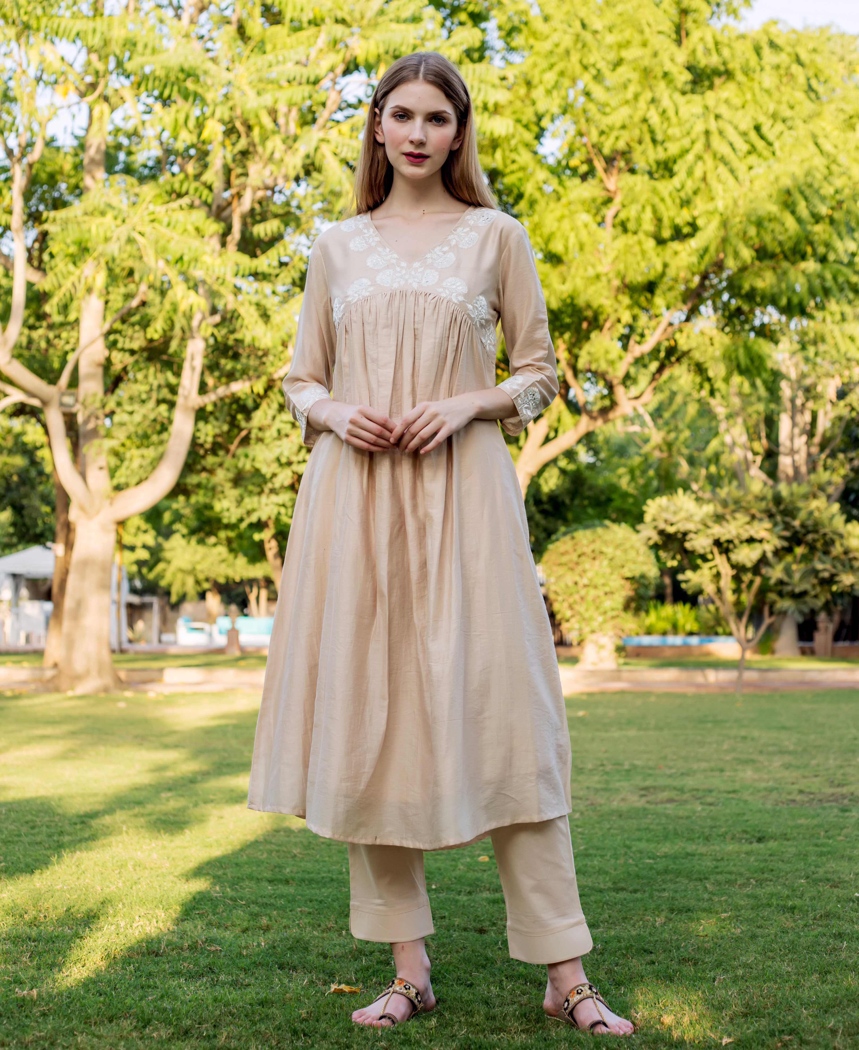 Off White Straight Embroidered Kurta with Pintuck and Lace Details