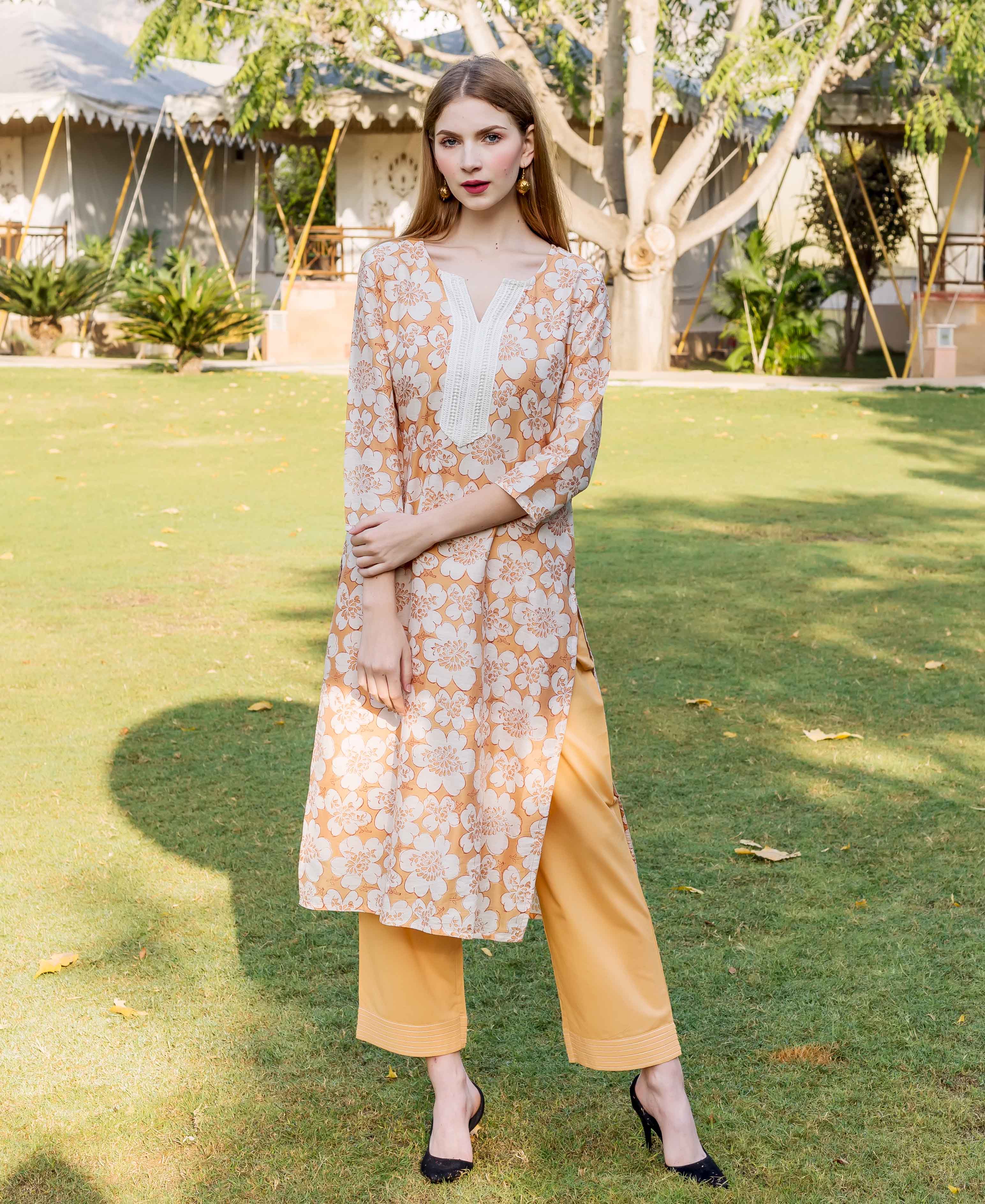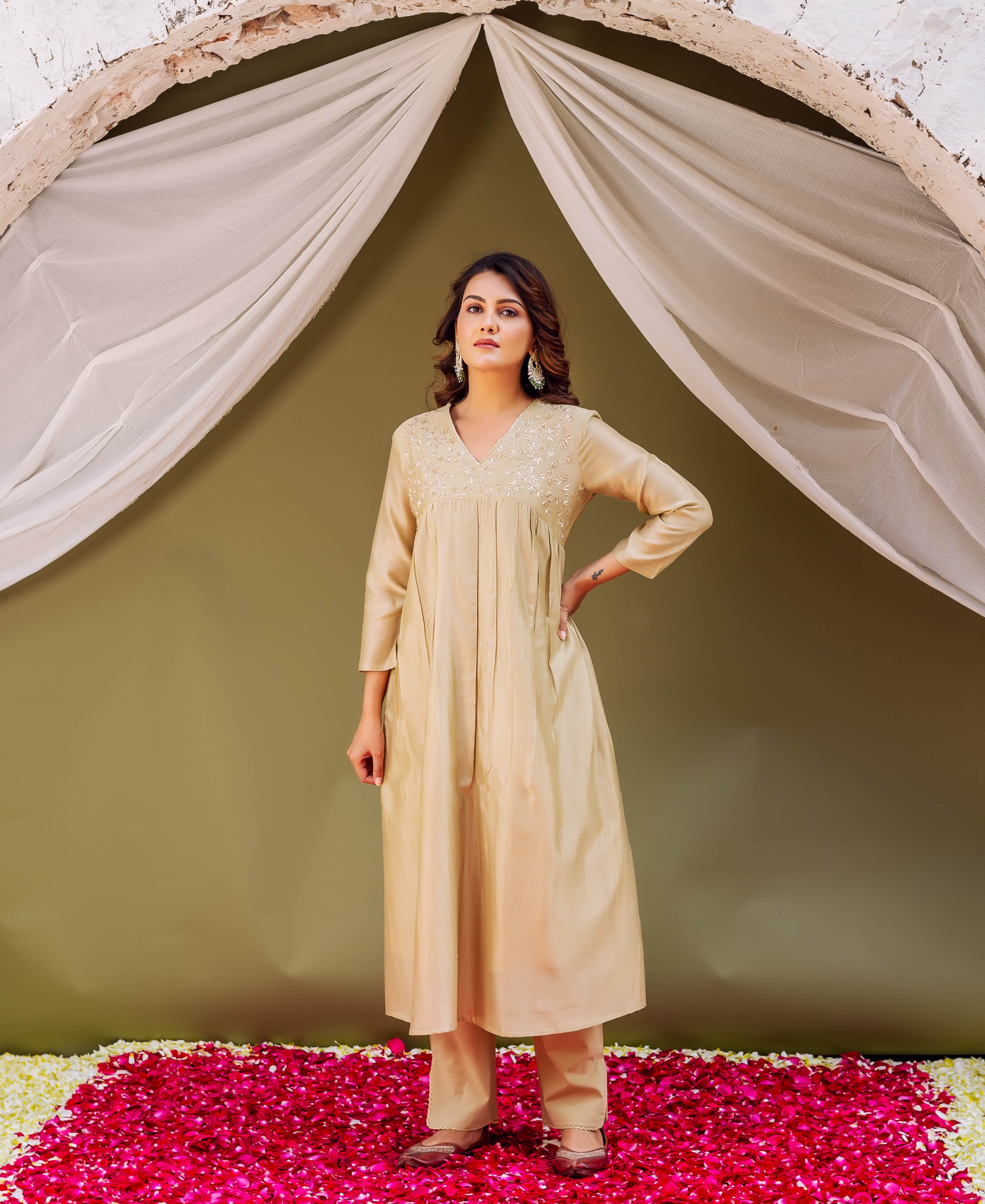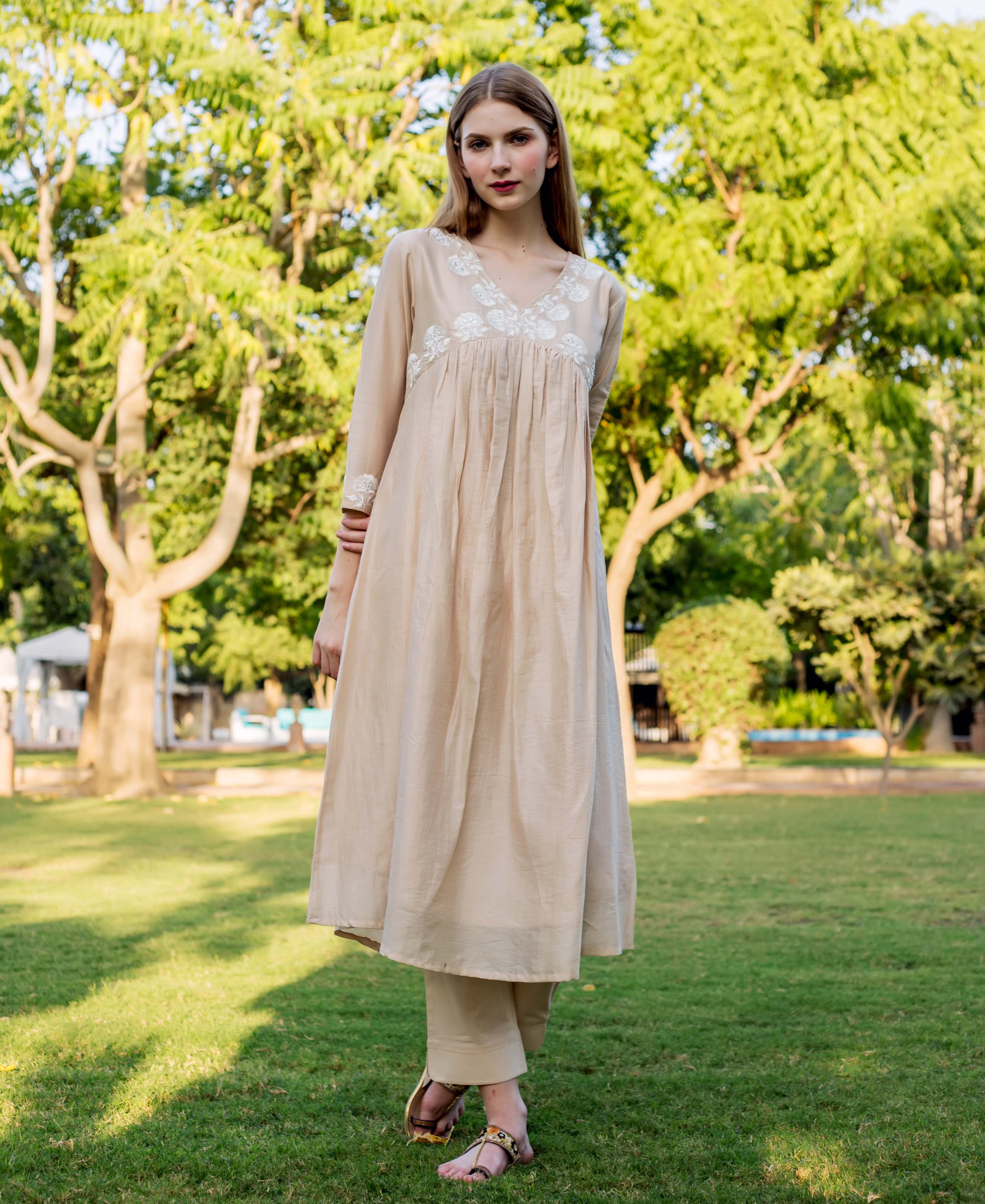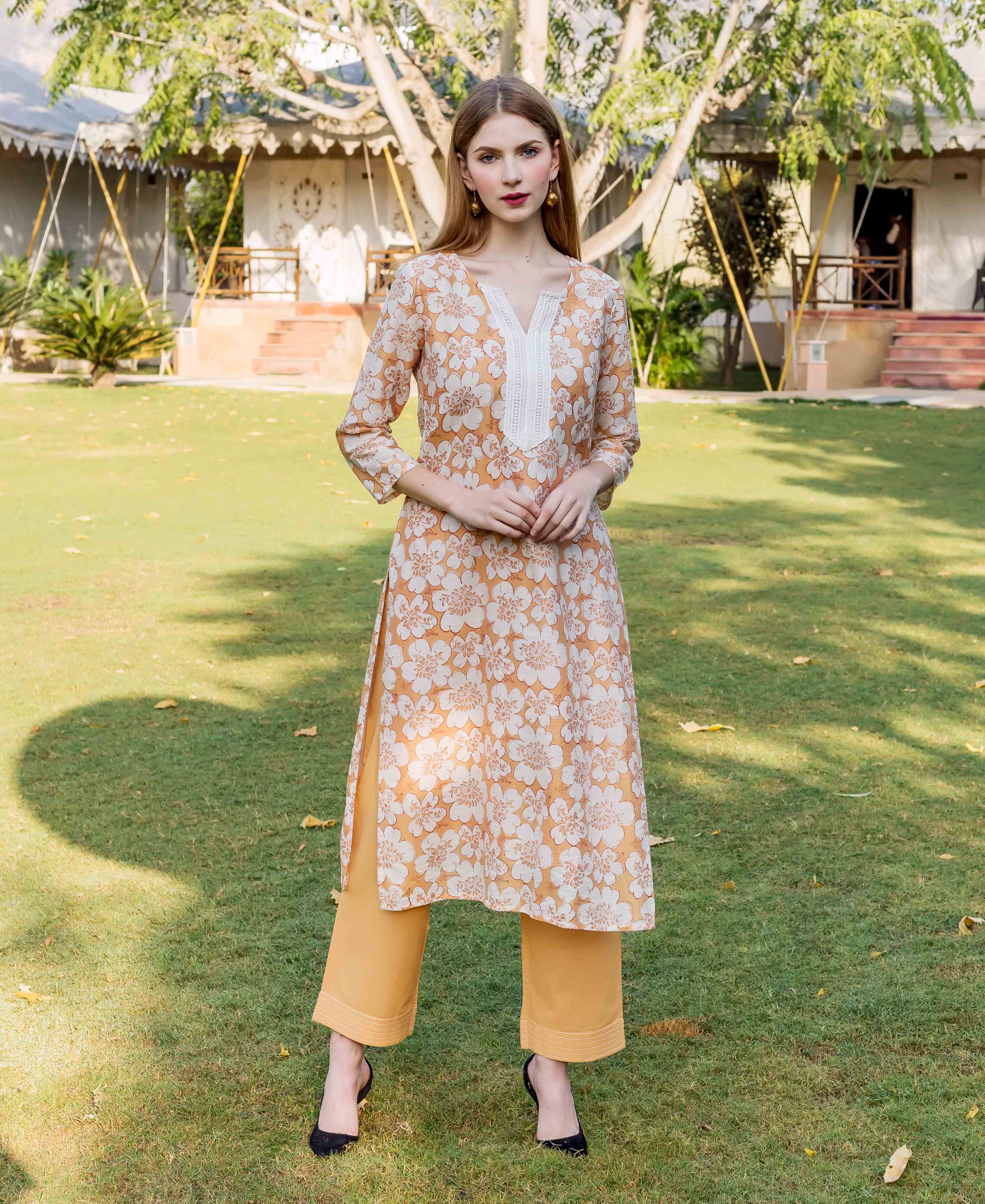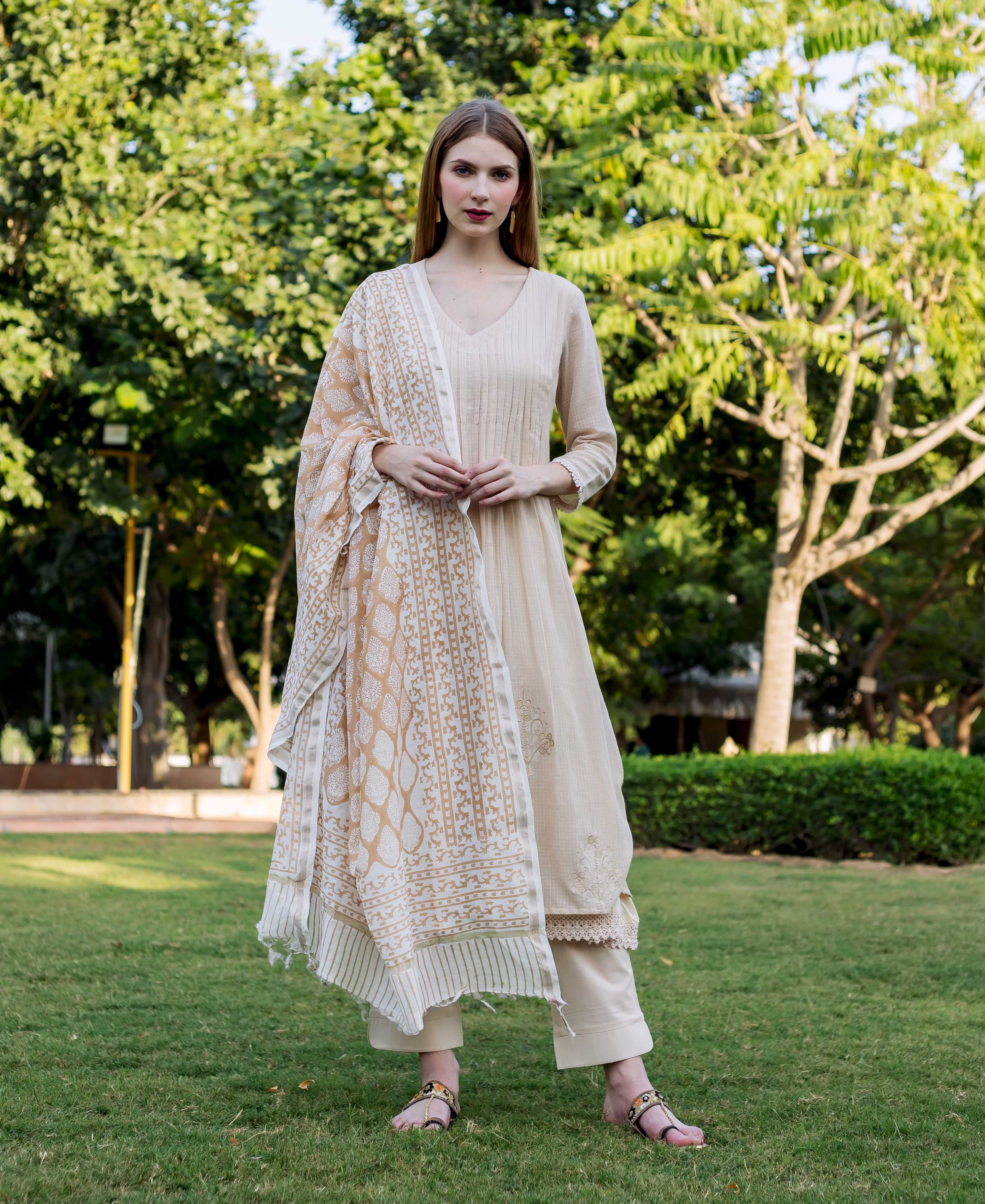 Off White Straight Embroidered Kurta with Pintuck and Lace Details