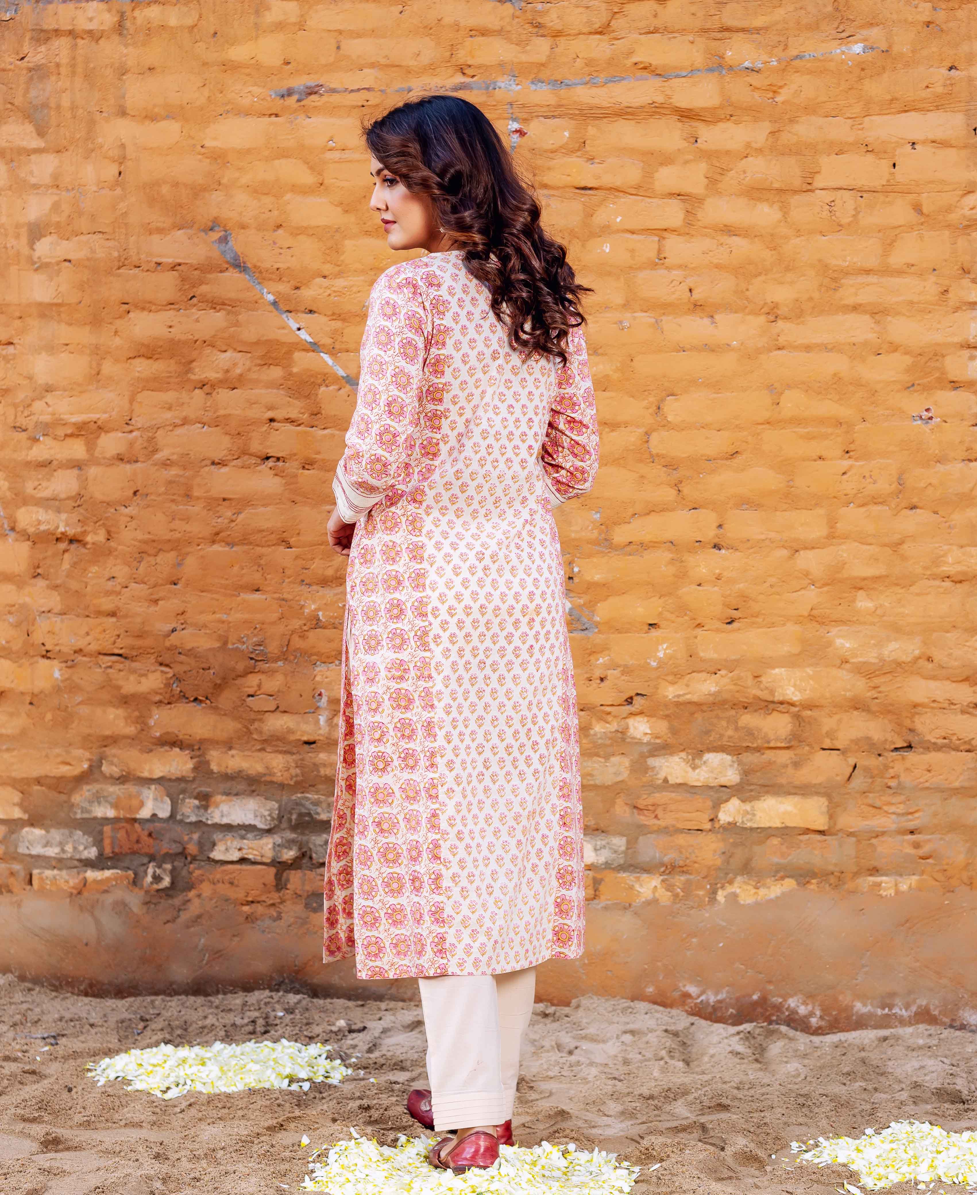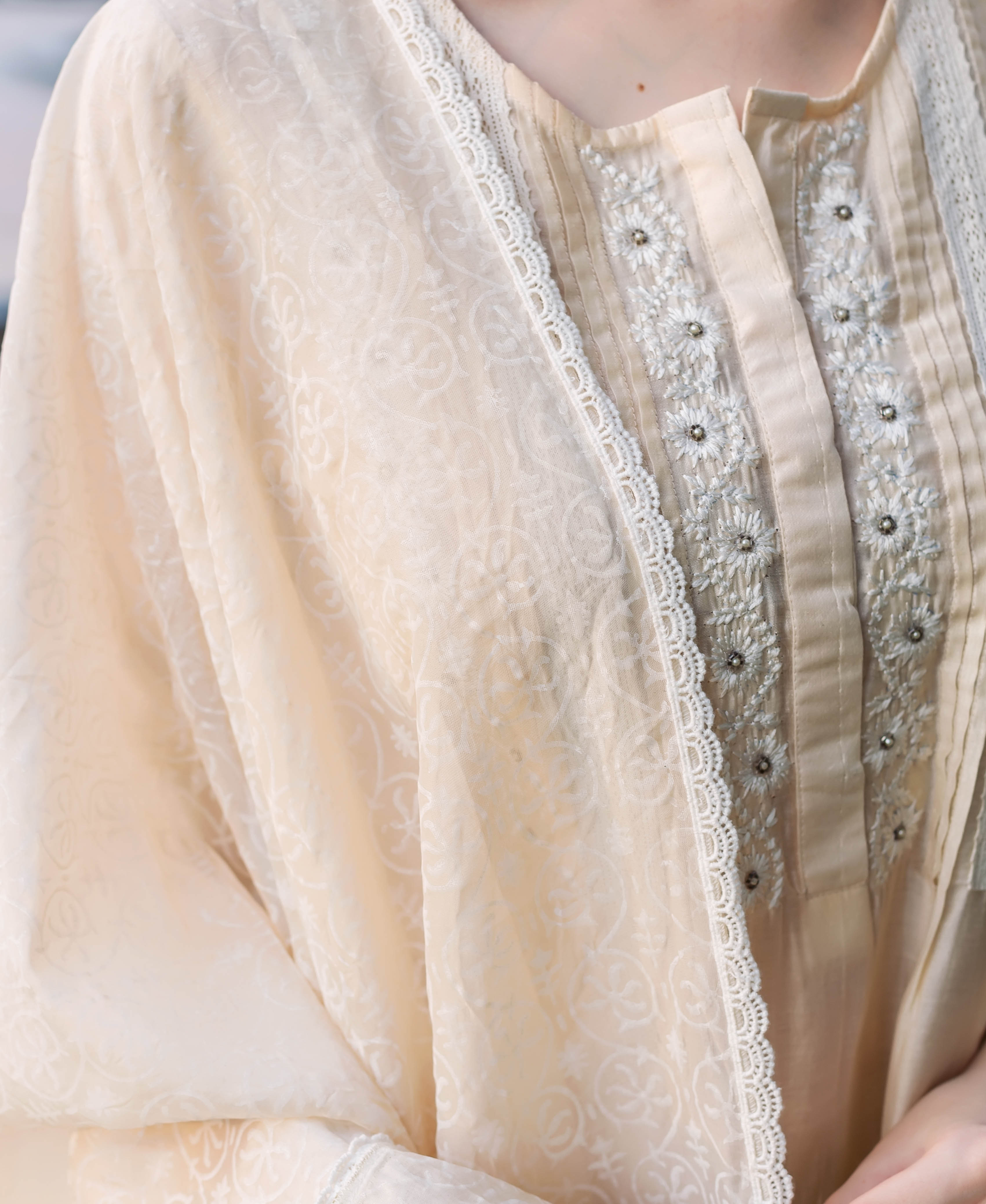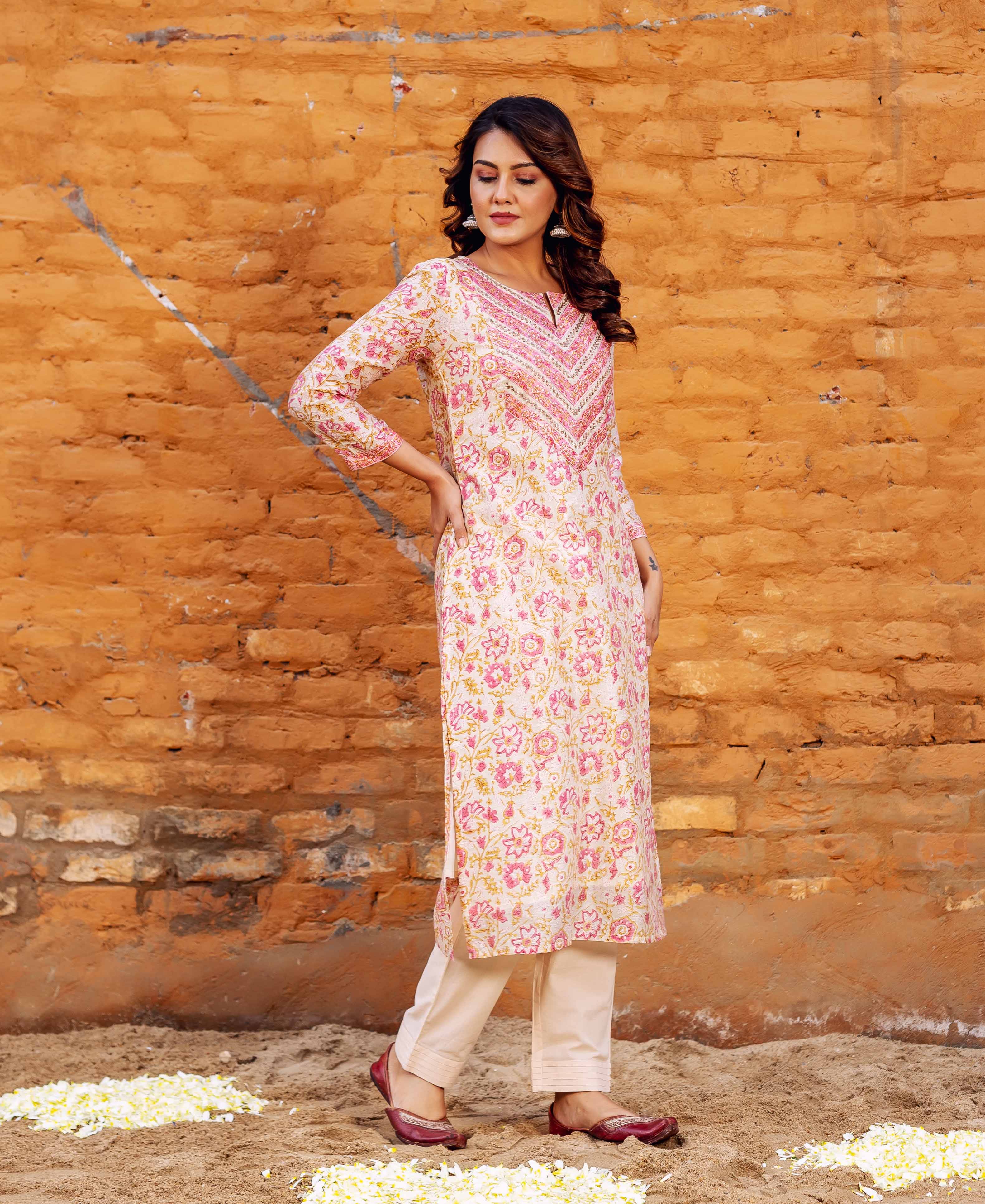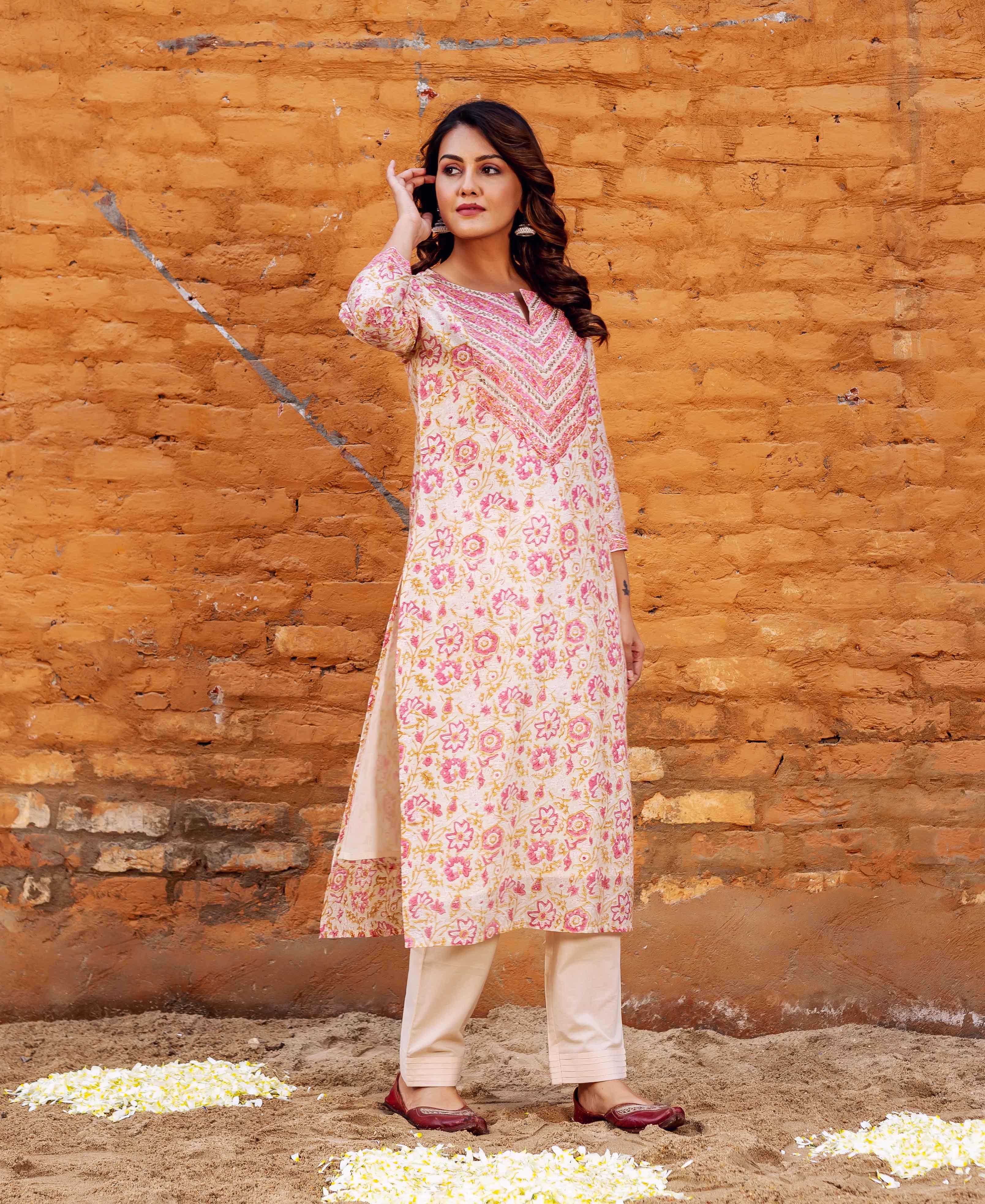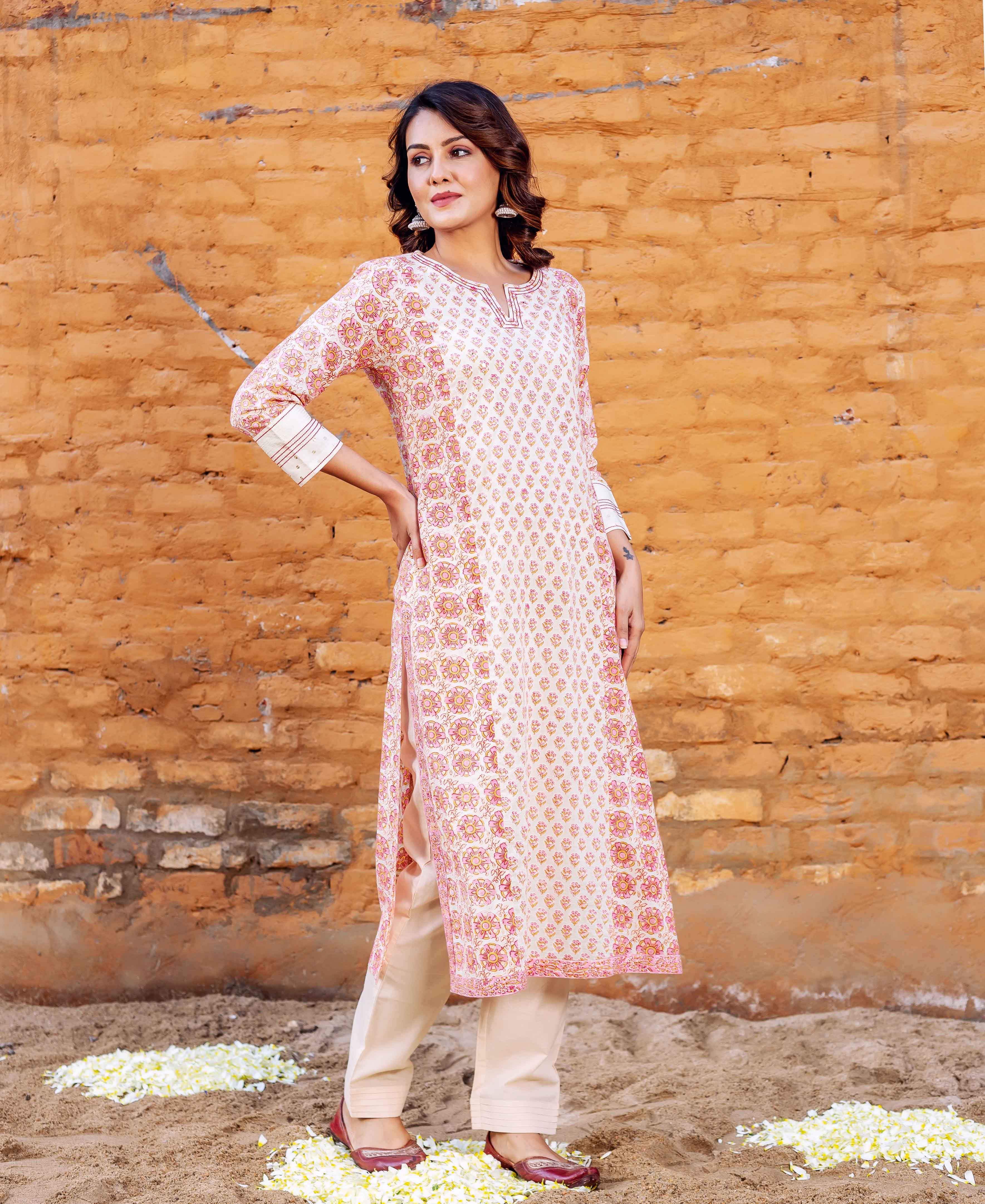 Off White Straight Embroidered Kurta with Pintuck and Lace Details
