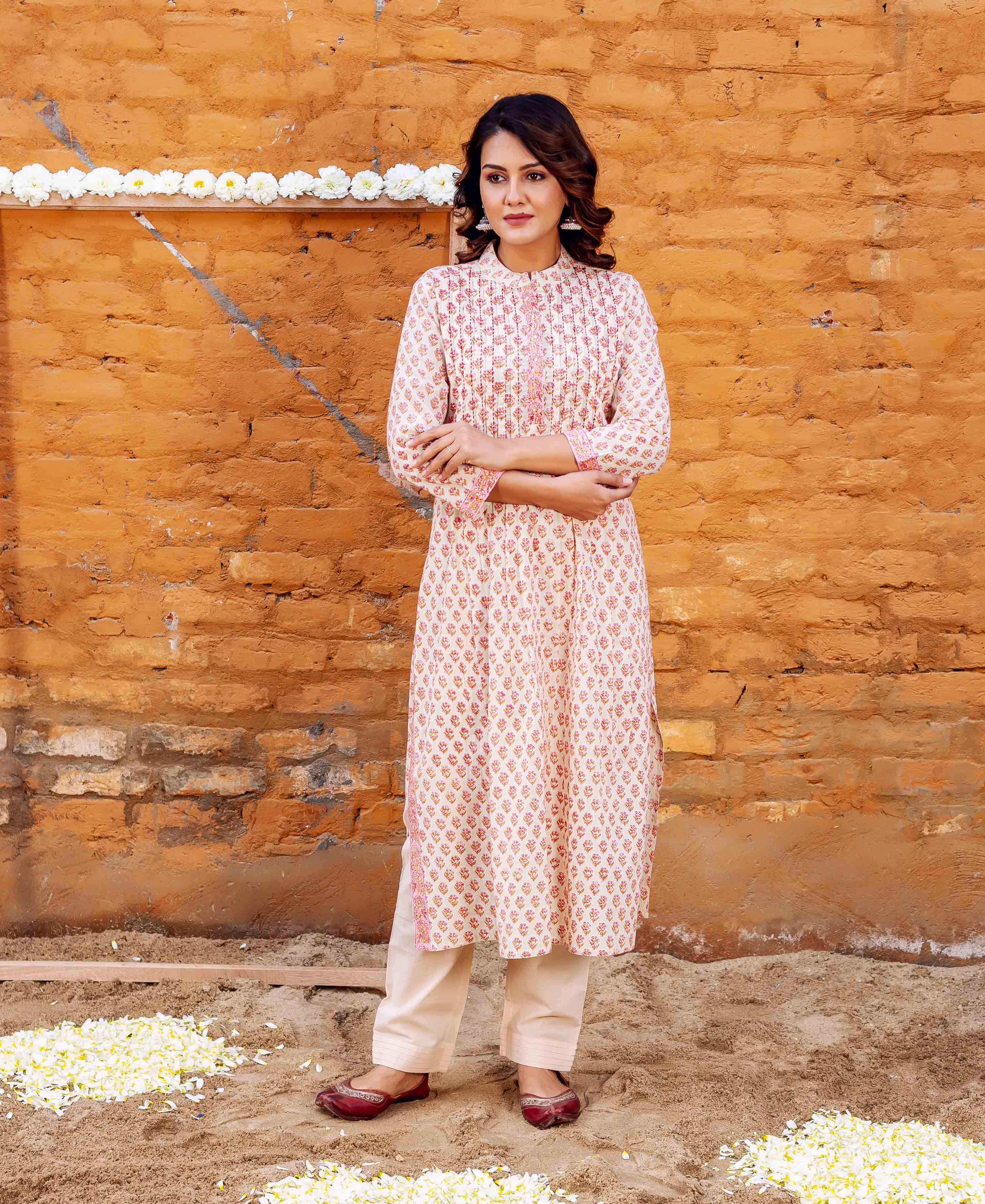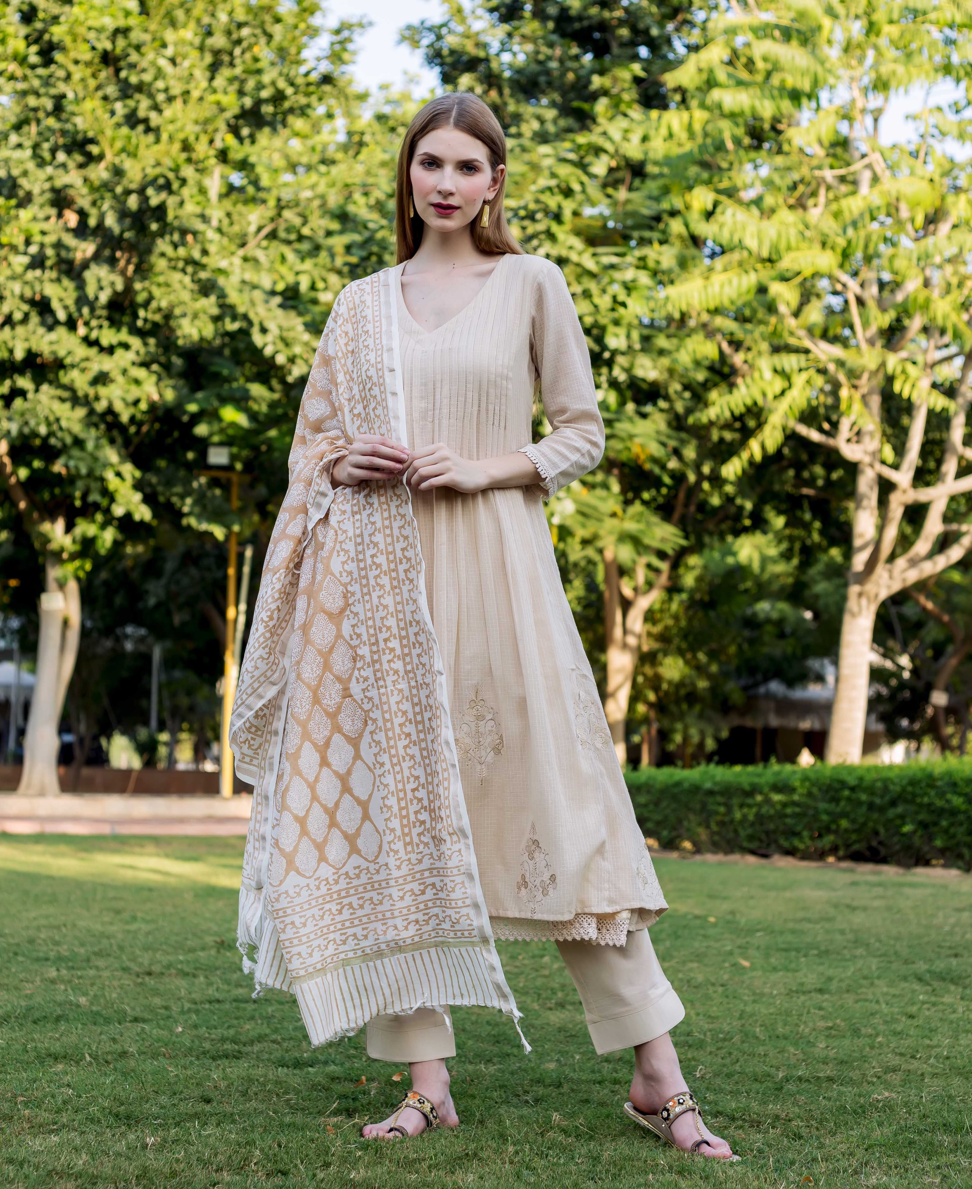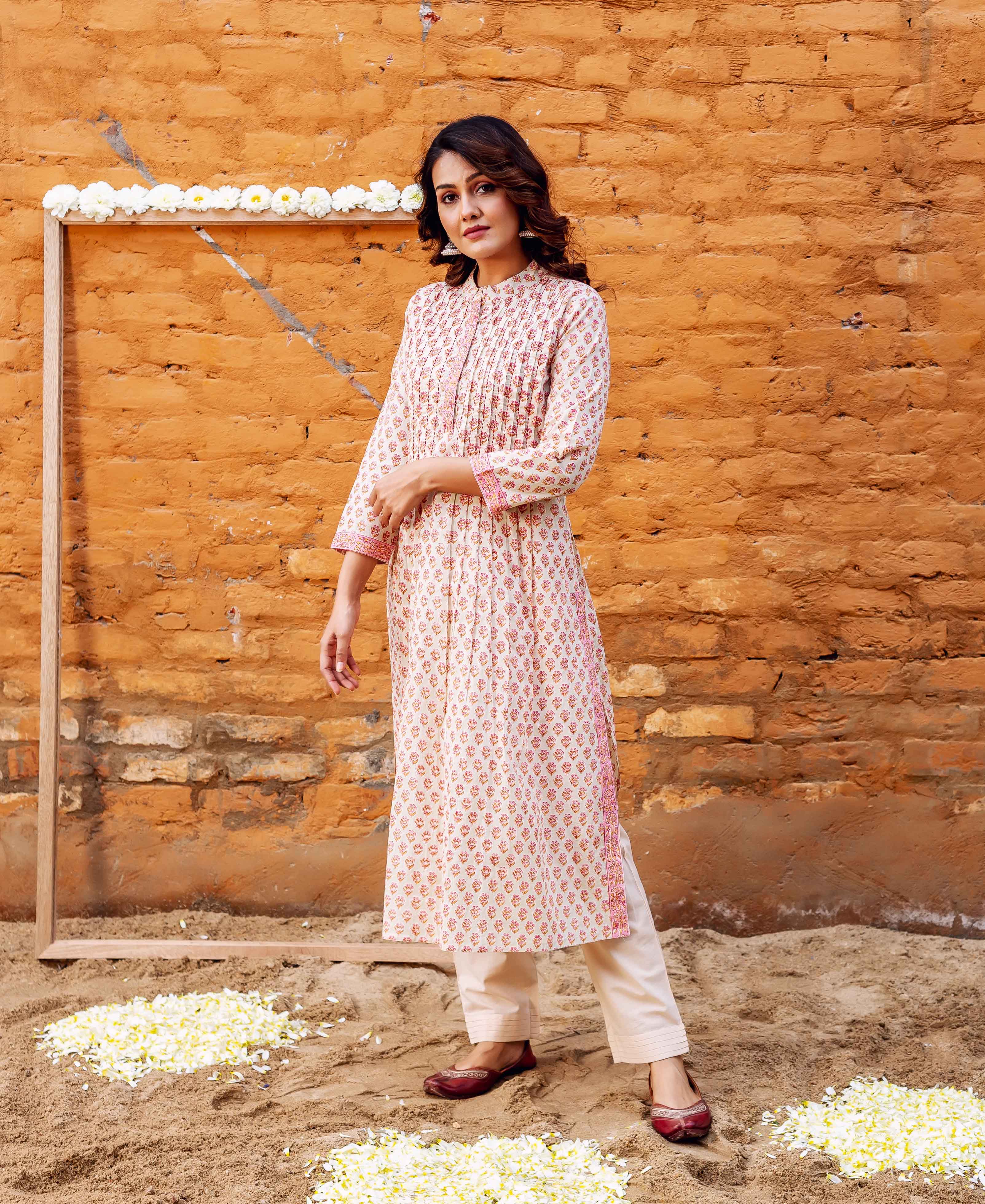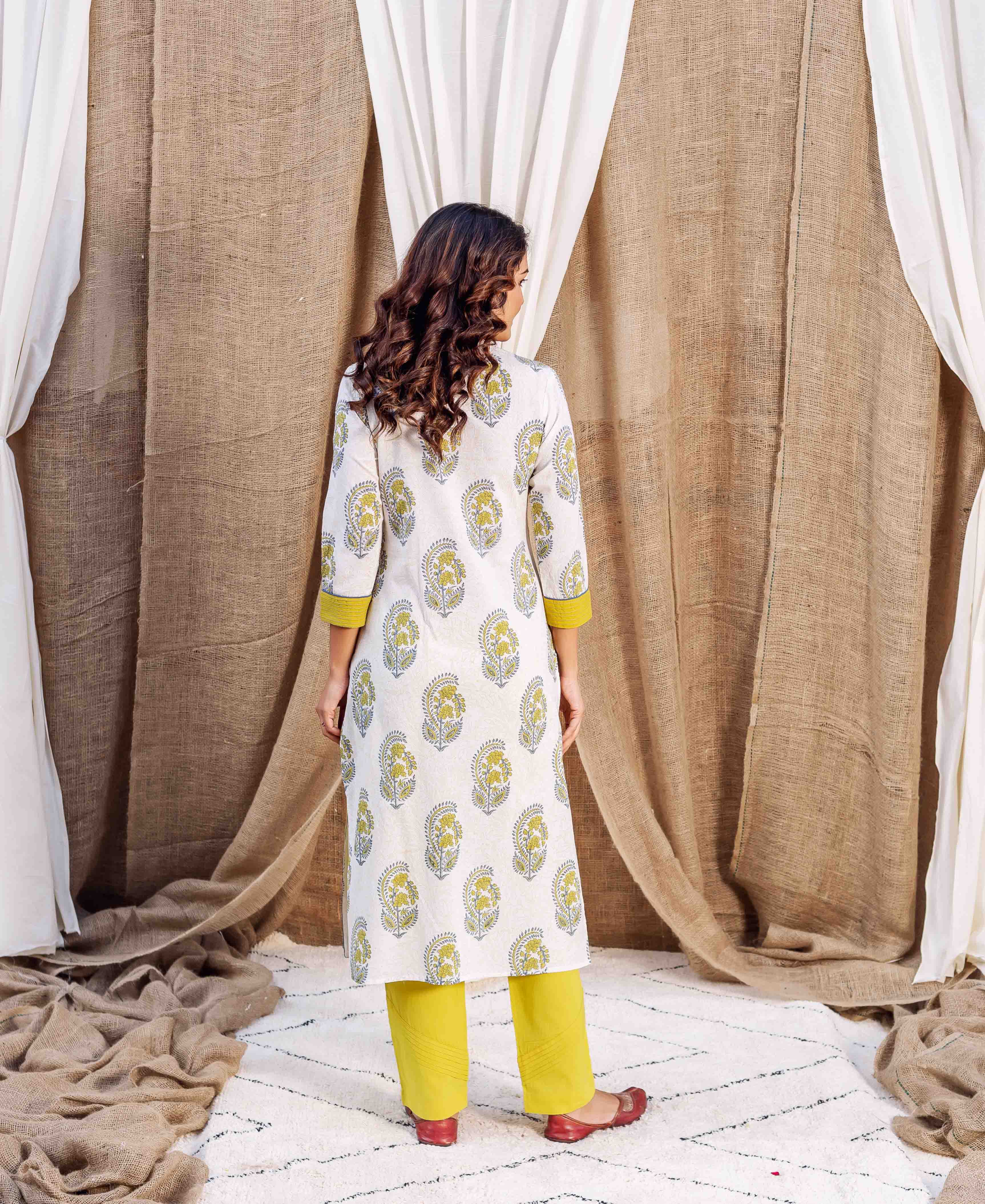 Off White Straight Embroidered Kurta with Pintuck and Lace Details