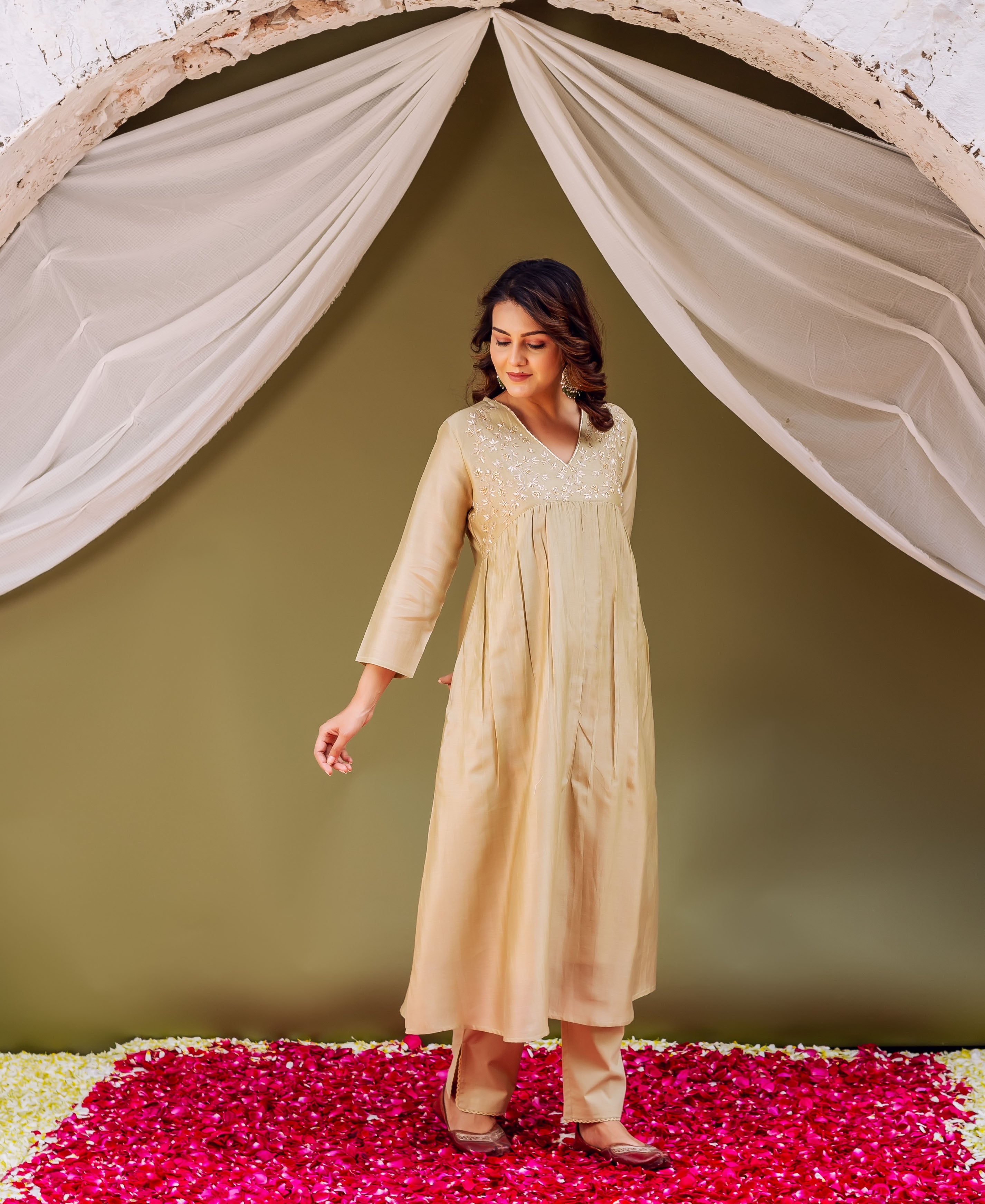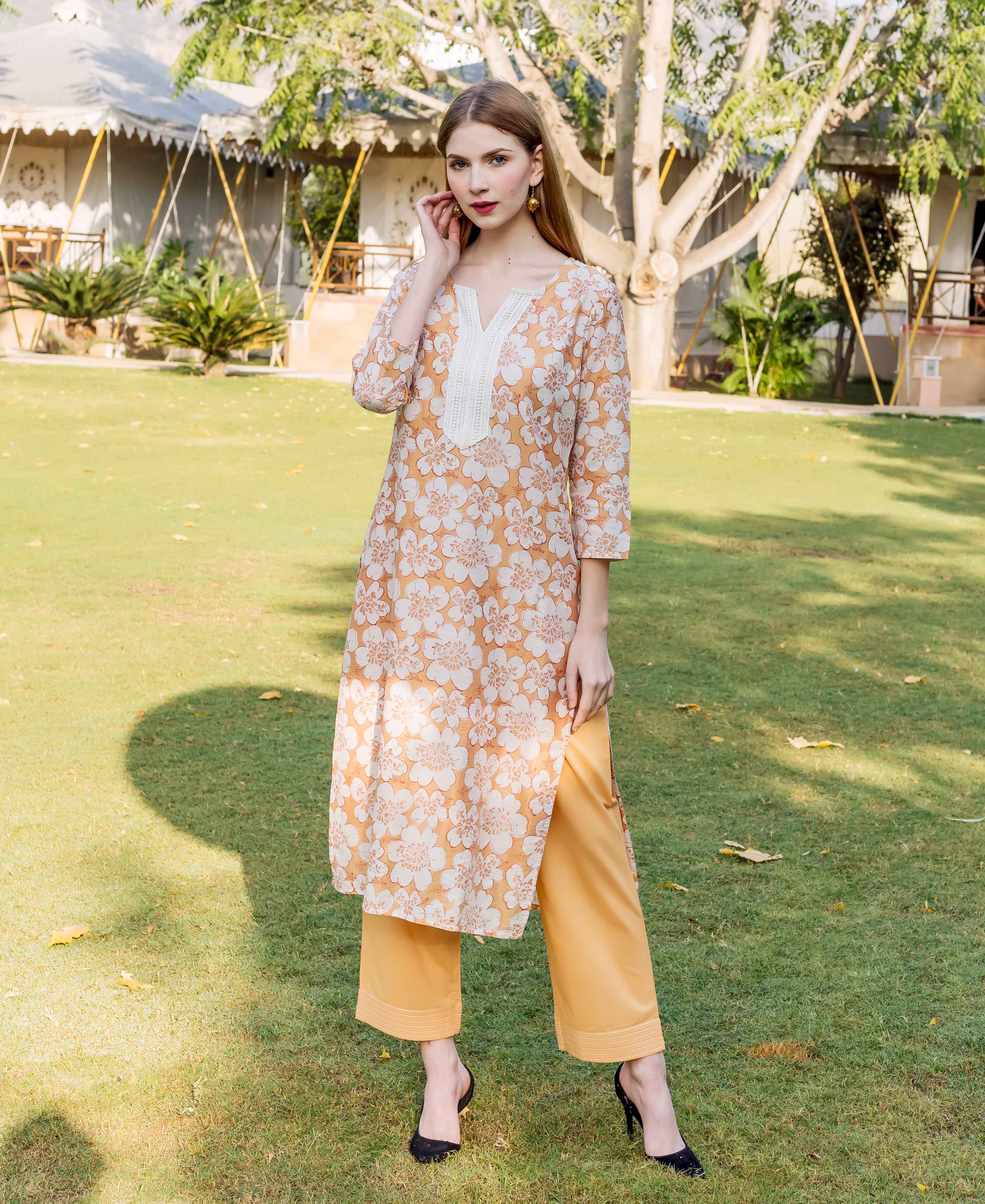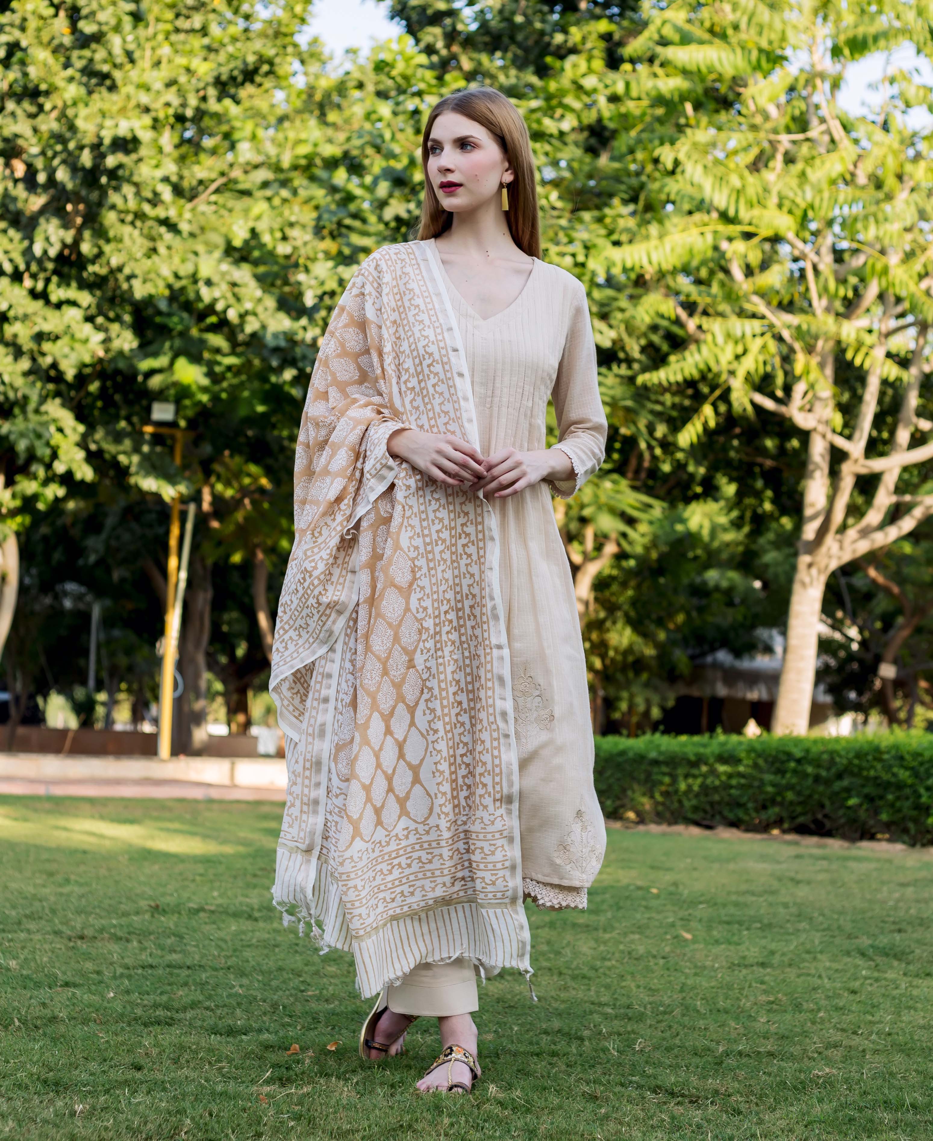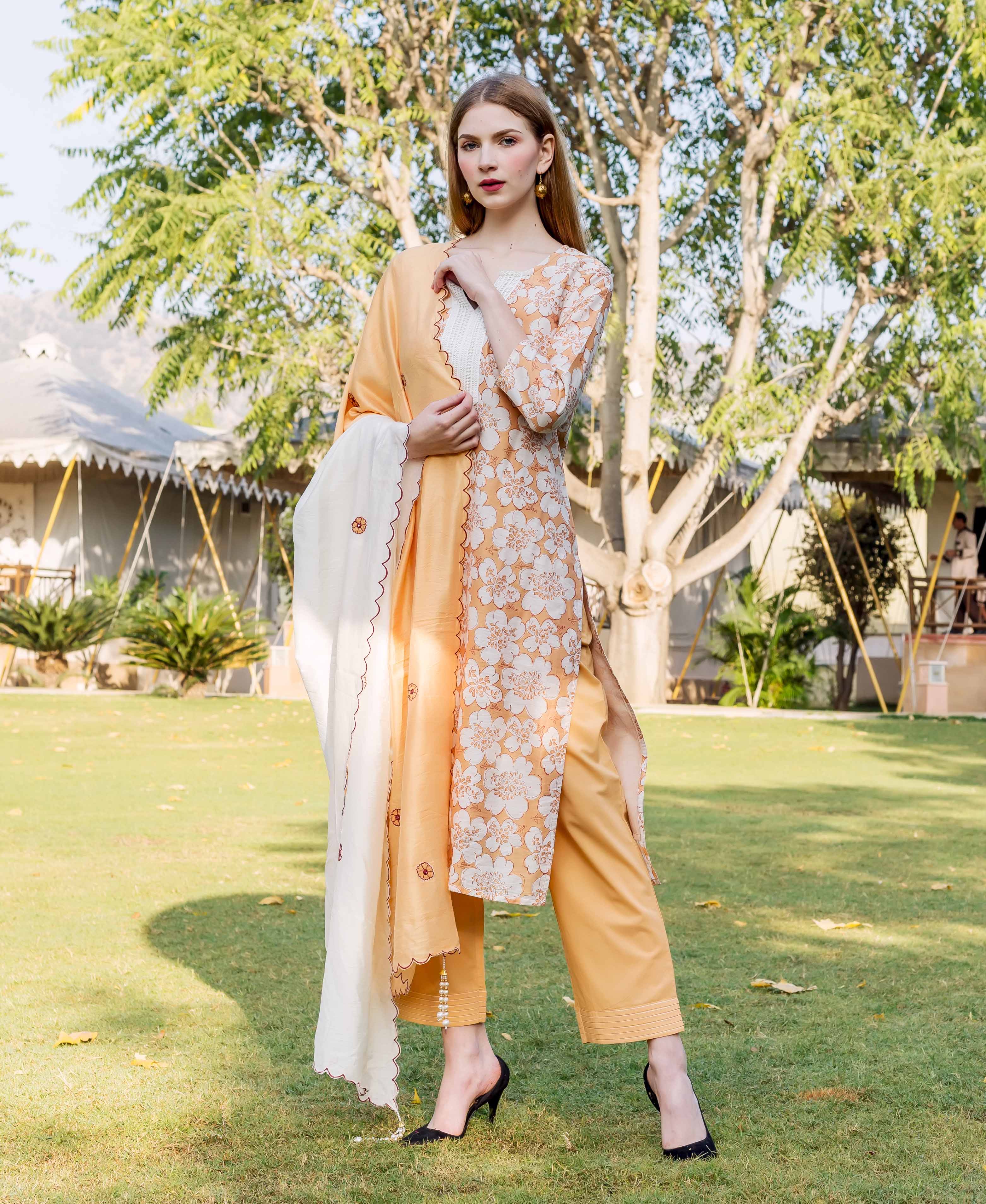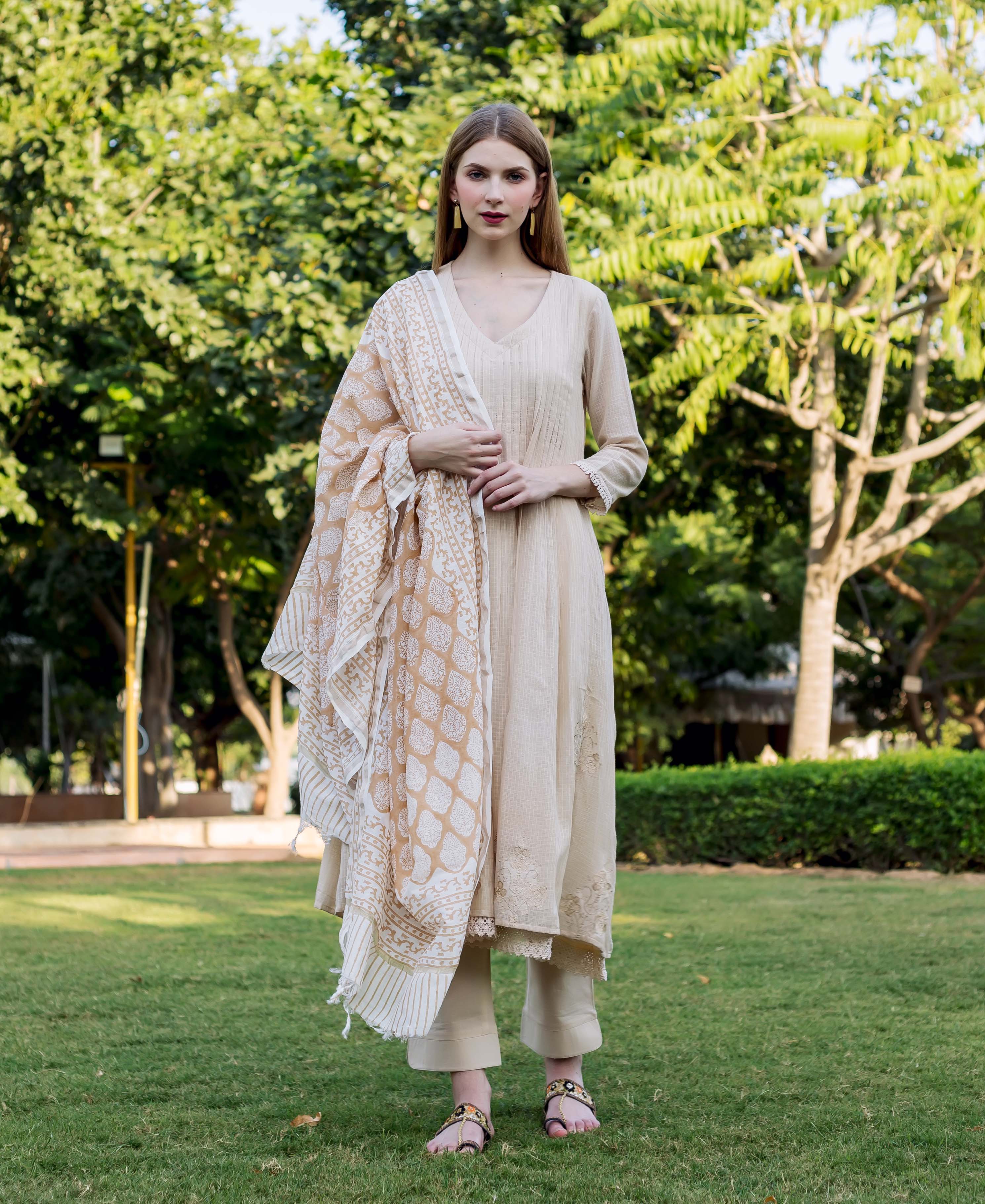 Off White Straight Embroidered Kurta with Pintuck and Lace Details