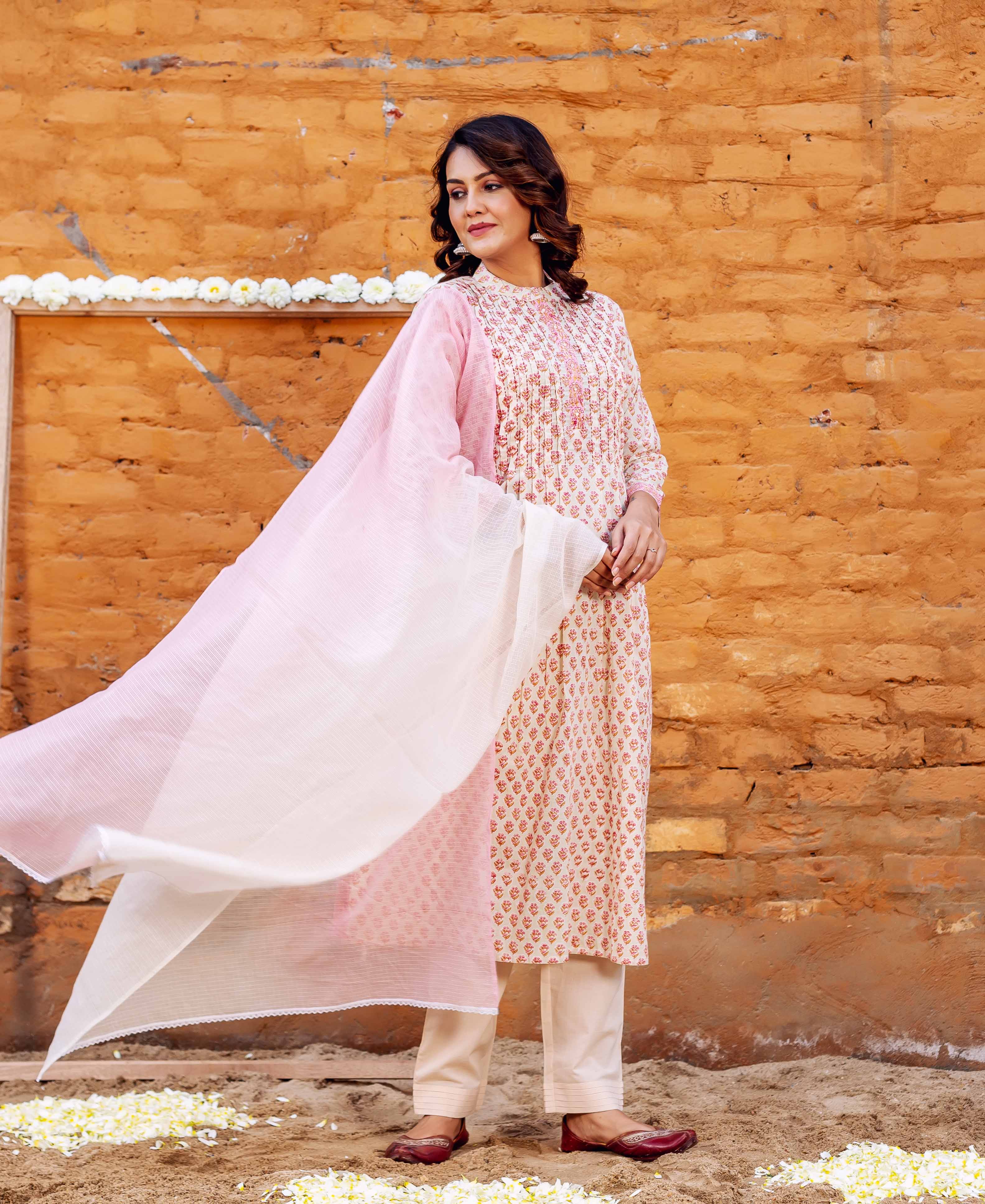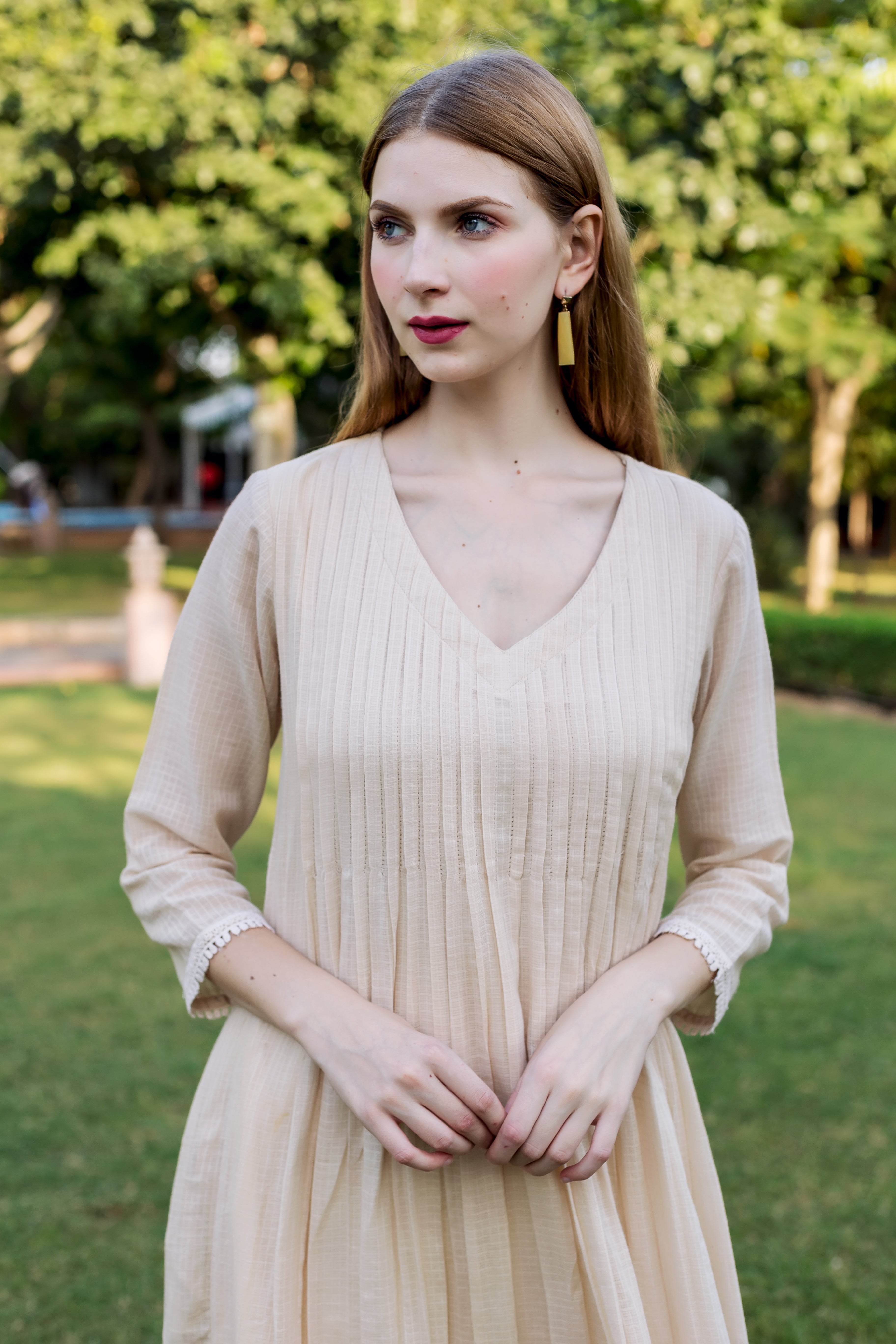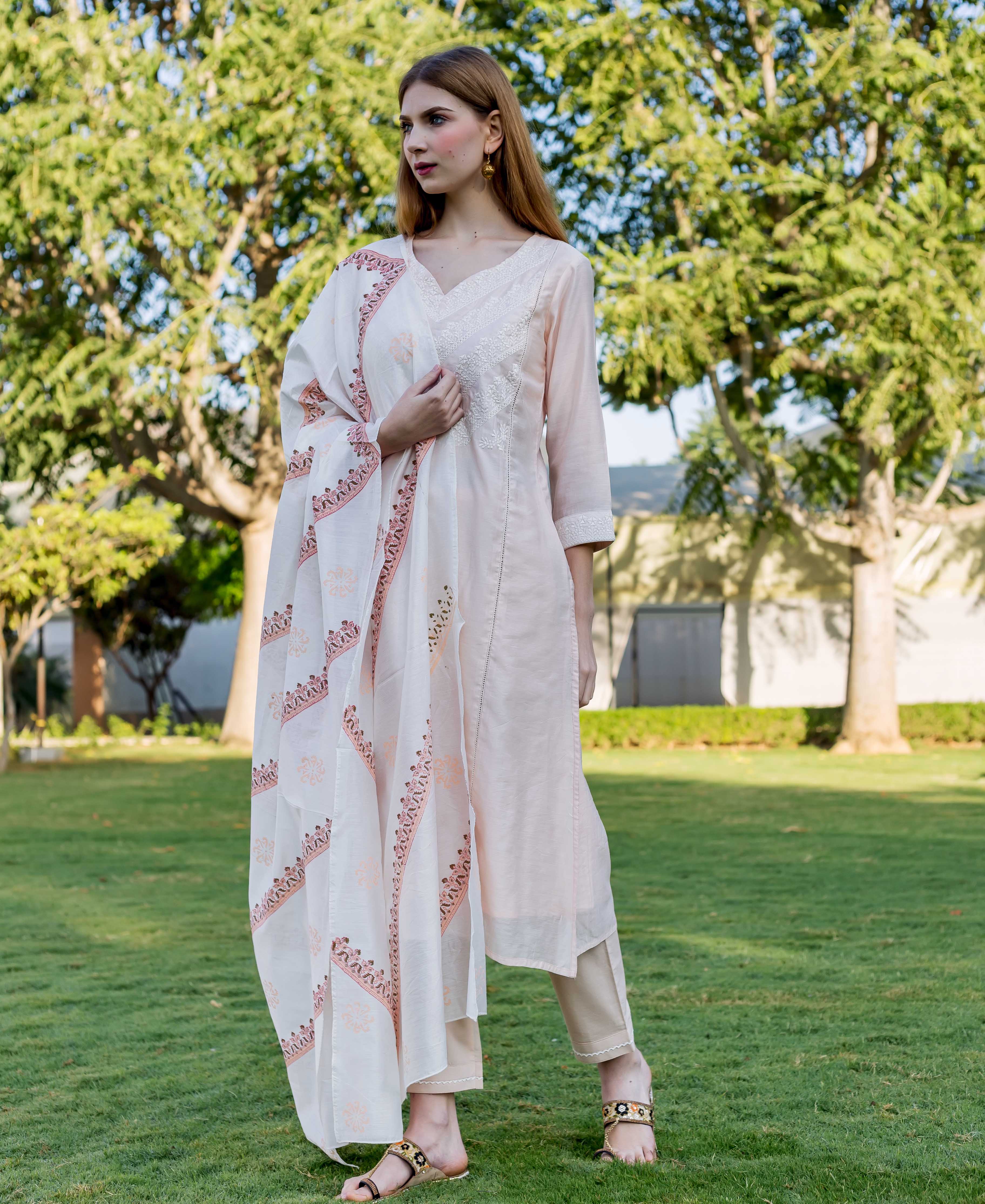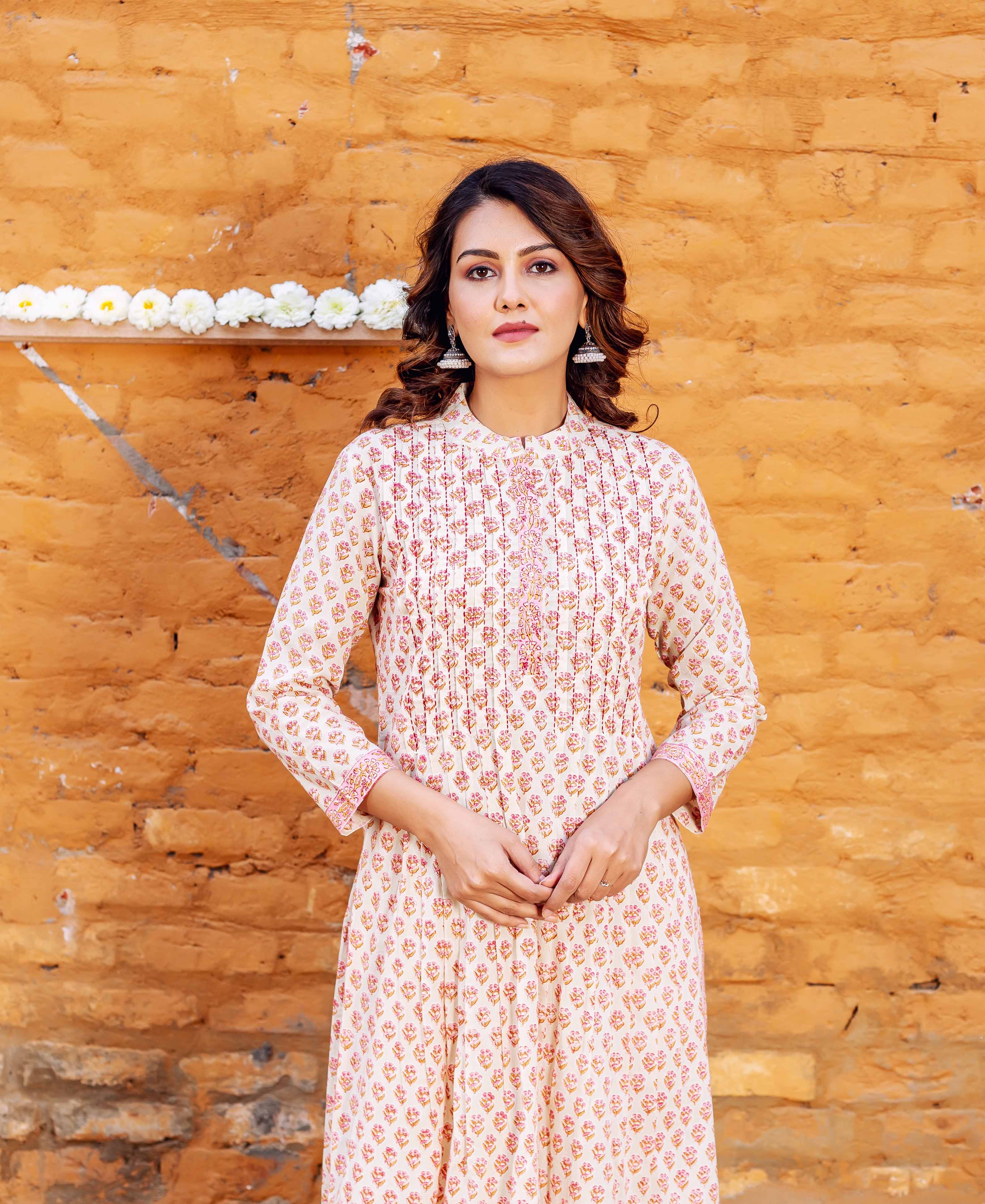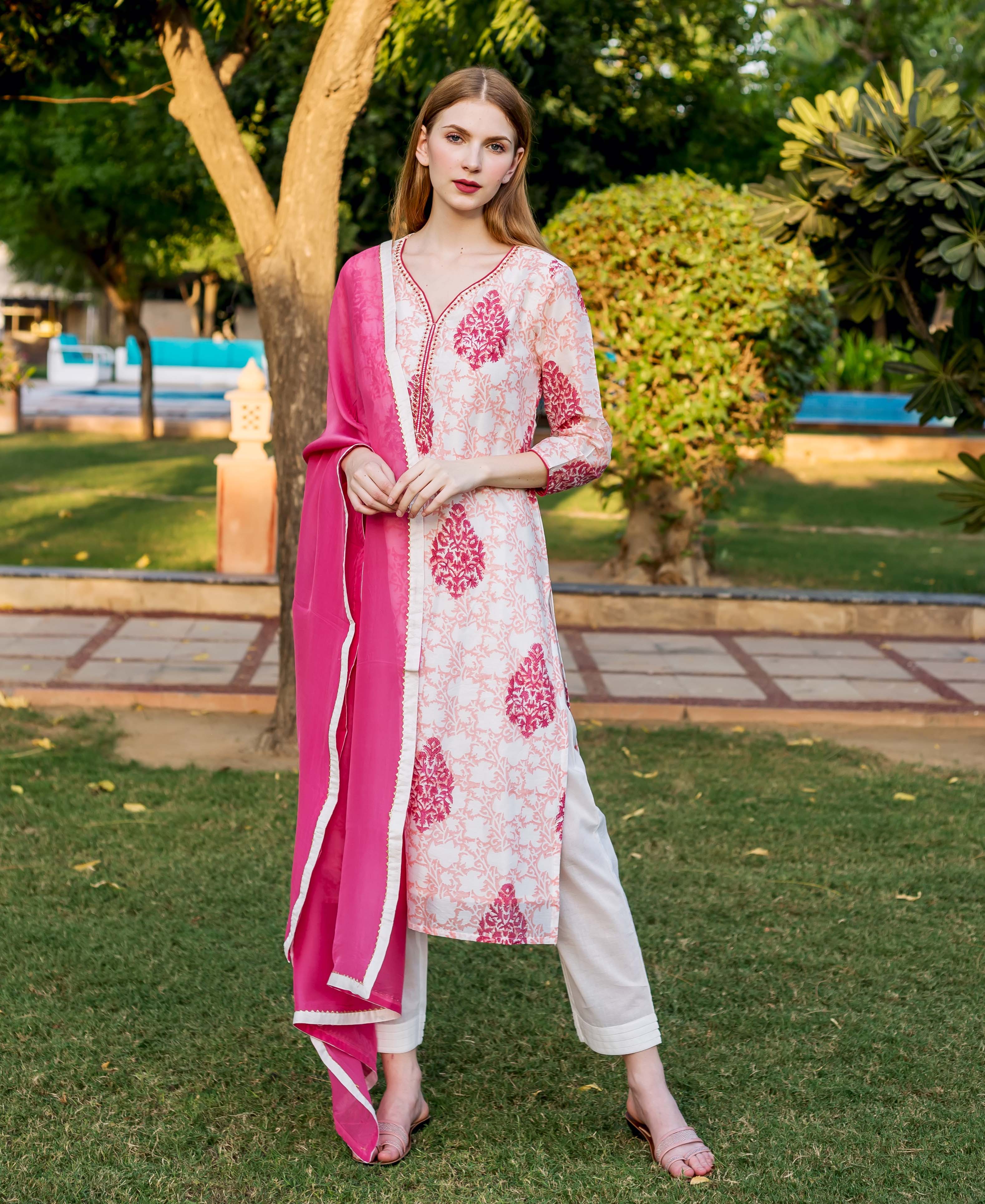 Off White Straight Embroidered Kurta with Pintuck and Lace Details