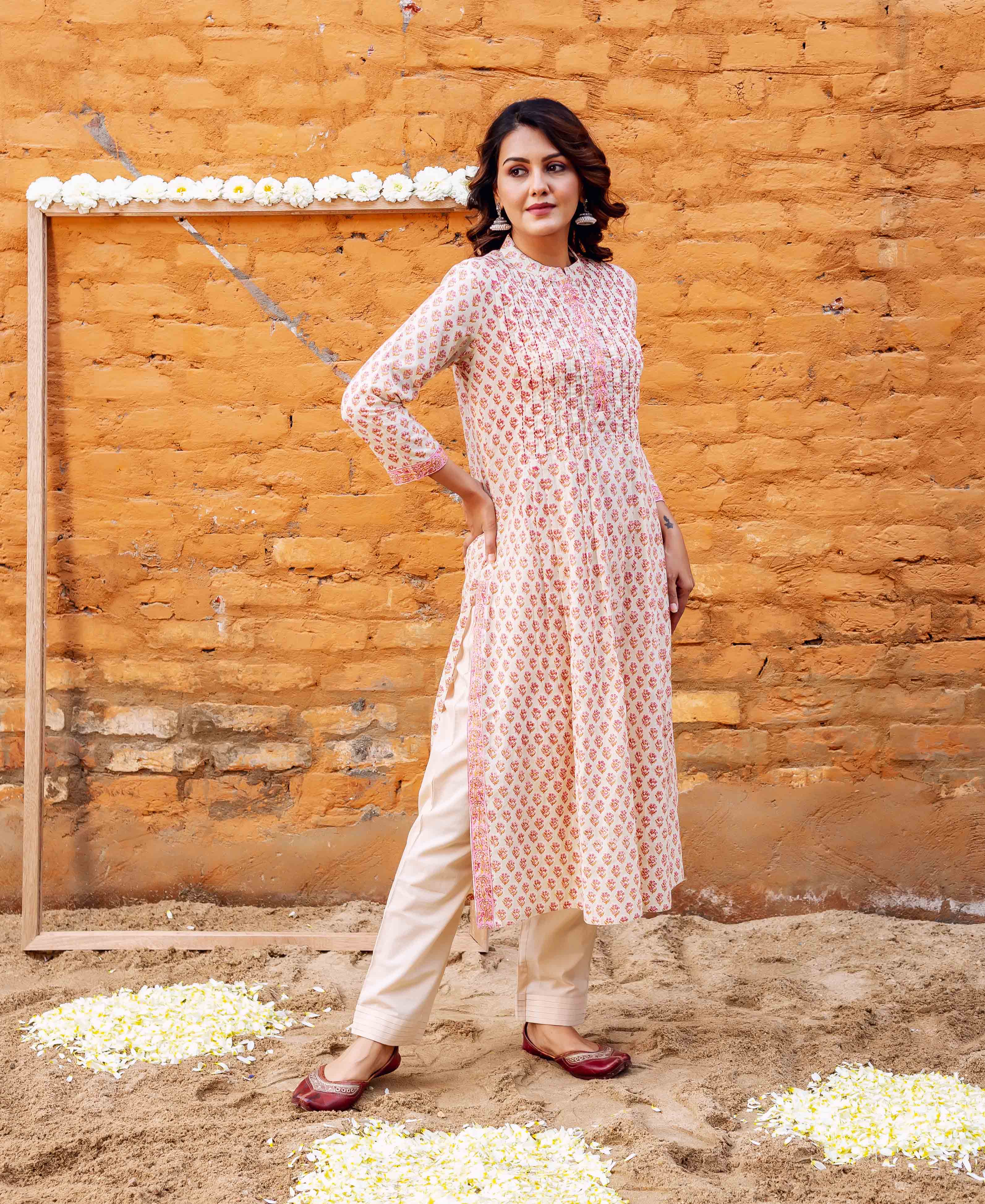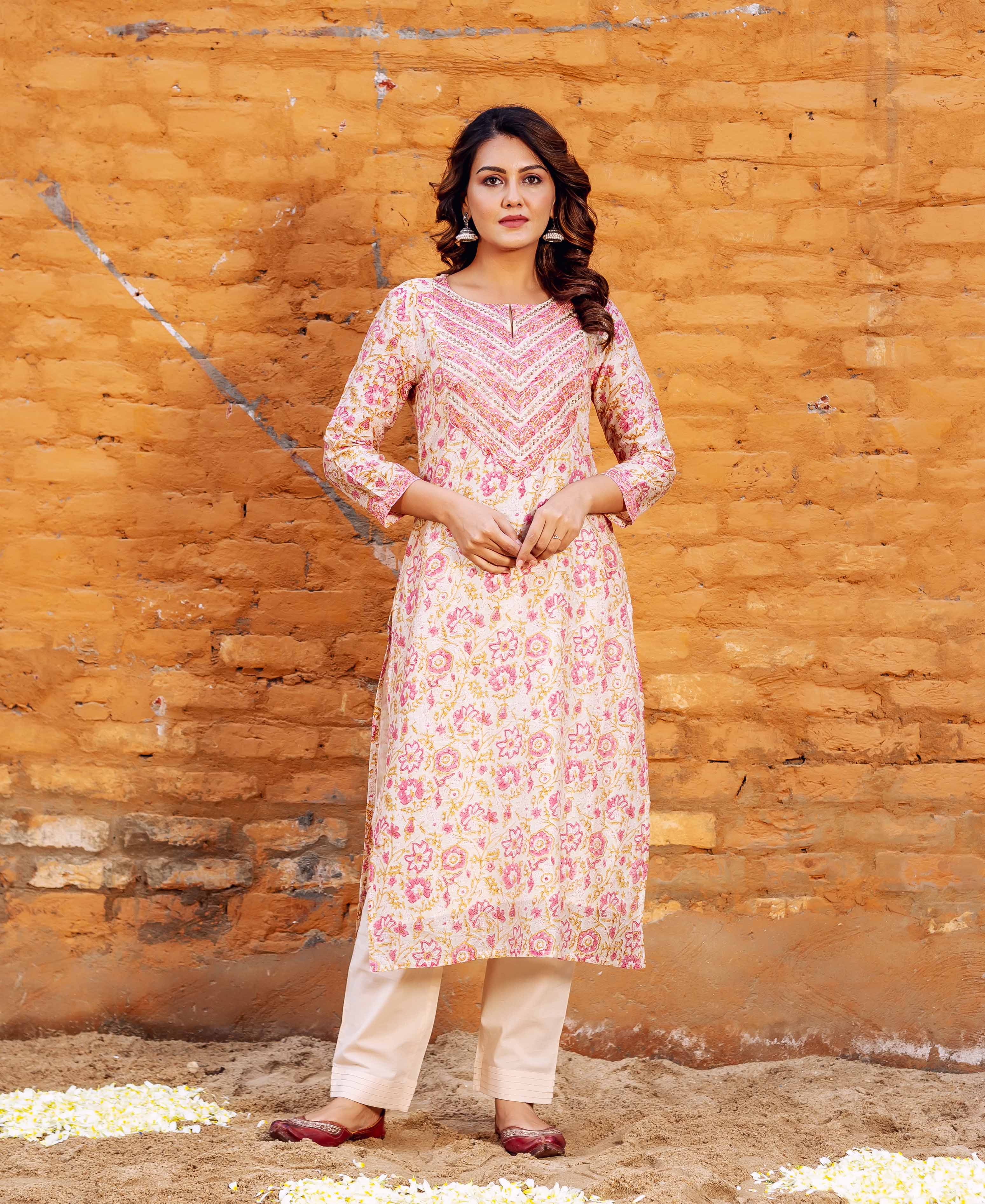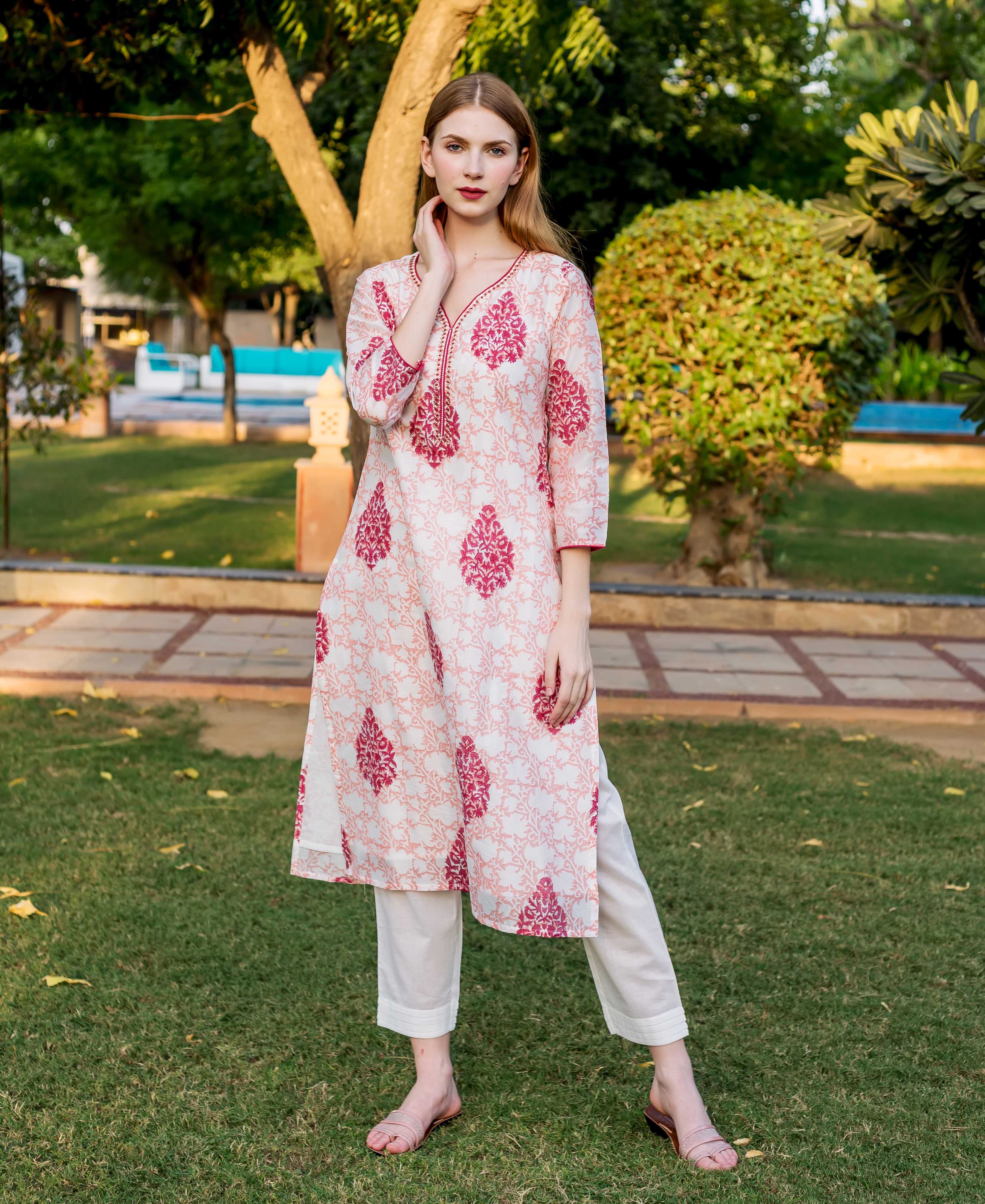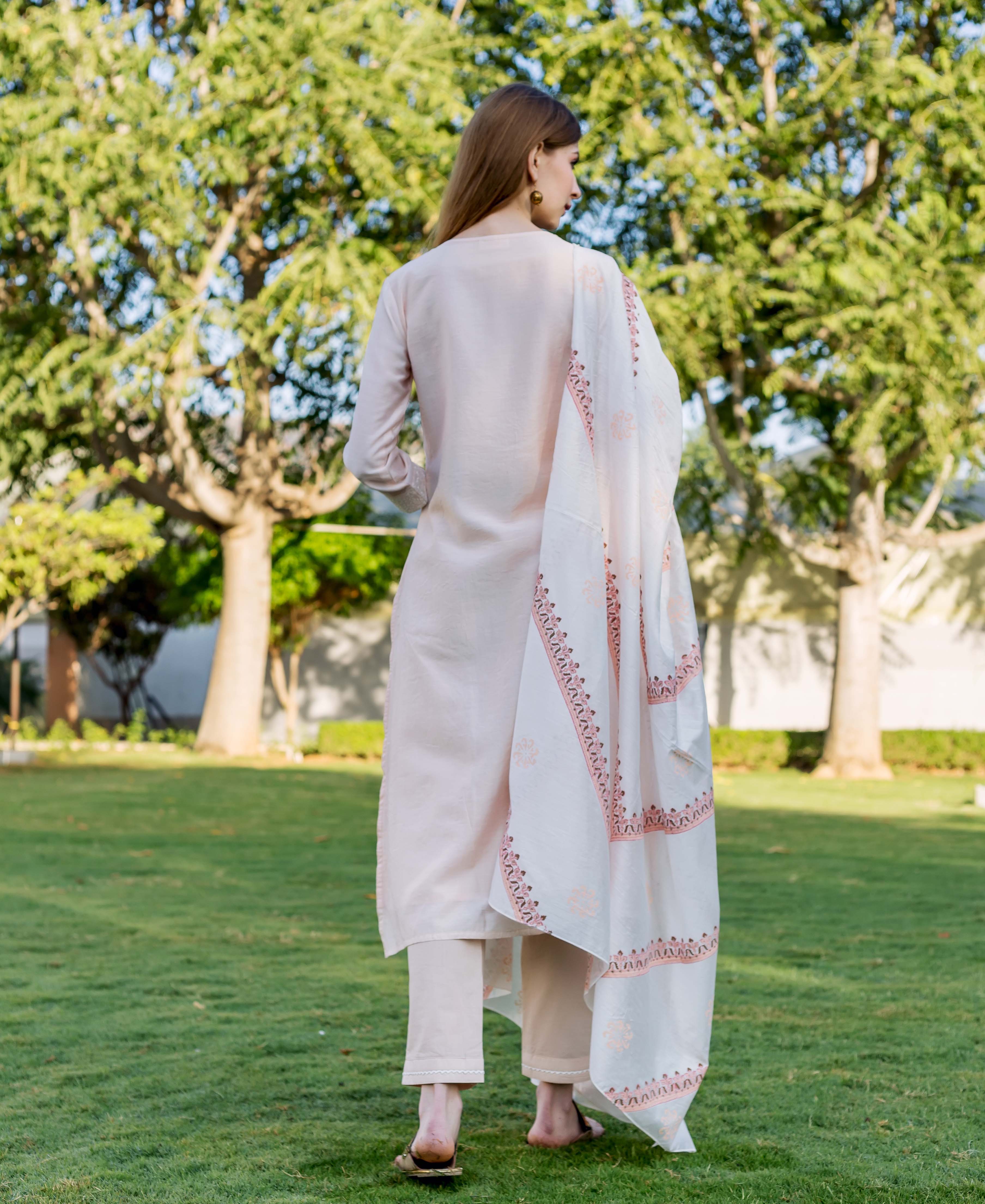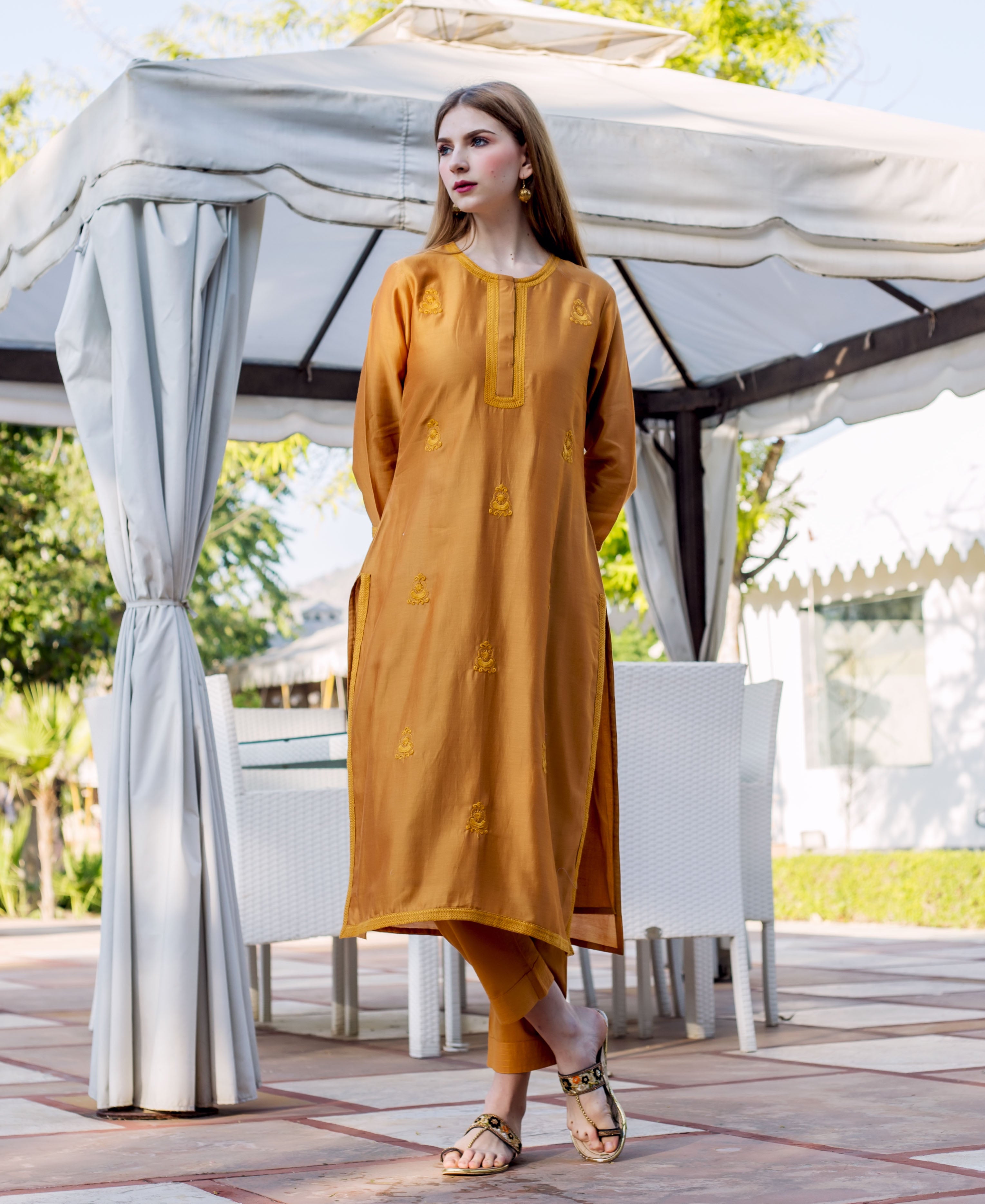 Off White Straight Embroidered Kurta with Pintuck and Lace Details