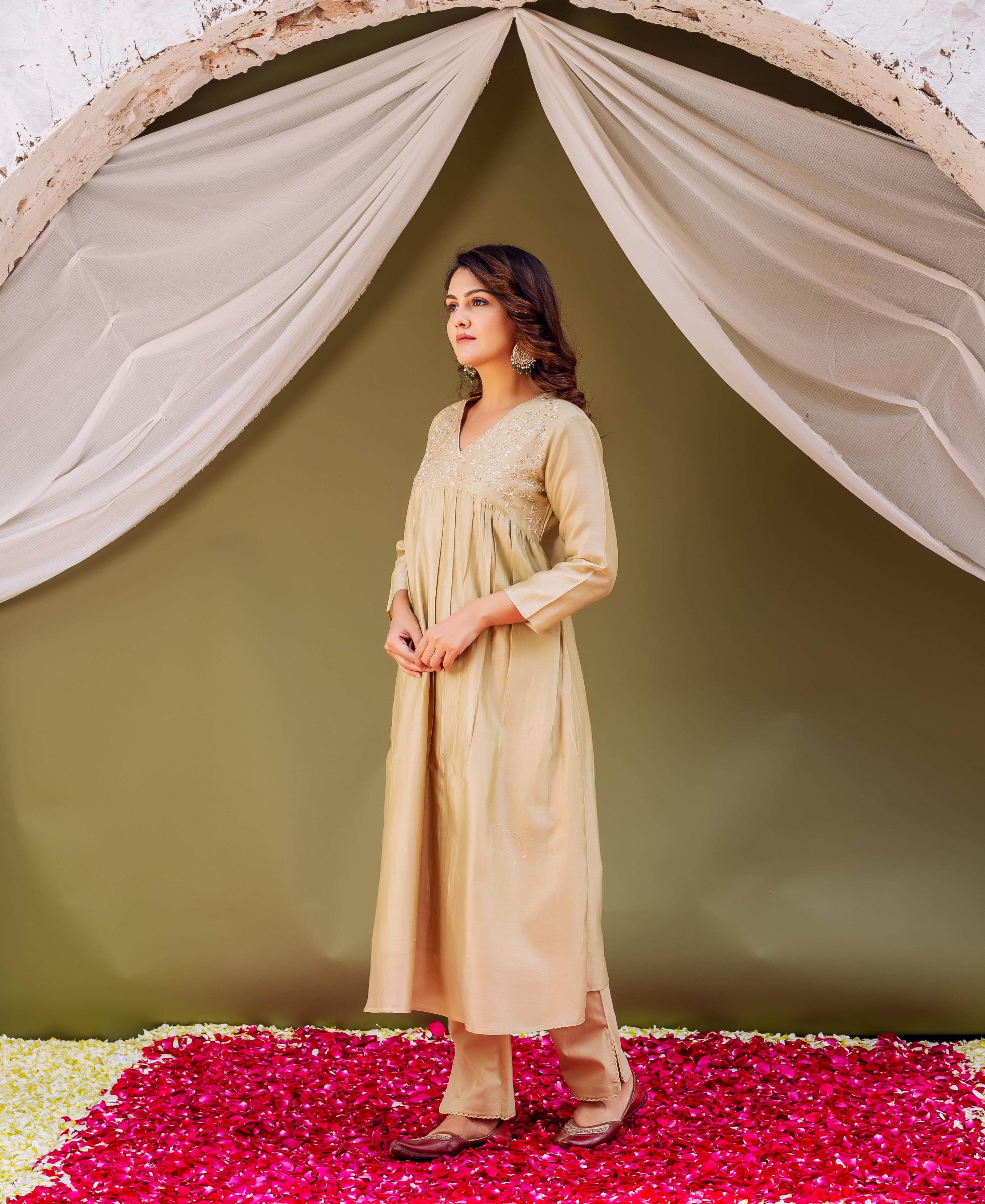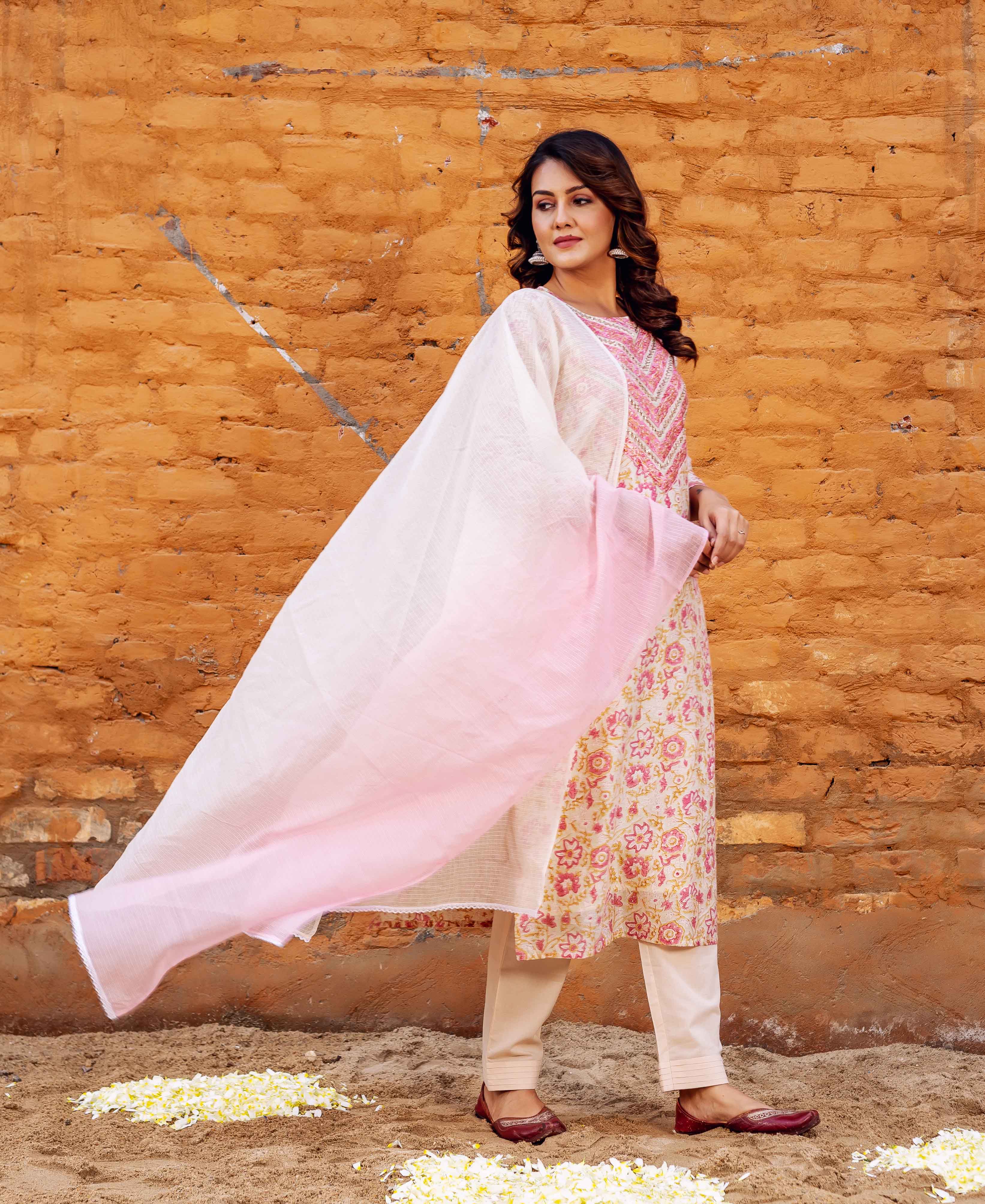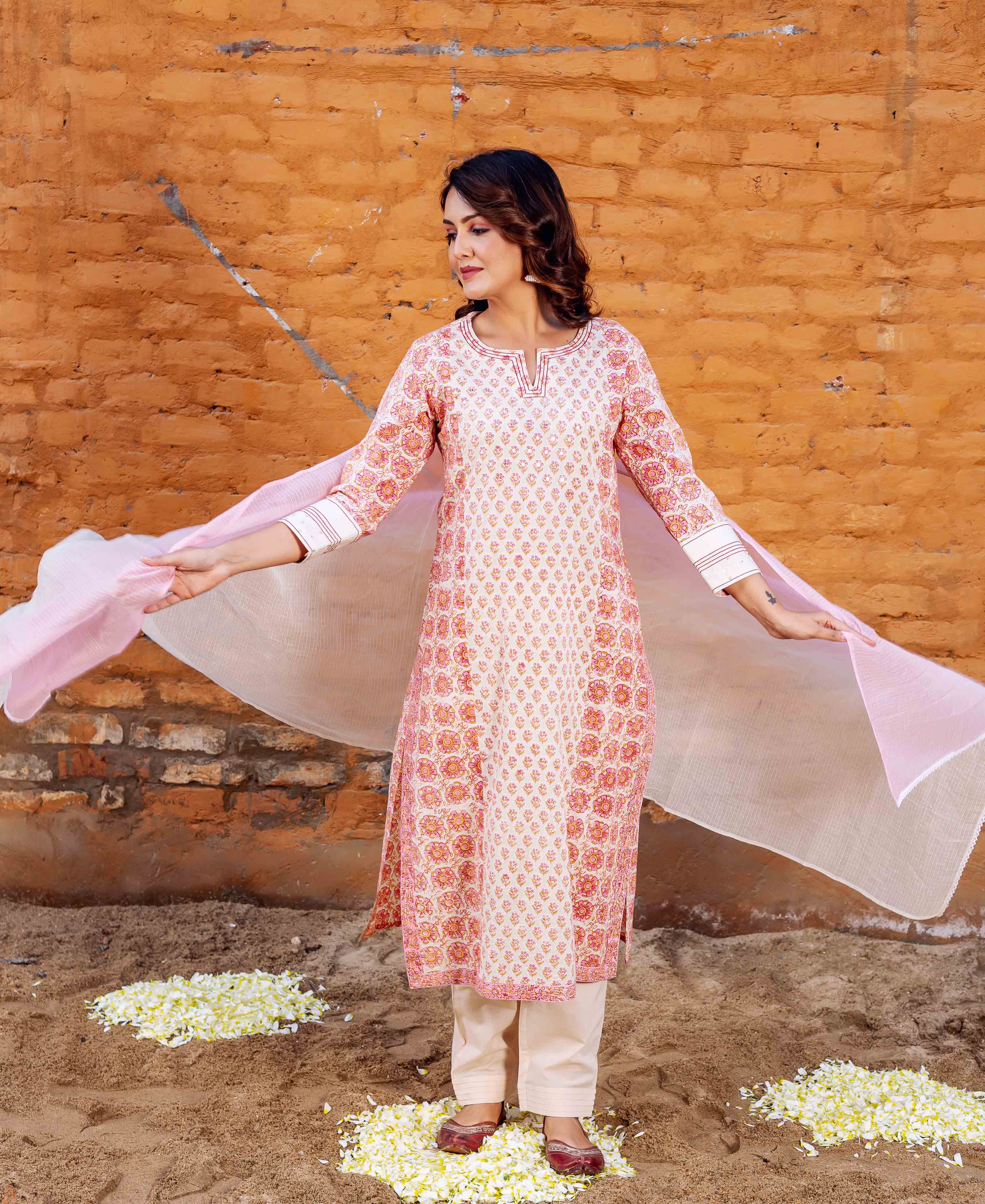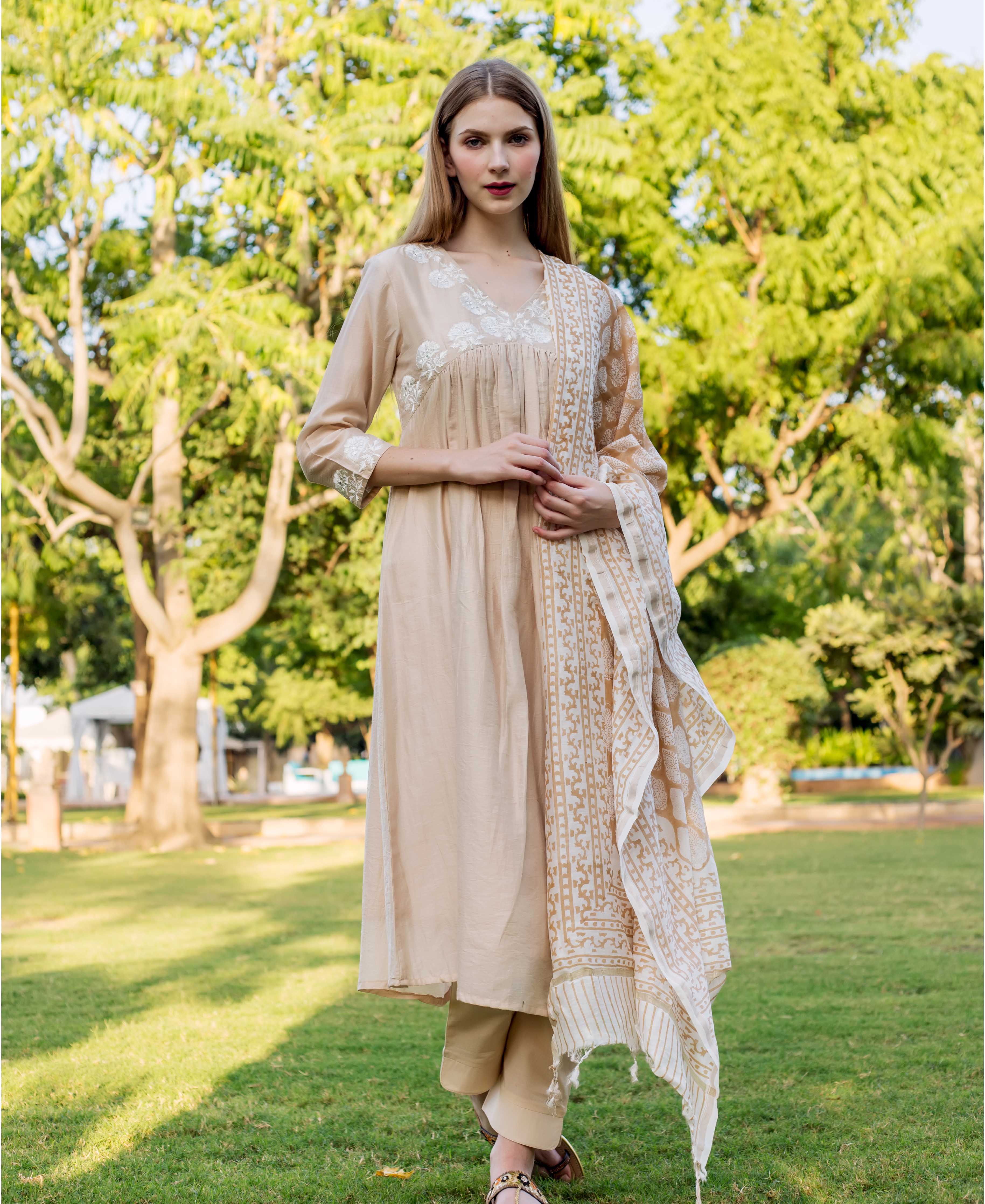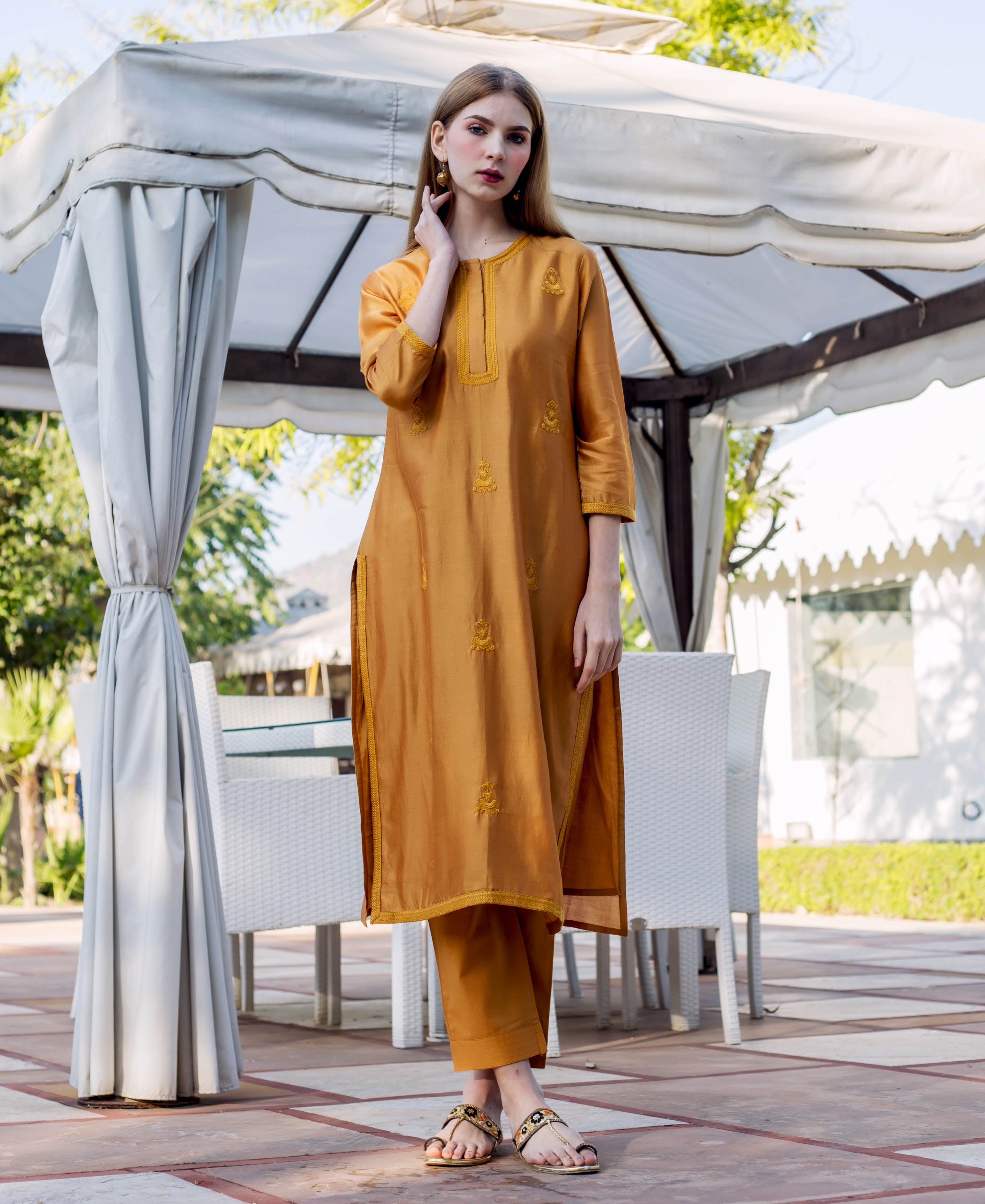Off White Straight Embroidered Kurta with Pintuck and Lace Details