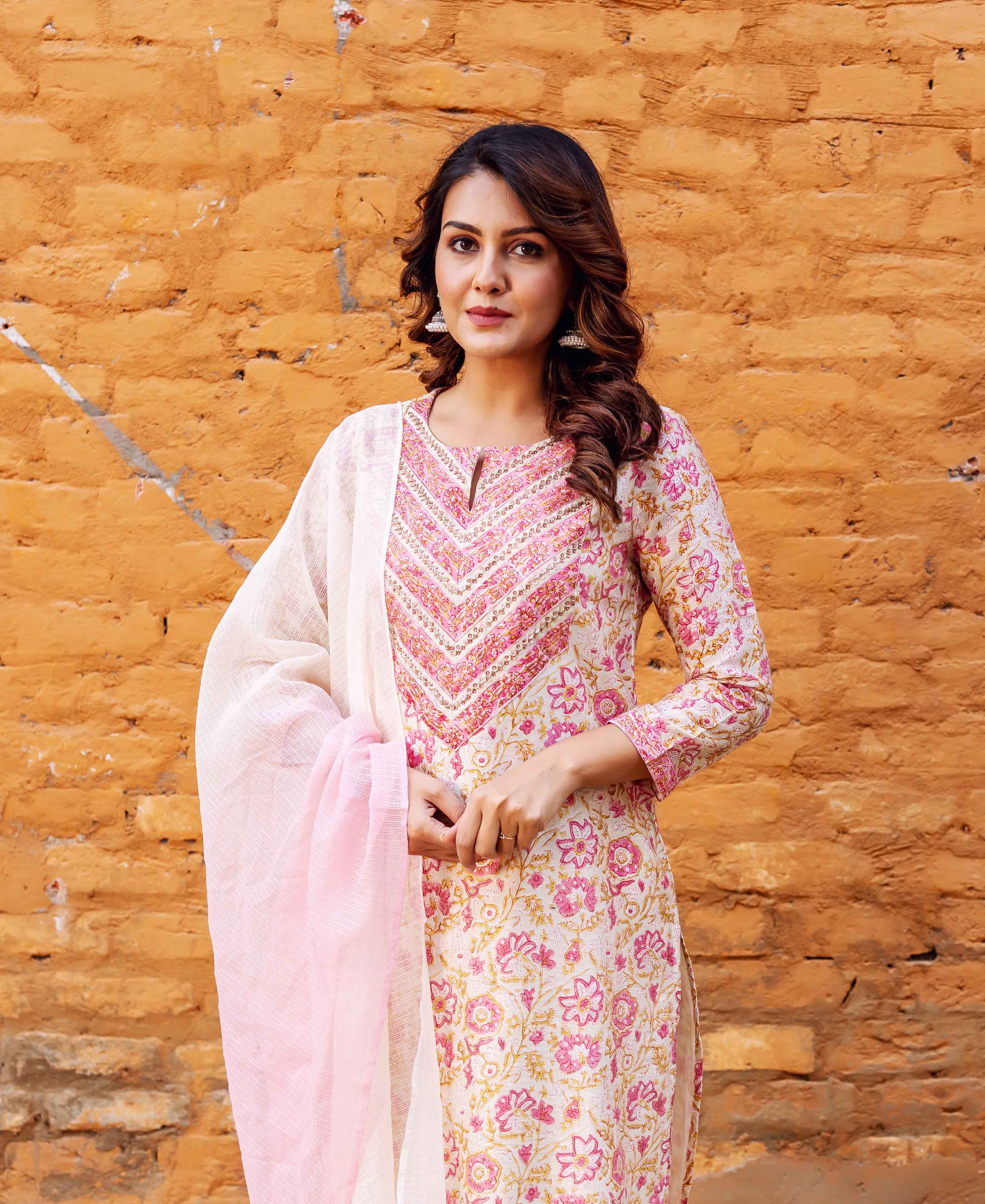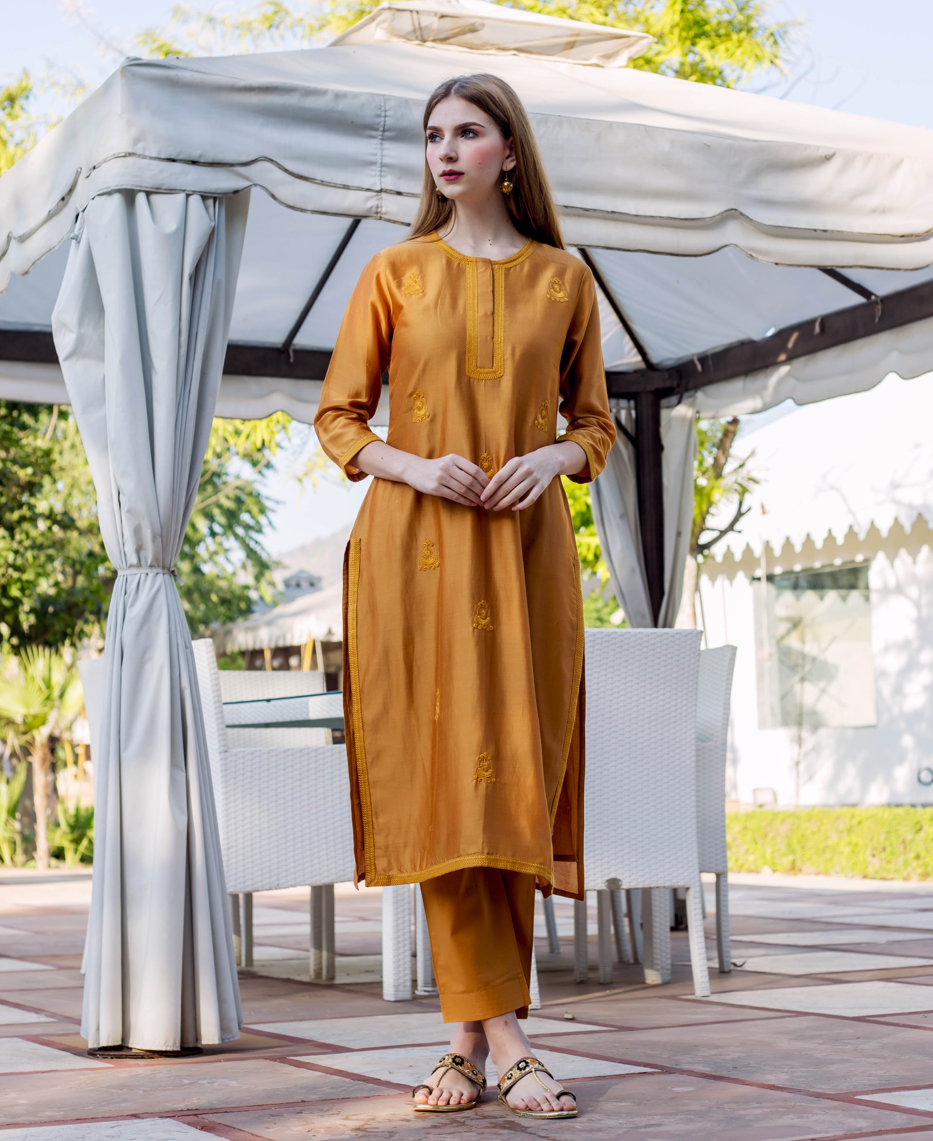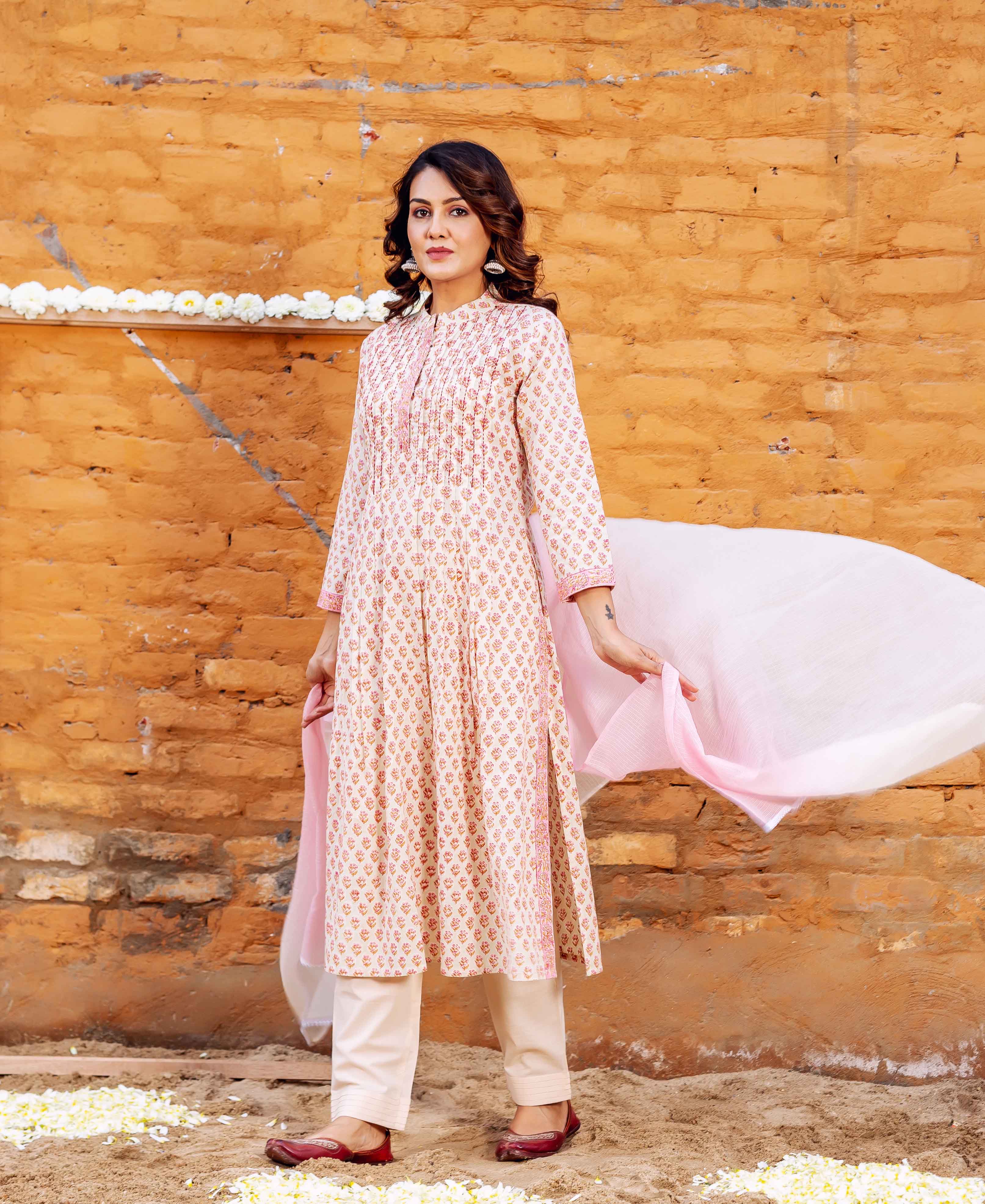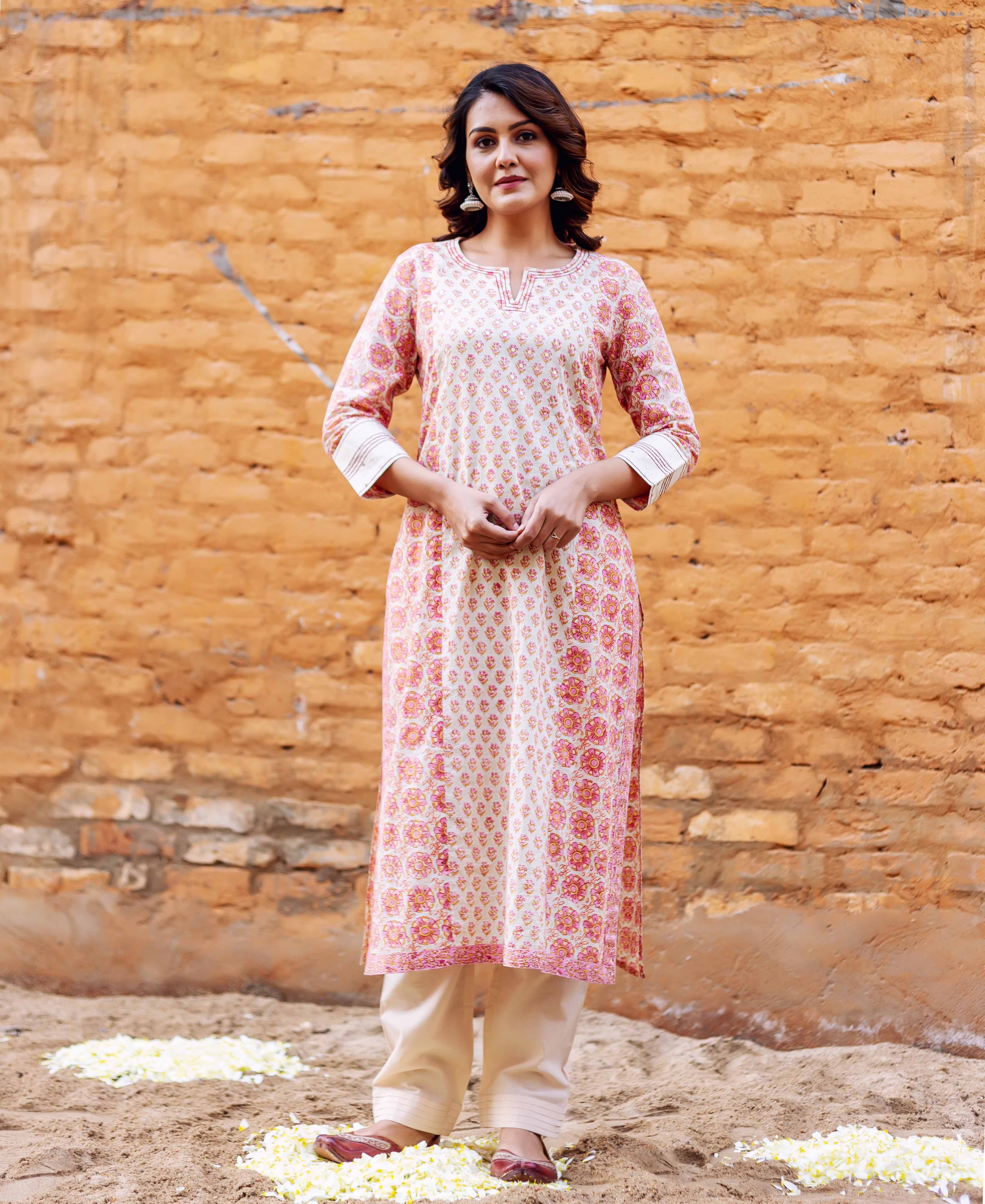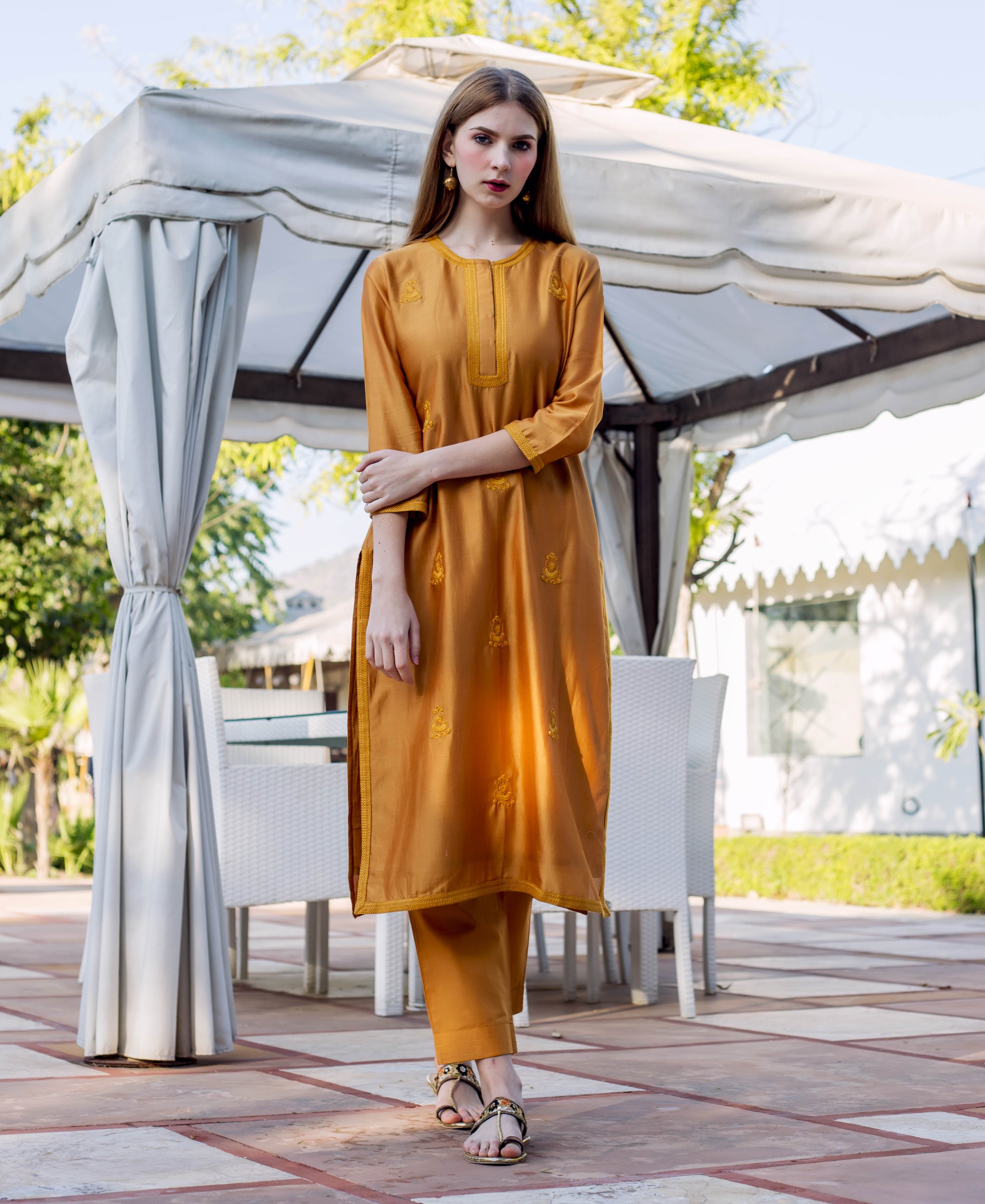 Off White Straight Embroidered Kurta with Pintuck and Lace Details