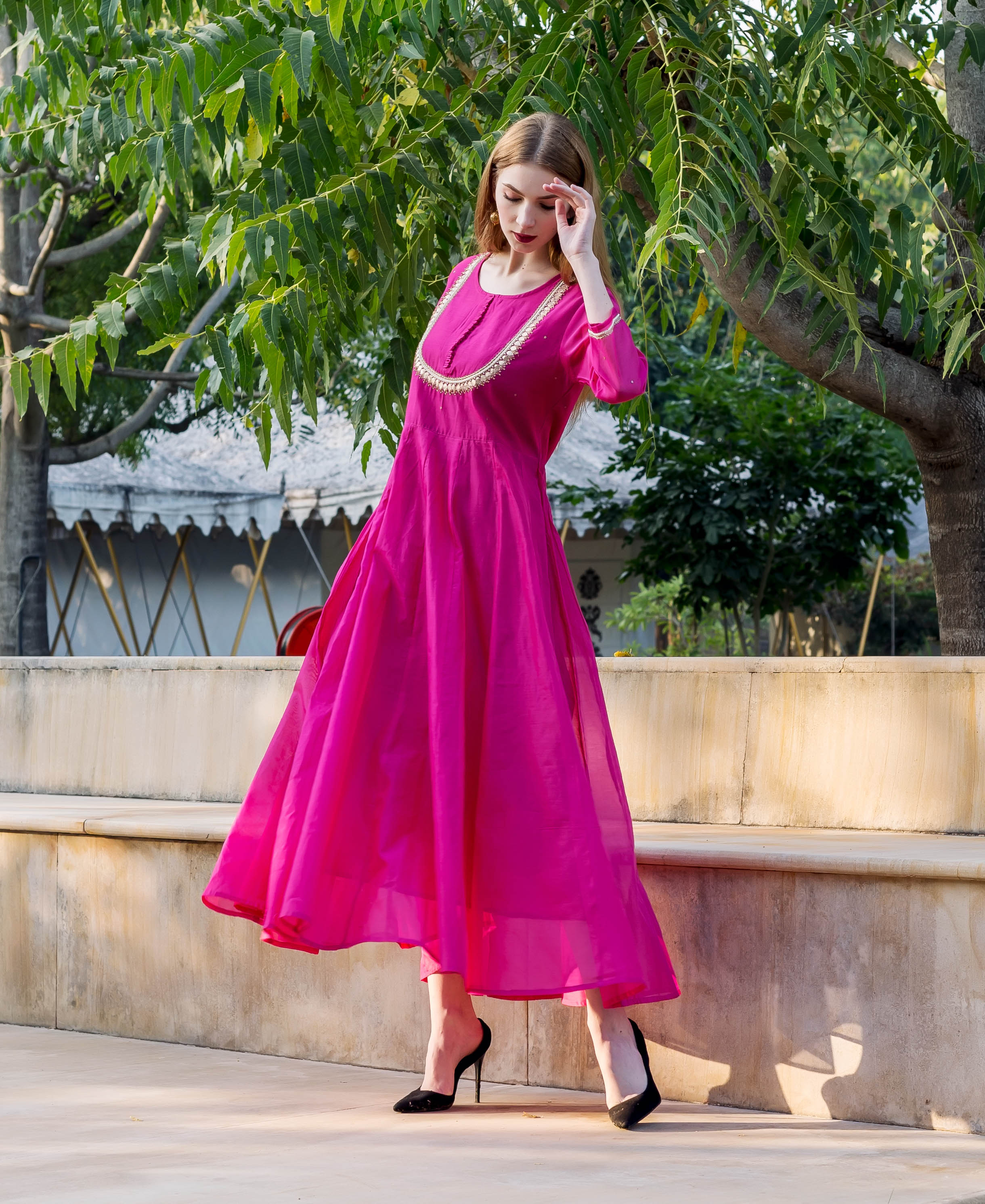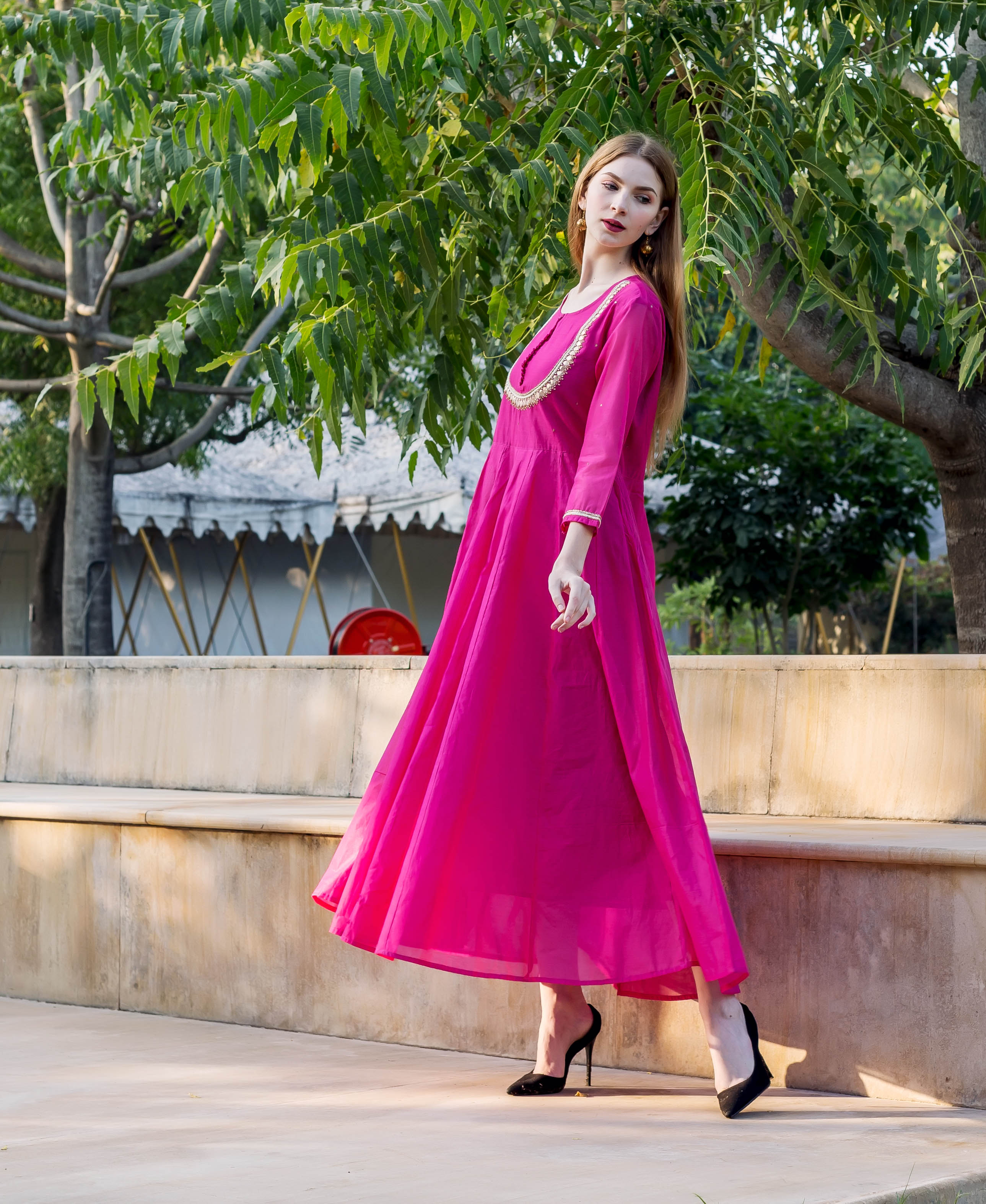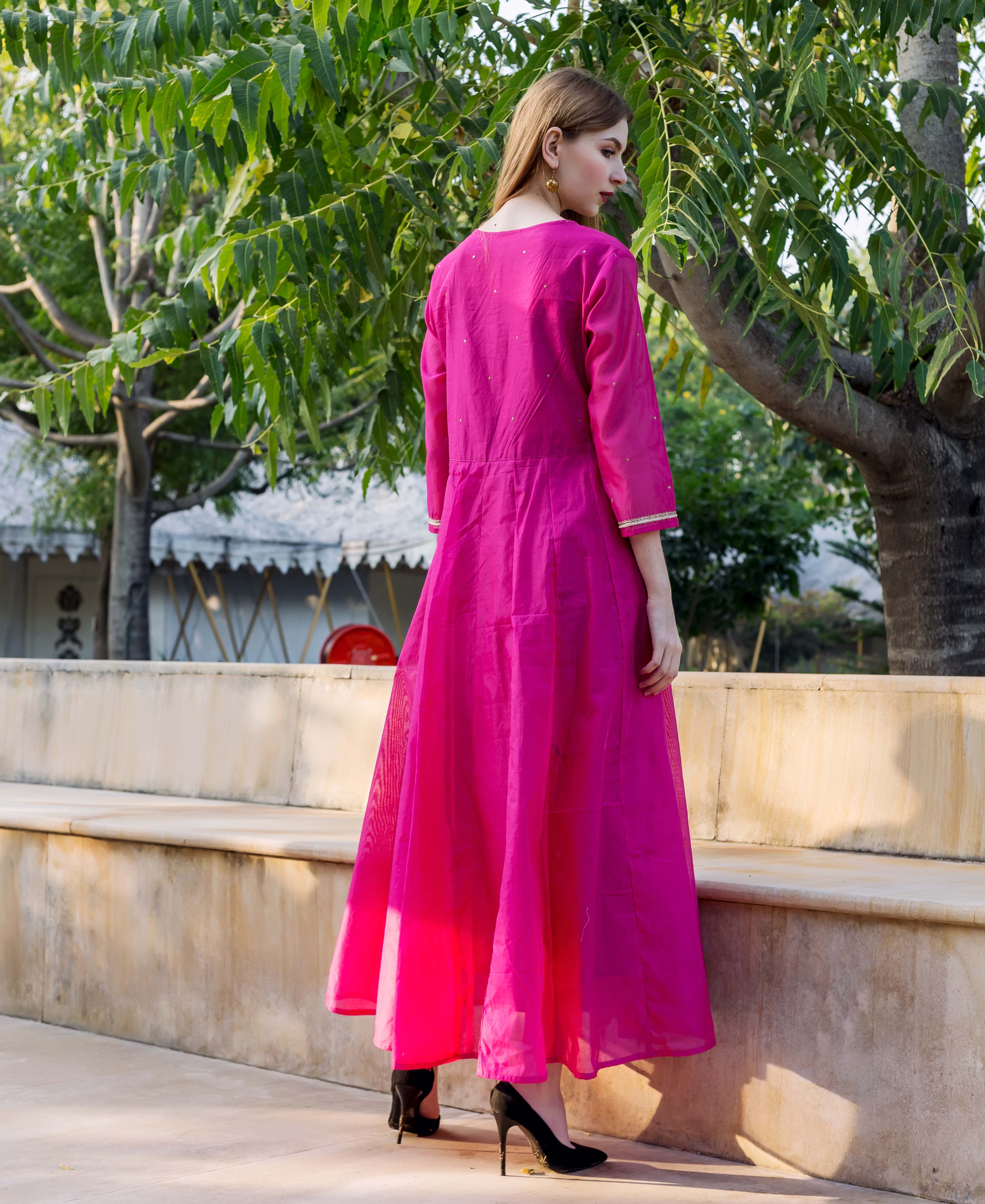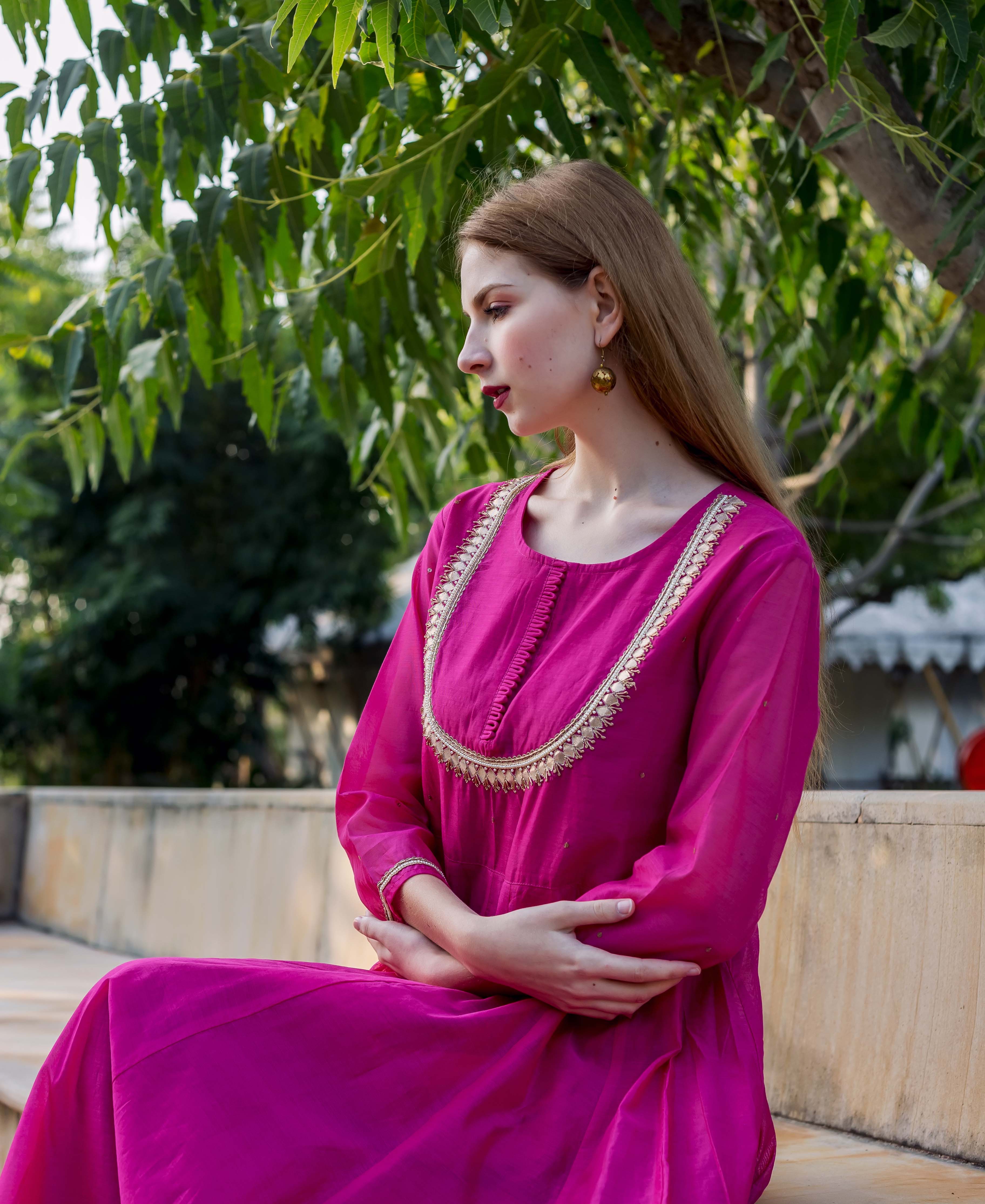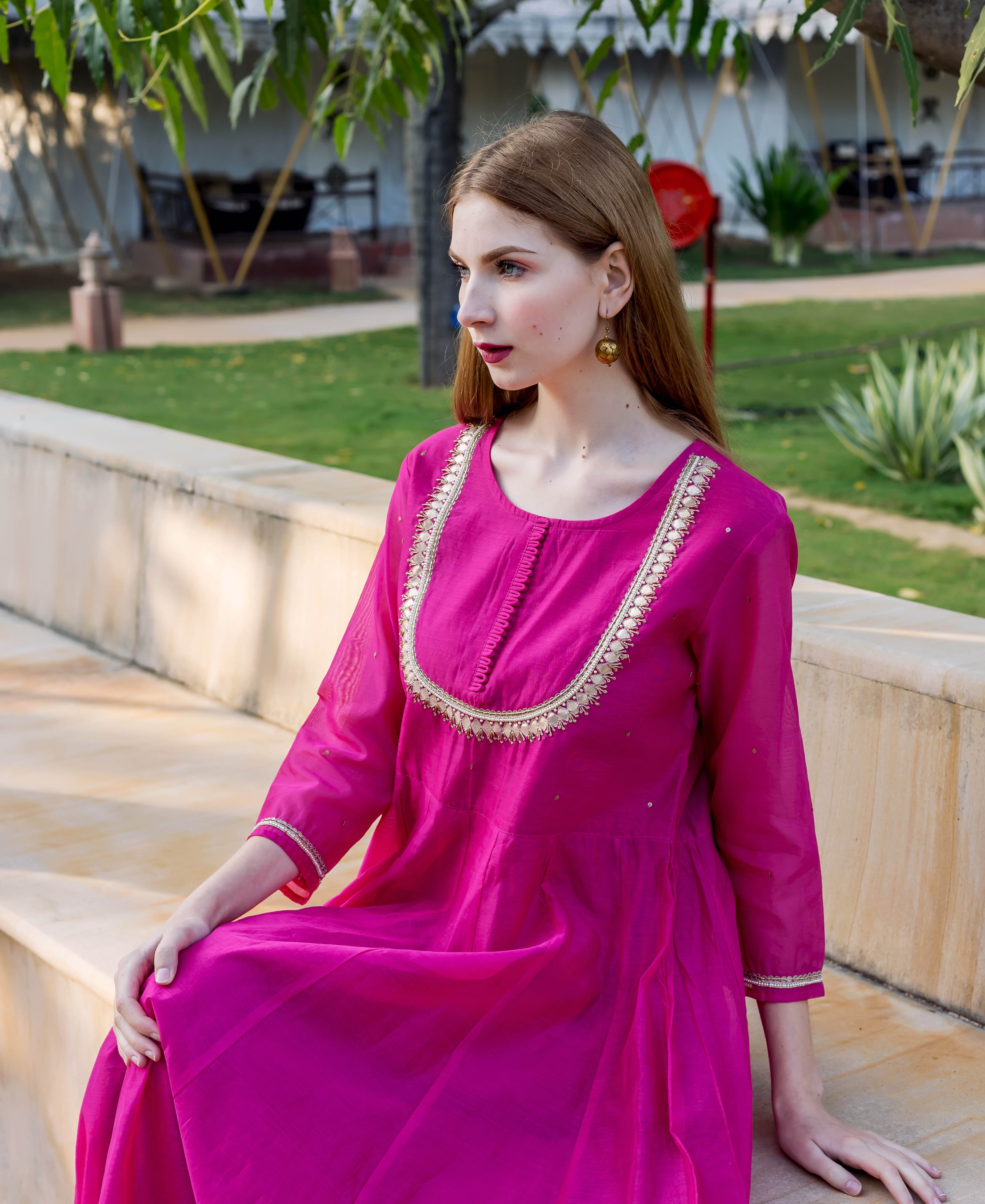 Eshika Raspberry Pink Embroidered Chanderi Dress