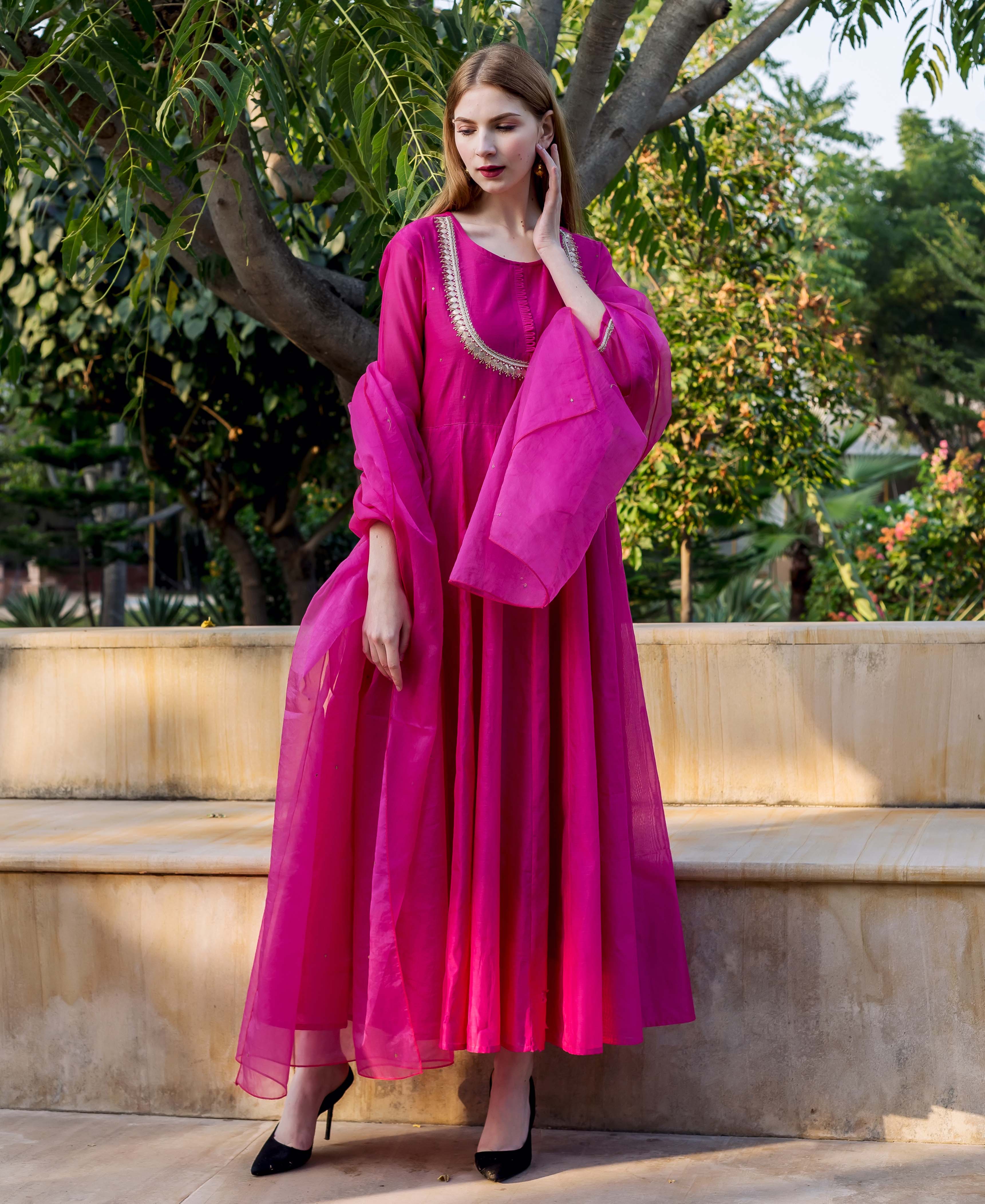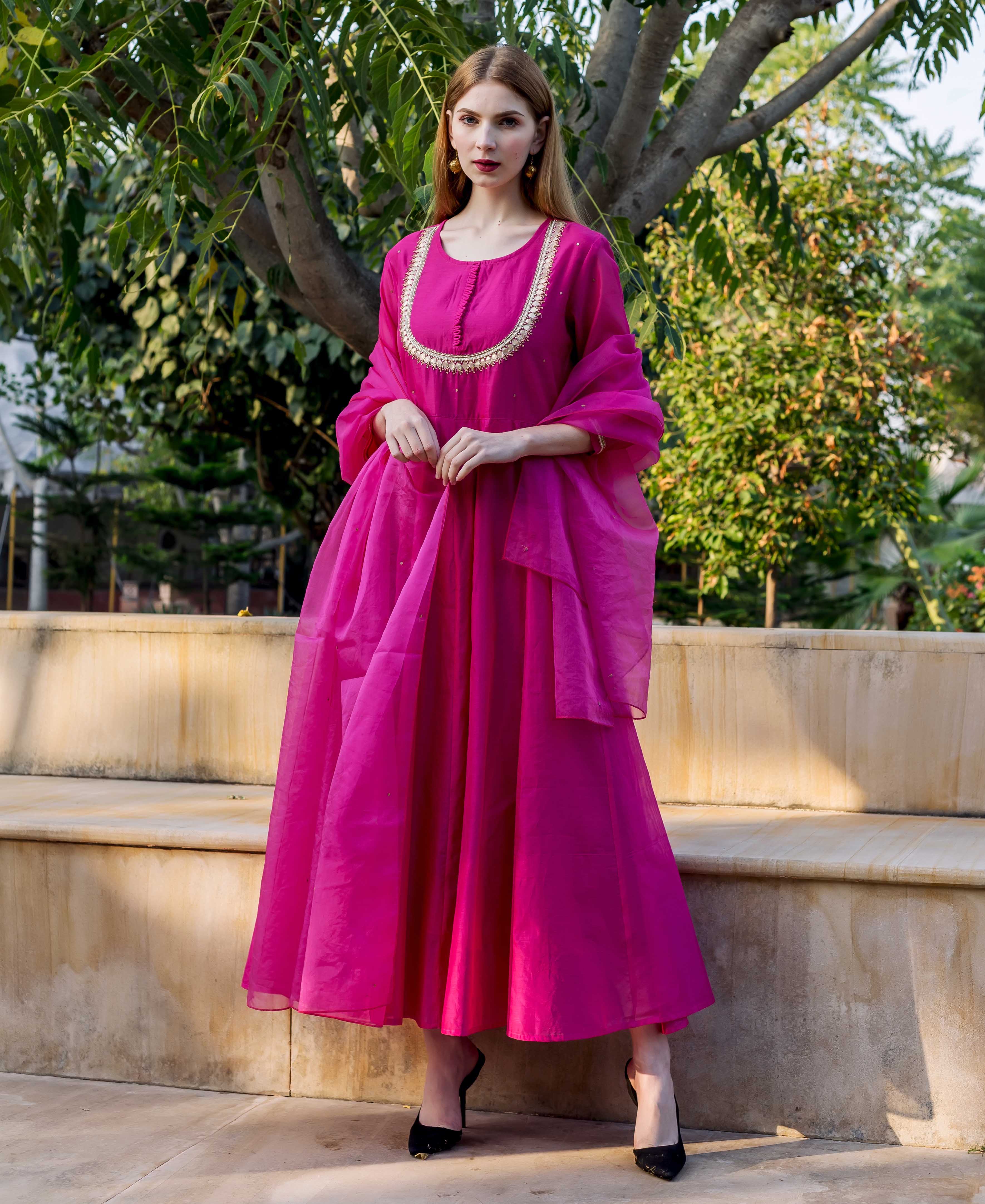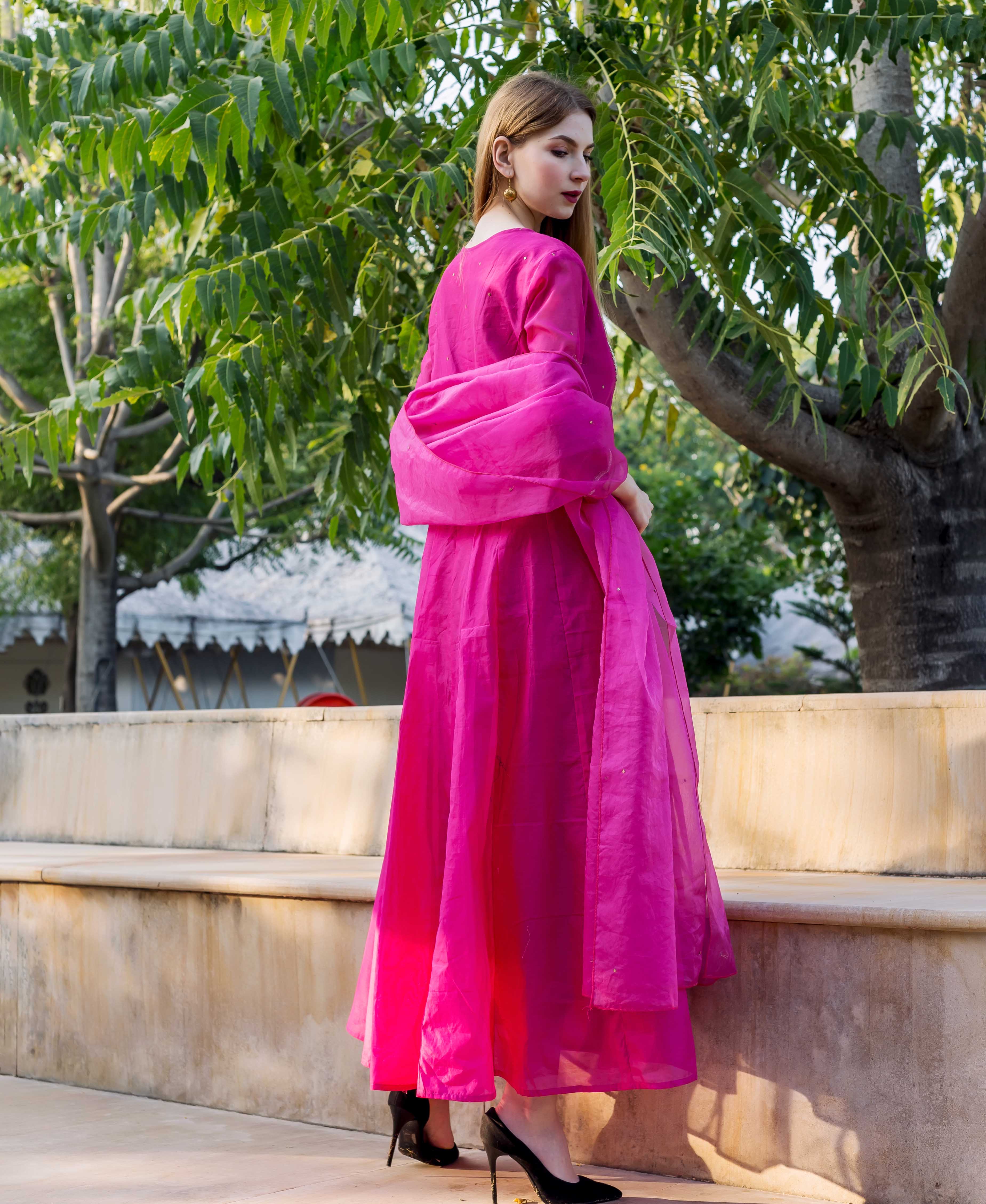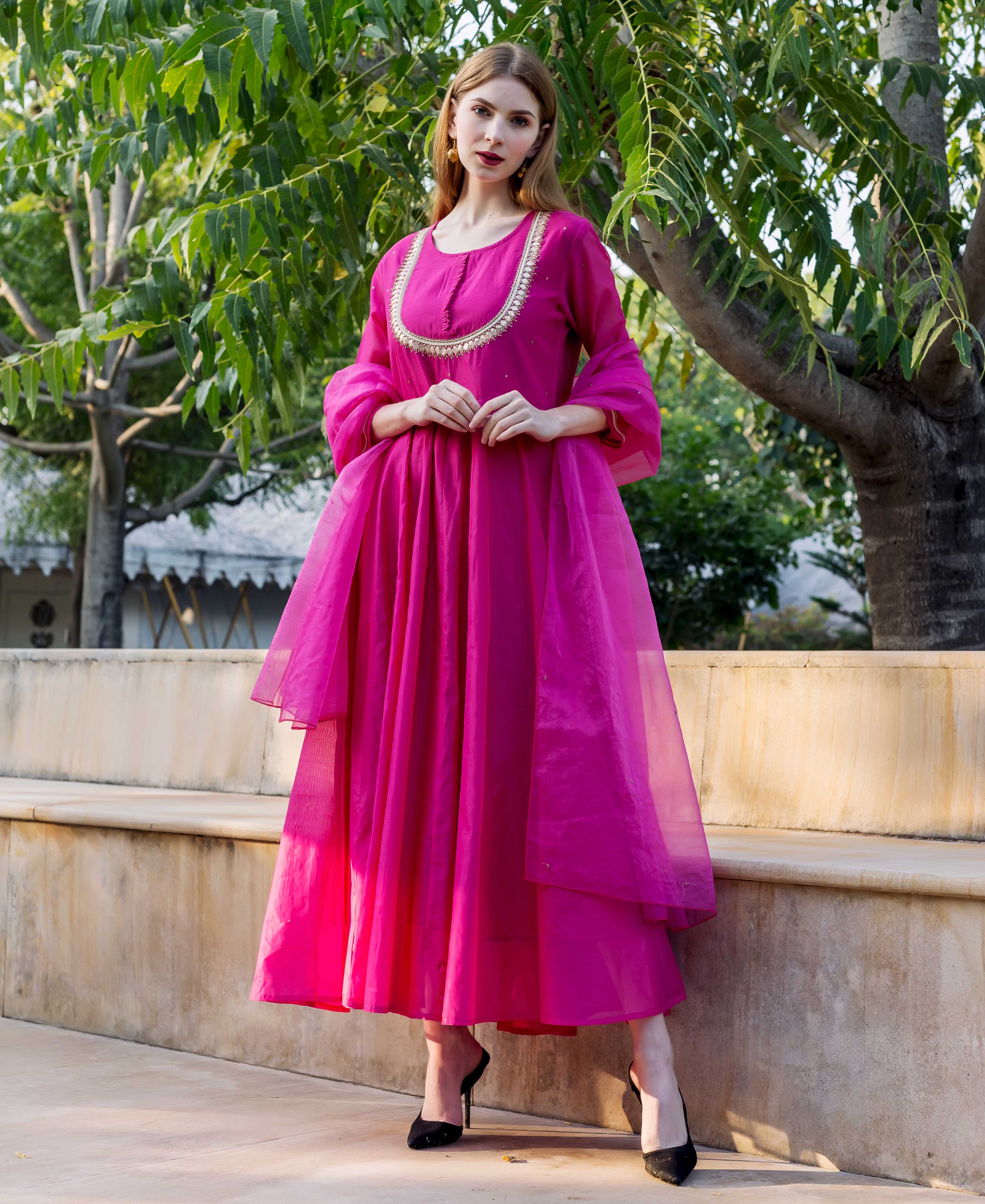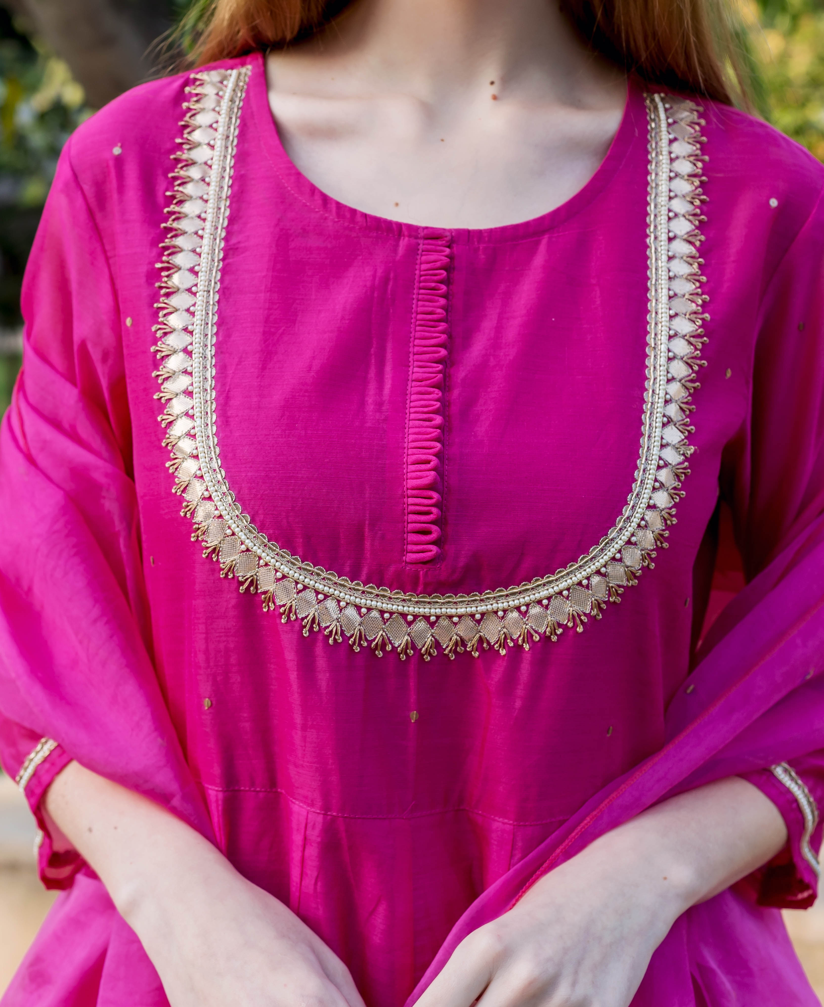 Eshika Raspberry Pink Embroidered Chanderi Dress