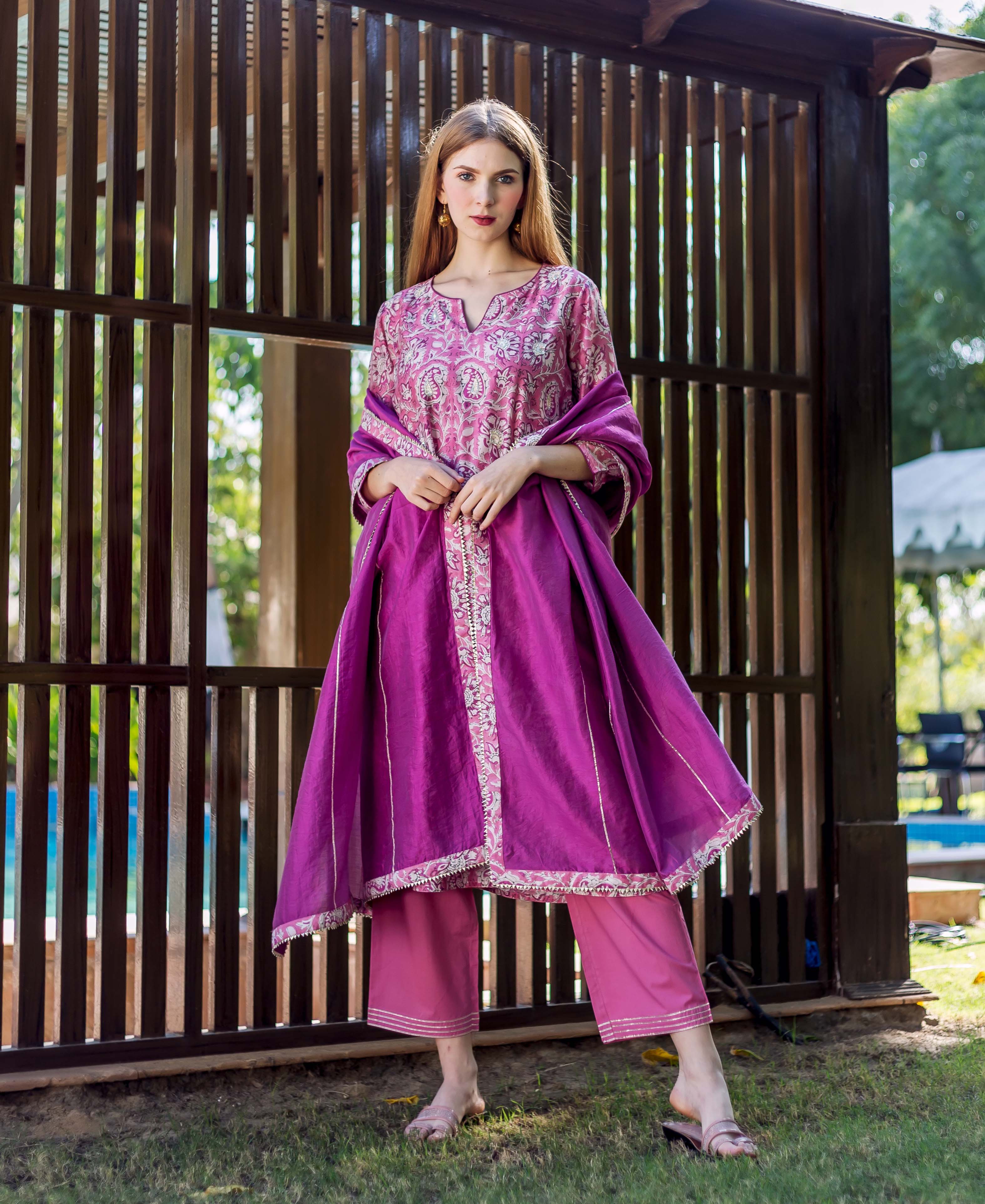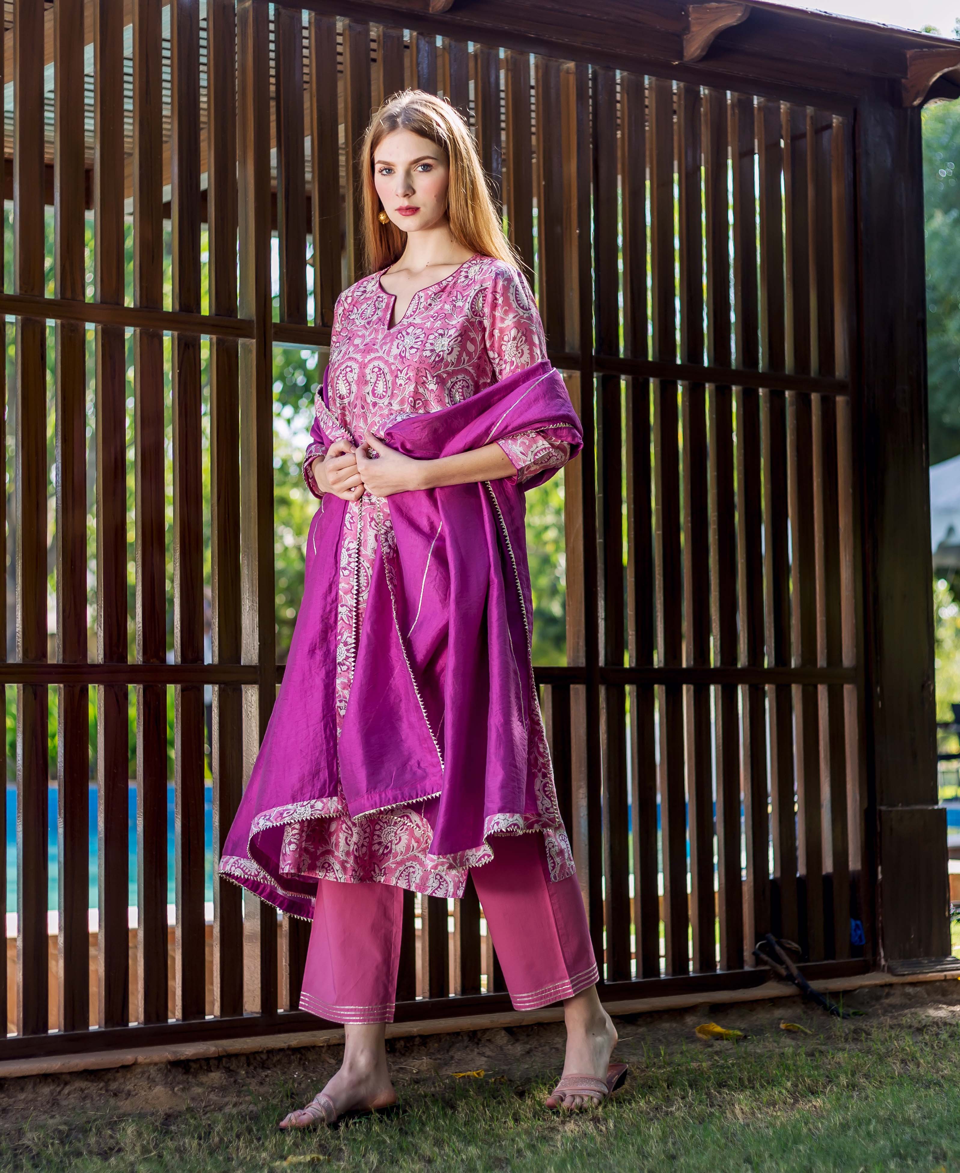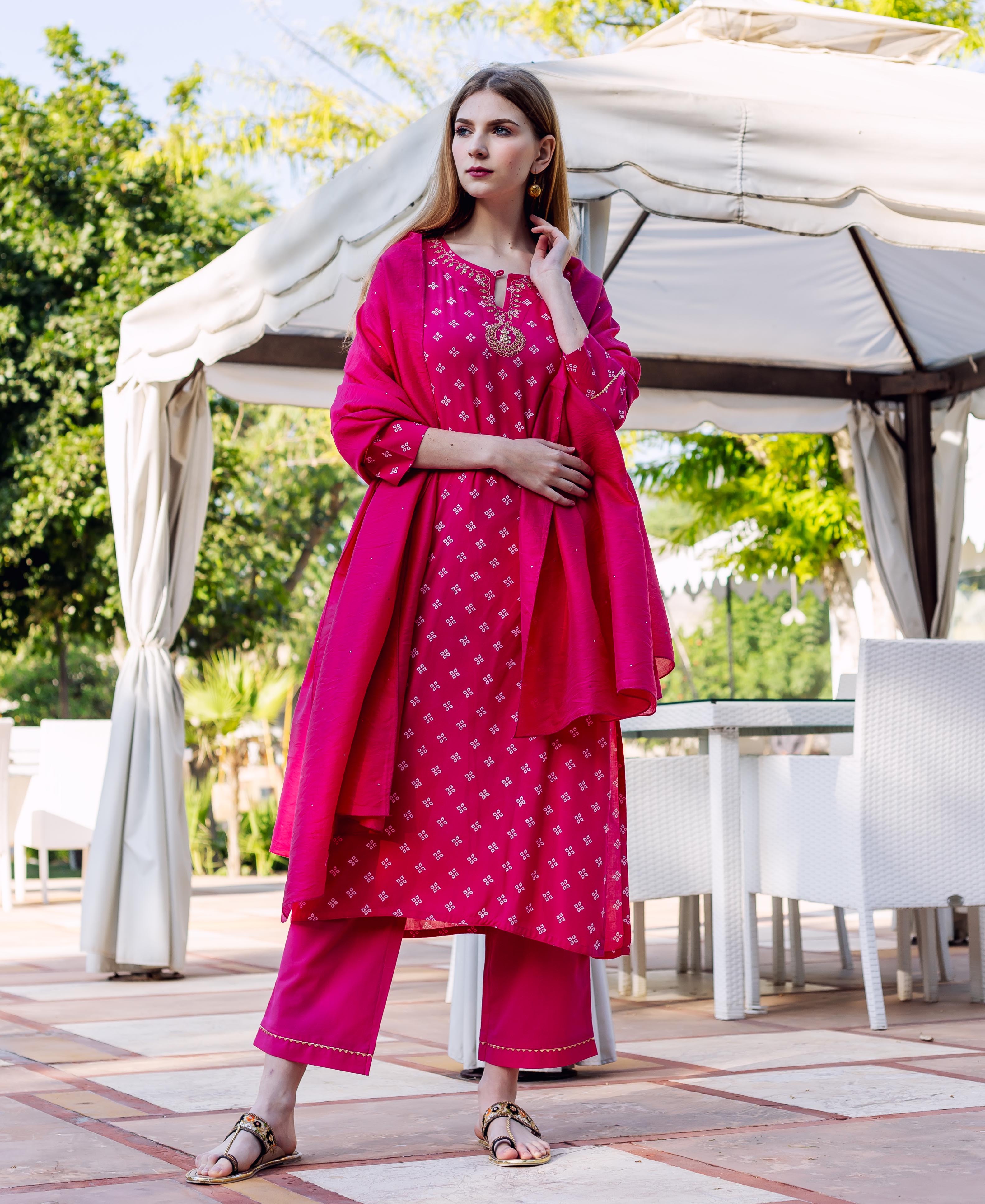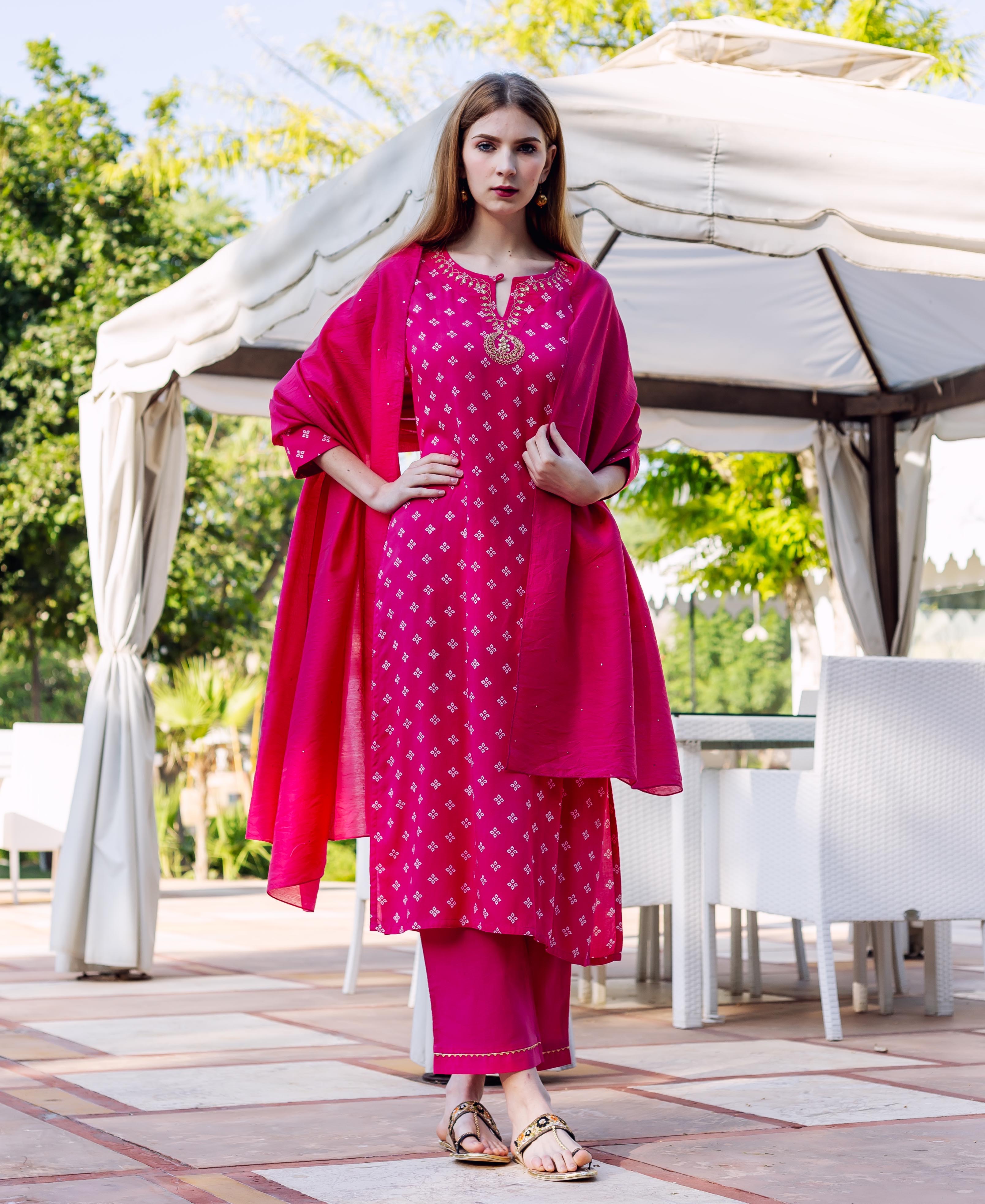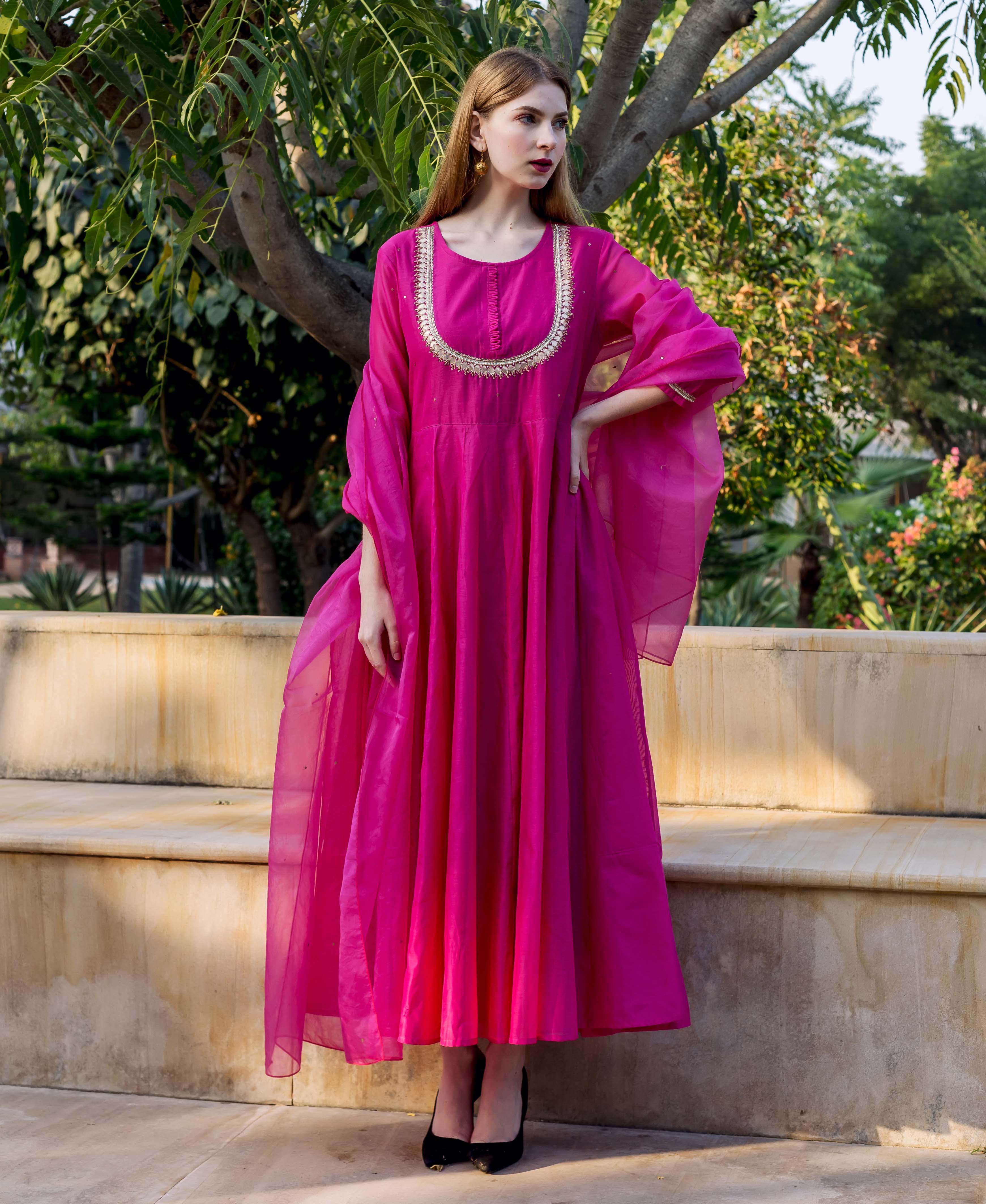 Eshika Raspberry Pink Embroidered Chanderi Dress