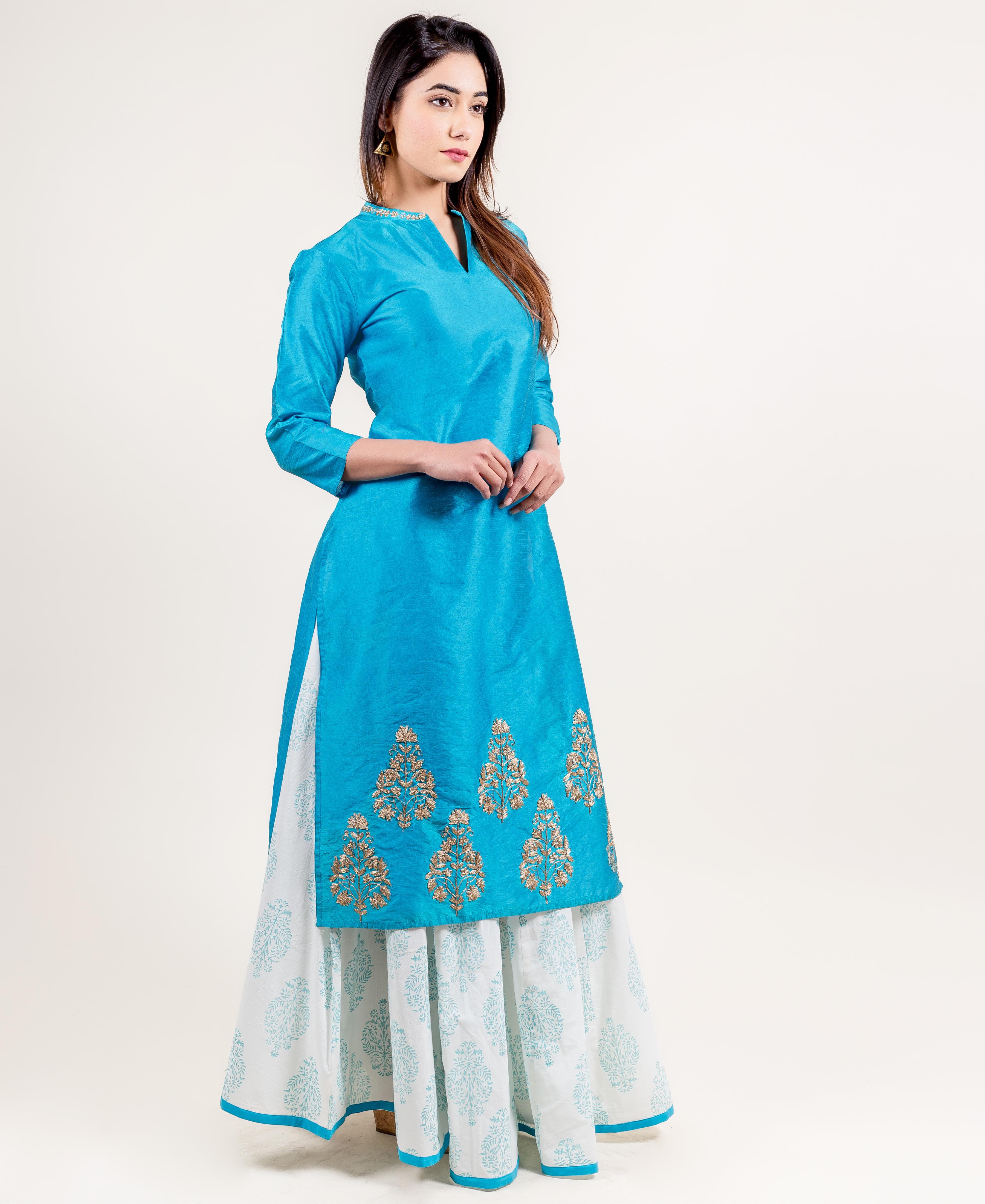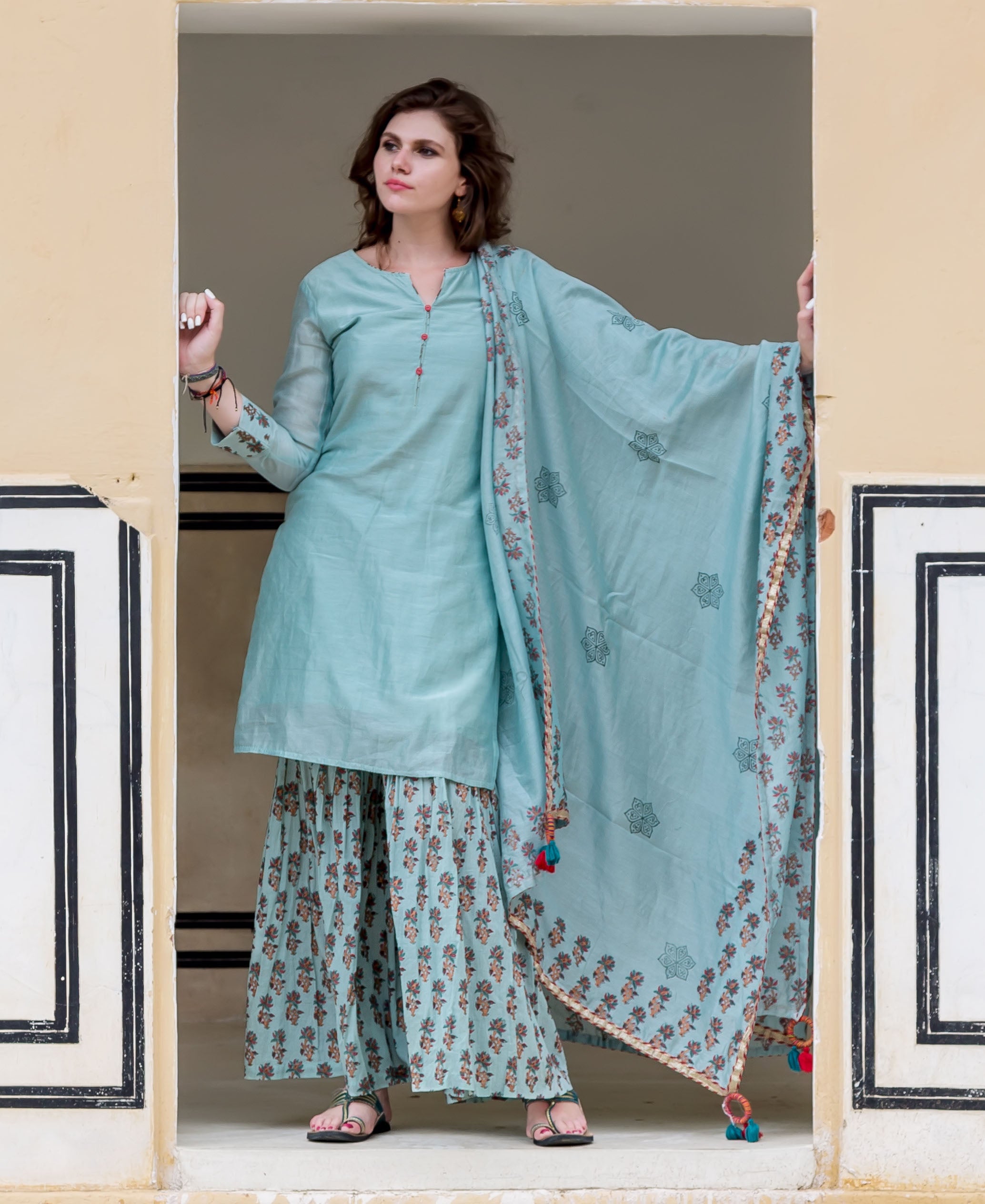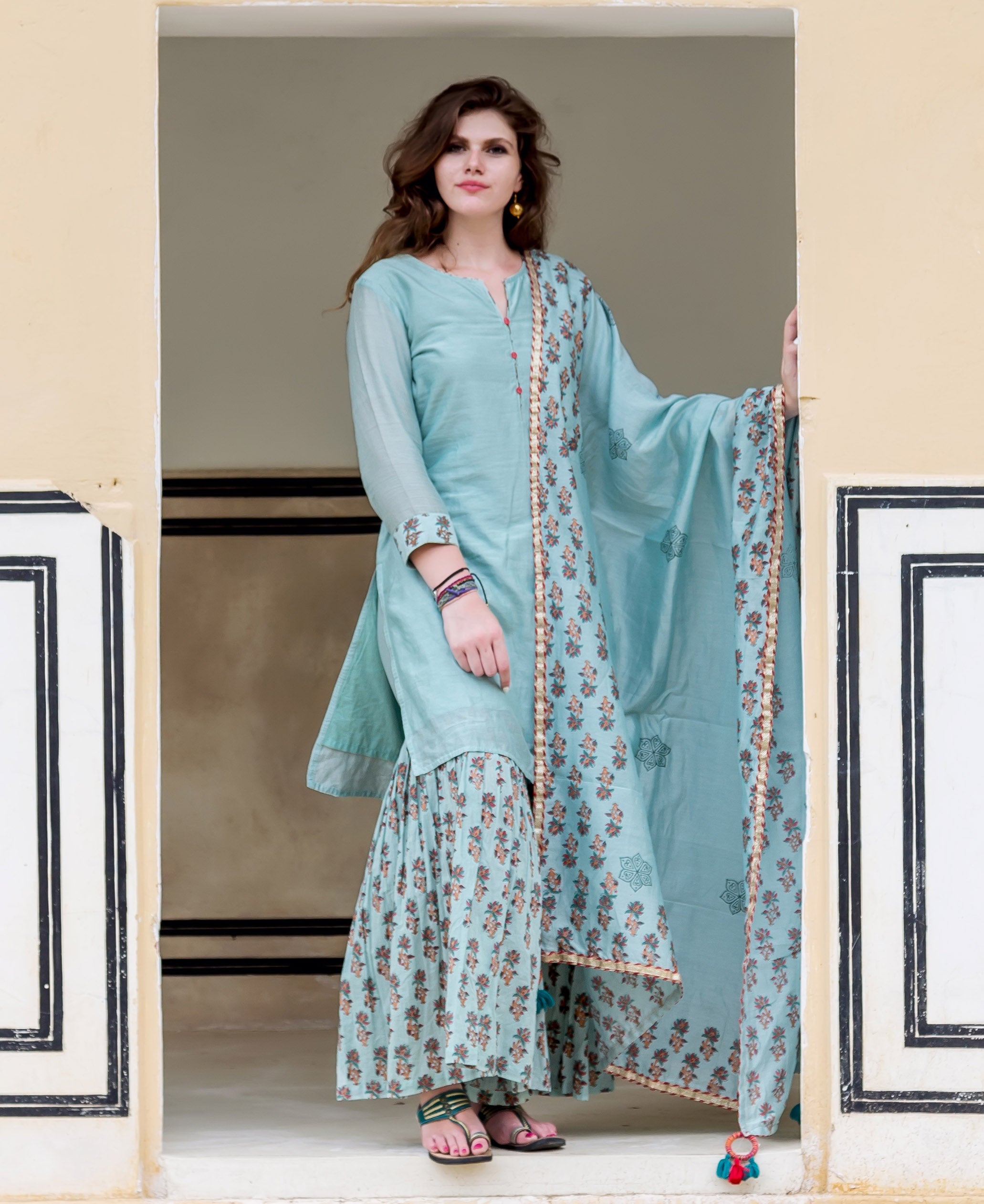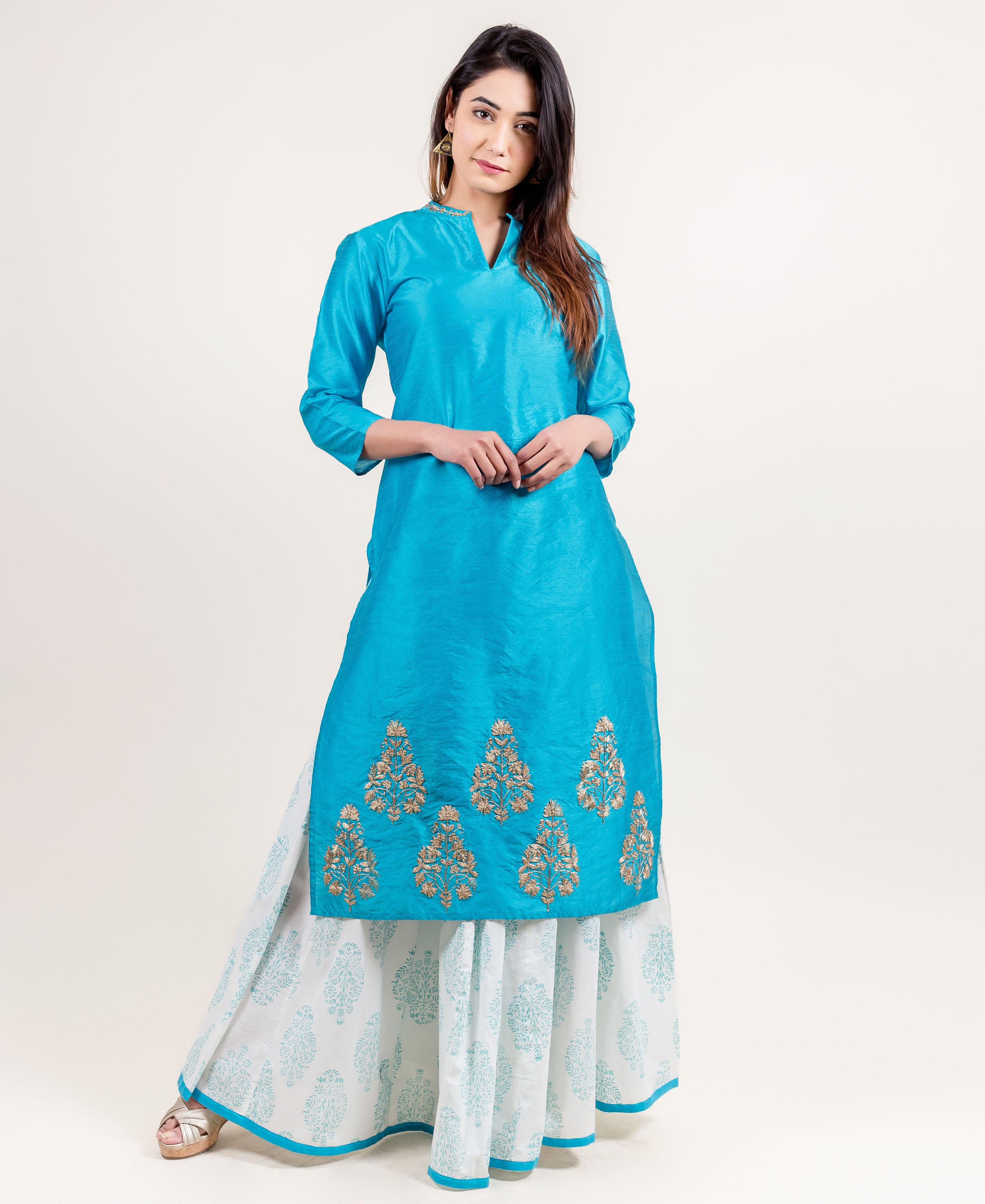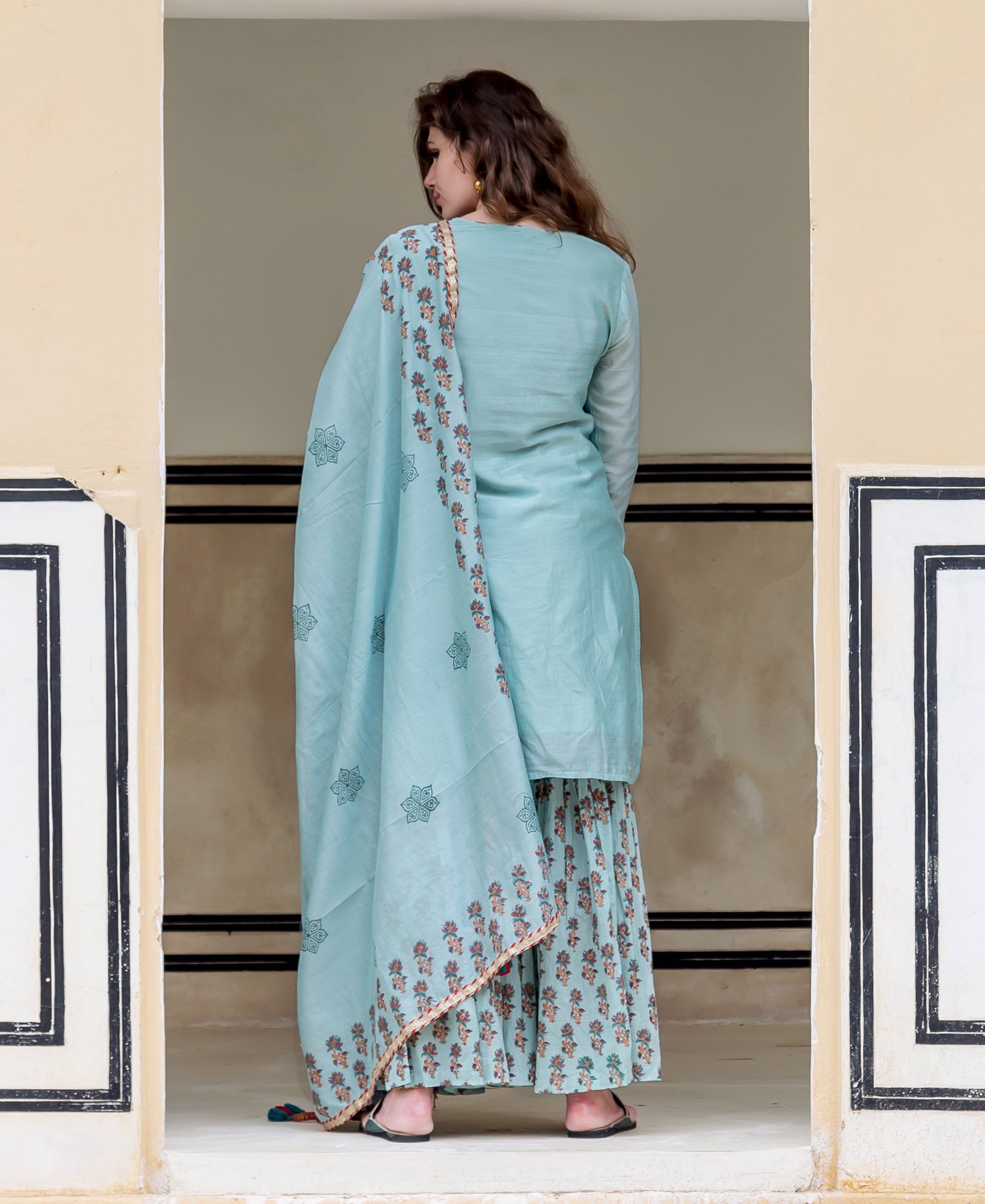 Turkish Blue Hand Block Printed Kurta and Sharara