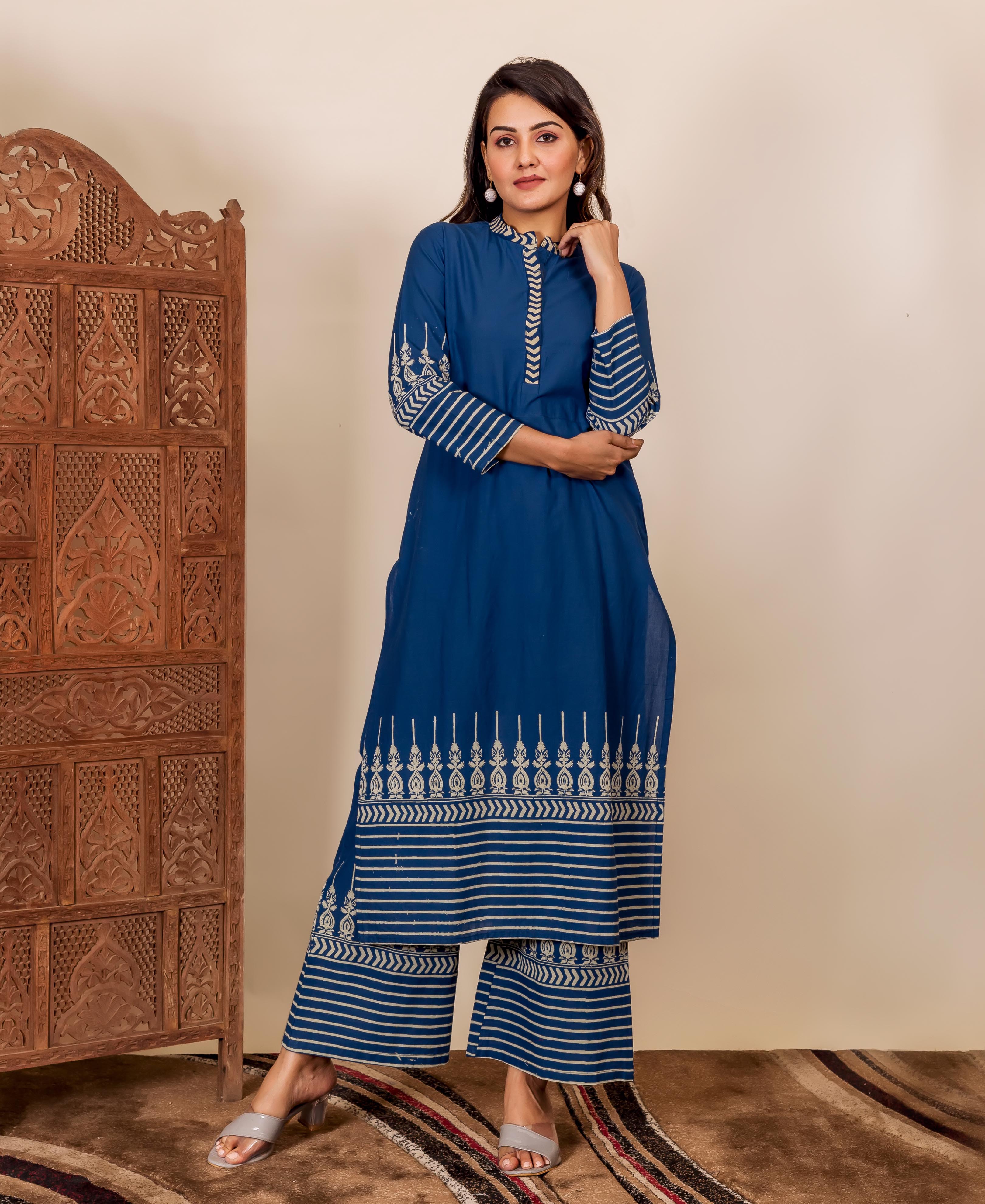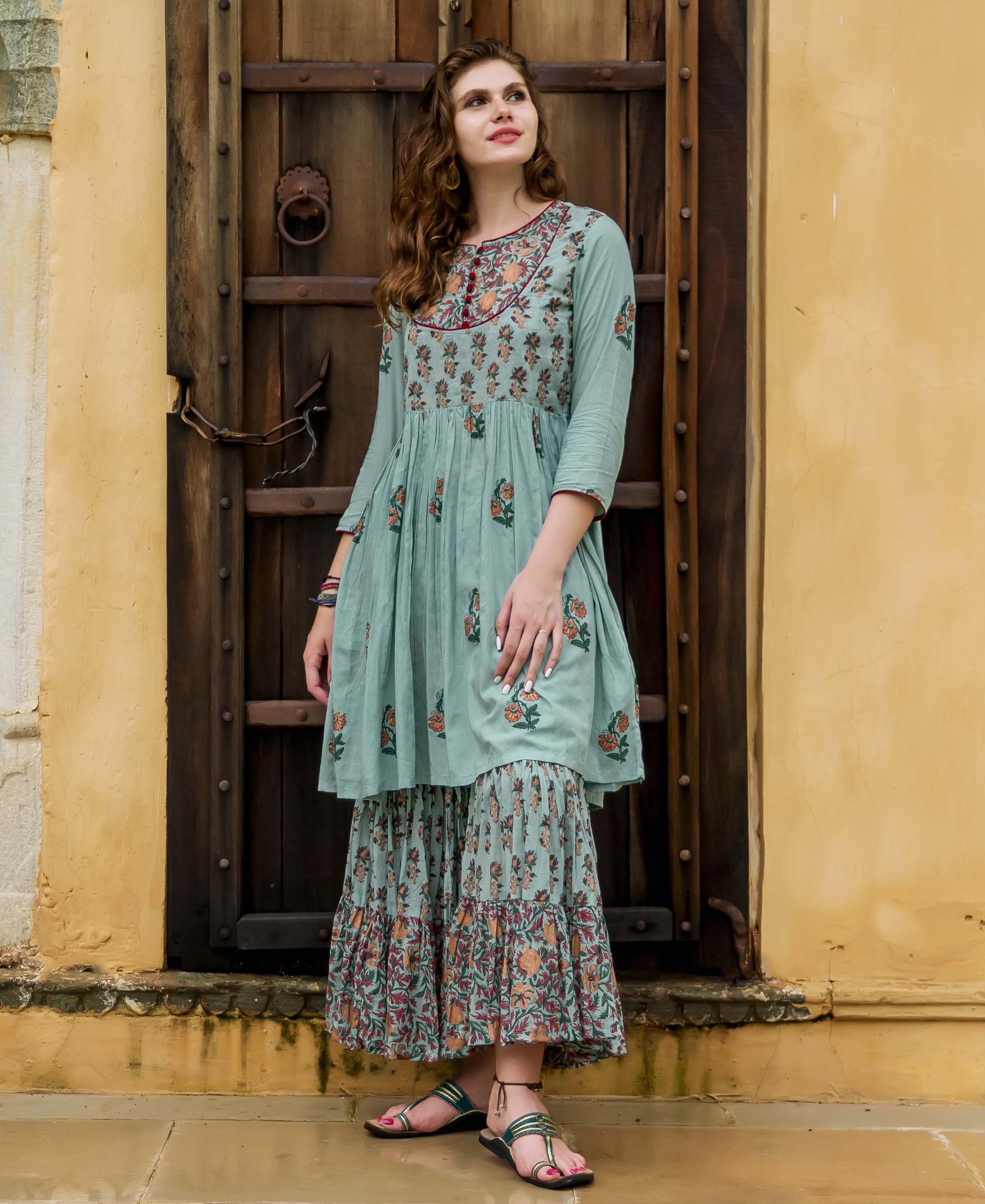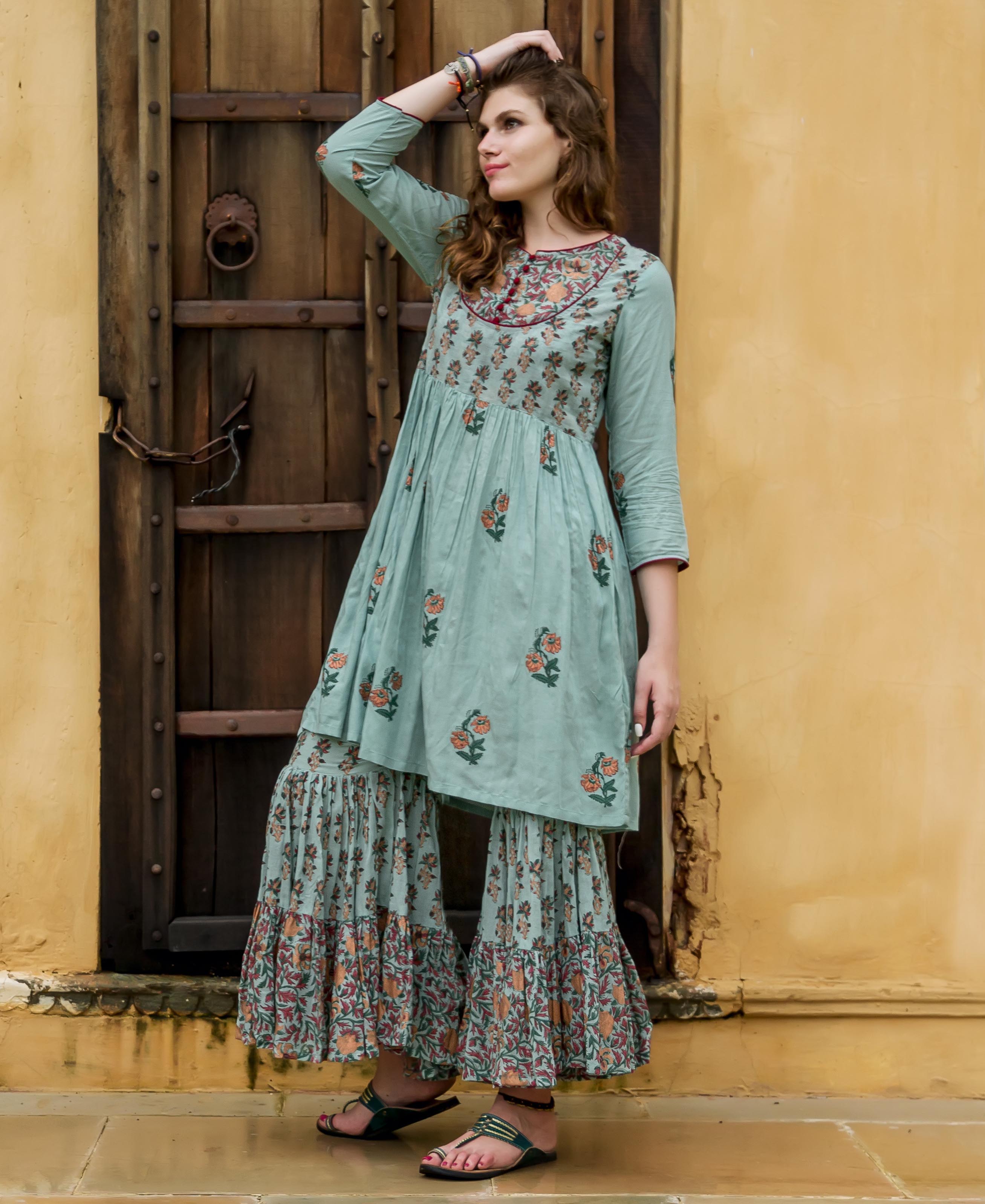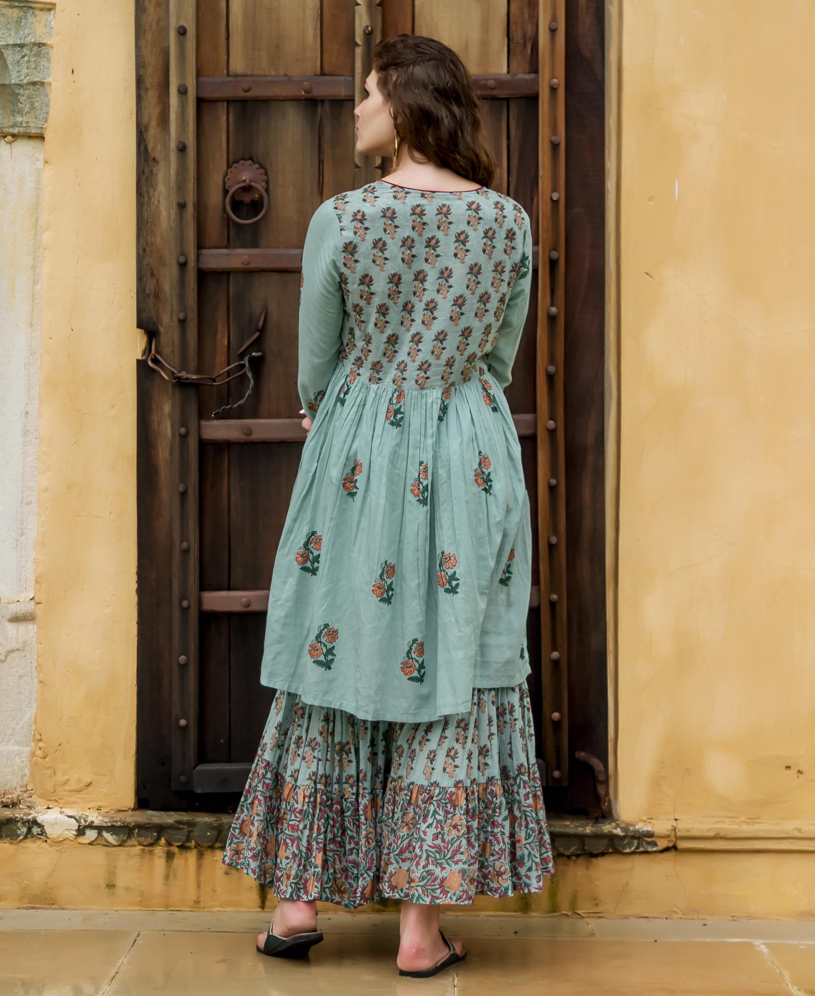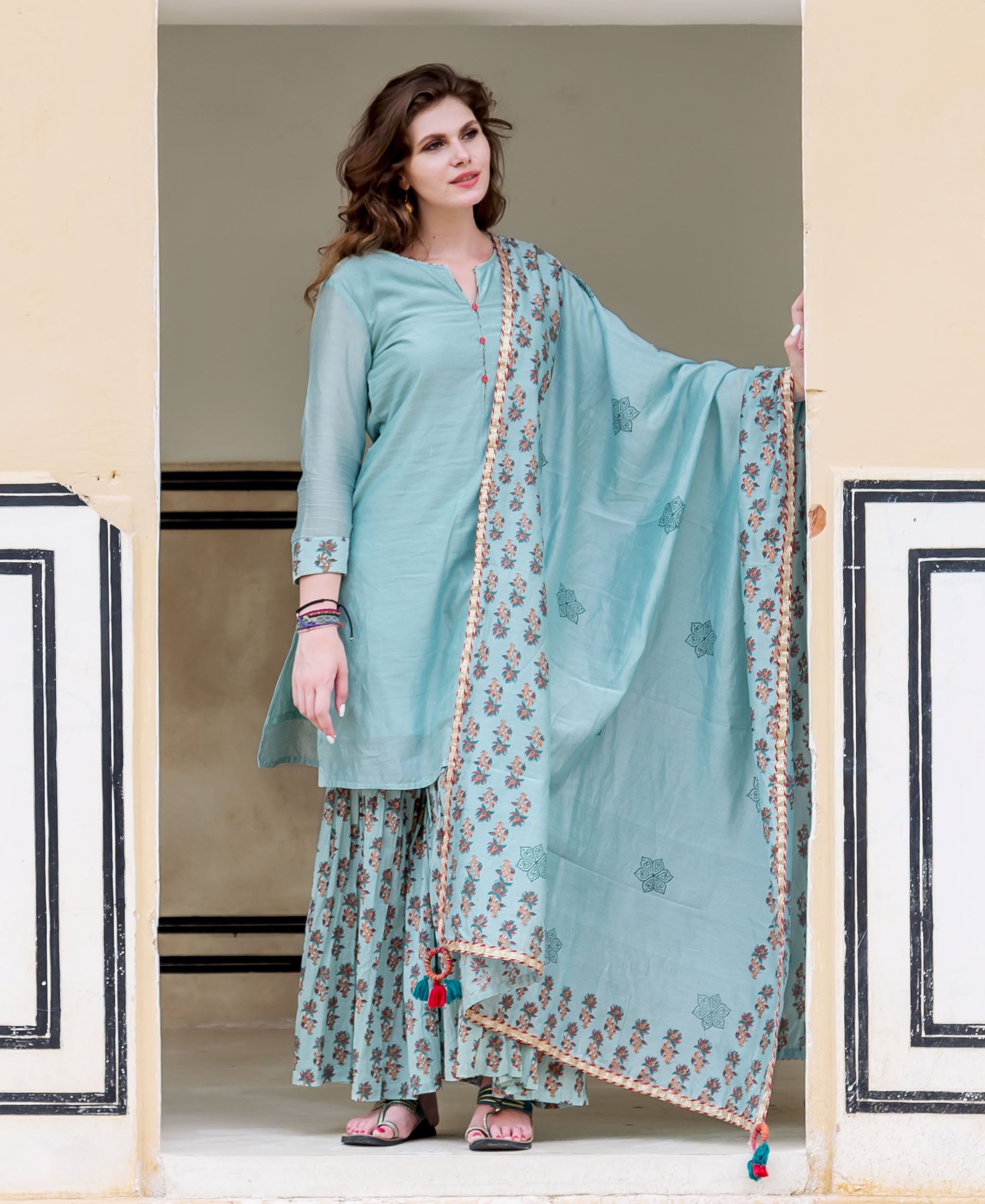 Turkish Blue Hand Block Printed Kurta and Sharara
