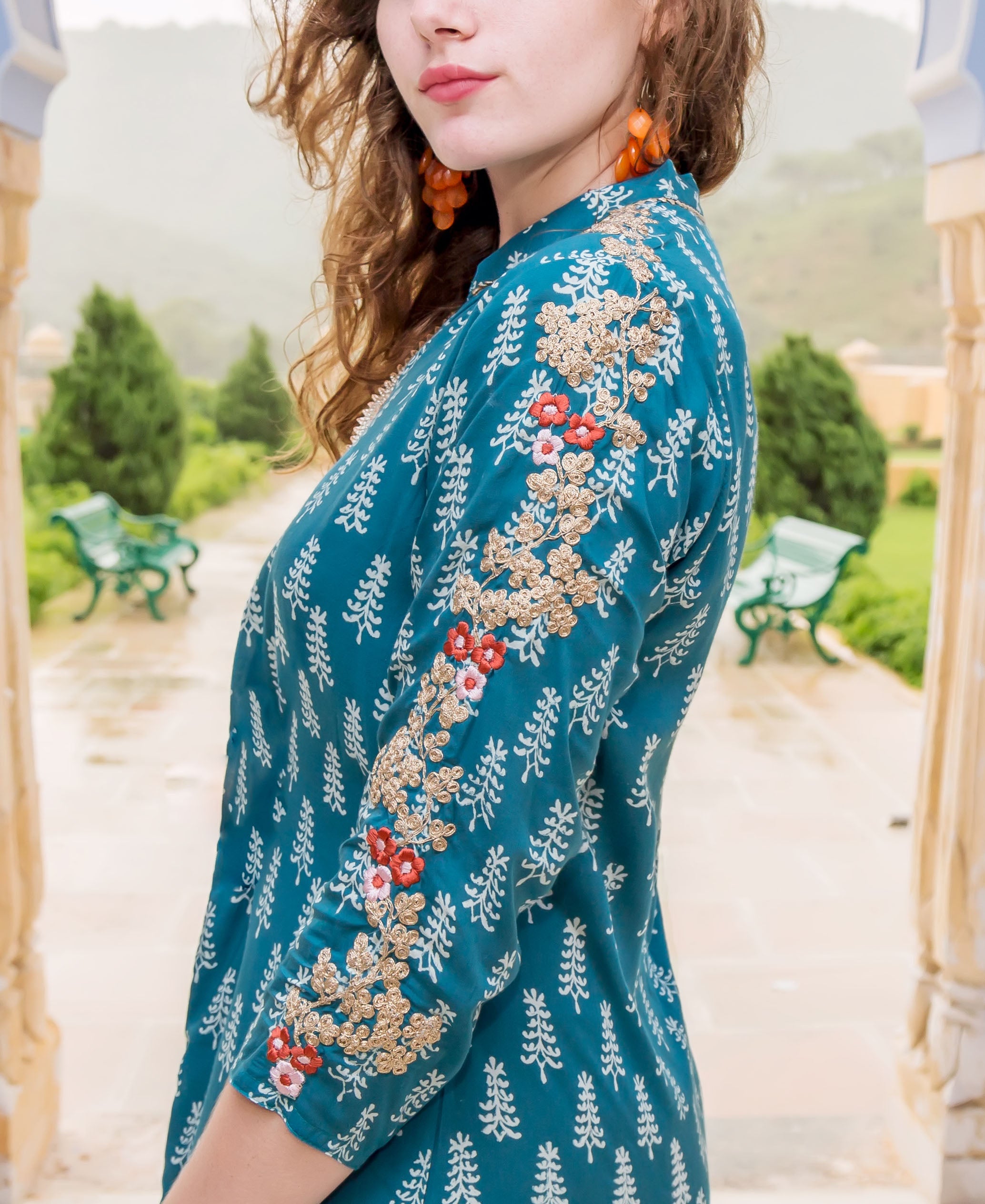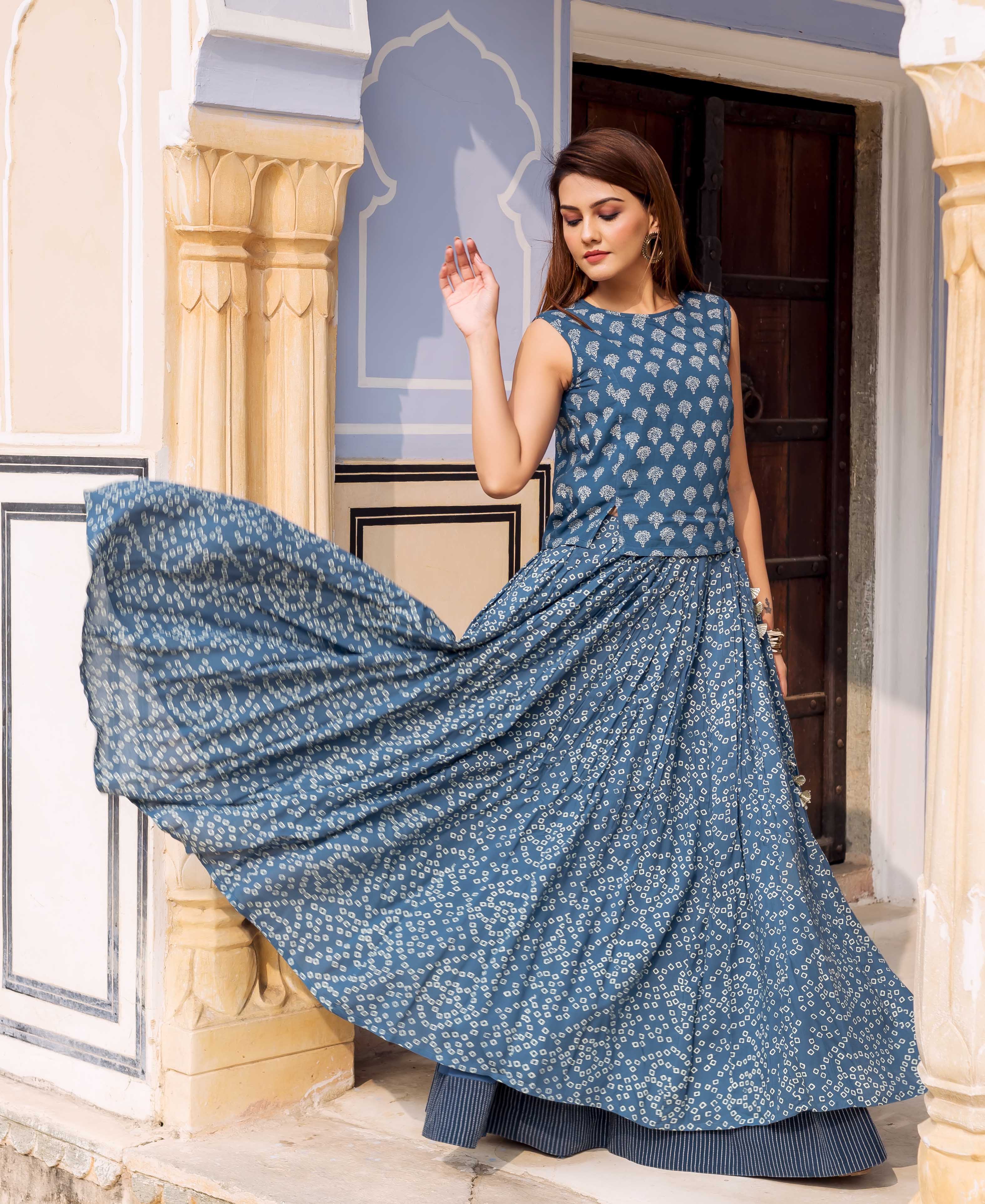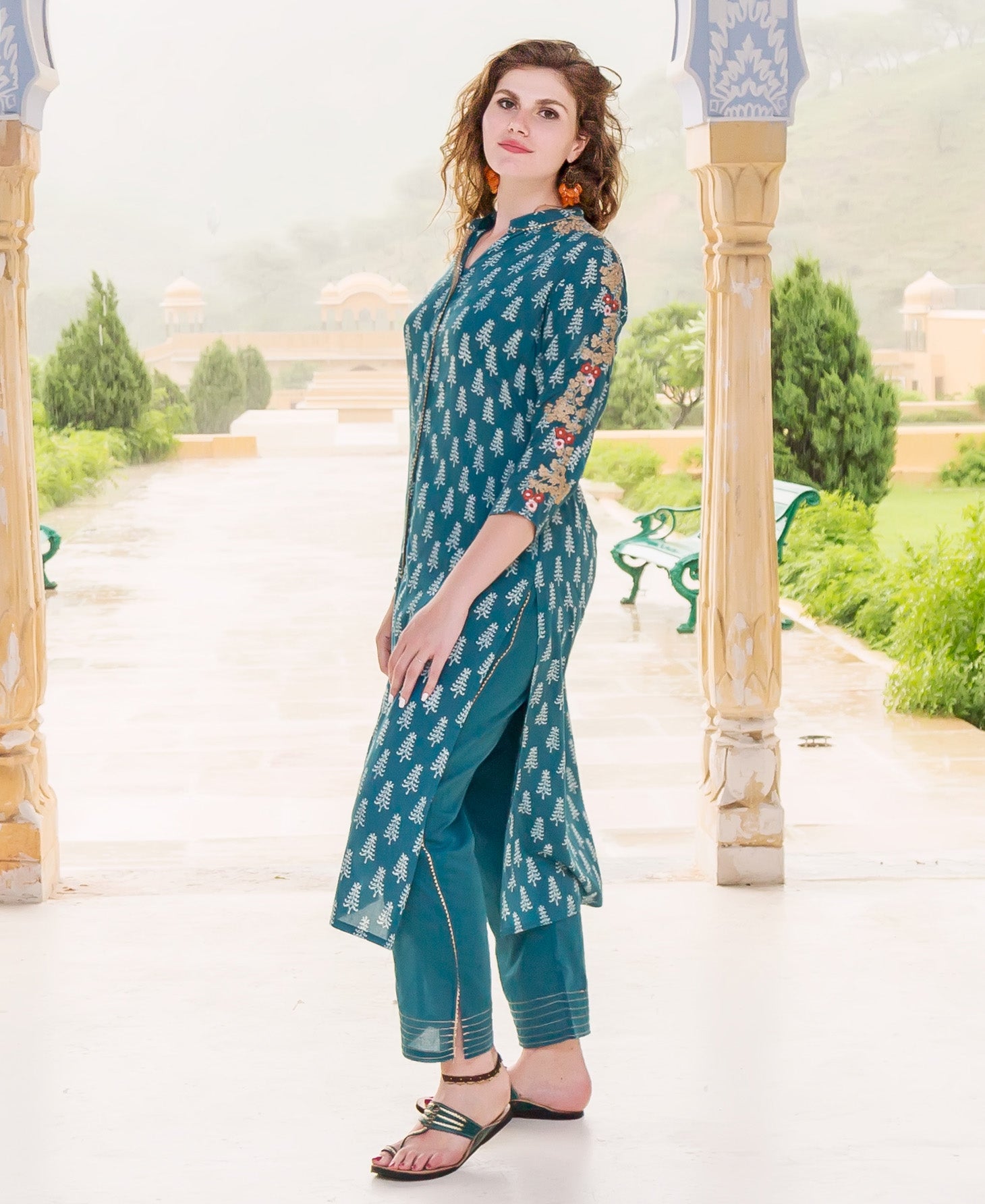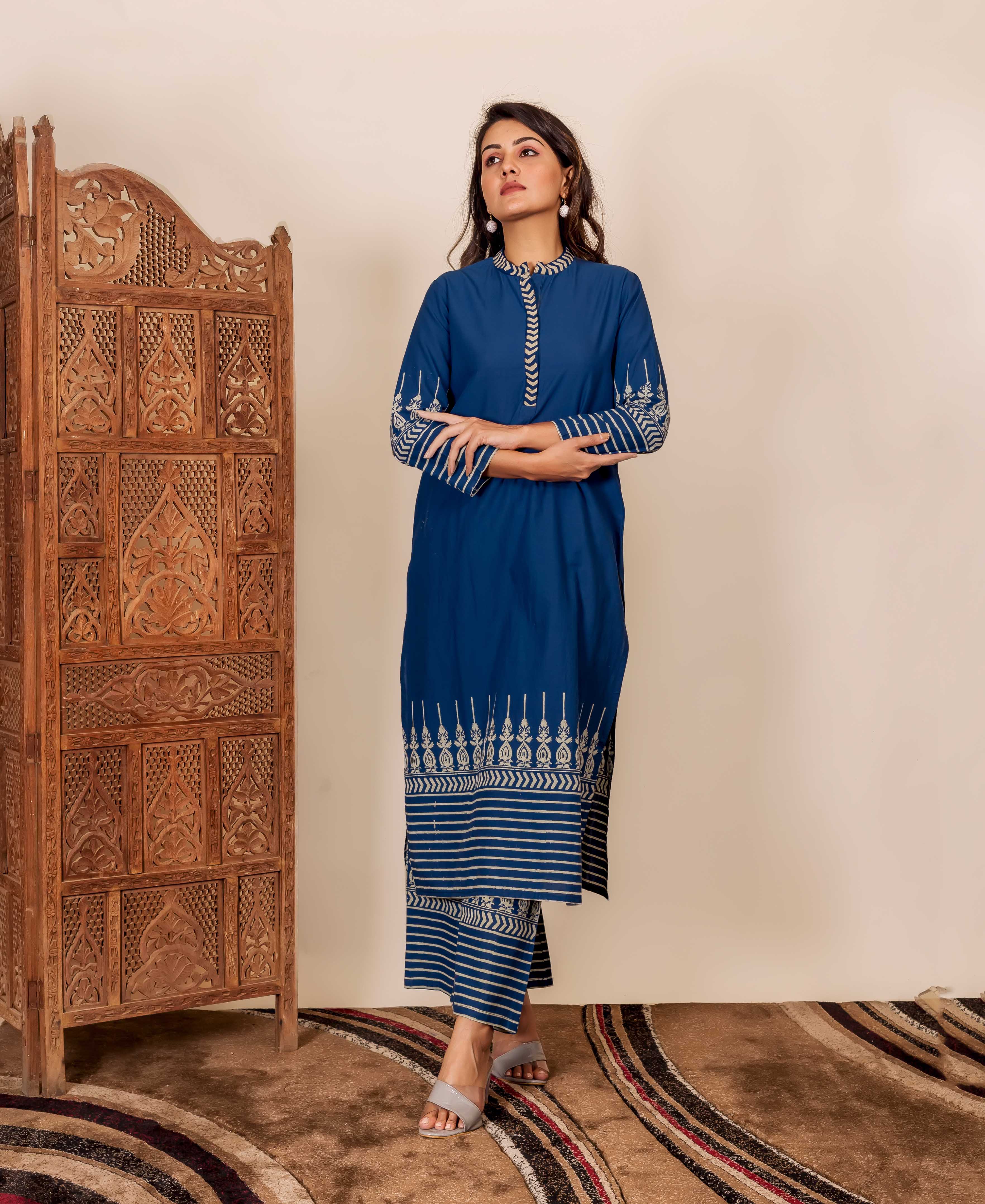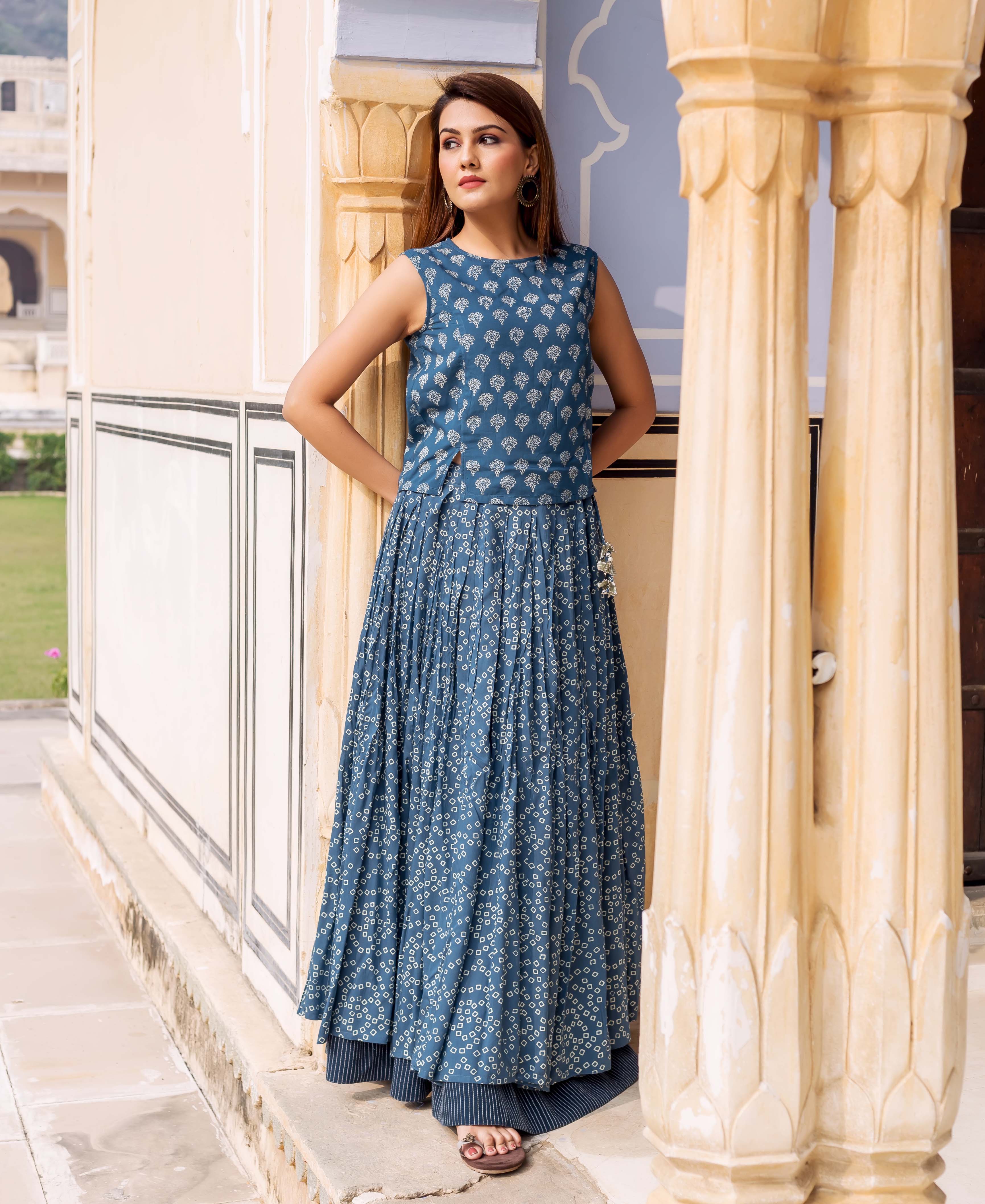 Turkish Blue Hand Block Printed Kurta and Sharara