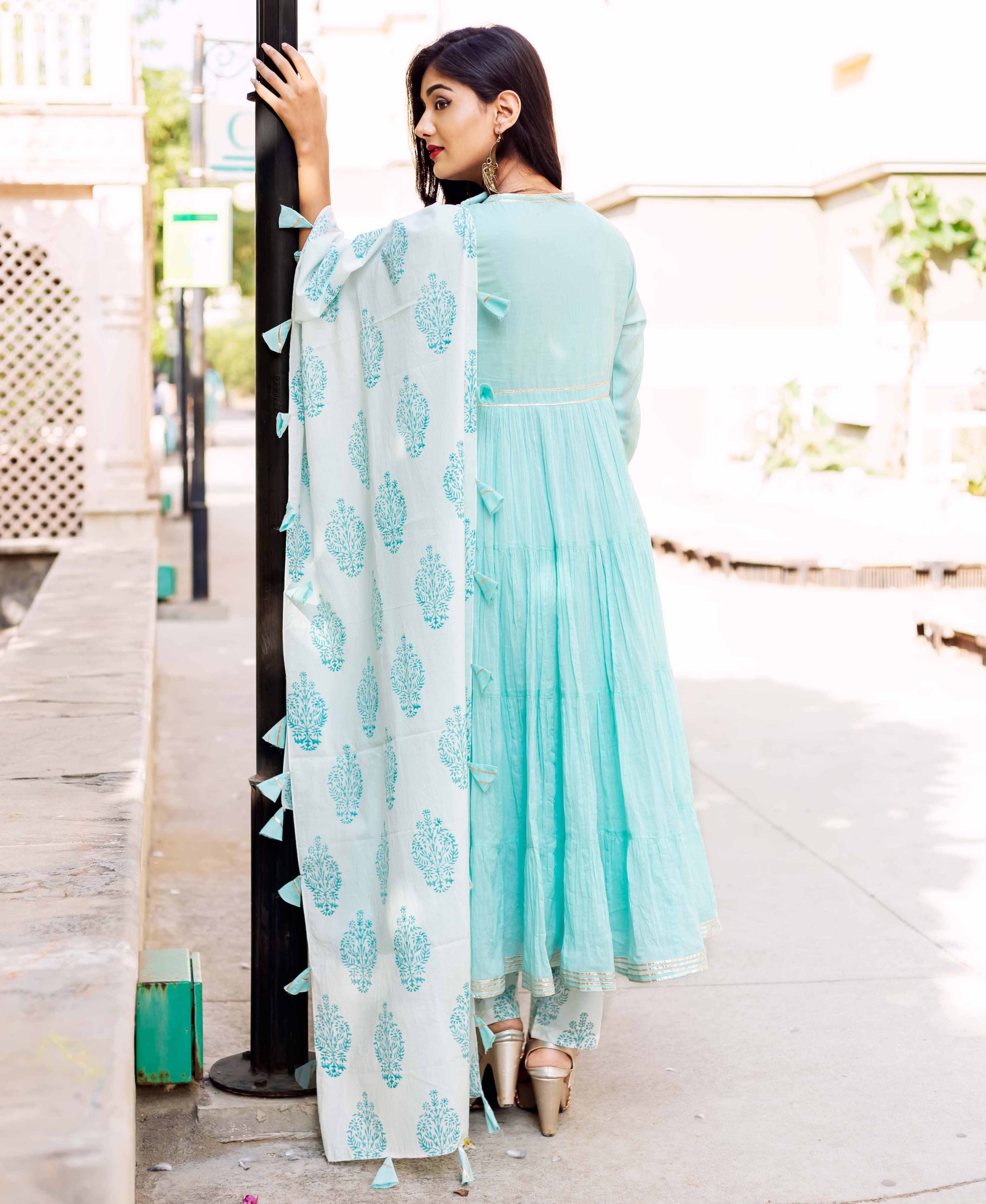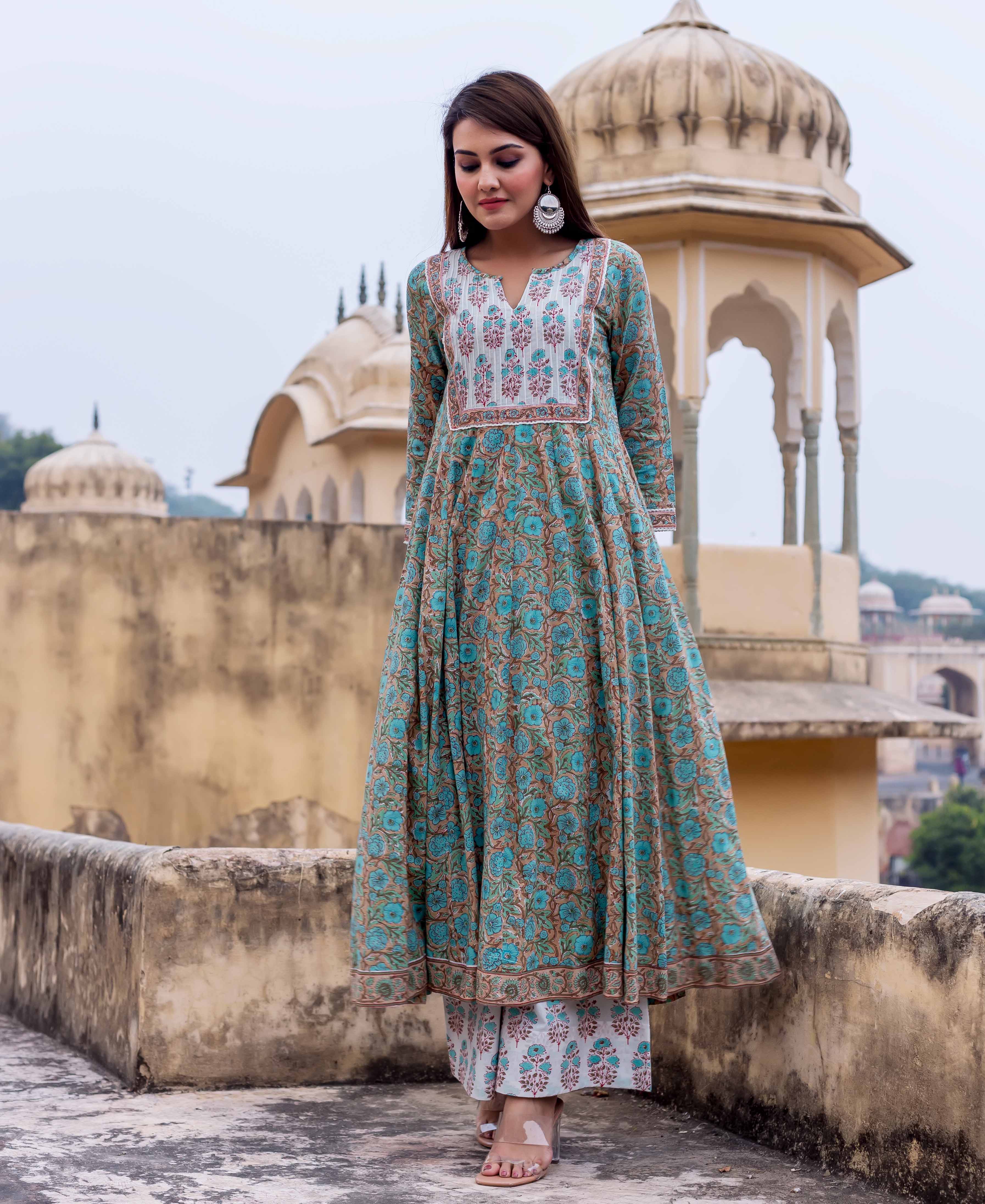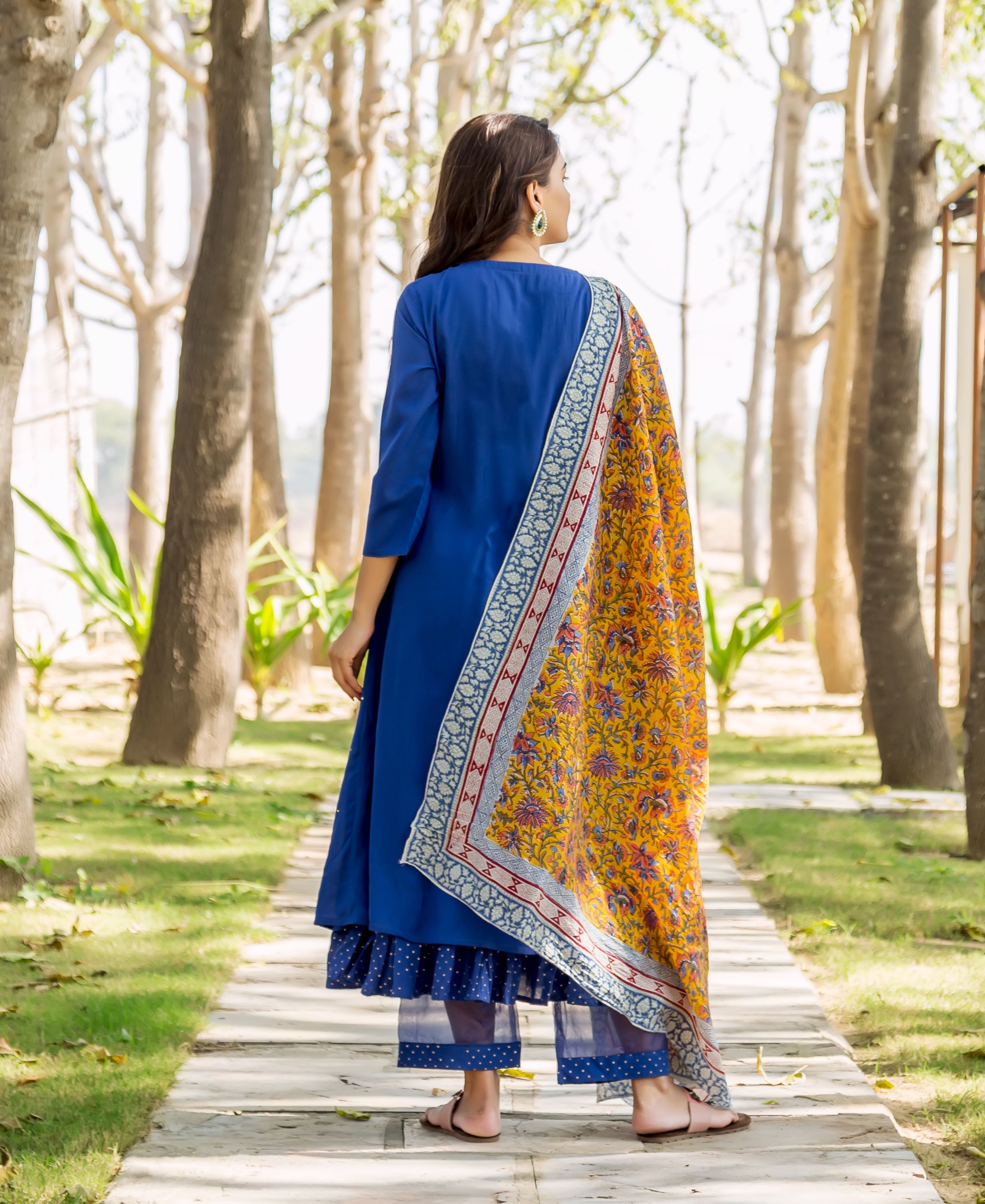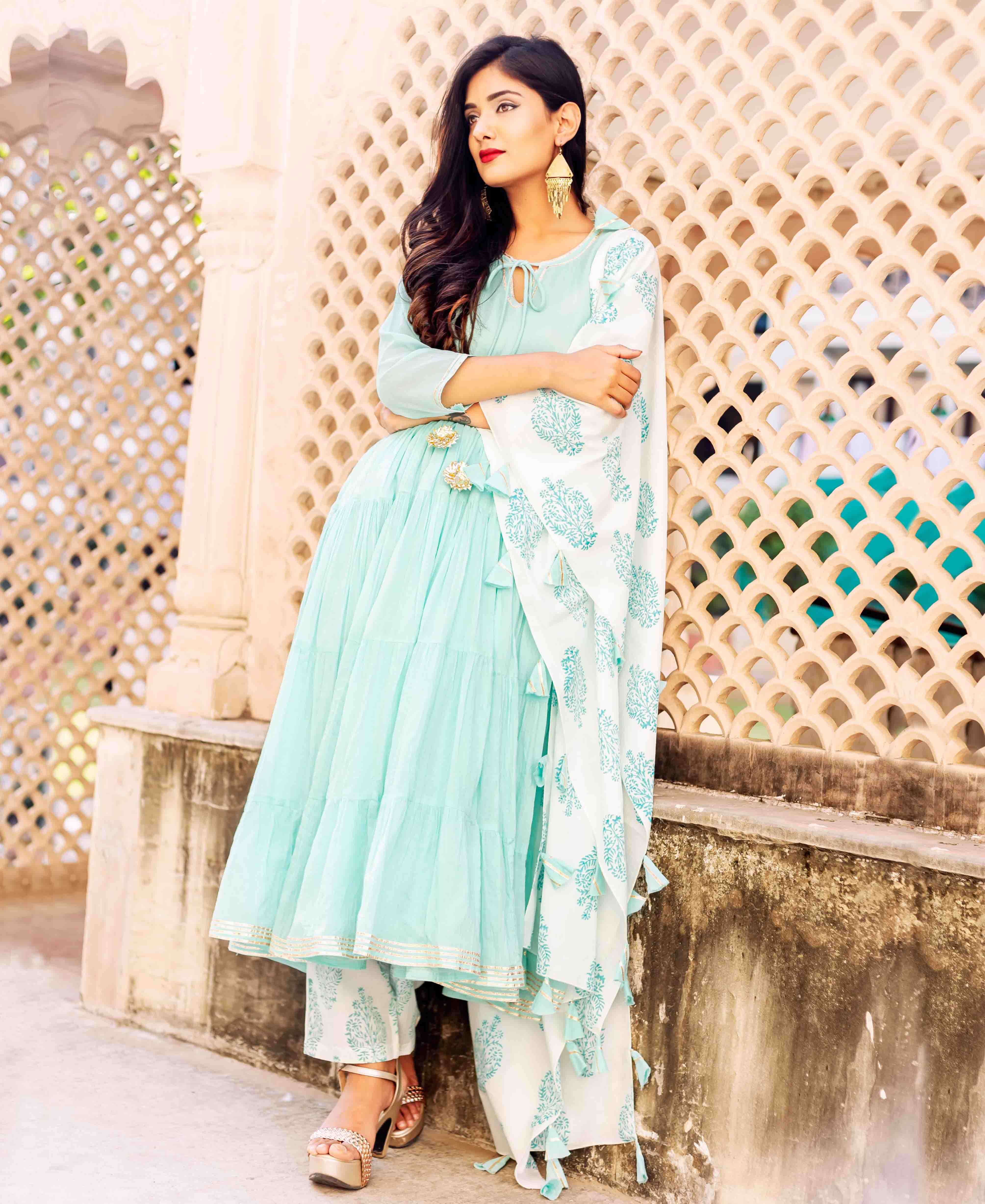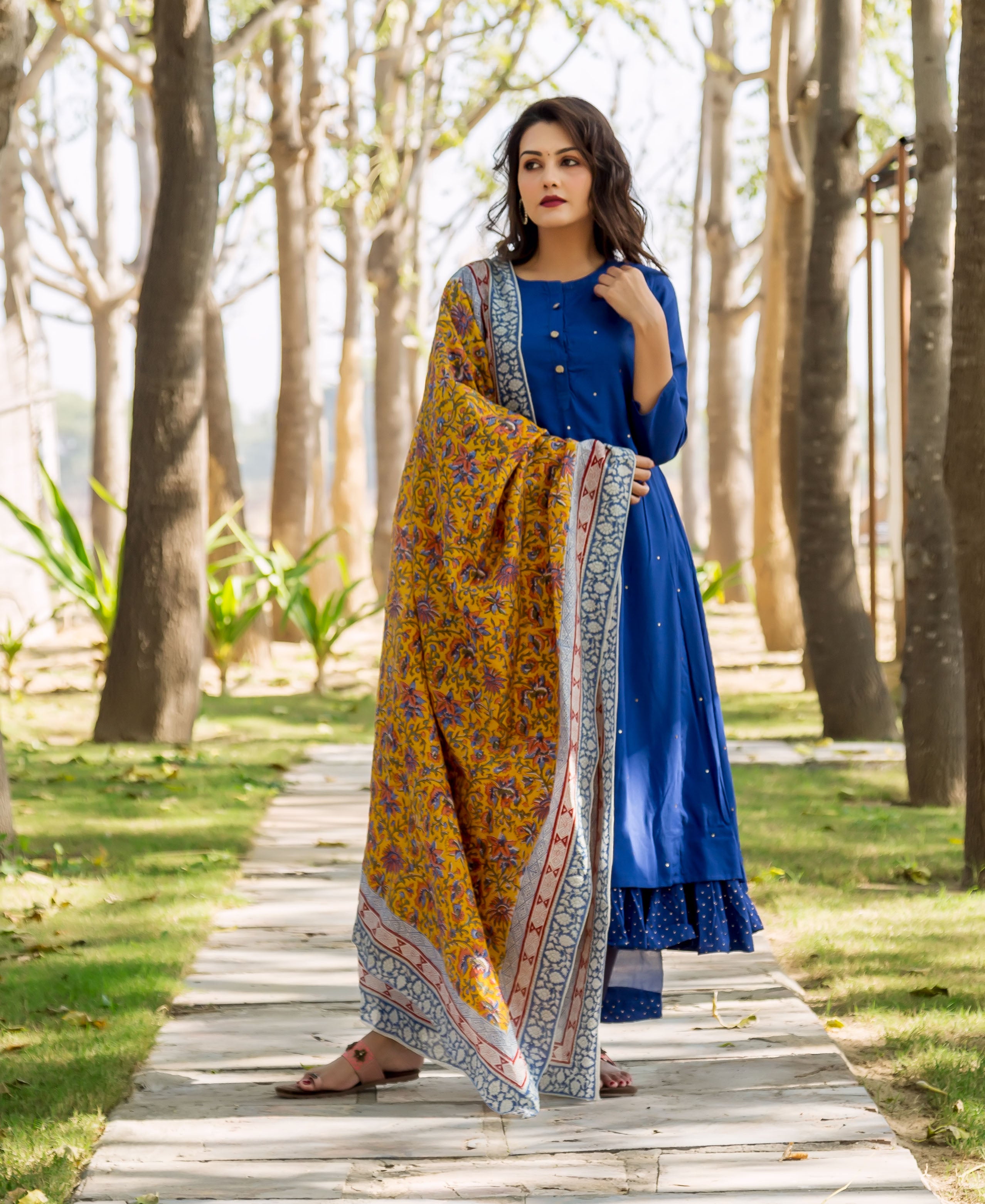 Turkish Blue Hand Block Printed Kurta and Sharara