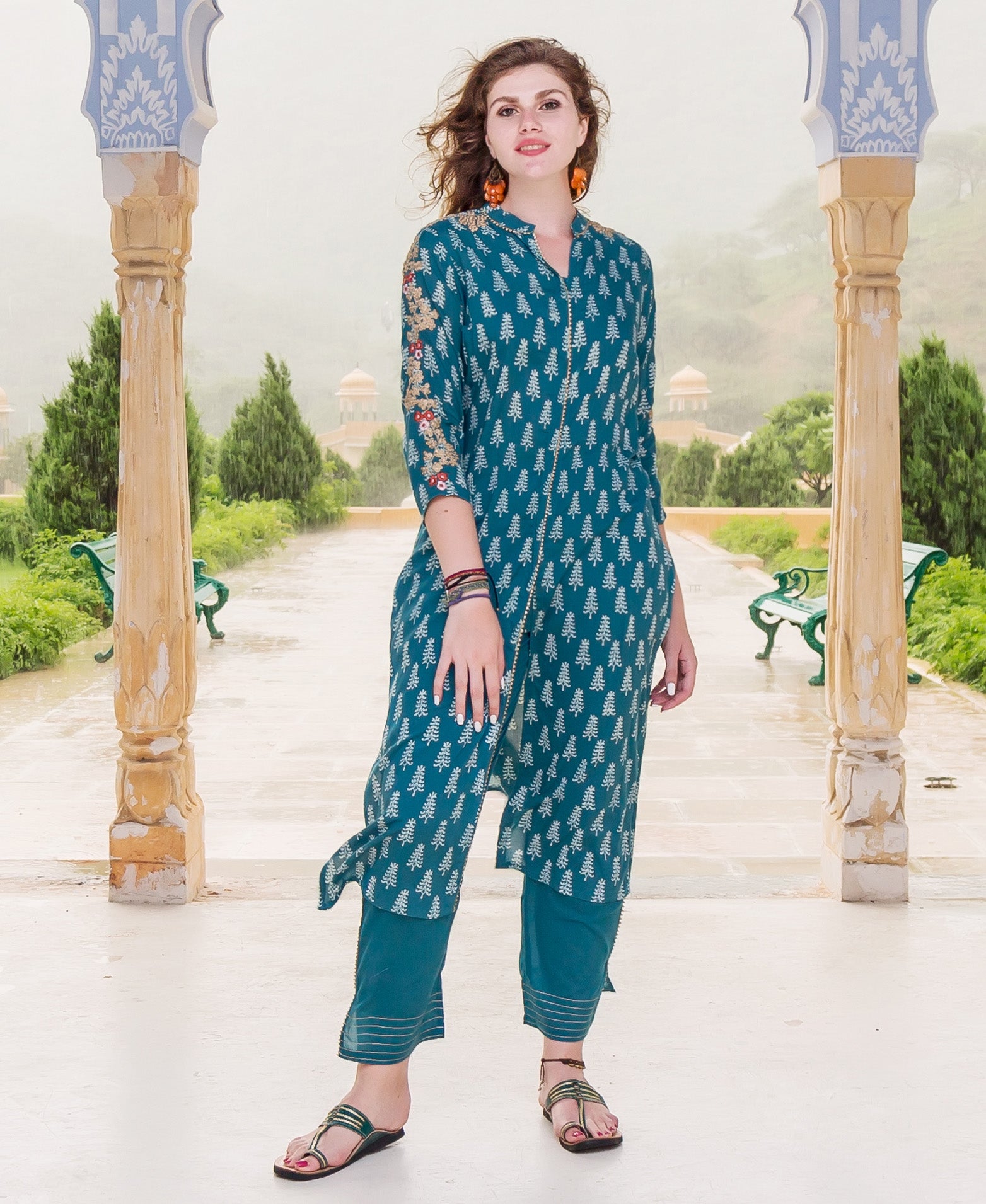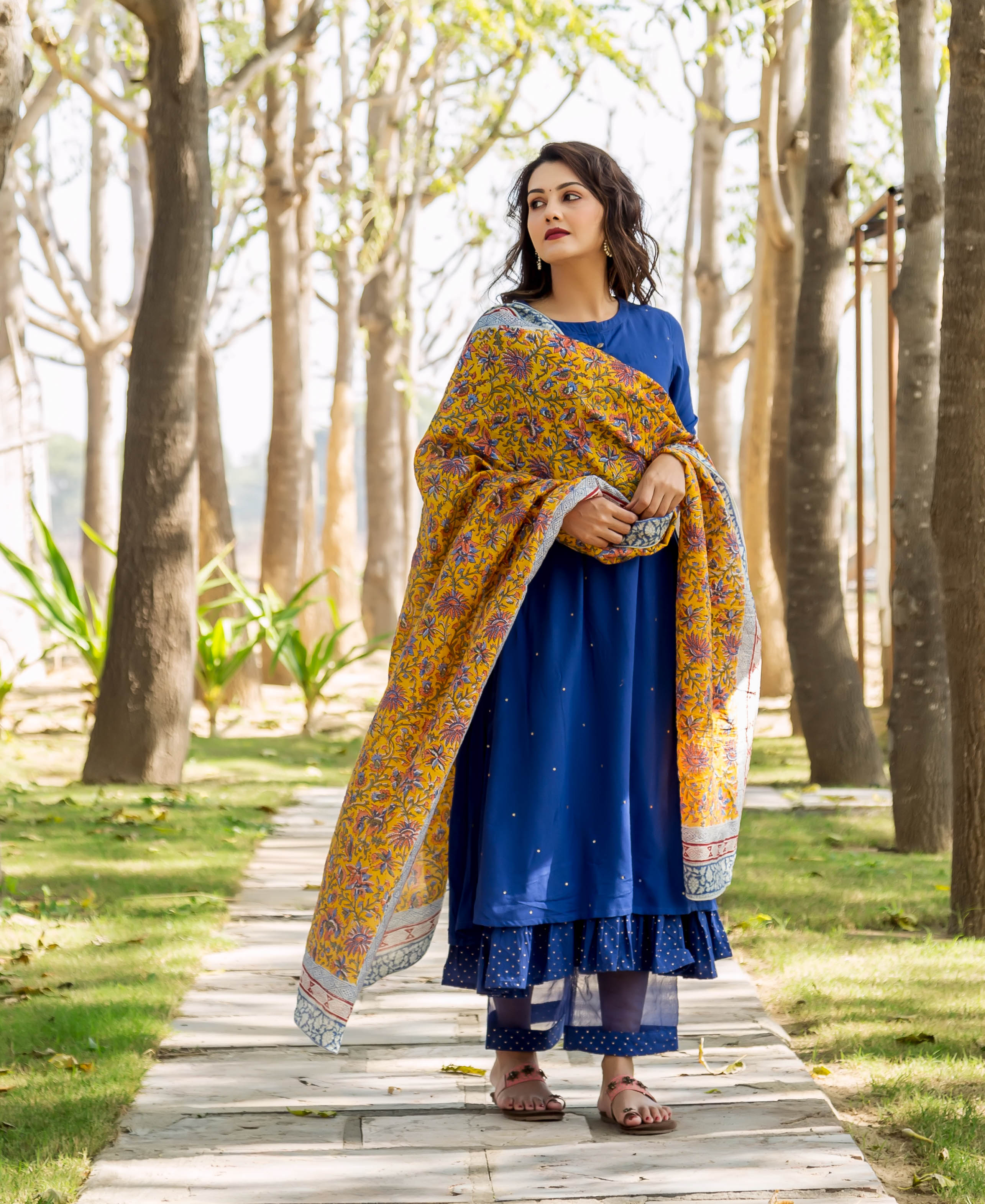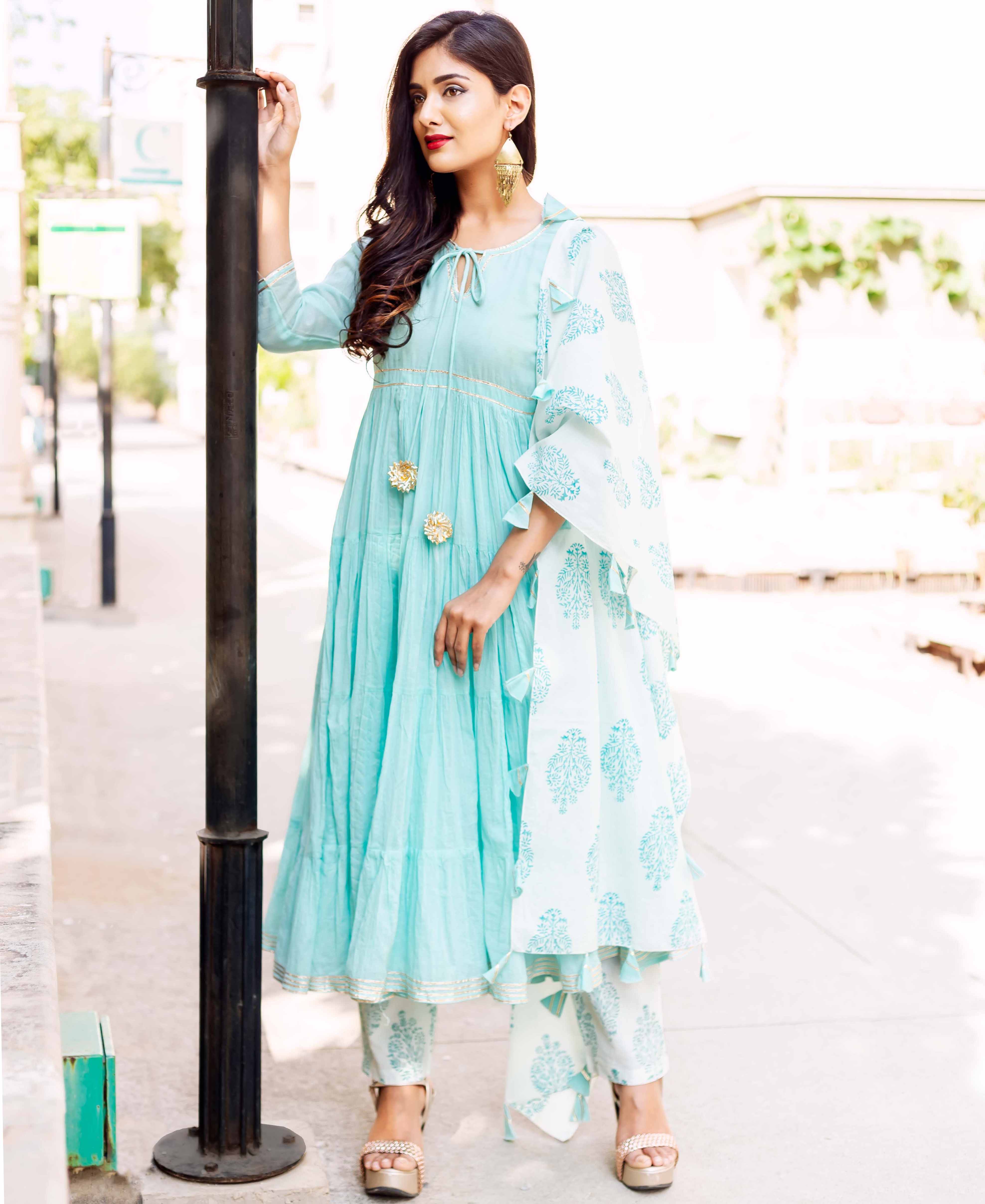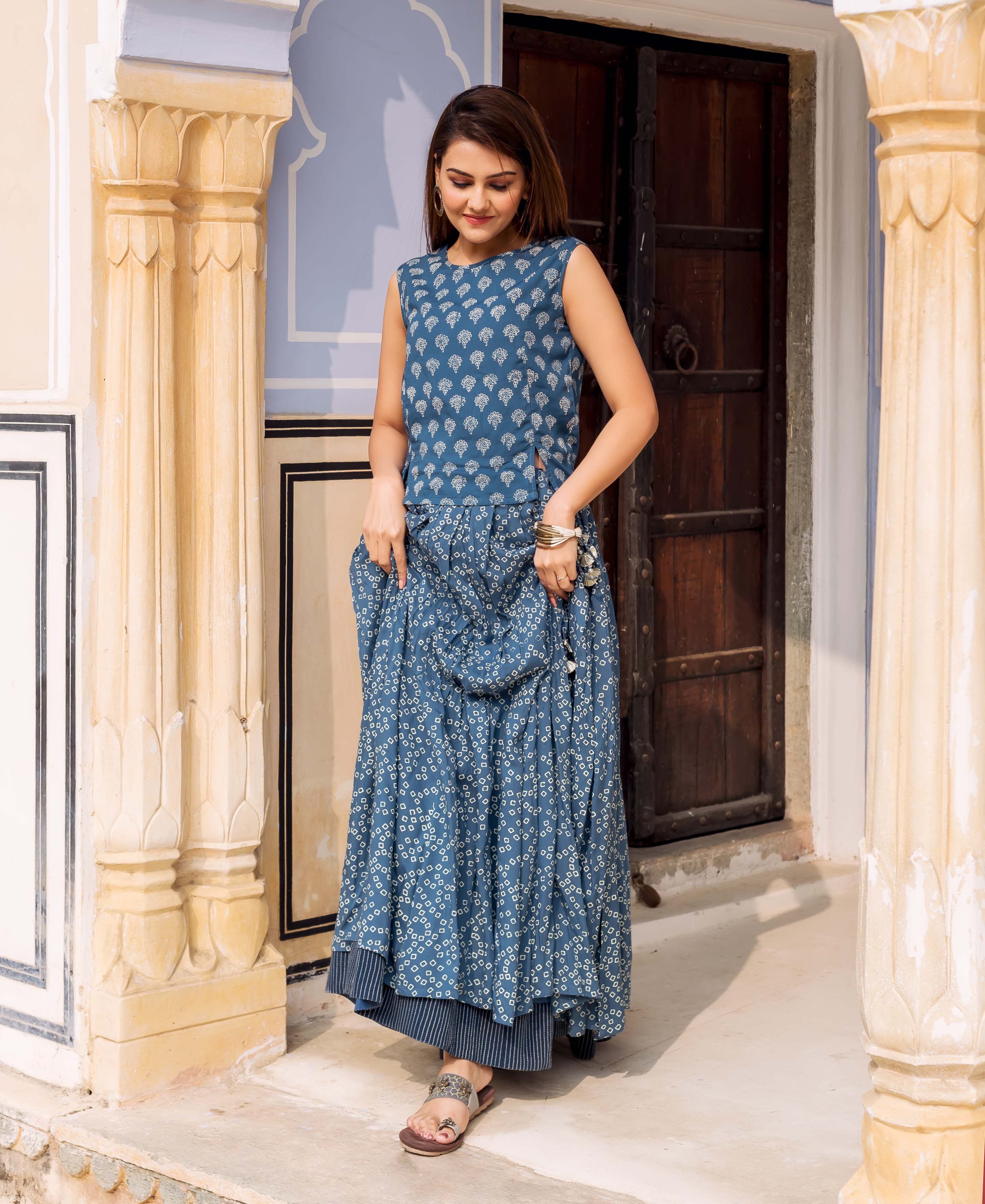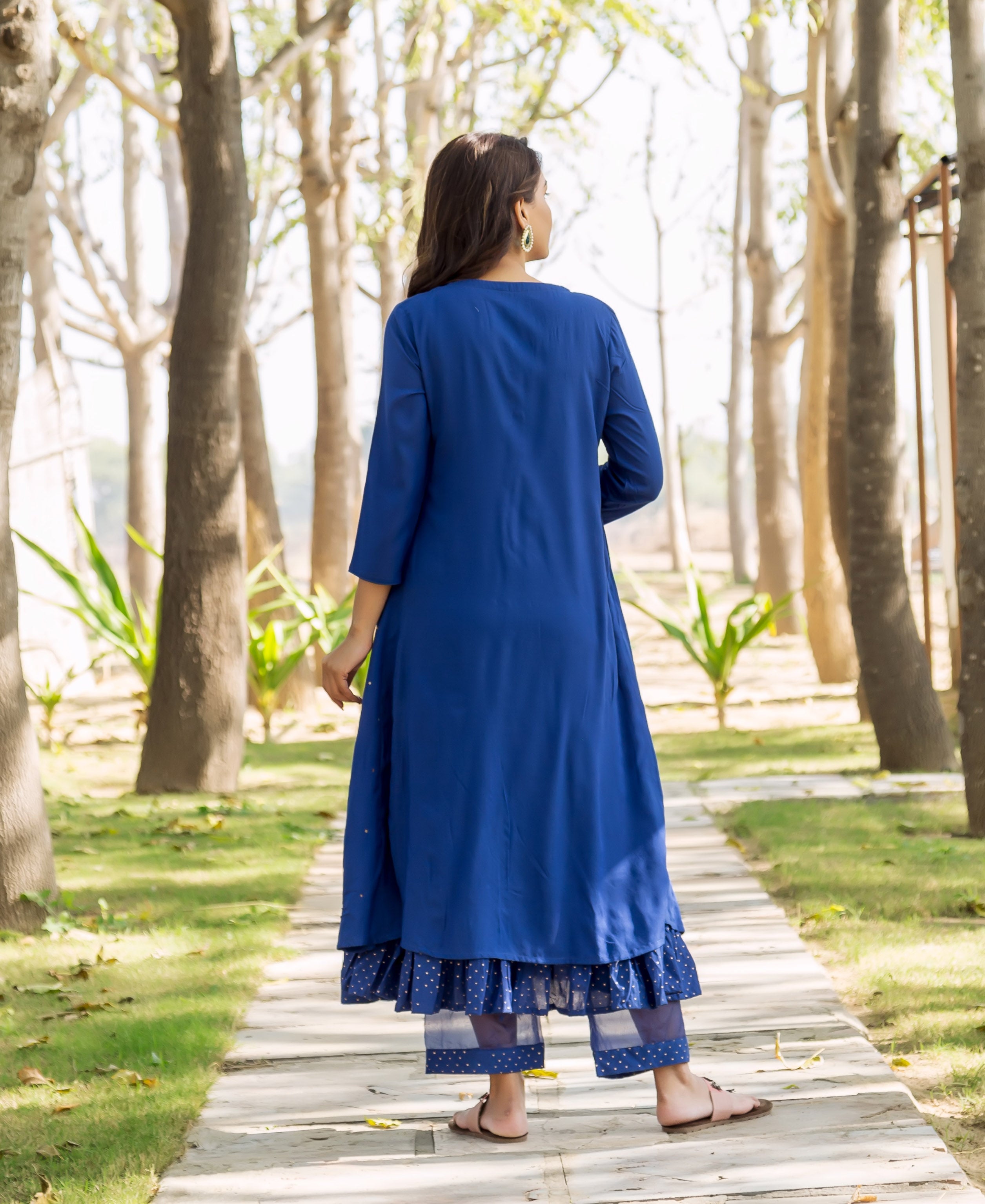 Turkish Blue Hand Block Printed Kurta and Sharara