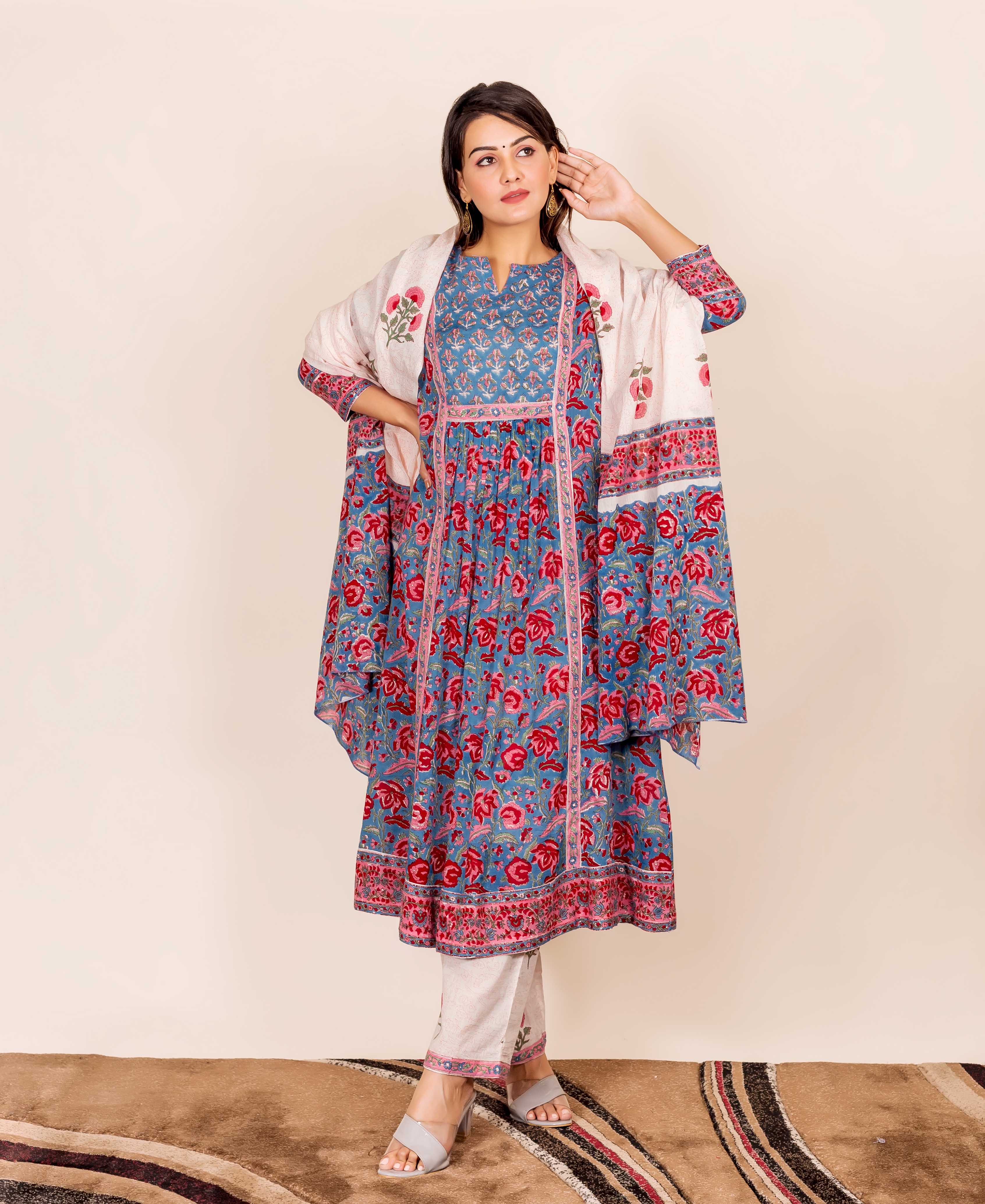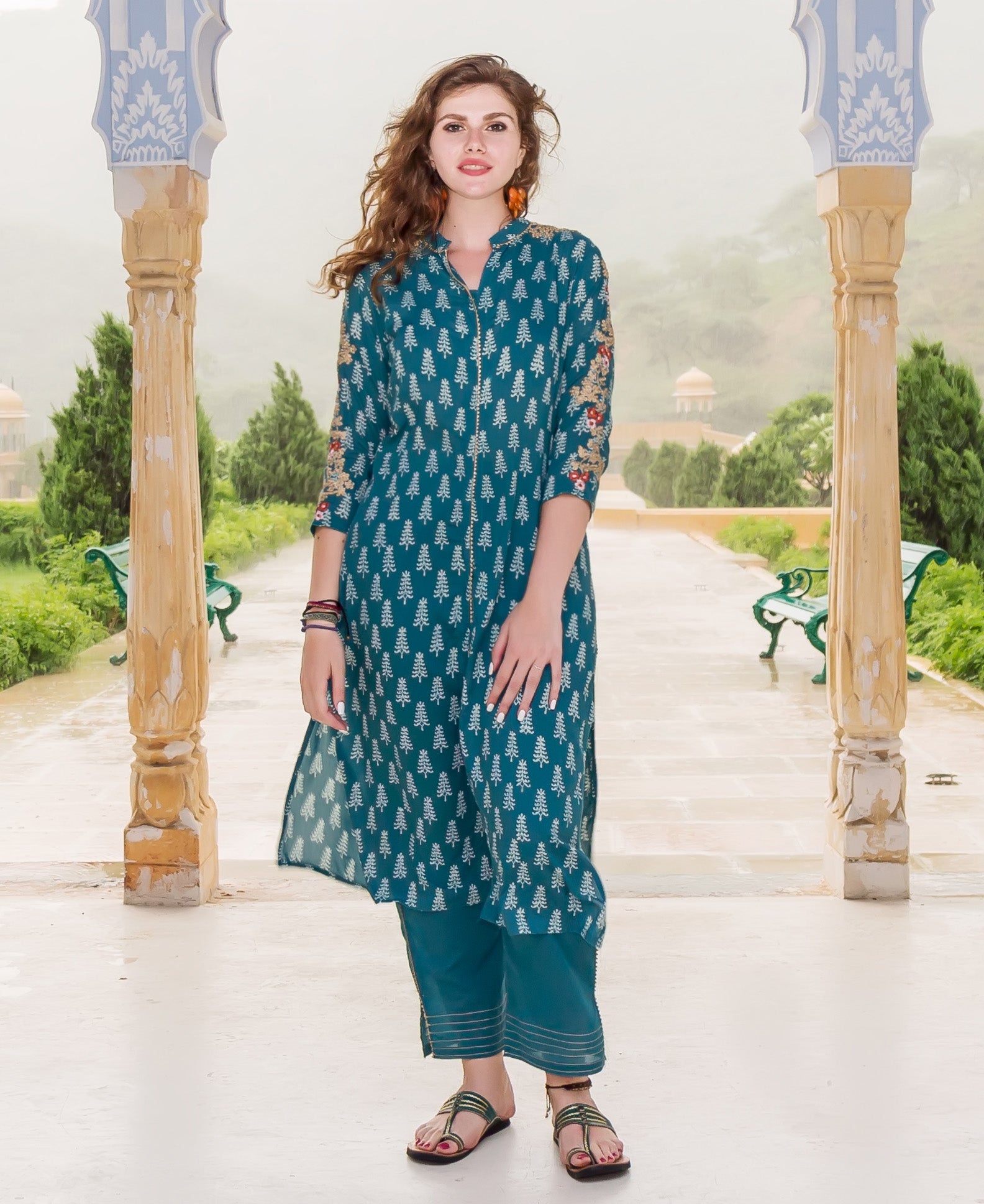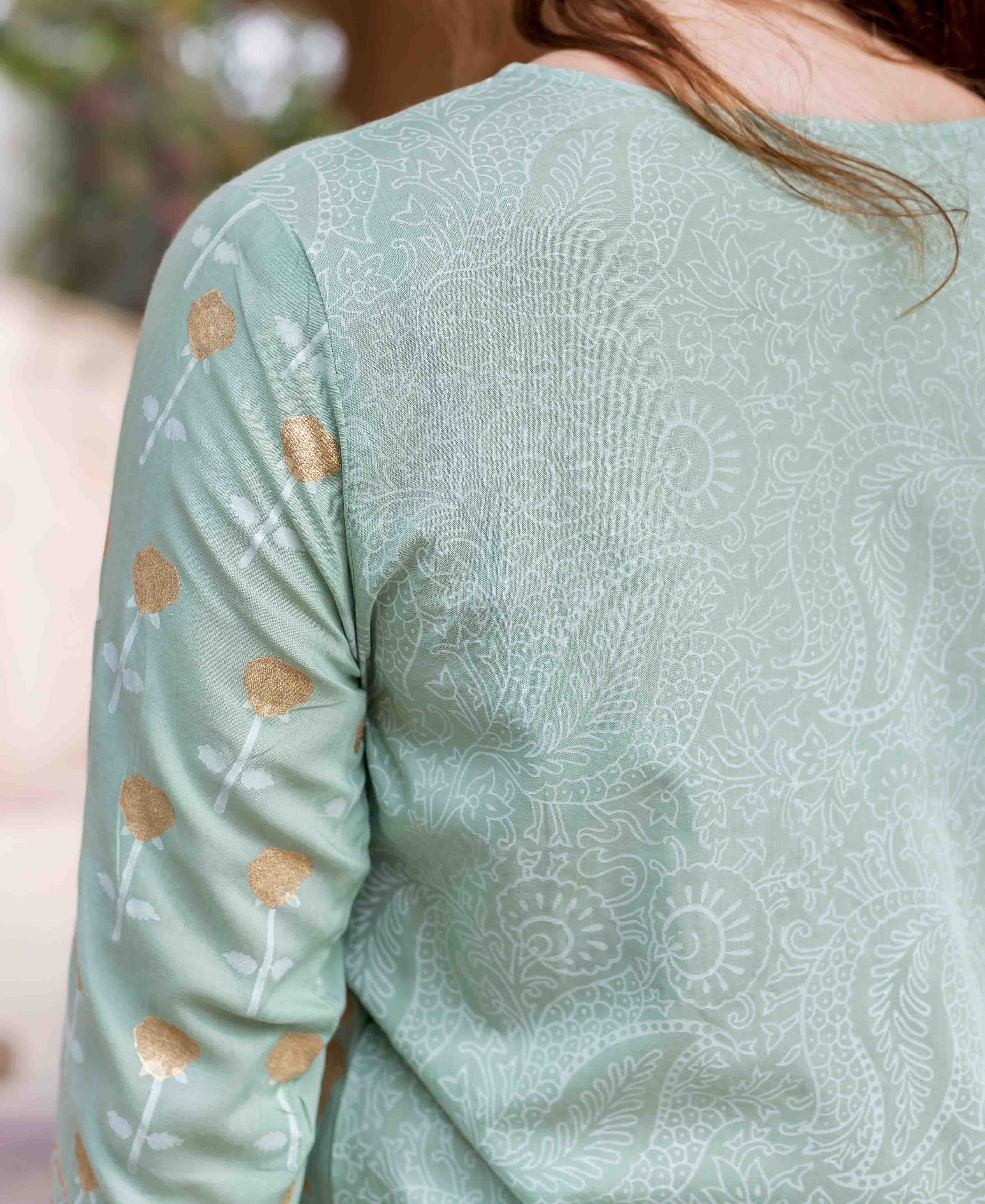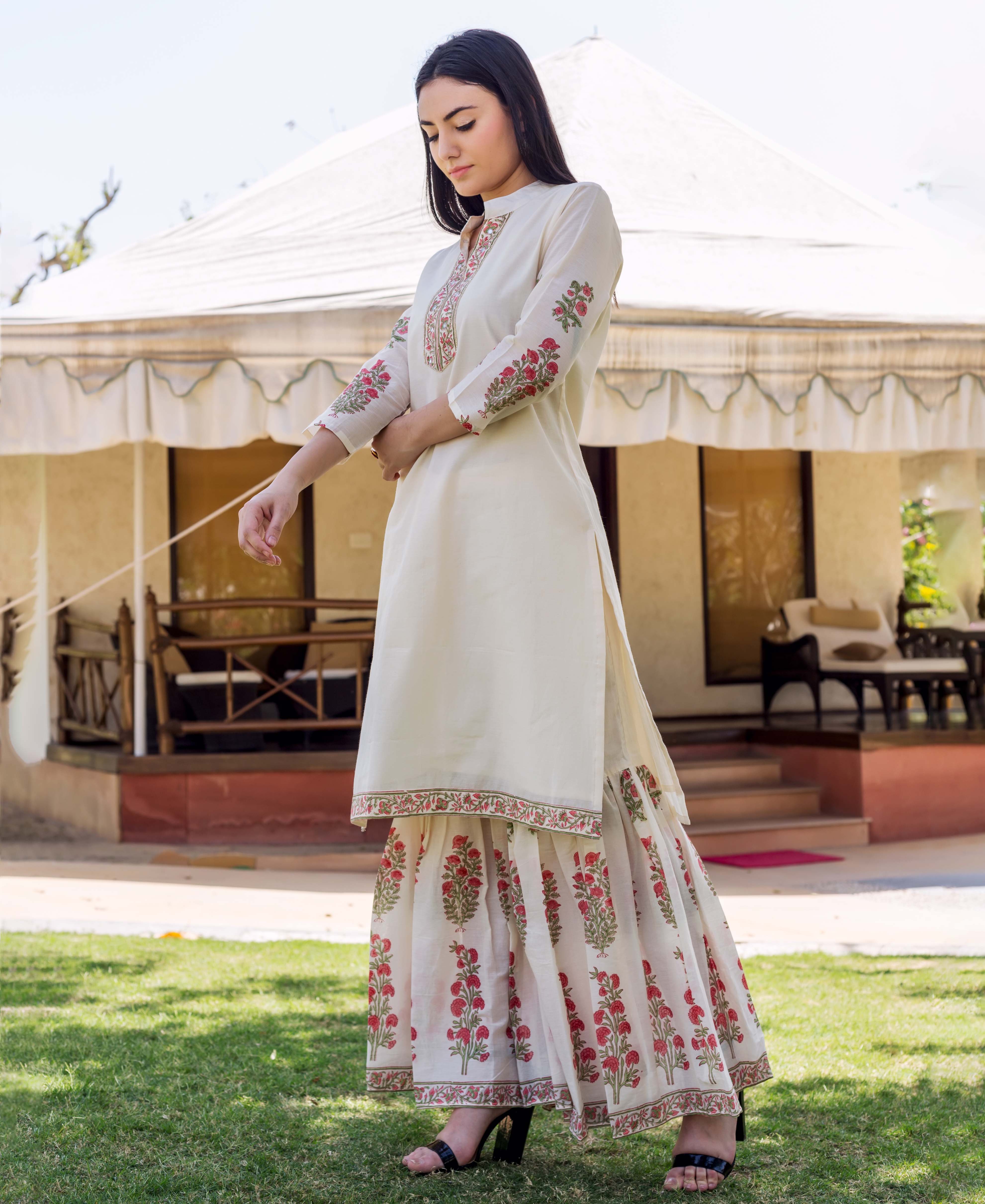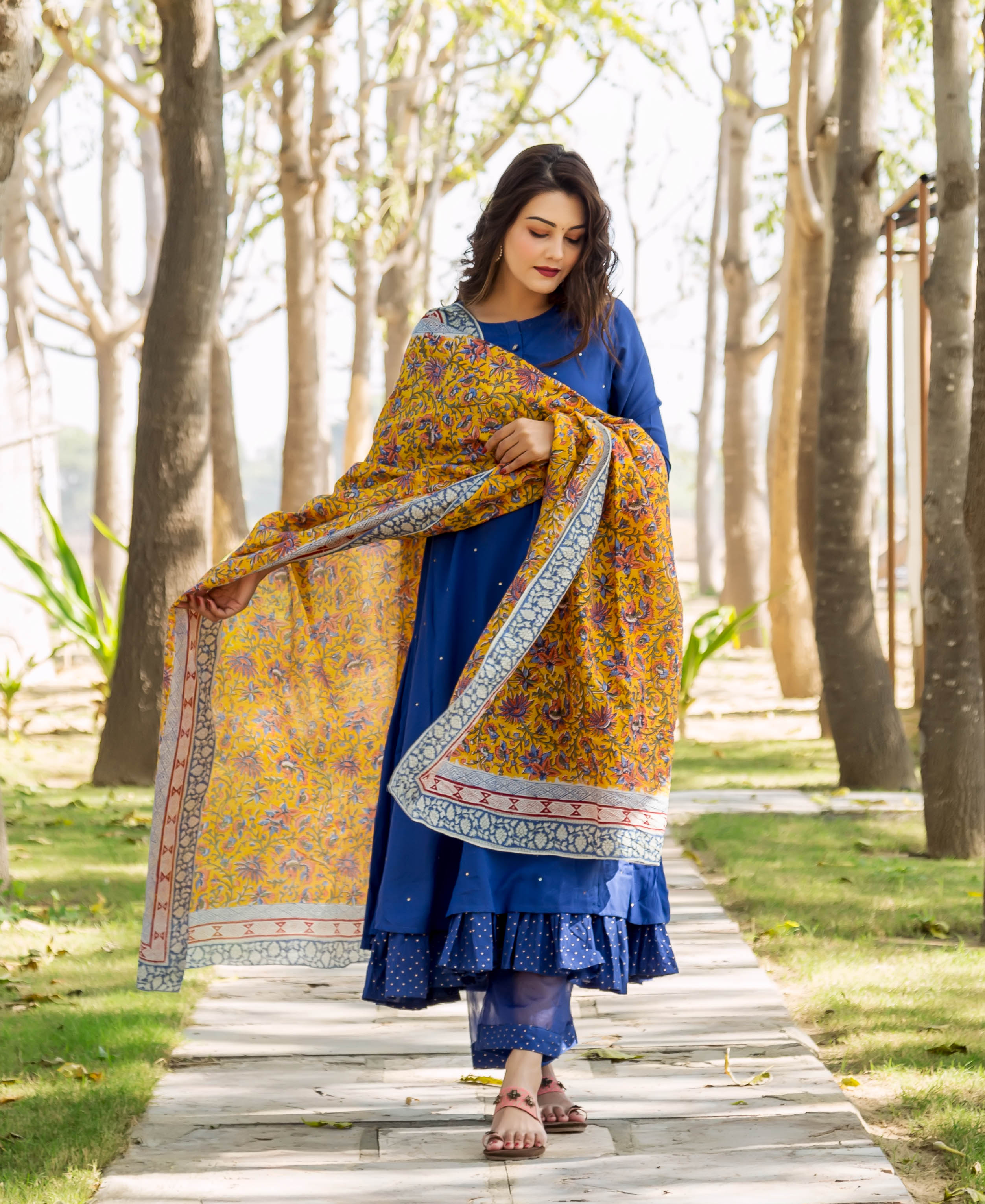 Turkish Blue Hand Block Printed Kurta and Sharara