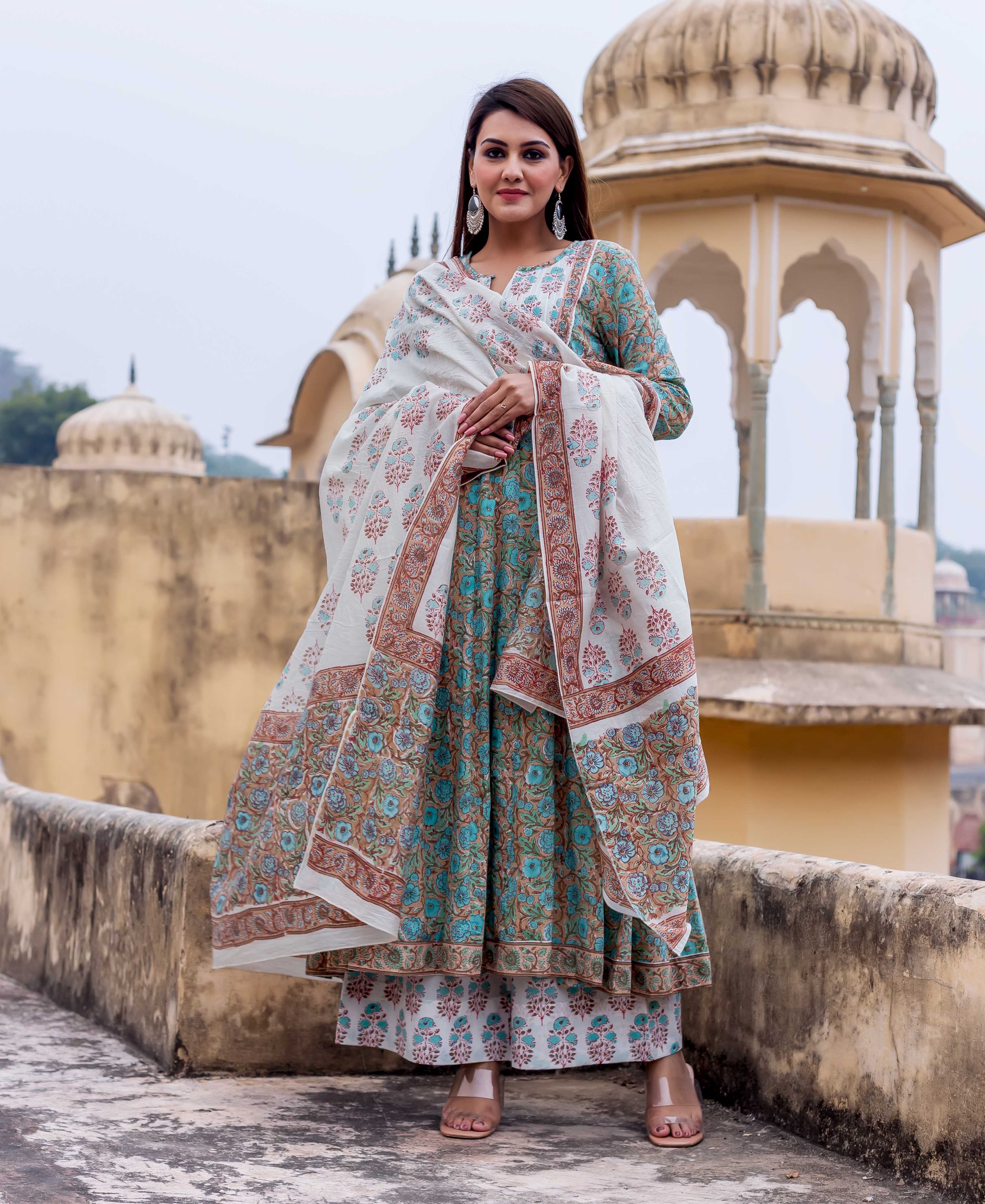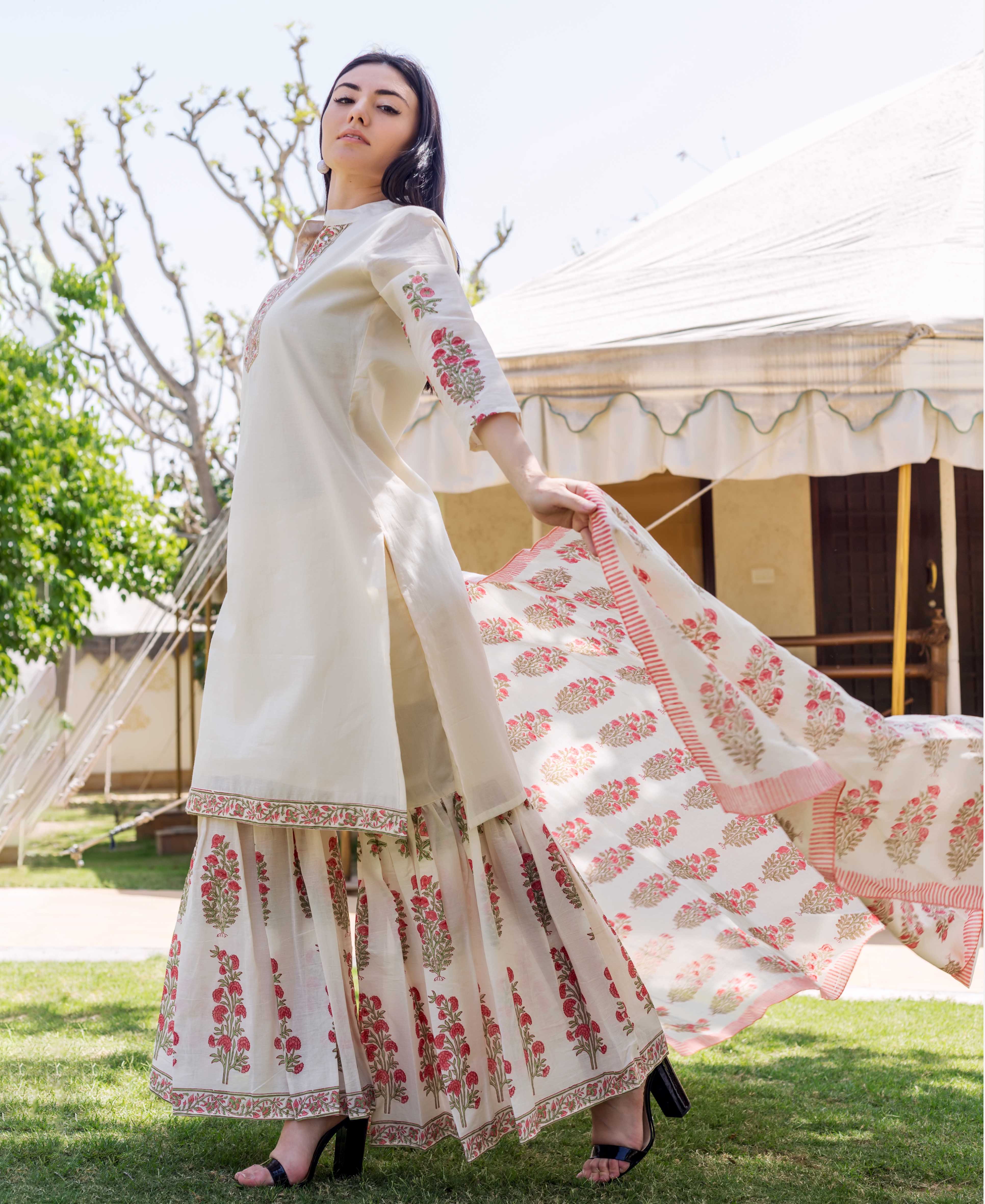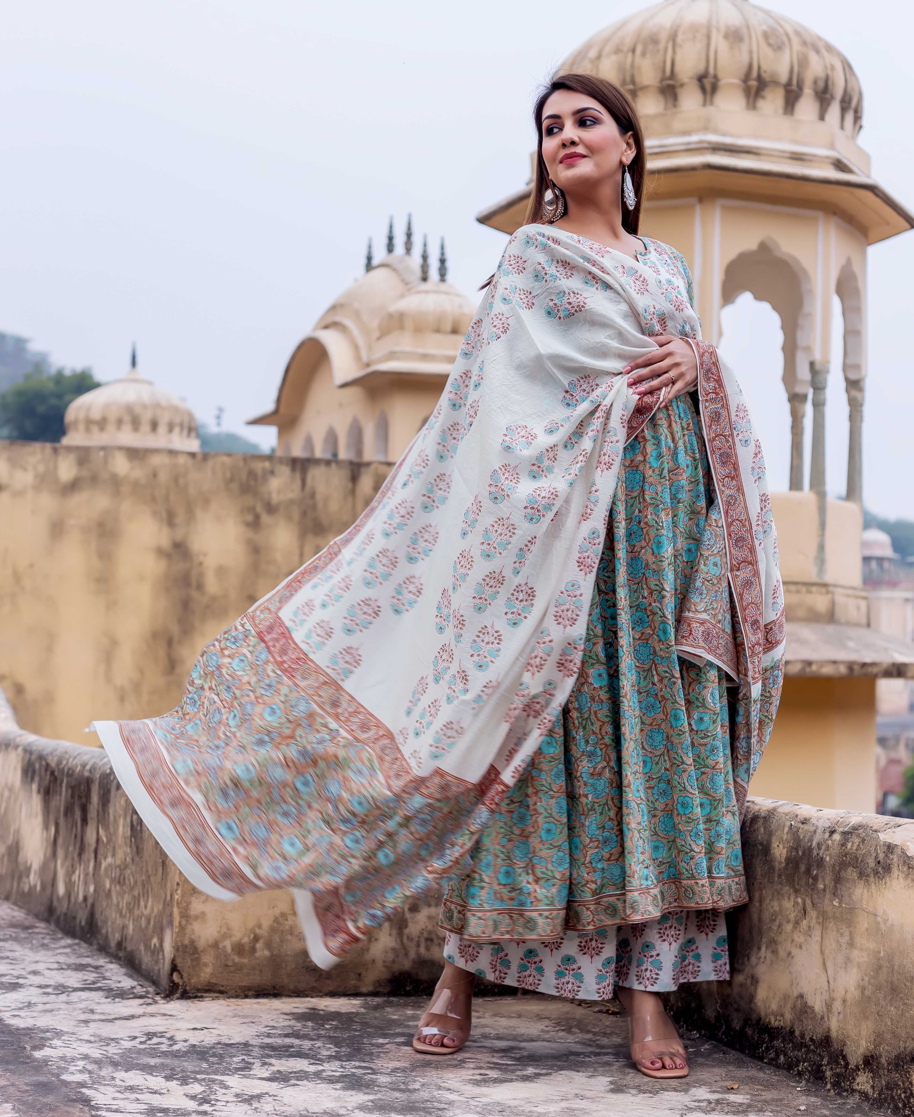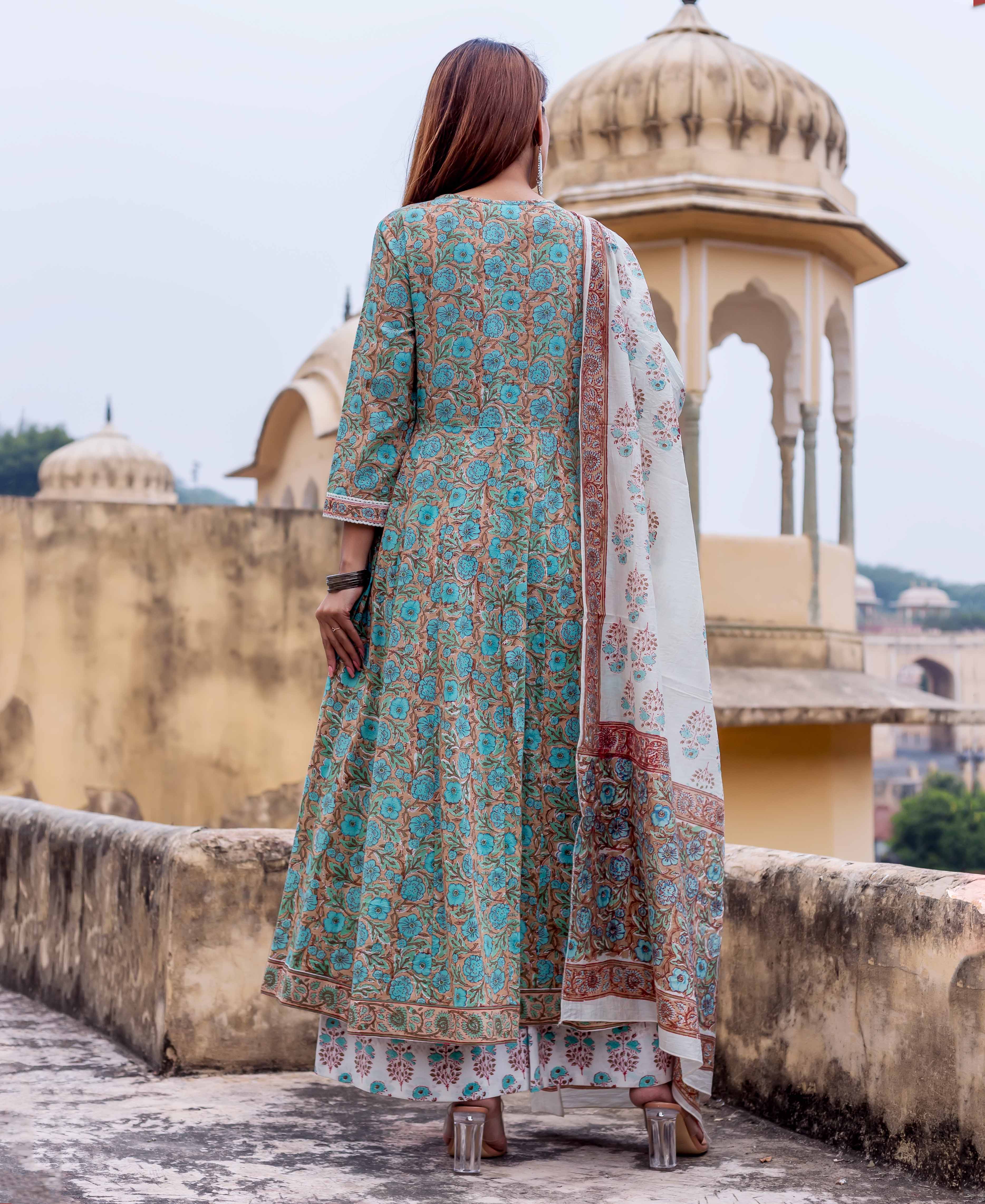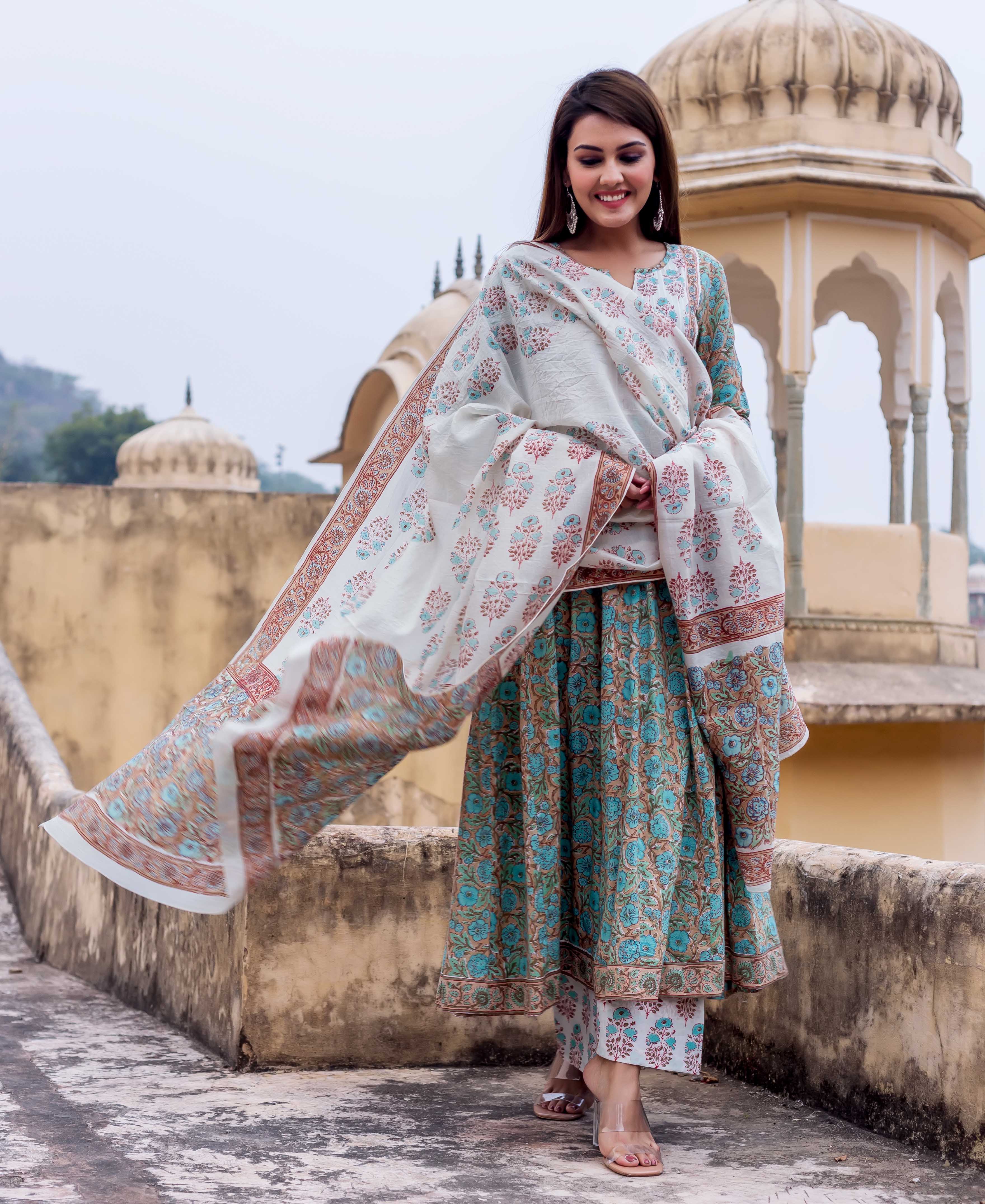 Turkish Blue Hand Block Printed Kurta and Sharara