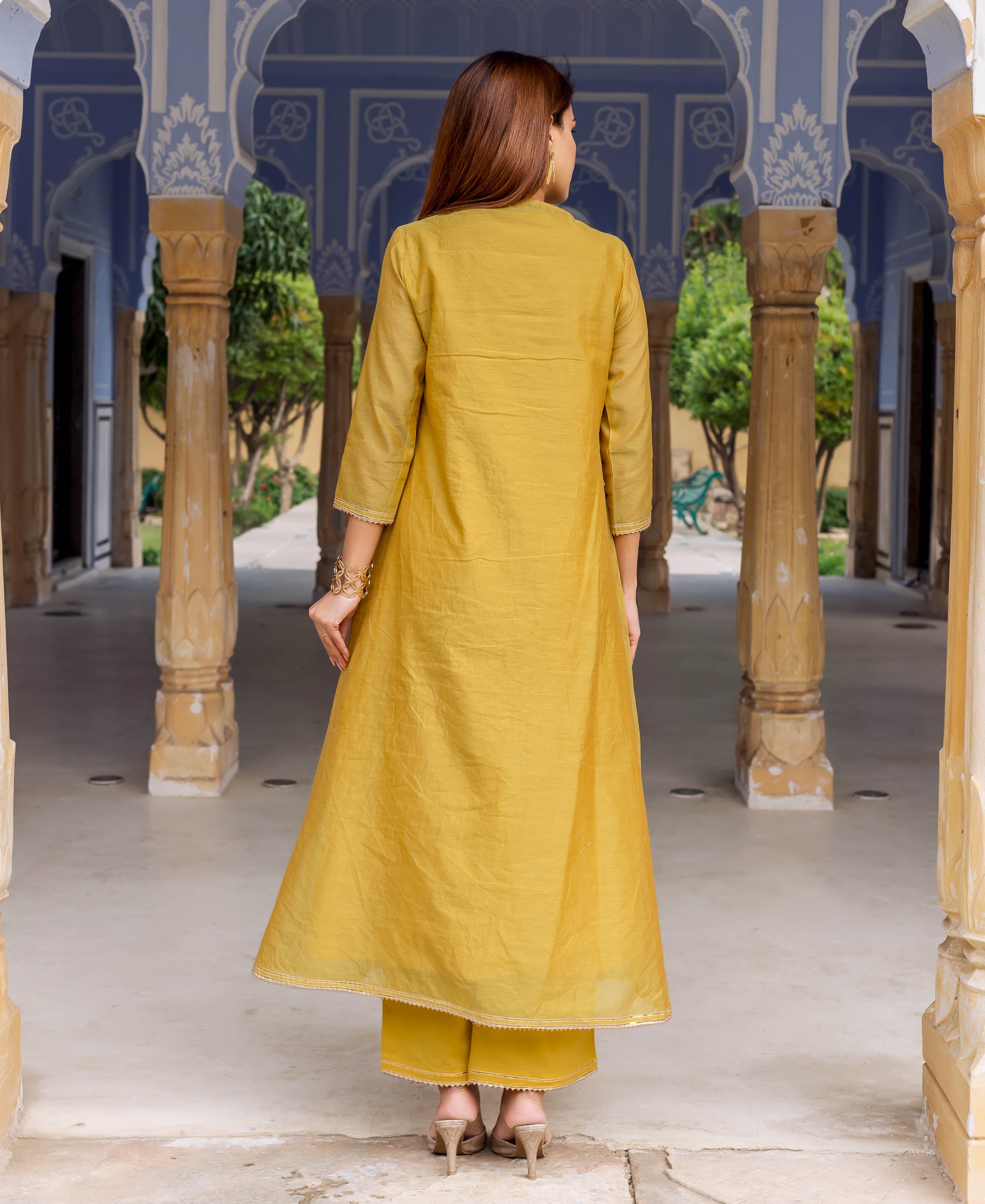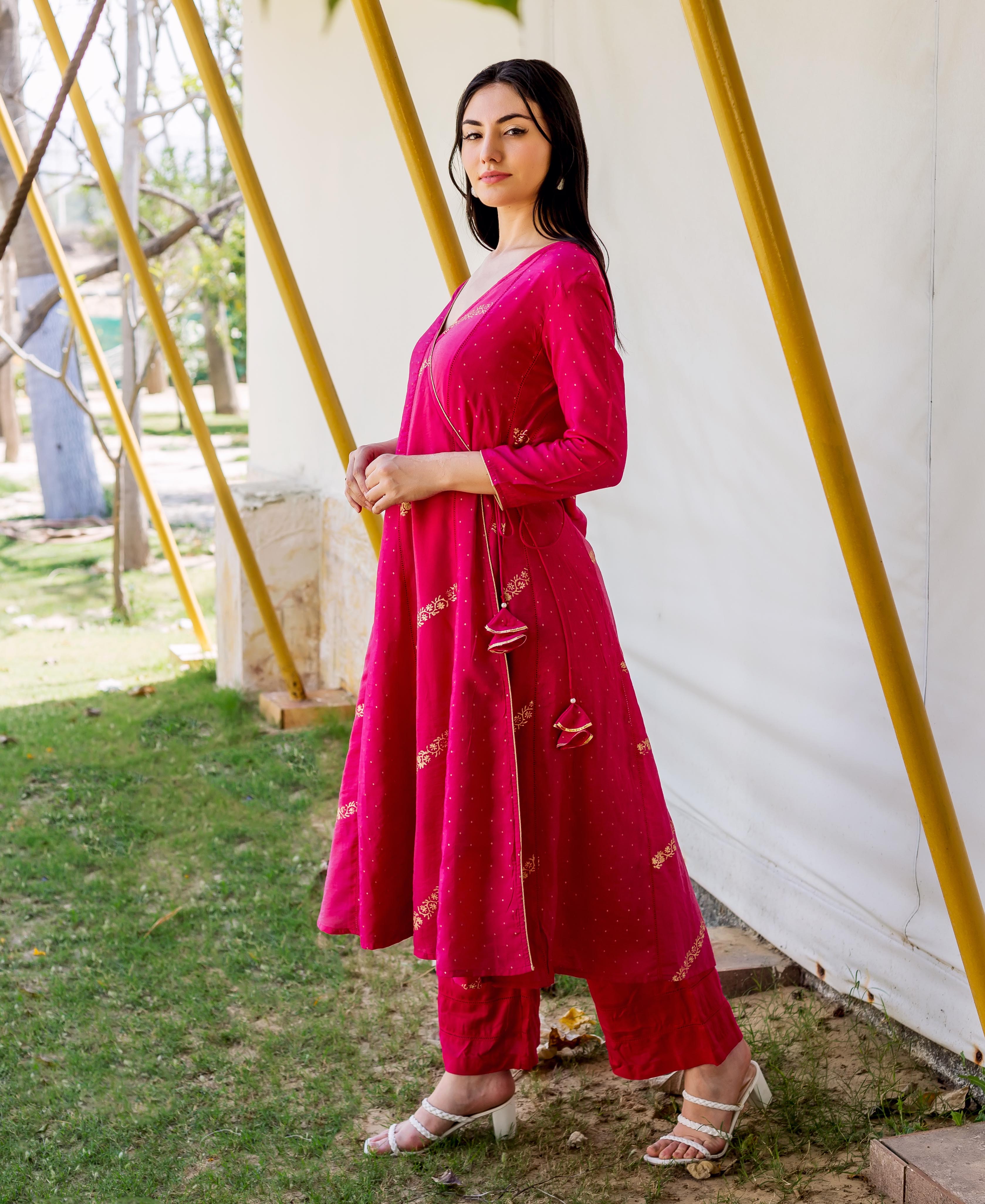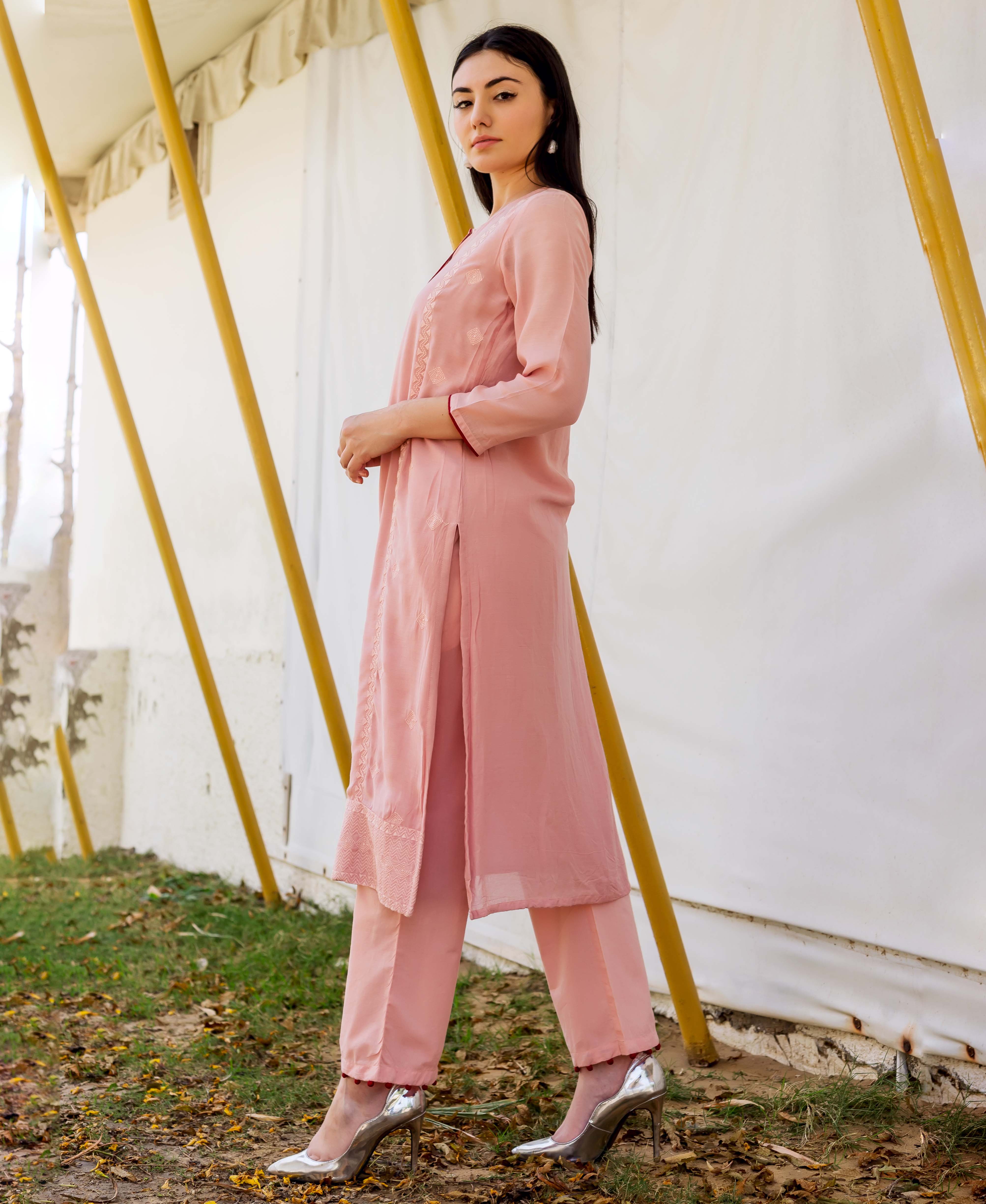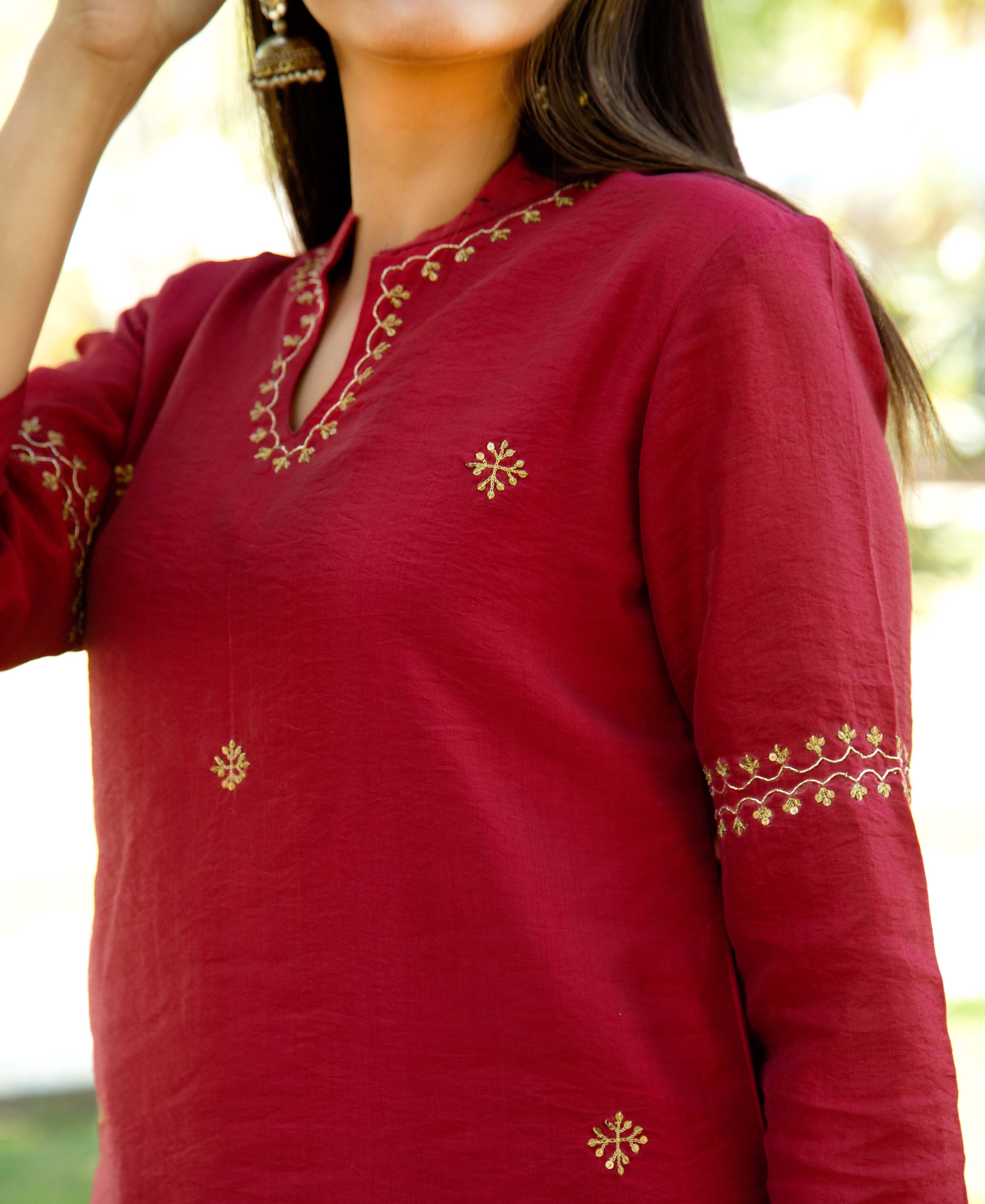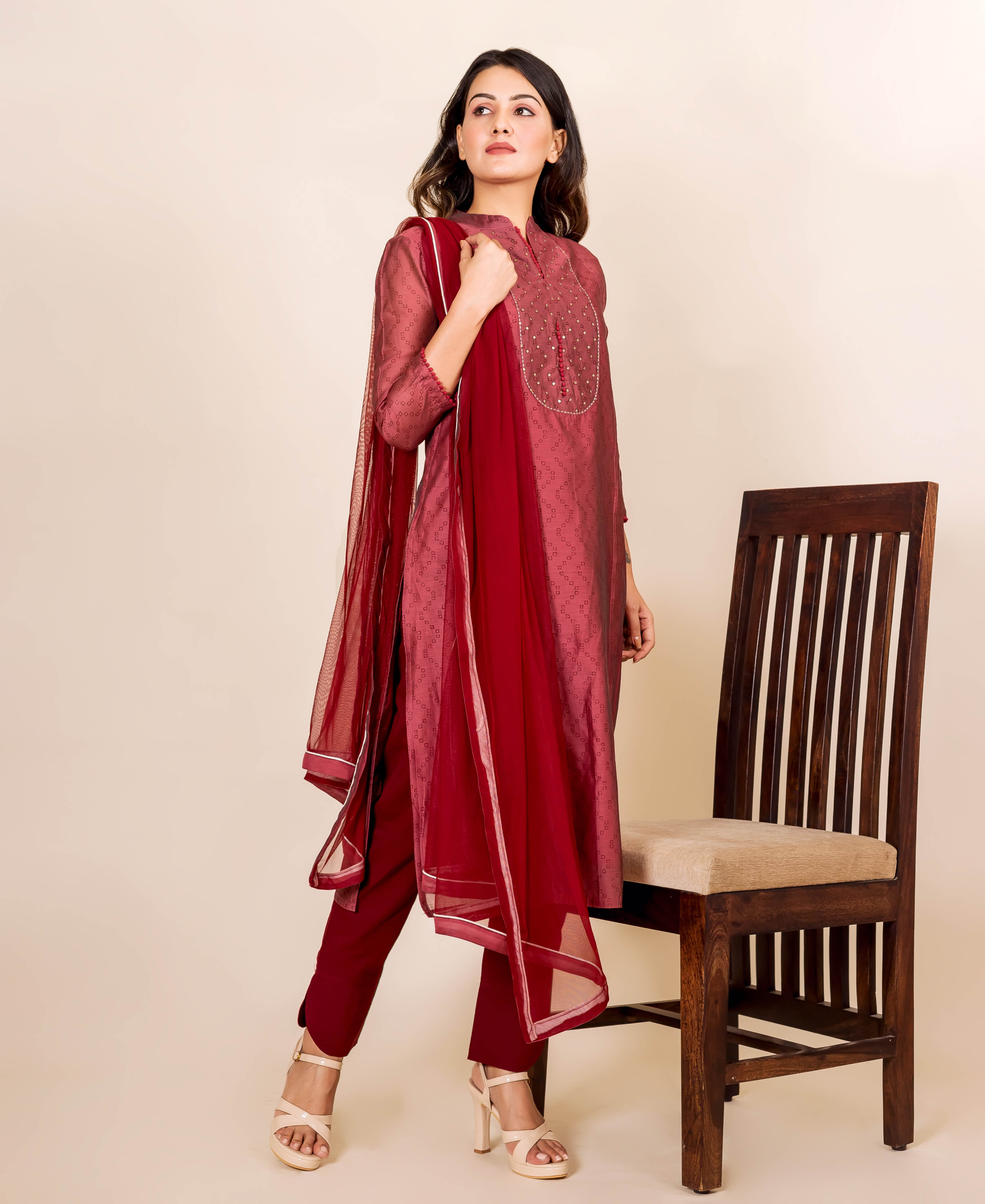 Split Neck Embroidered Chanderi Indo Western Kurta