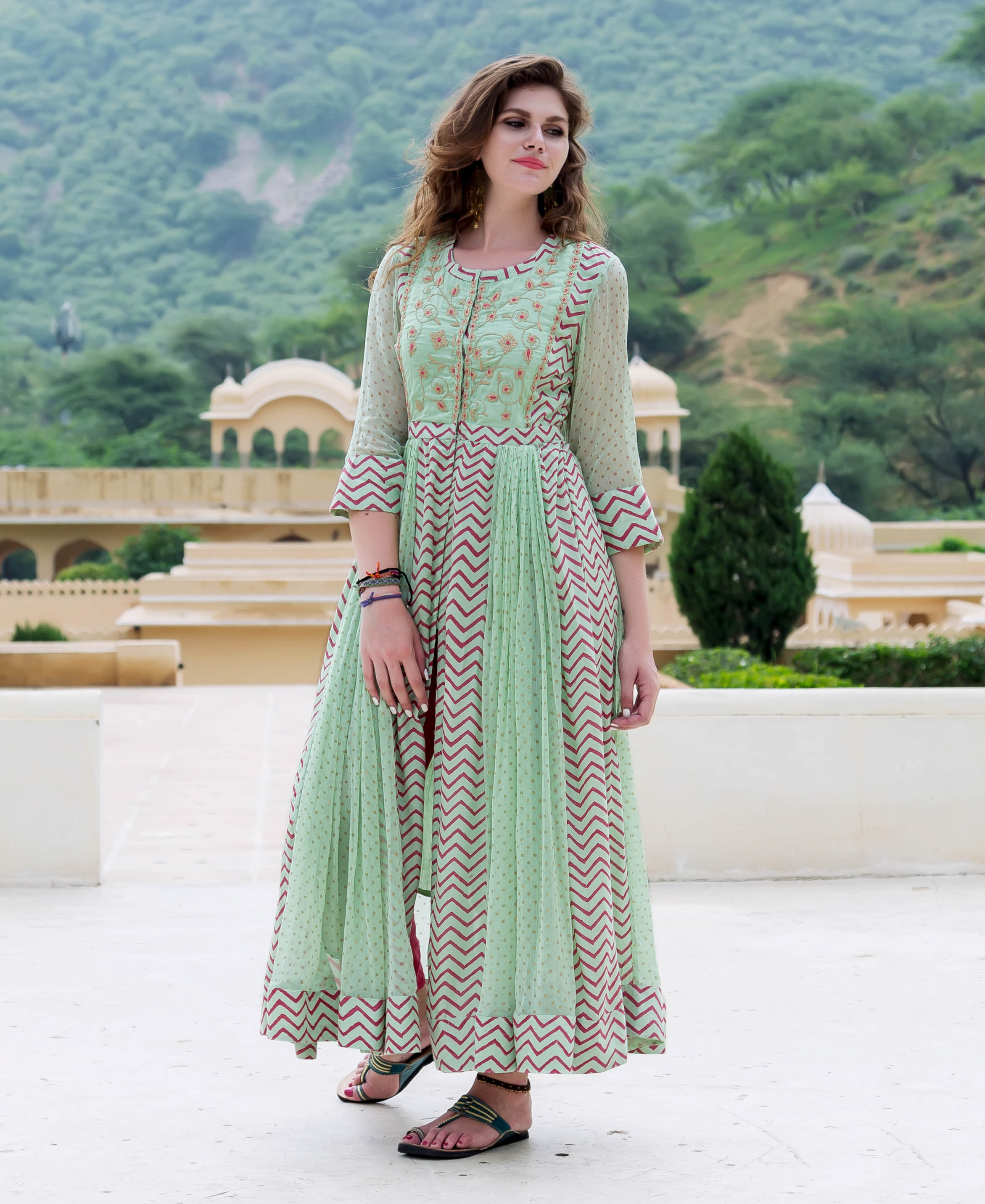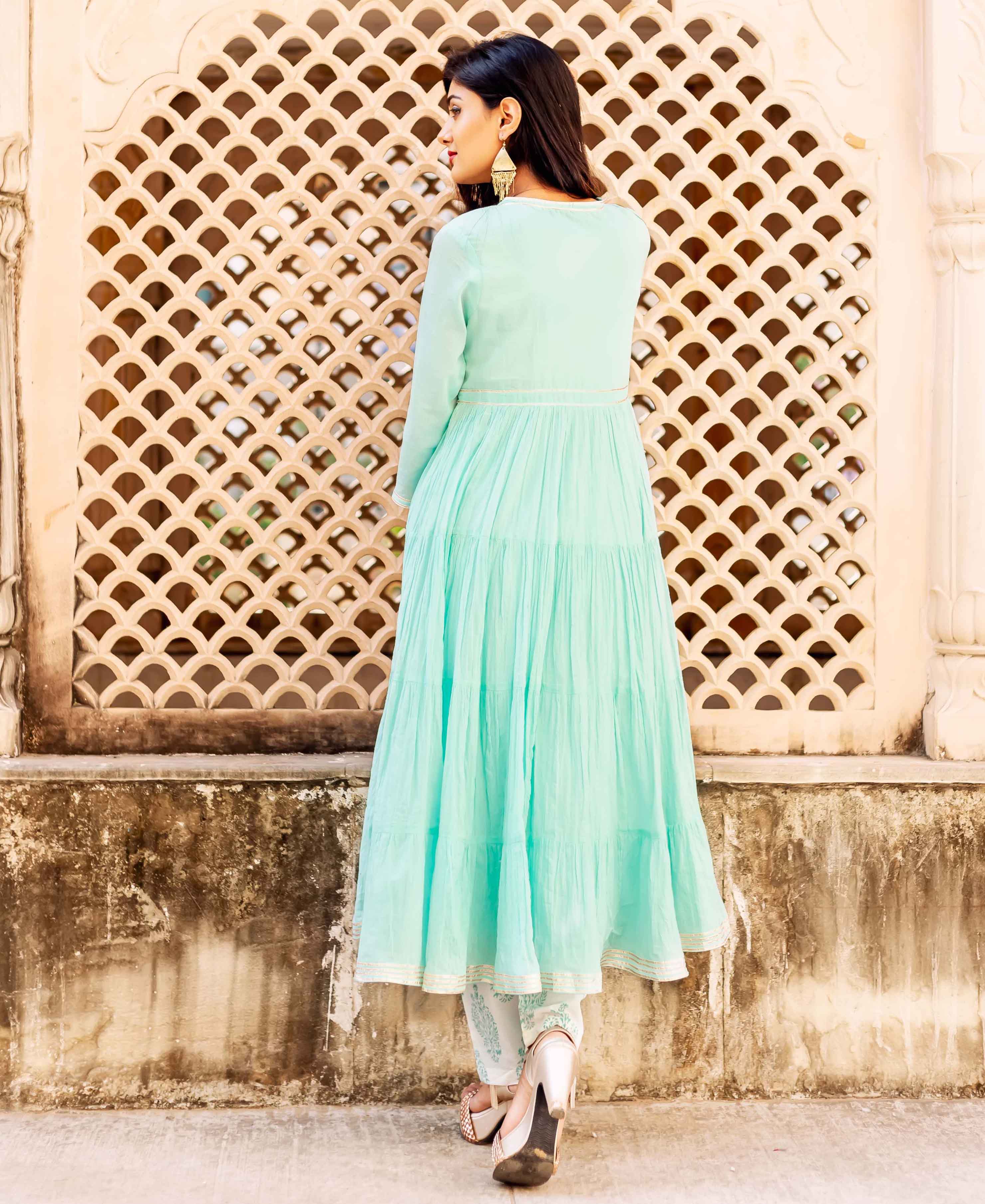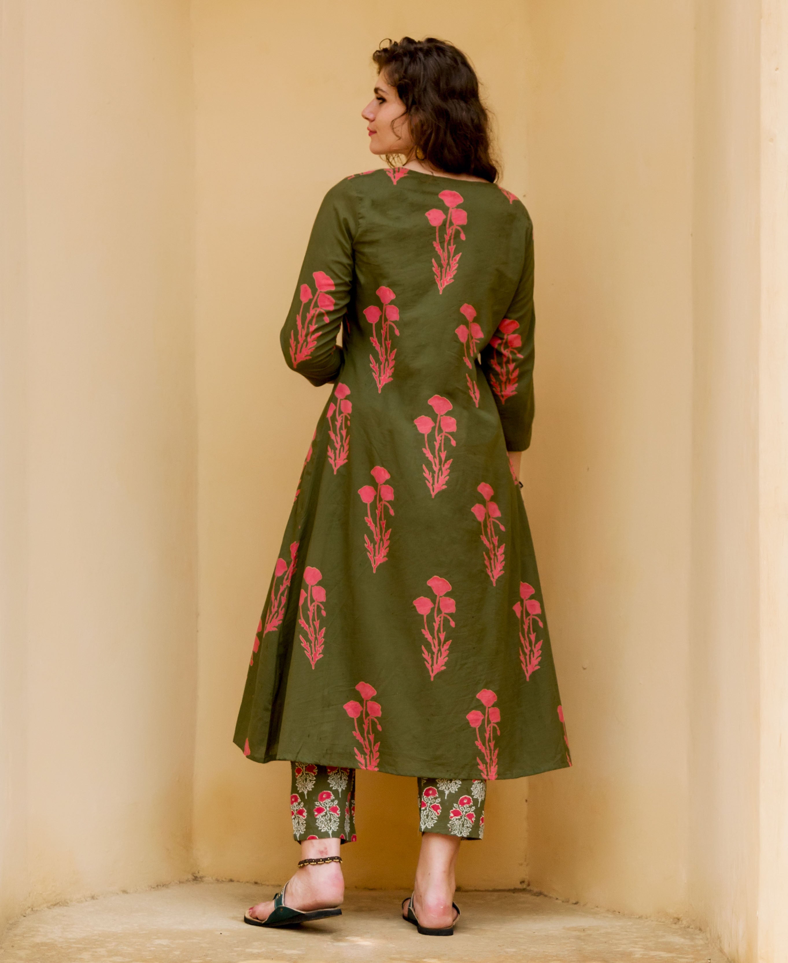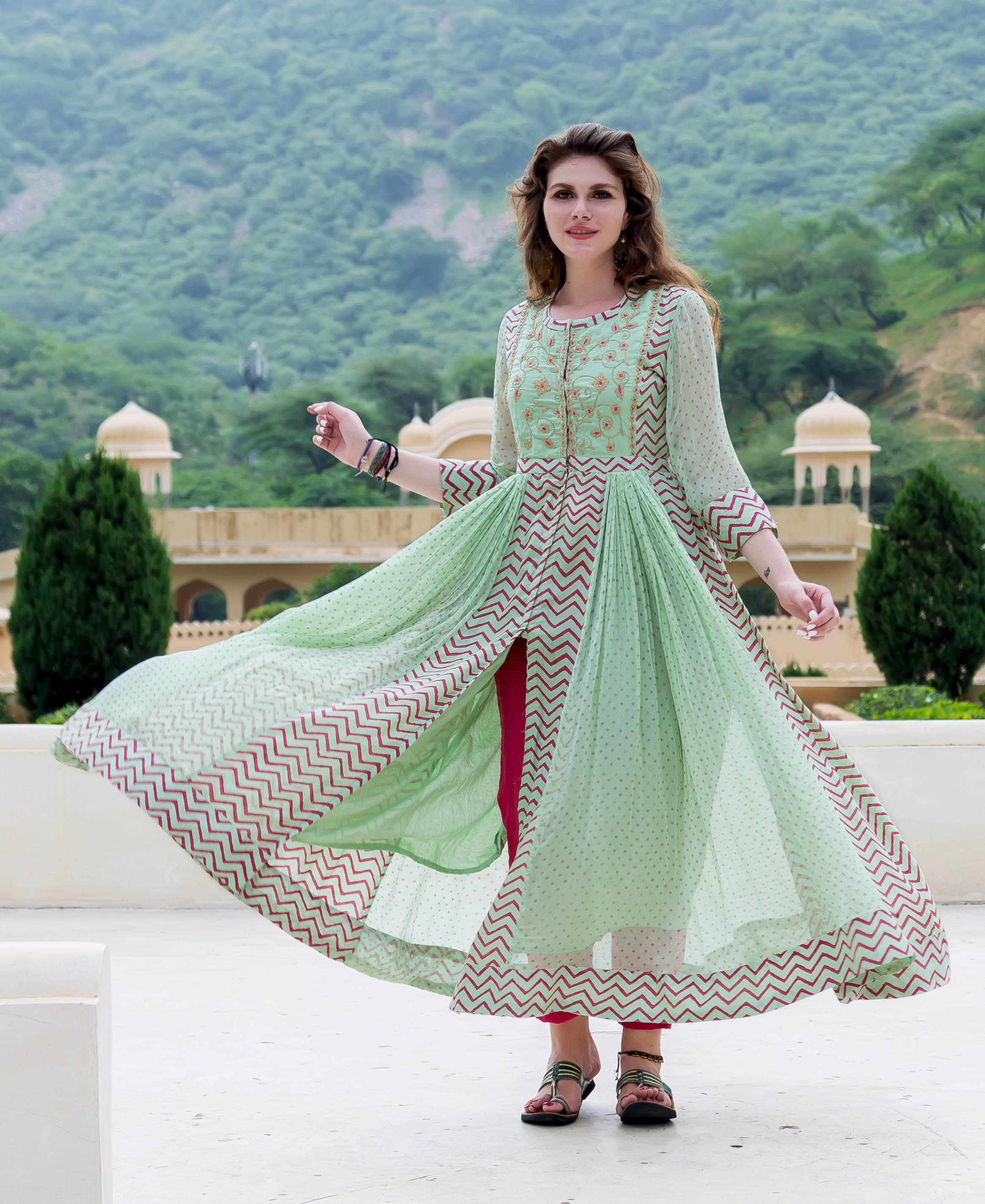 Lime Green Hand Block Printed and Embroidered Anarkali Kurta