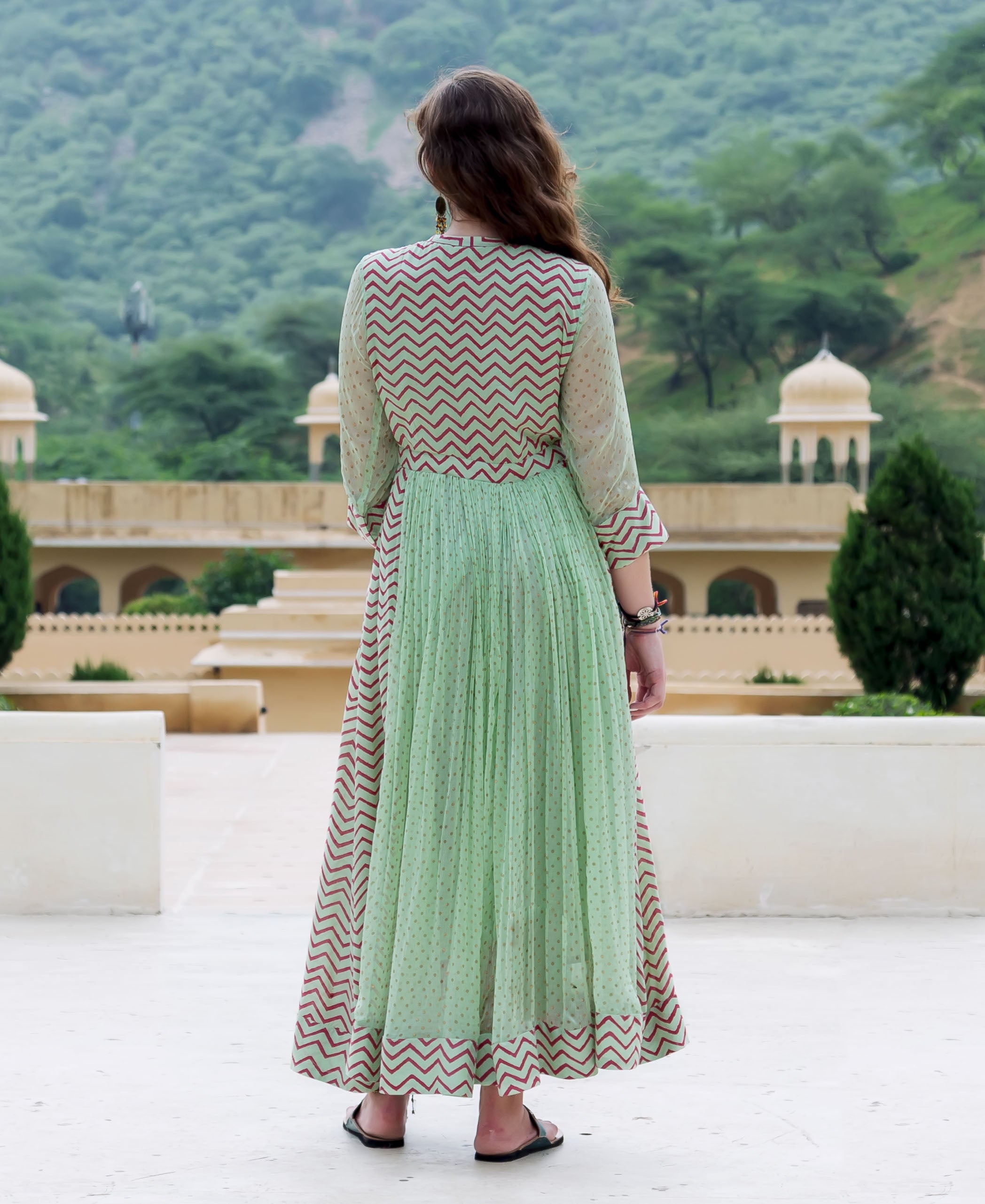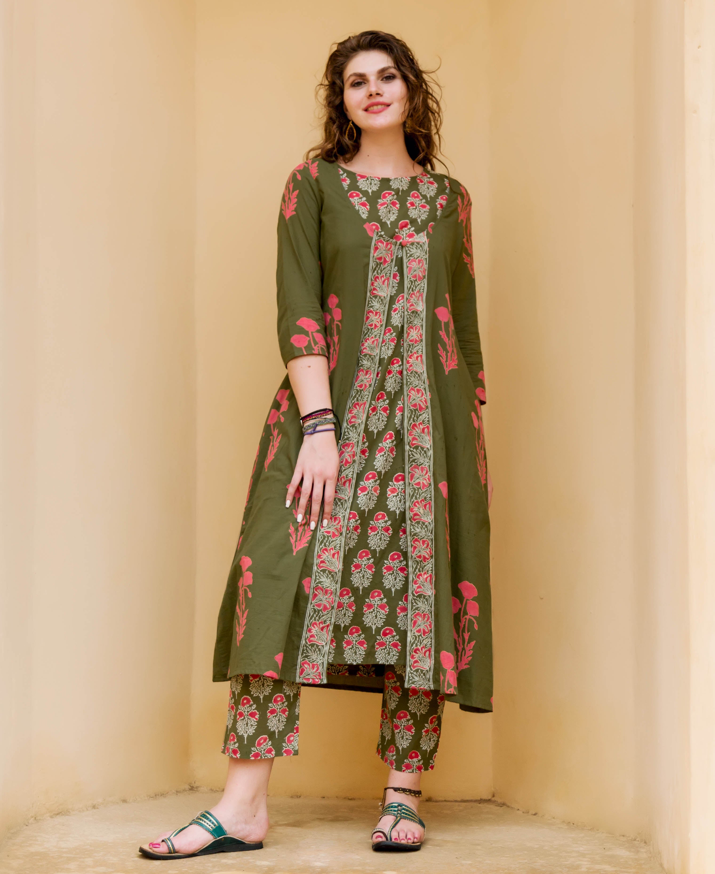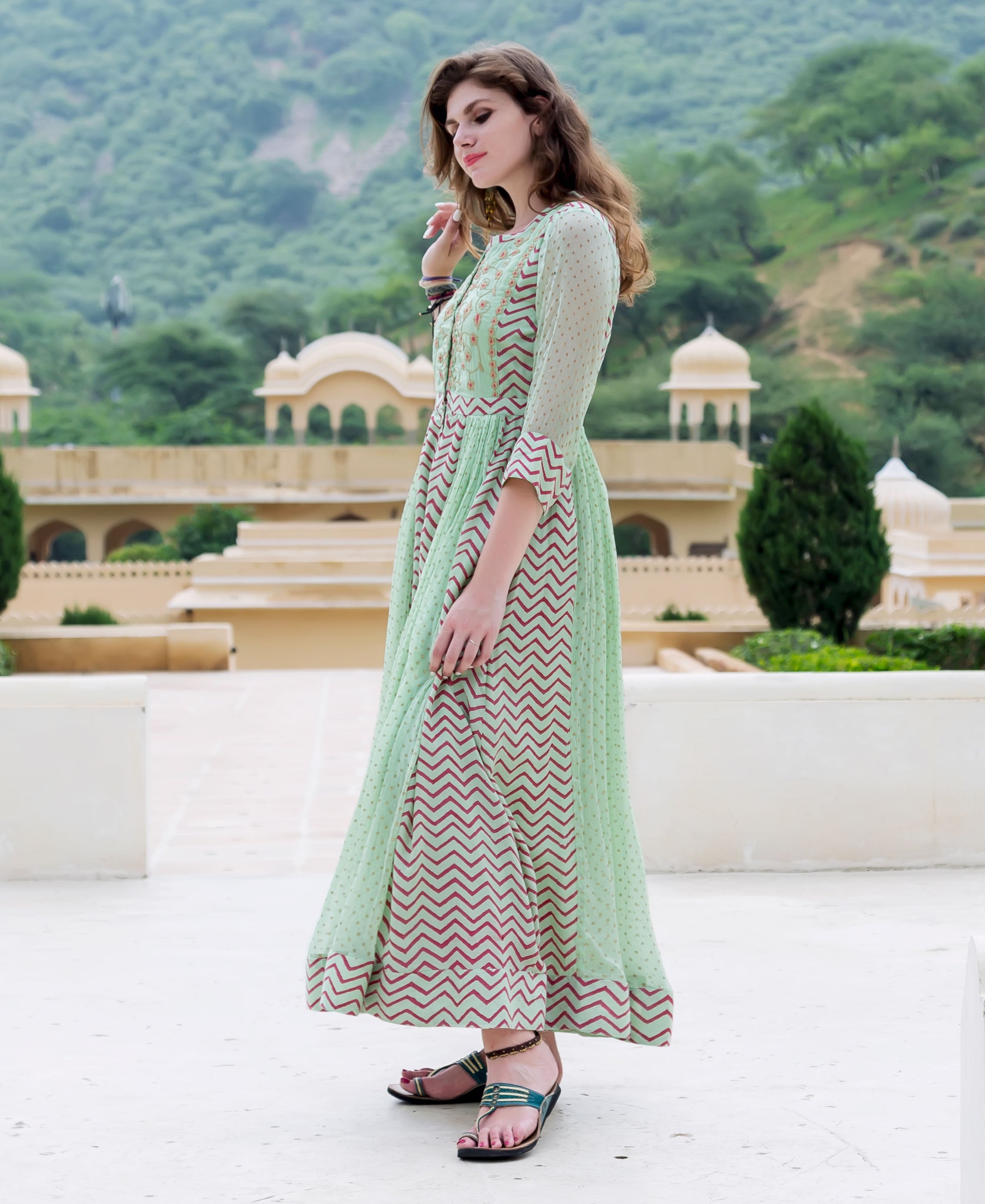 Lime Green Hand Block Printed and Embroidered Anarkali Kurta