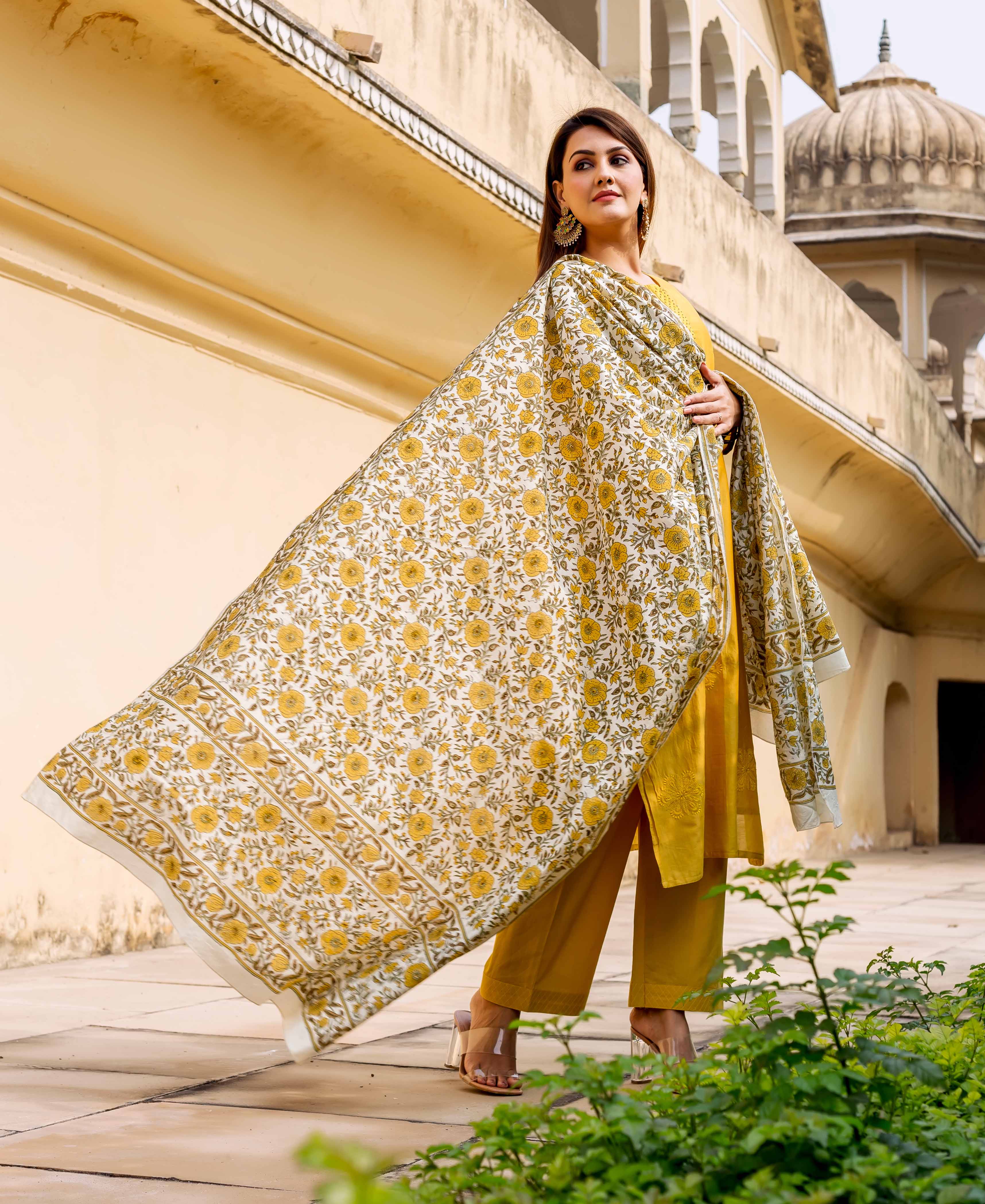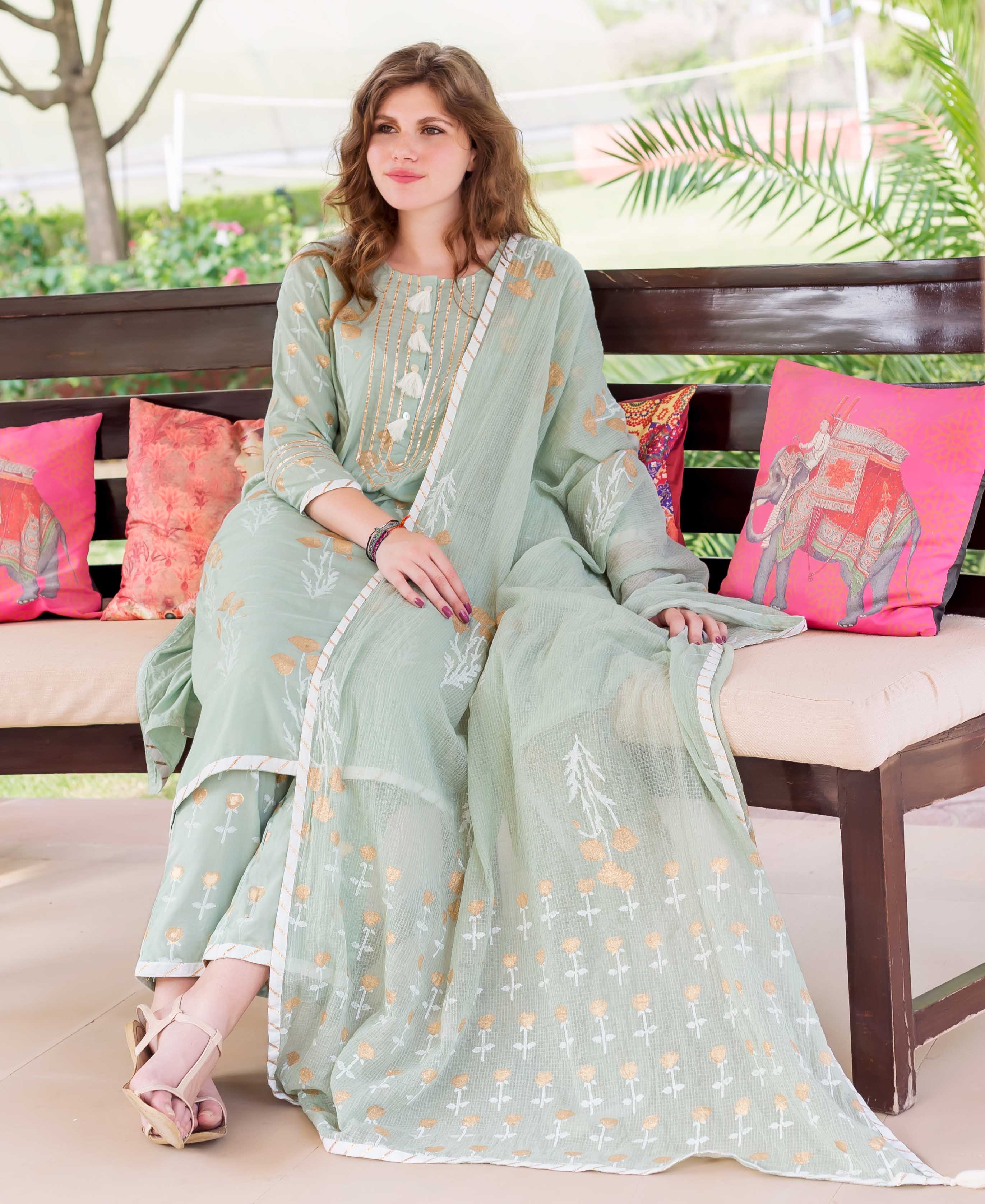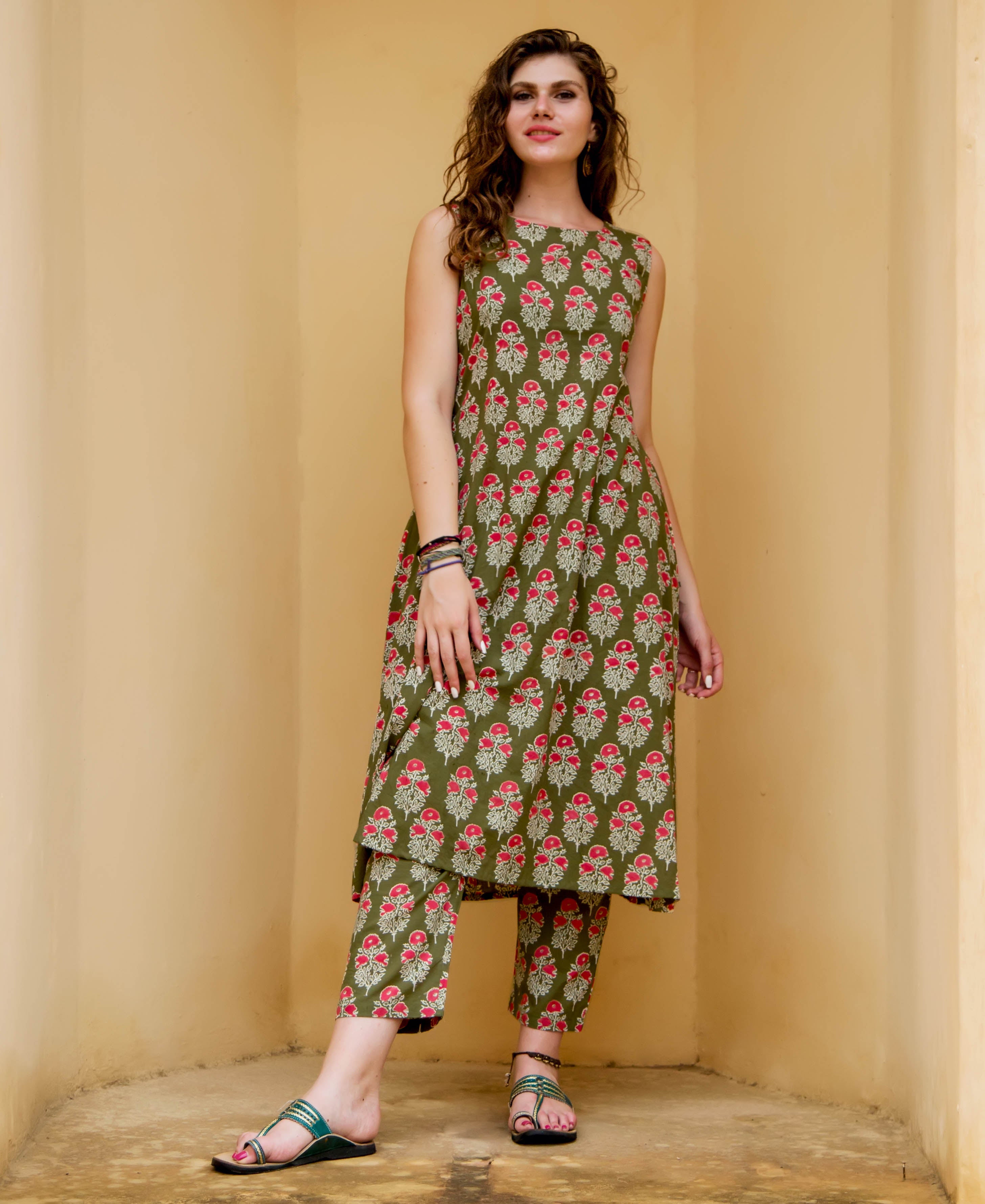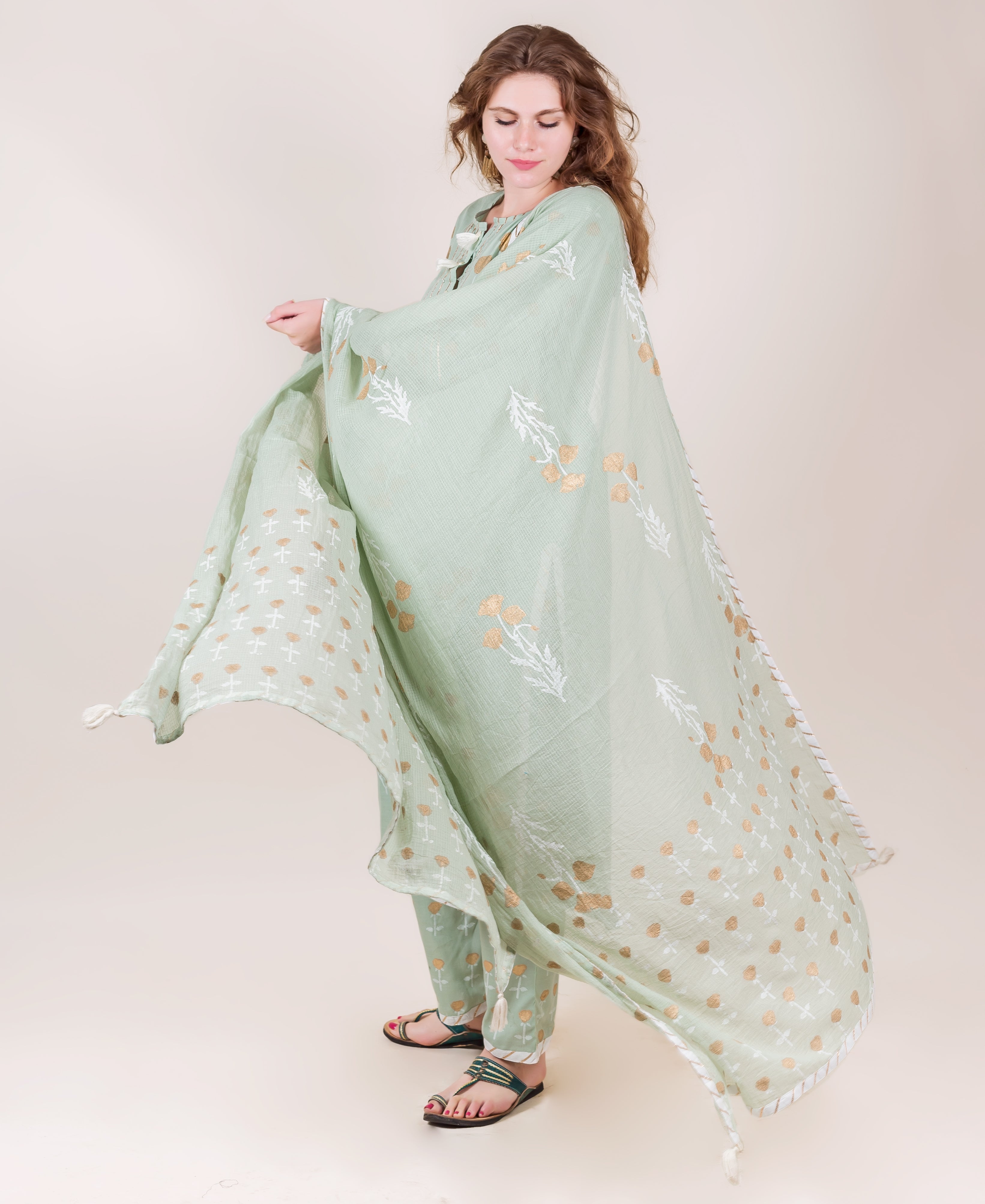 Lime Green Hand Block Printed and Embroidered Anarkali Kurta