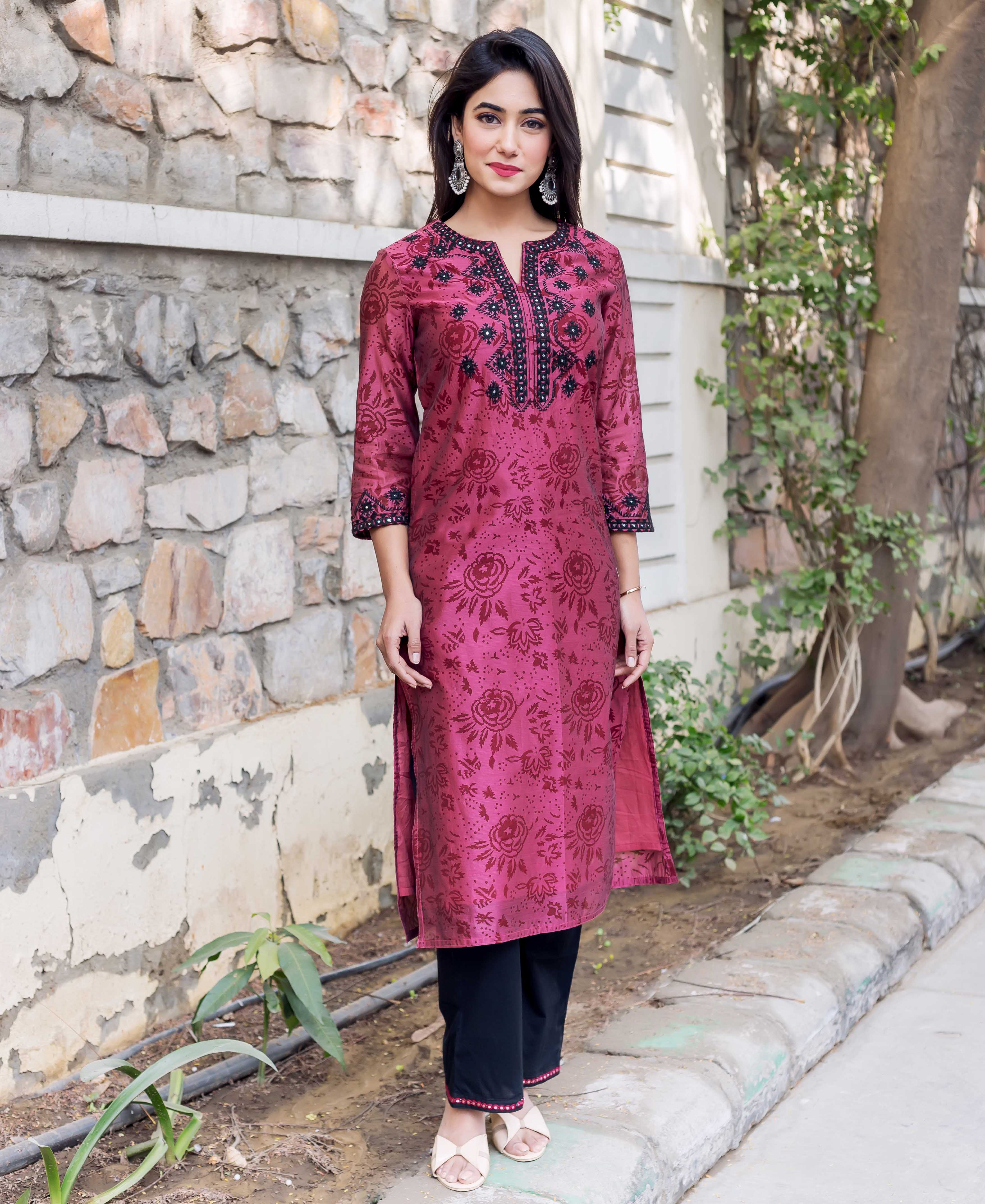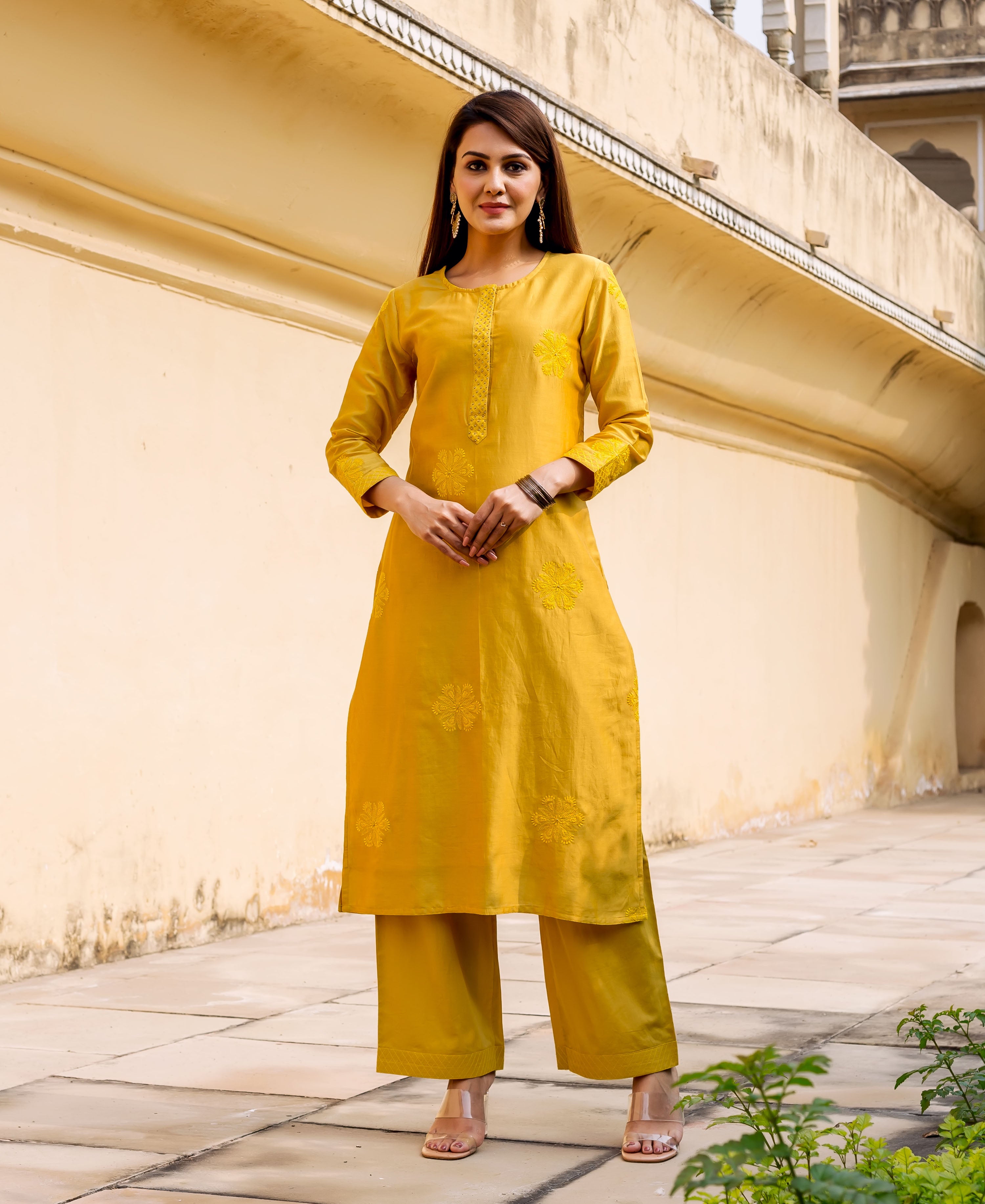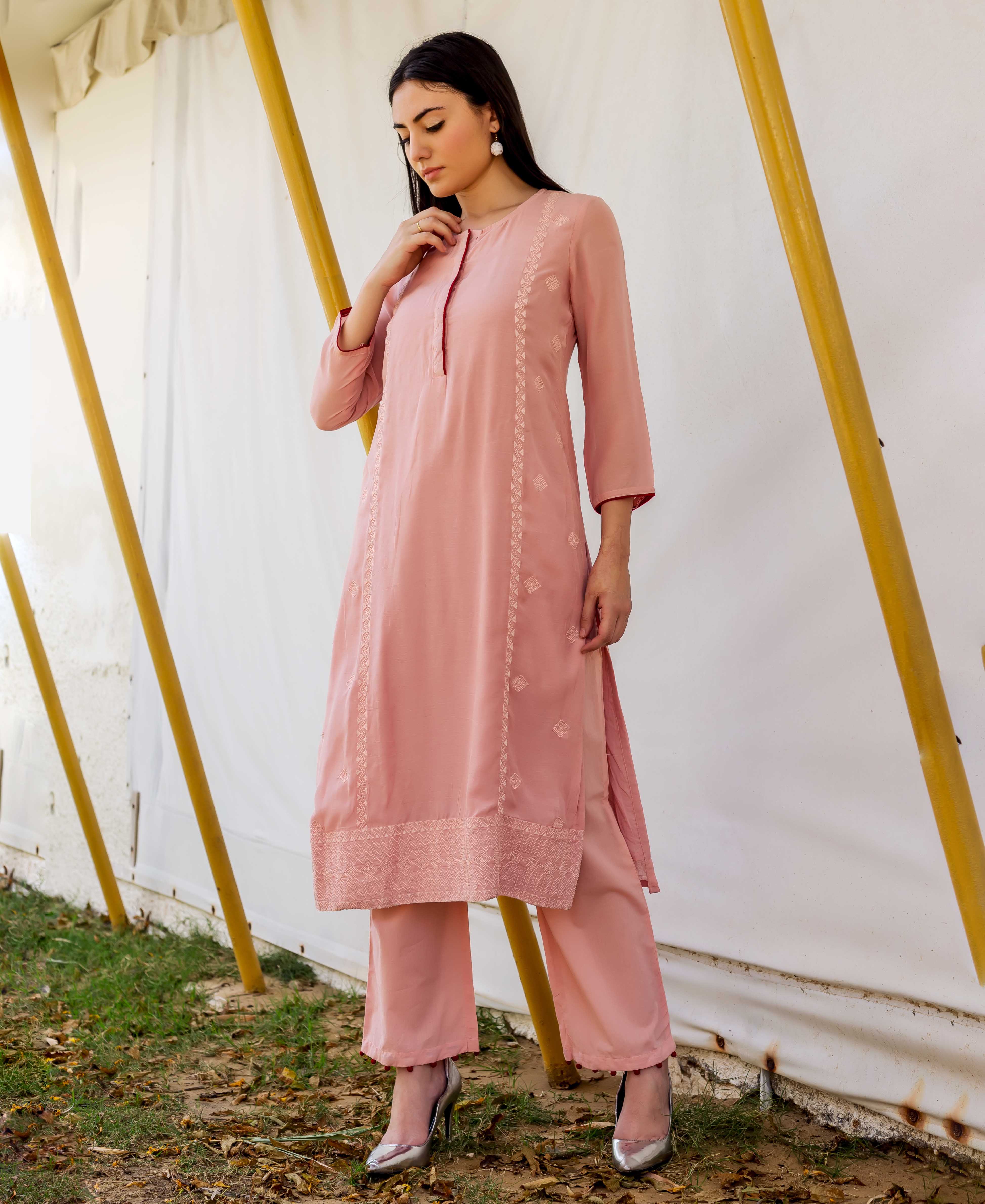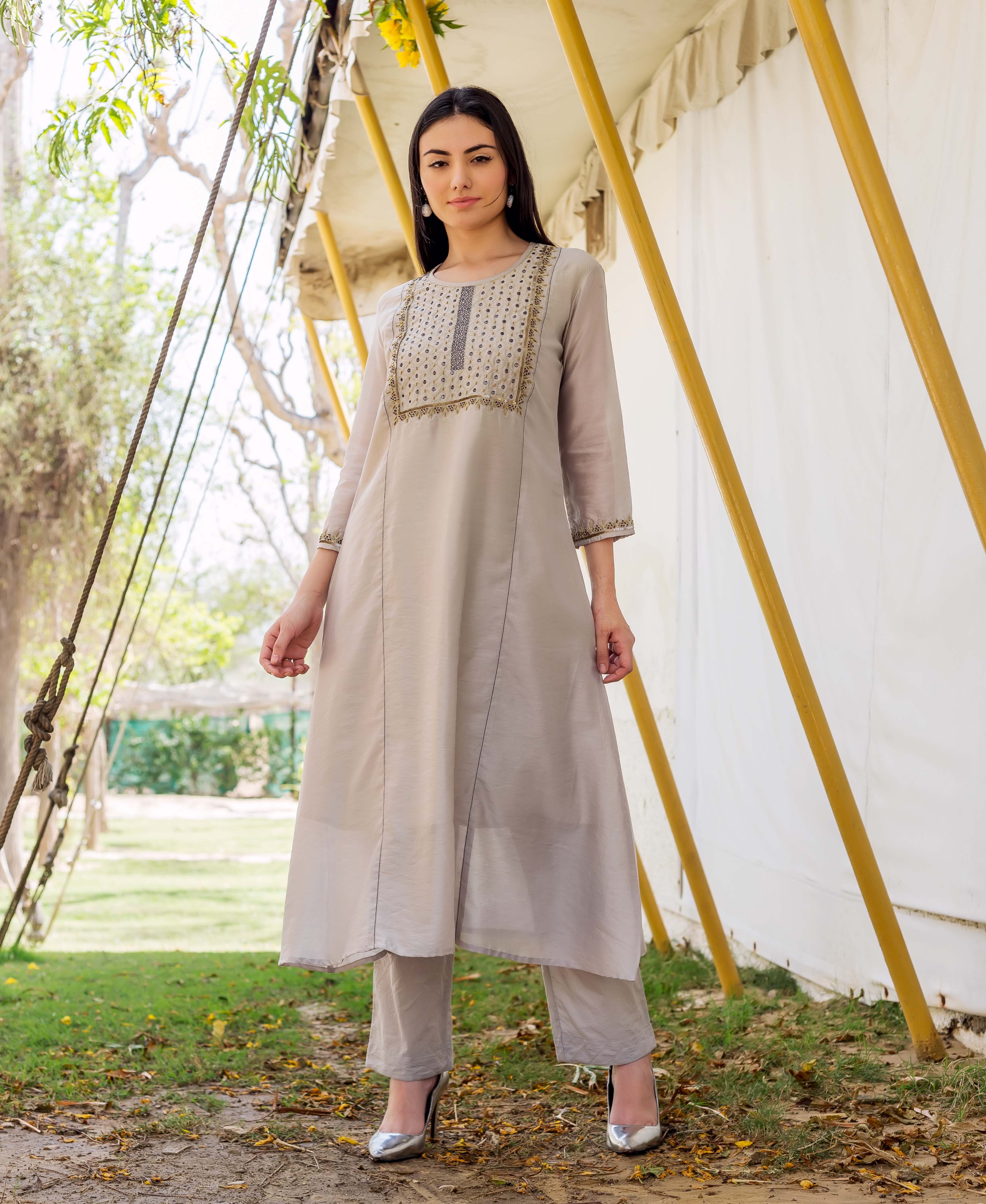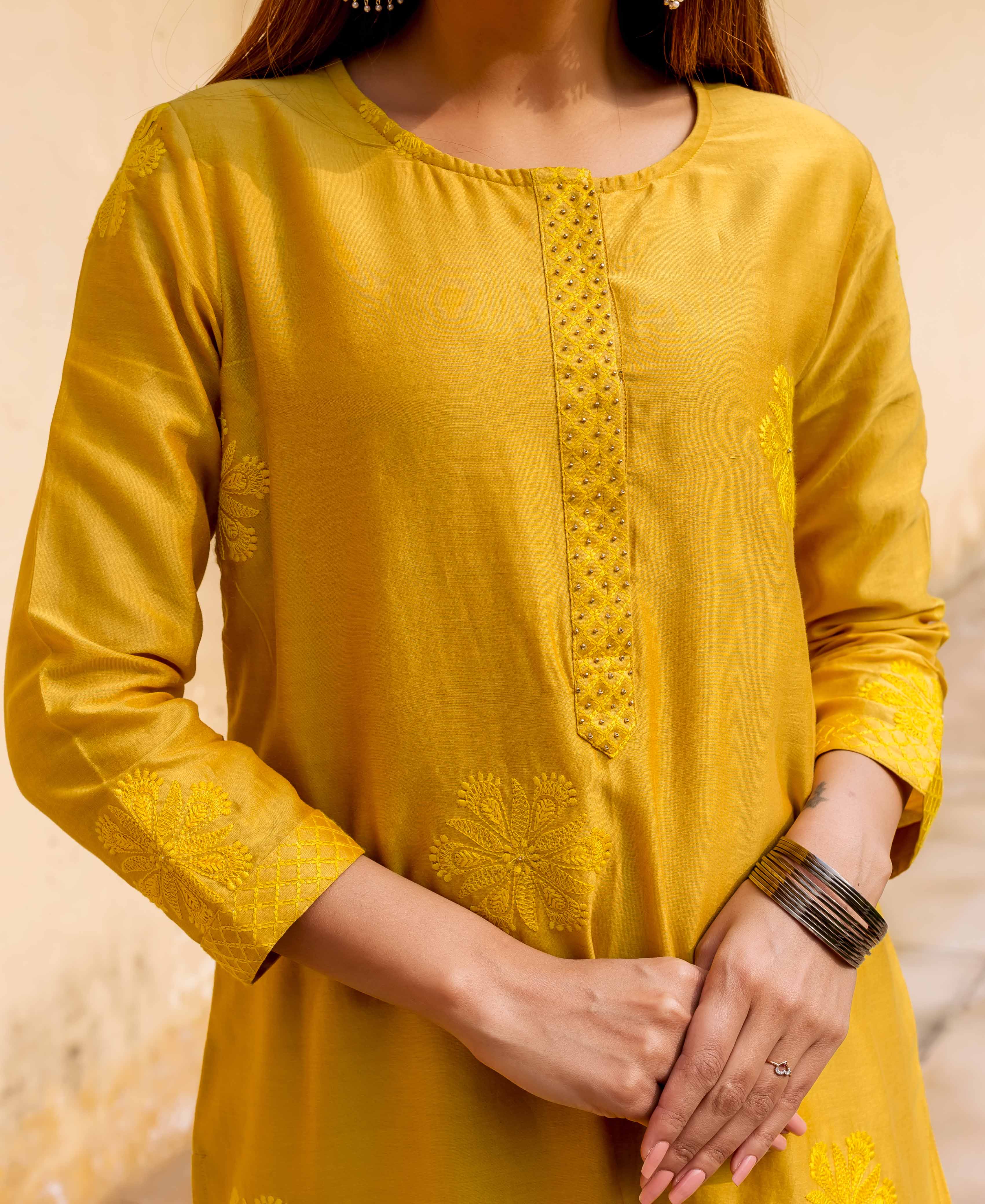 Flat Mandarin Neck Monochrome Embroidered Kurta