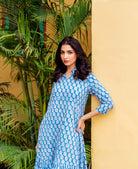 Color: Soft blue base adorned with intricate white block-printed motifs, exuding a serene and timeless charm