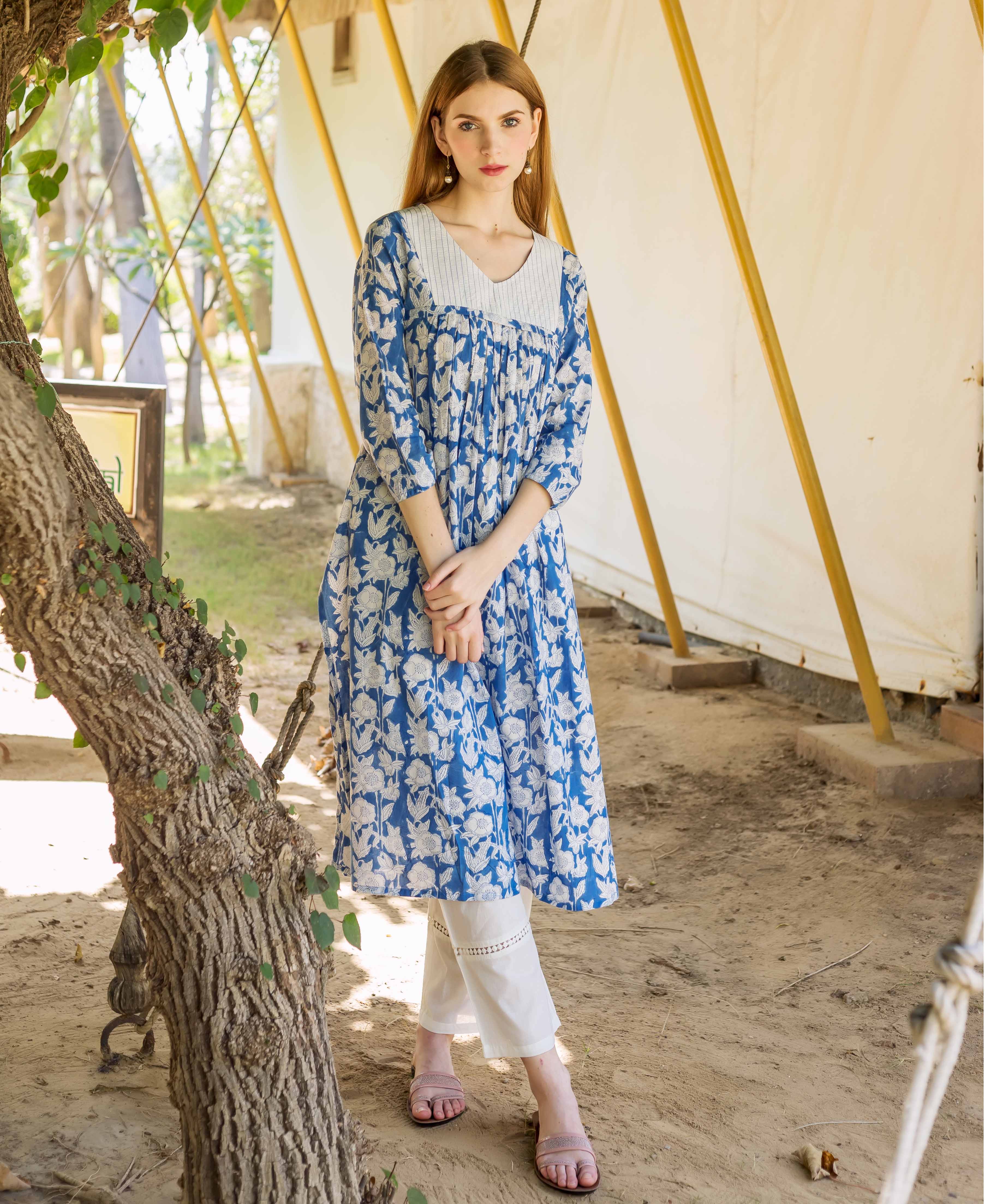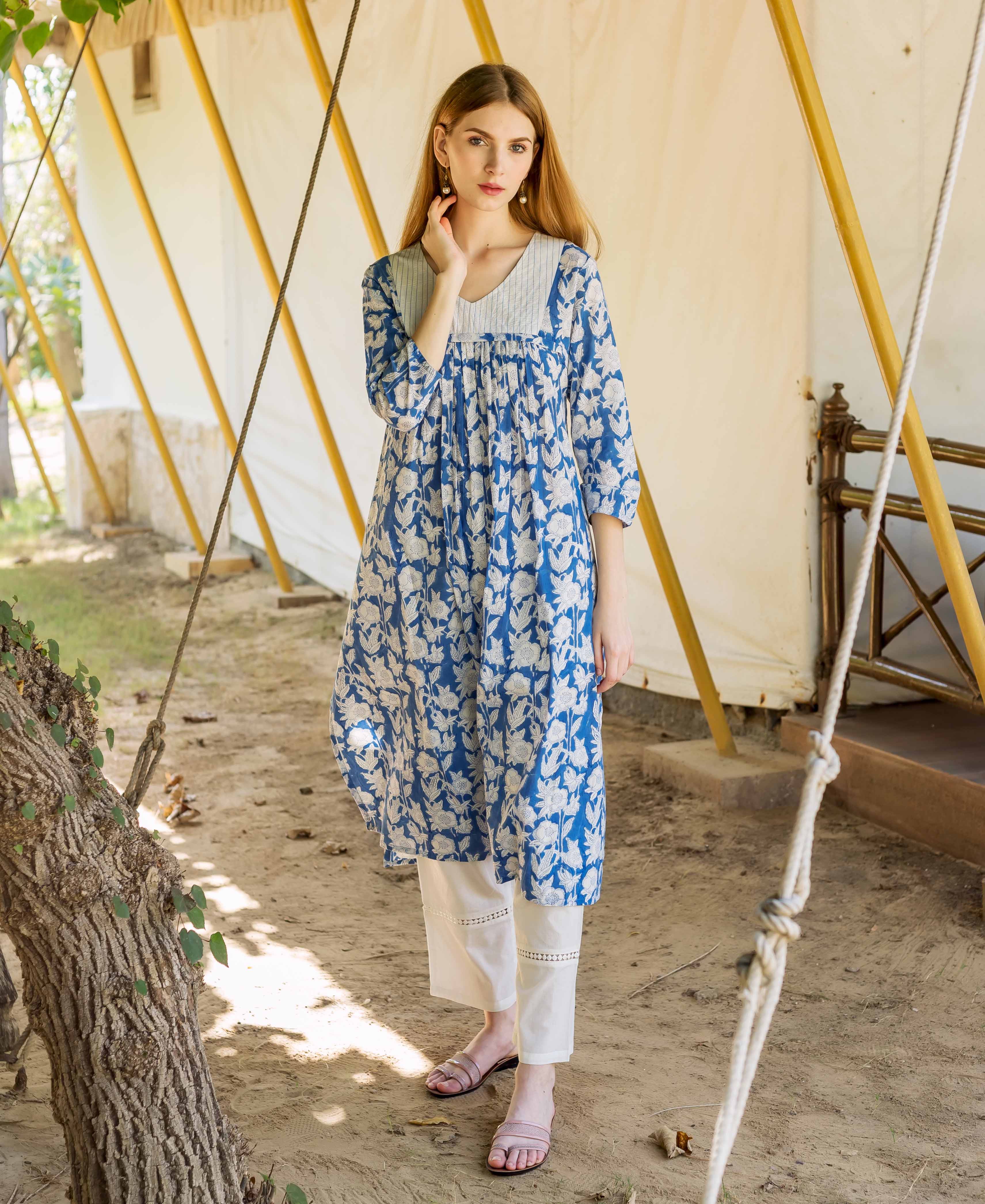 Blue Hand Block Printed Maternal and Nursing Kurta (1Pc.)