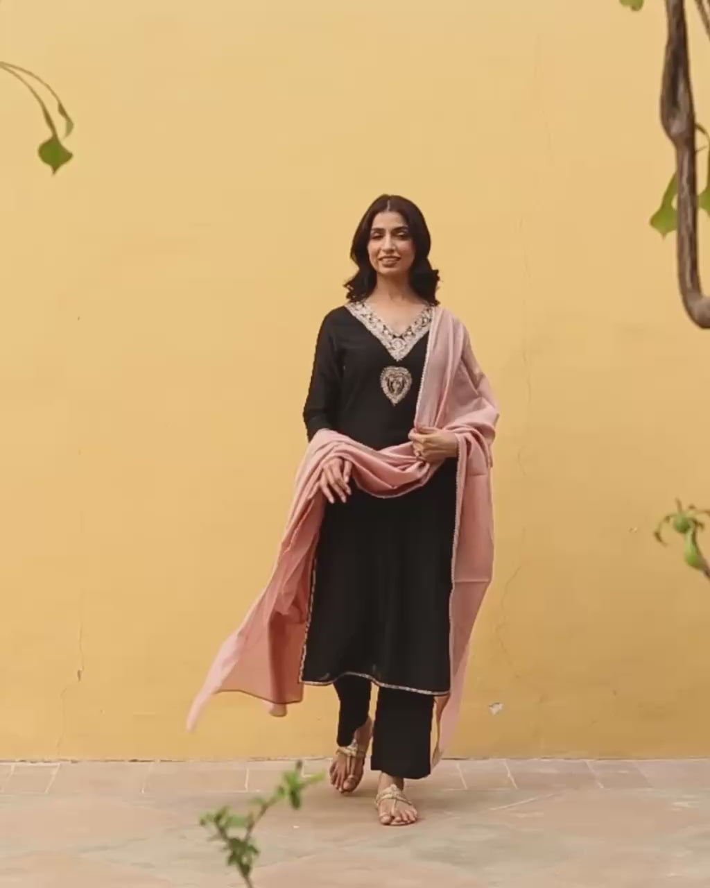 Radiate timeless elegance with the Anvi Black Silk Chanderi Kurta, a stunning ensemble that seamlessly blends luxurious craftsmanship with traditional charm, perfect for making a sophisticated statement.