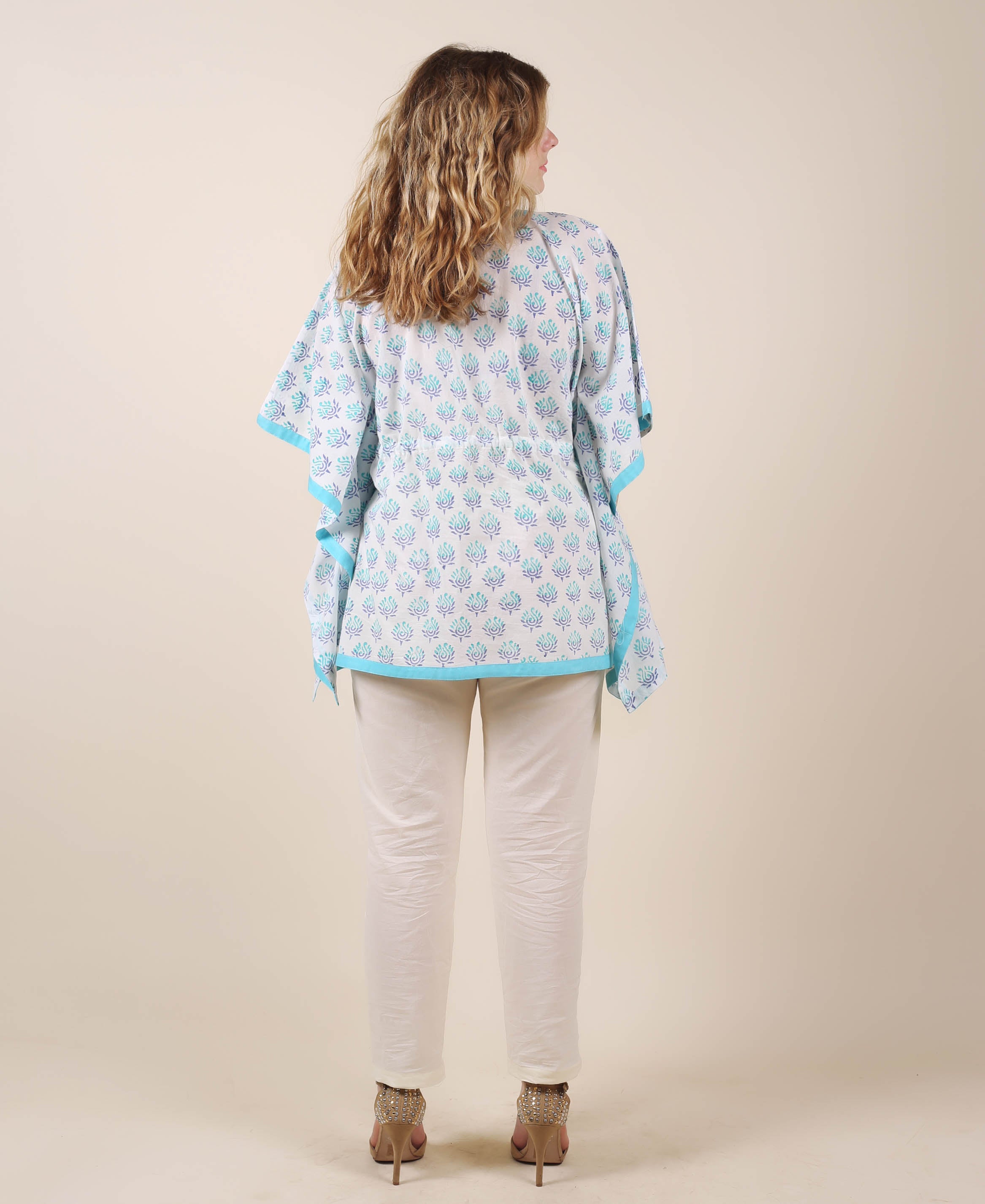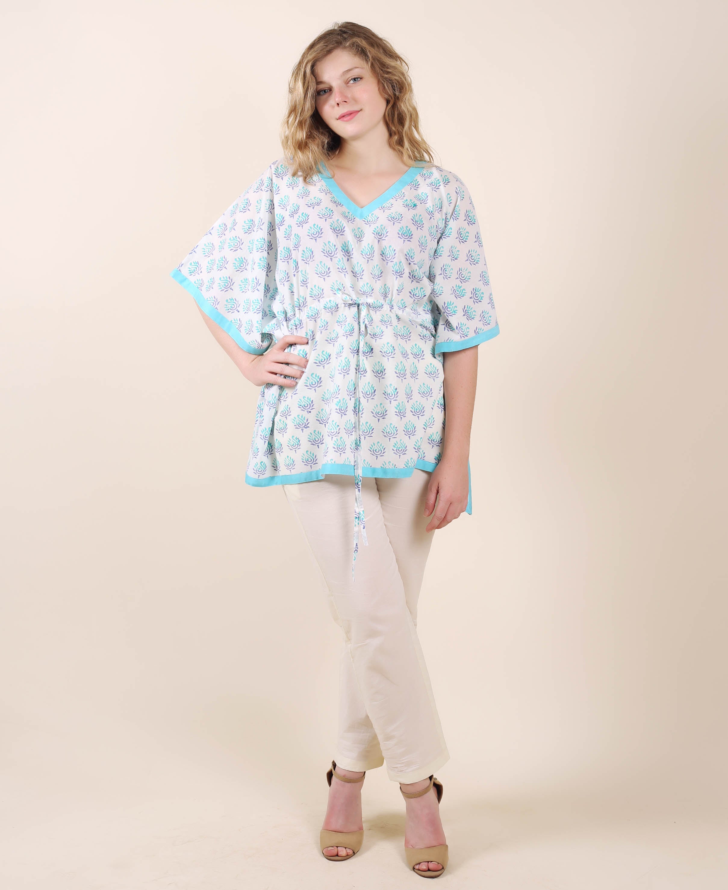 Falling in love with something so beautiful is oh-so obvious. Made from cotton fabric, this trouser and kaftan top set is ideal for women of all ages. The white kaftan top has been embellished with aqua prints and trims and has been paired with solid trouser. V-neckline, kaftan sleeves and drawstring at waist on the top along with pockets in the trouser is the reason you would instantly pick this combination.
