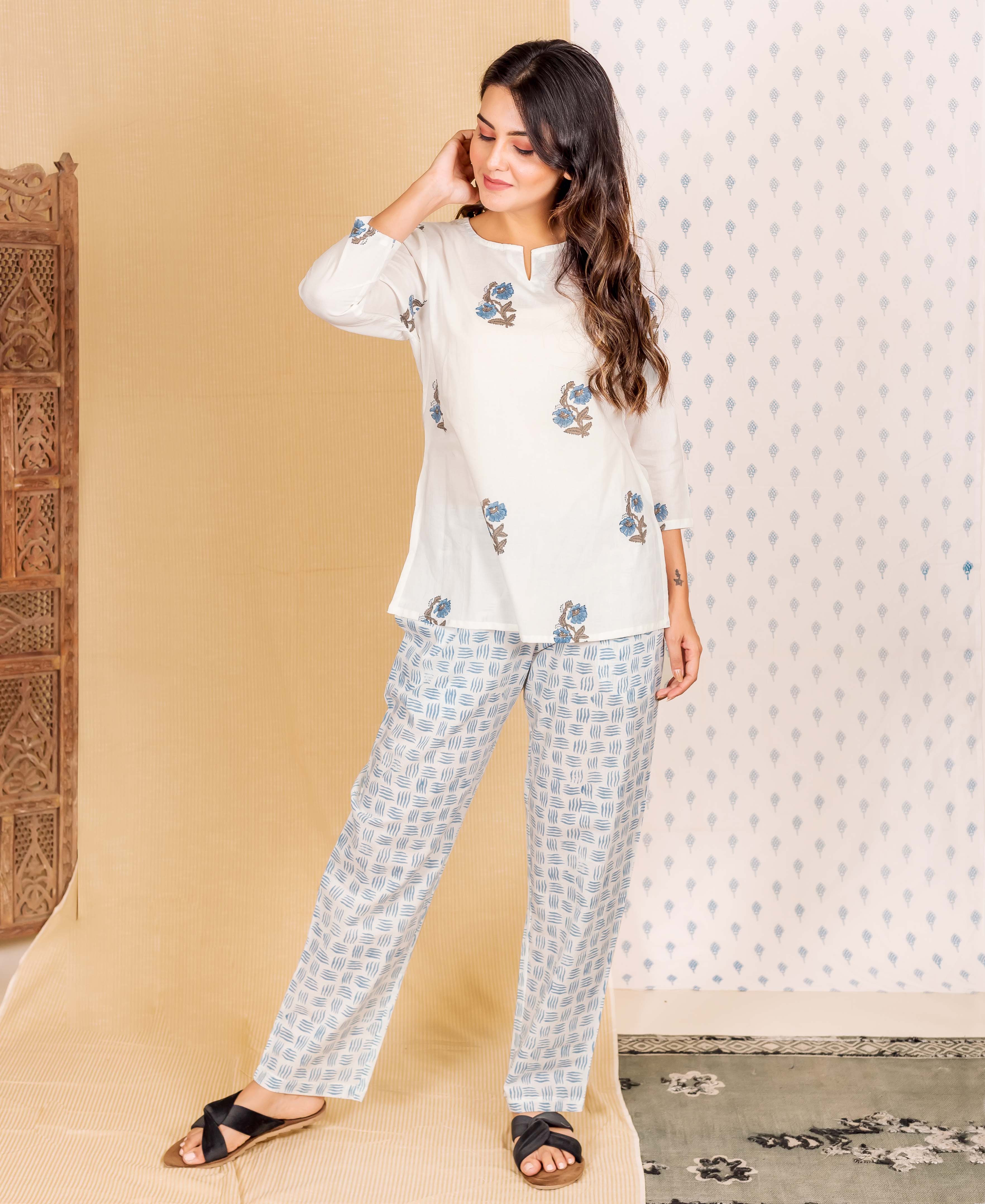 Delicate White Hand Block Printed Lounge Wear