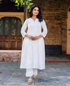 Exude timeless elegance with the Riya White Cotton Kurta Set, a classic ensemble that combines traditional craftsmanship with a minimalist aesthetic.
