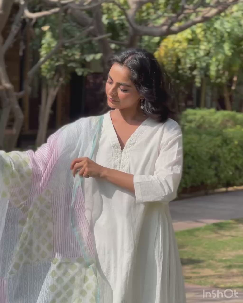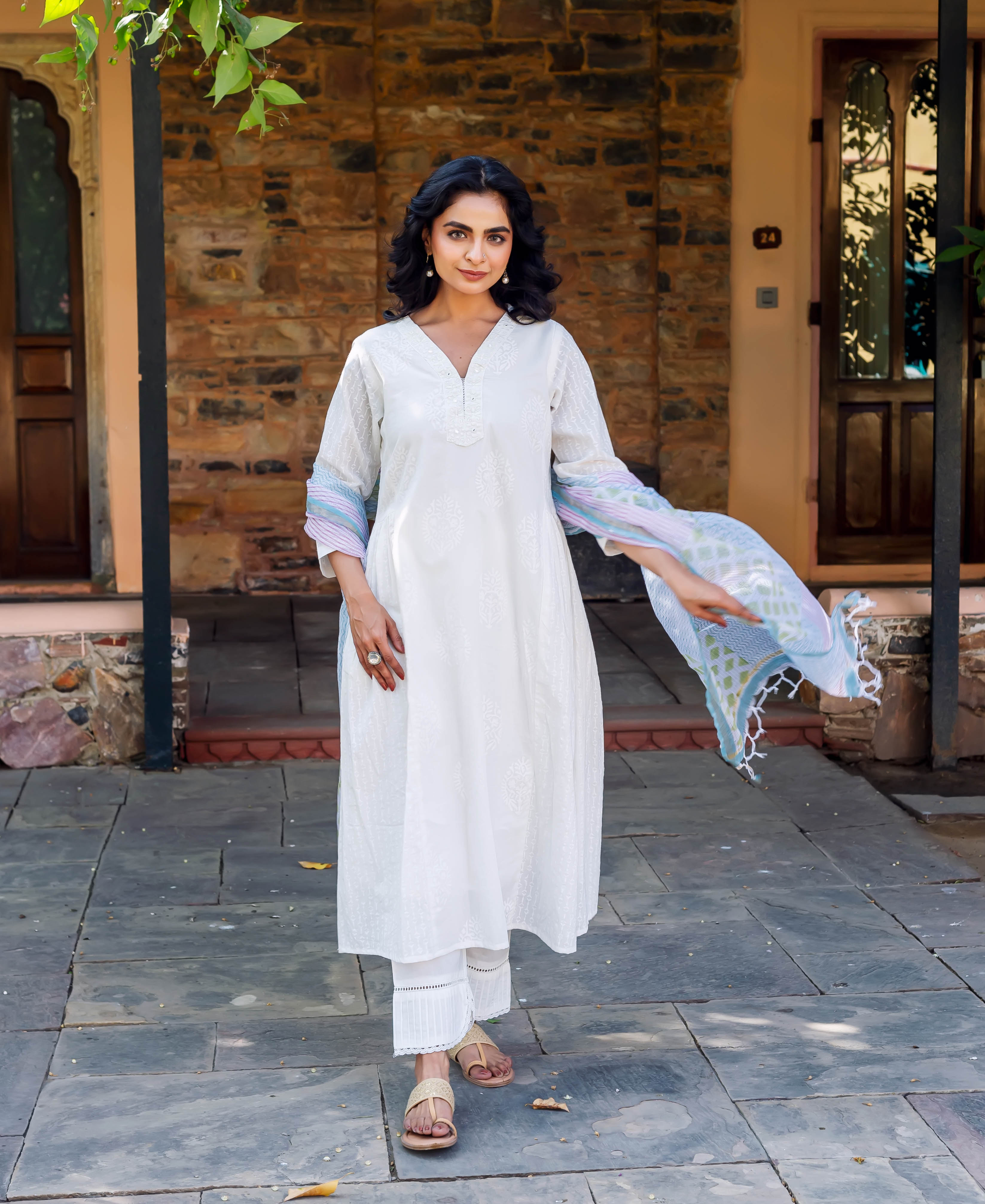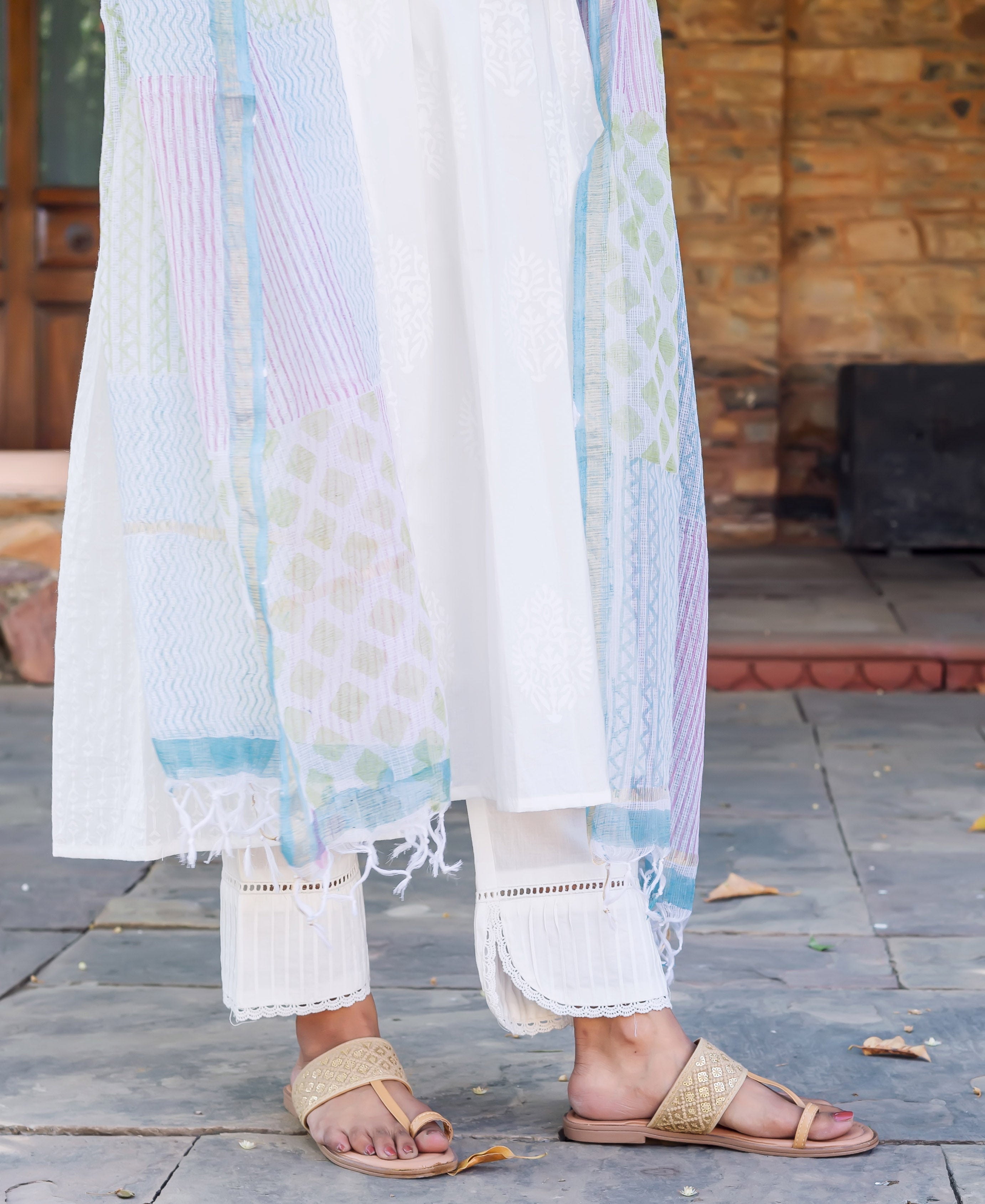 - Unique Features: The white cotton kurta with subtle embroidery, paired with the lace-detailed cotton bottom and block-printed Kota Doria dupatta, creates a harmonious blend of traditional artistry and minimalist elegance, making this set a versatile addition to your wardrobe.